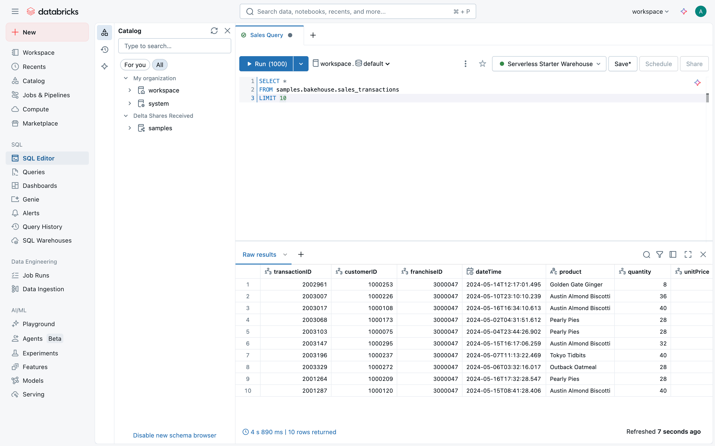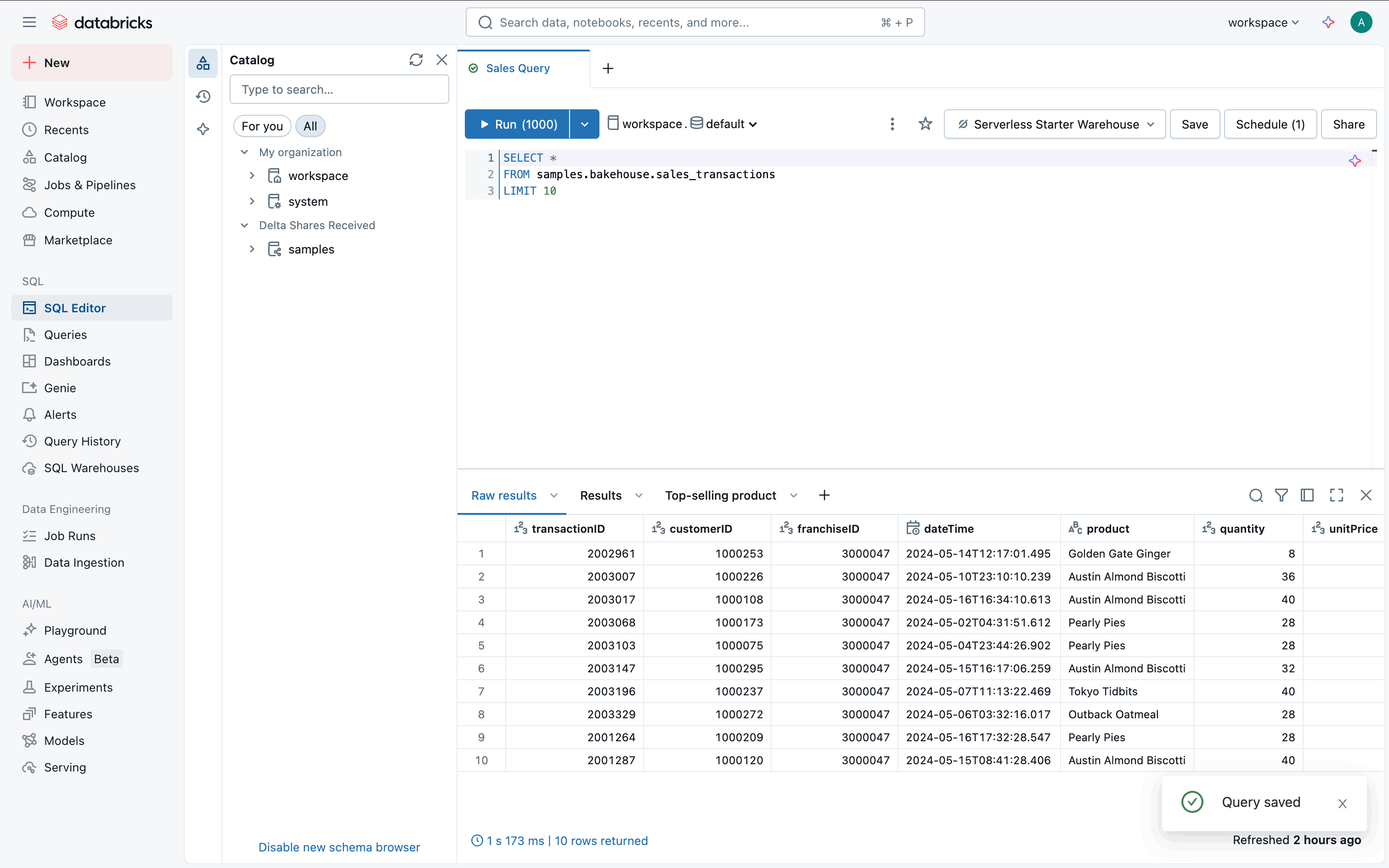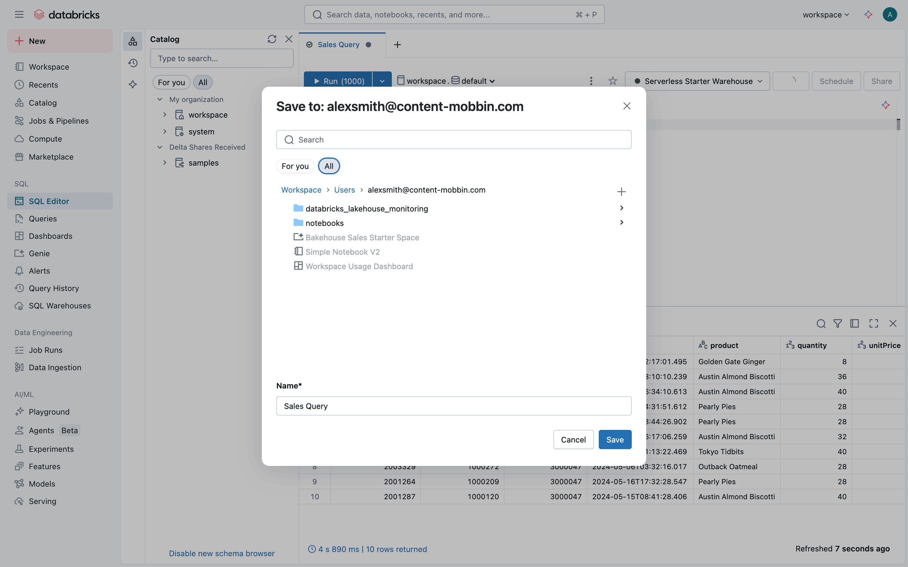 The user saves a SQL query. They navigate to the save modal, specify the save details, and return to the editor with a confirmation.