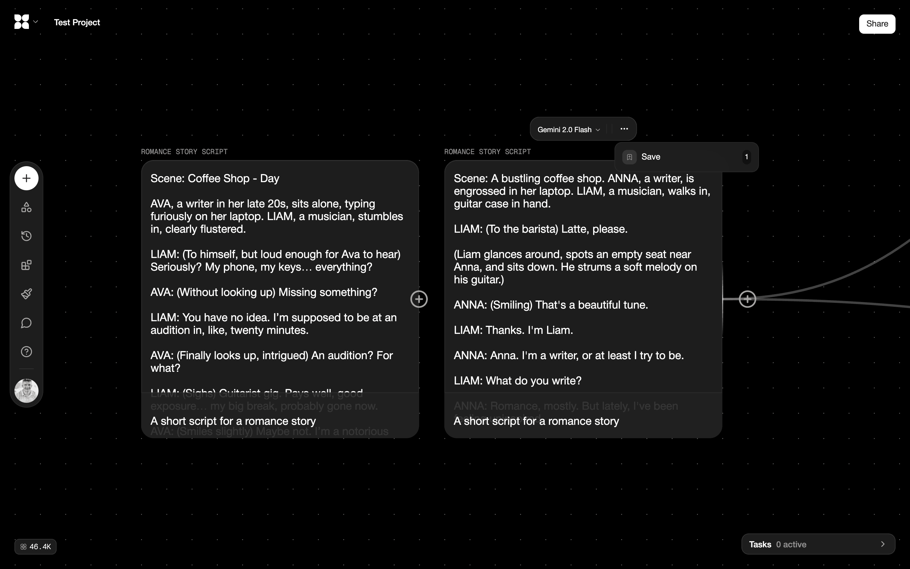 The user opens a script editor, interacts with a dropdown menu to reveal the save option, and then saves the script.