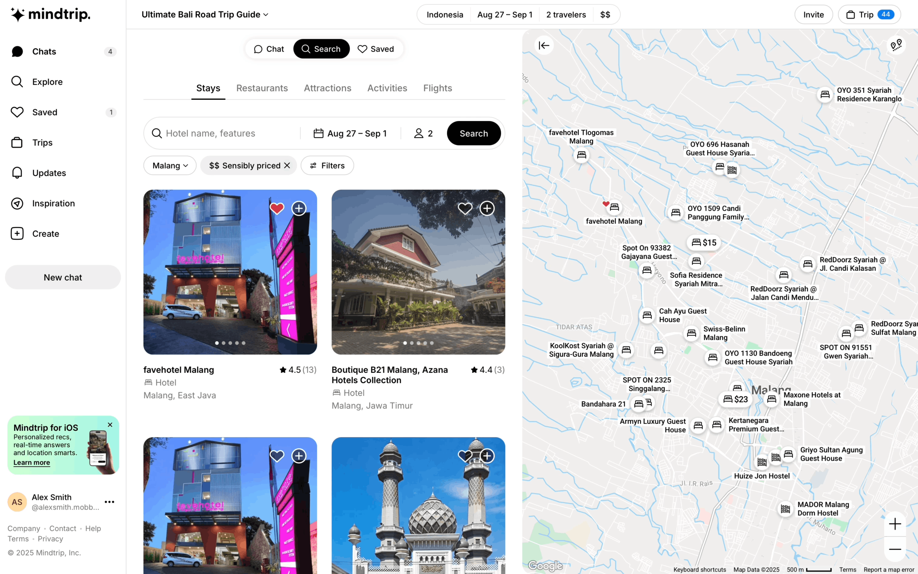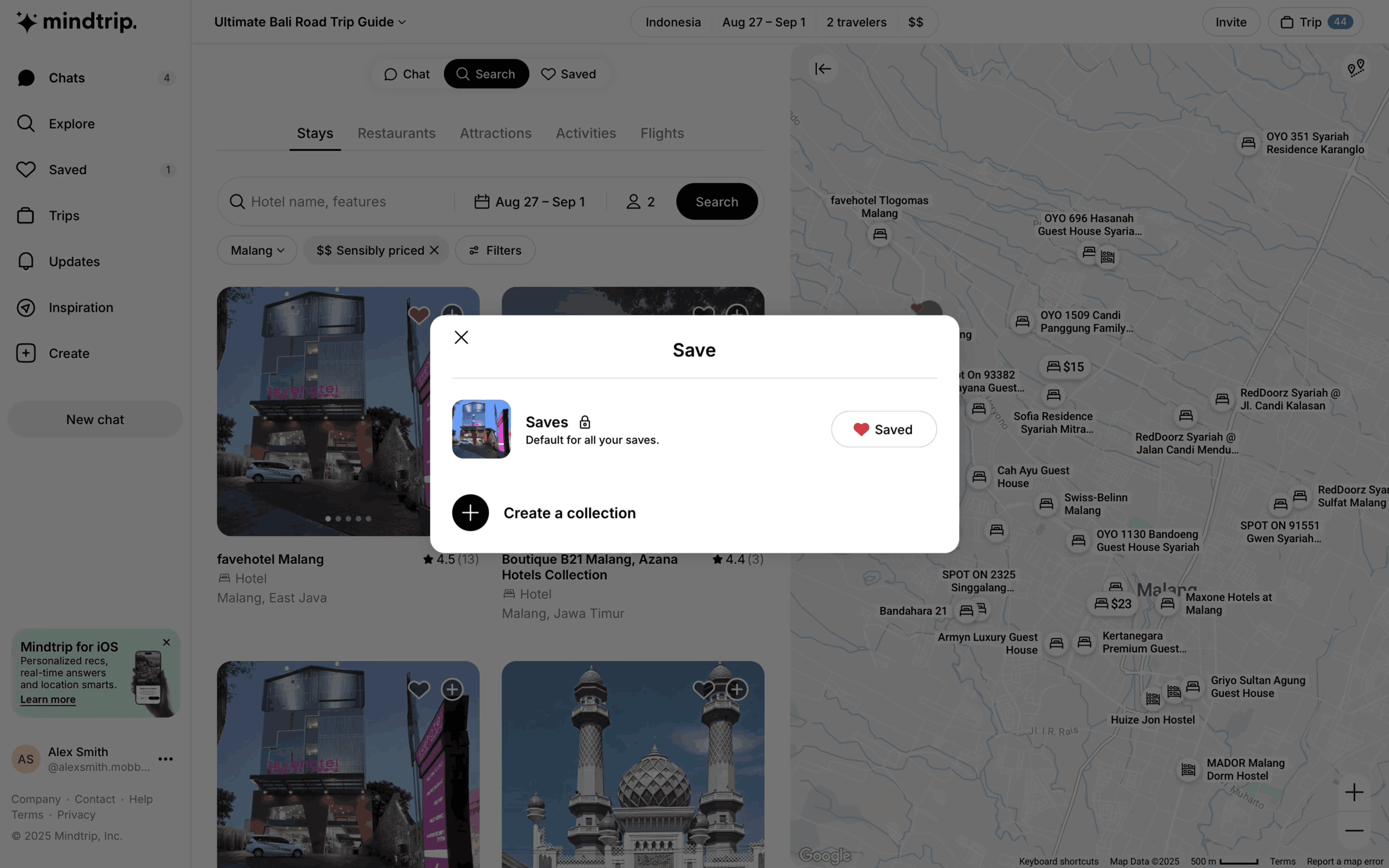 The user searches for hotels, then saves a hotel to a collection. Finally, the user is brought back to the hotel search results.