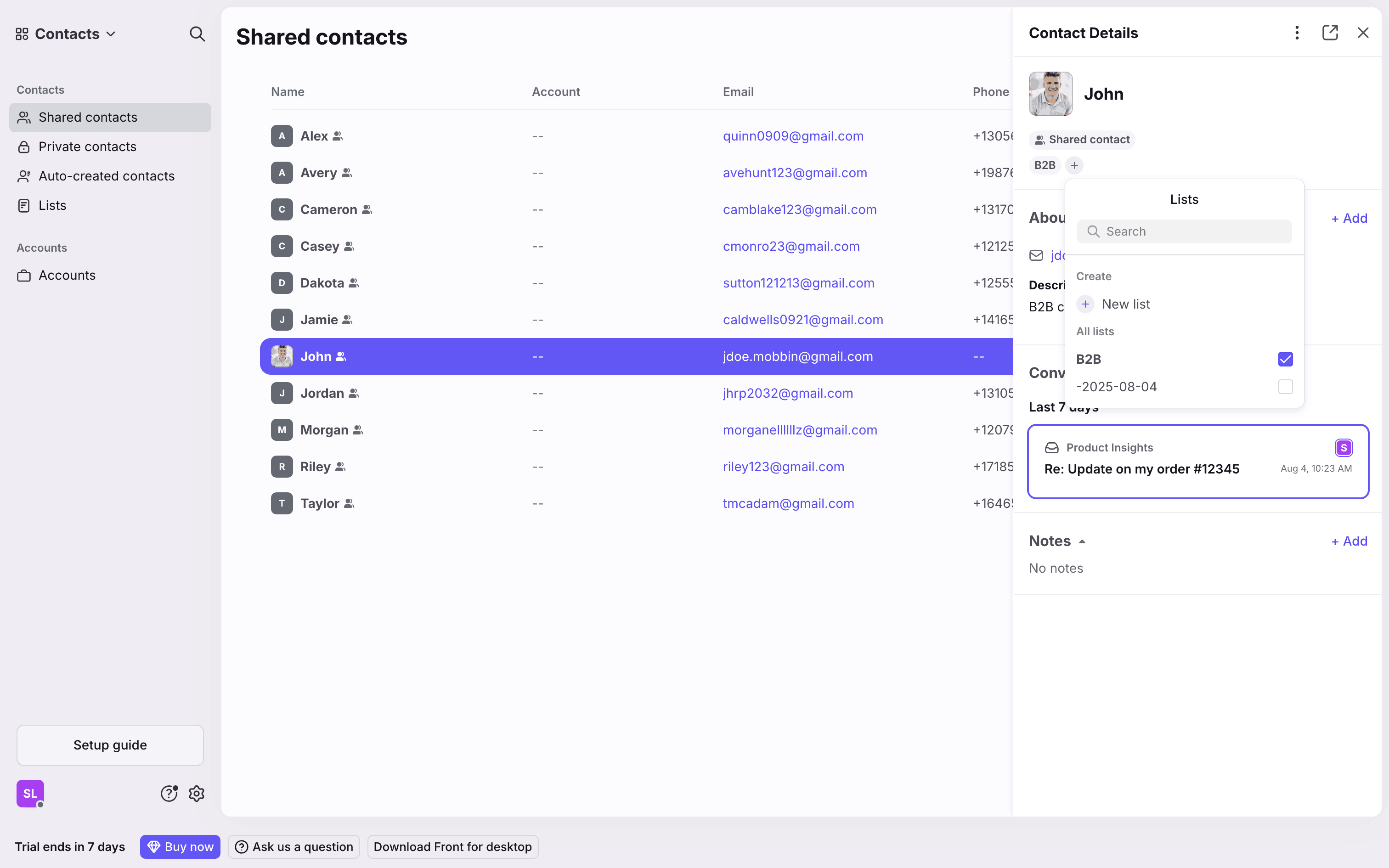 The user views a contact, opens the contact details, and modifies the contact's list memberships. The updated contact details are then displayed.