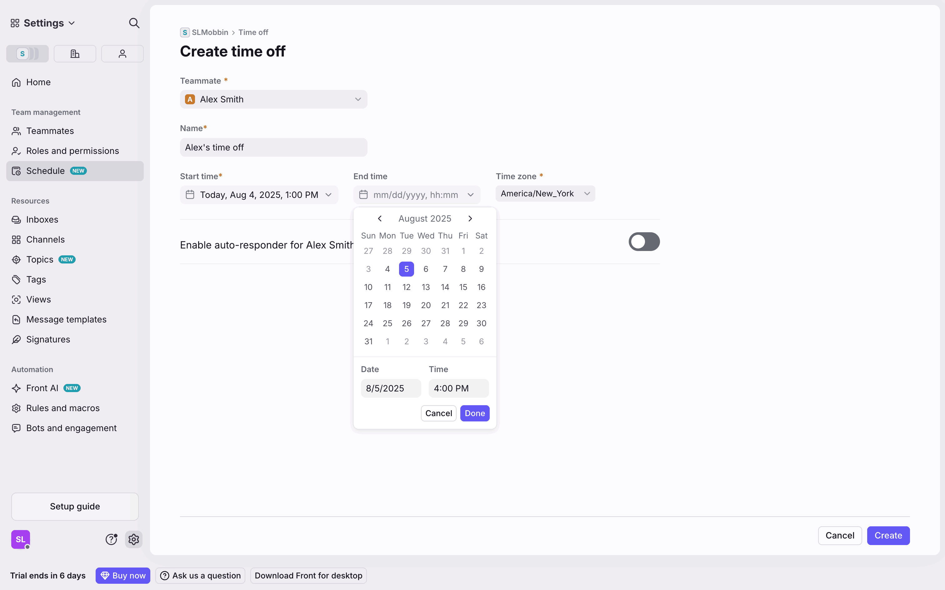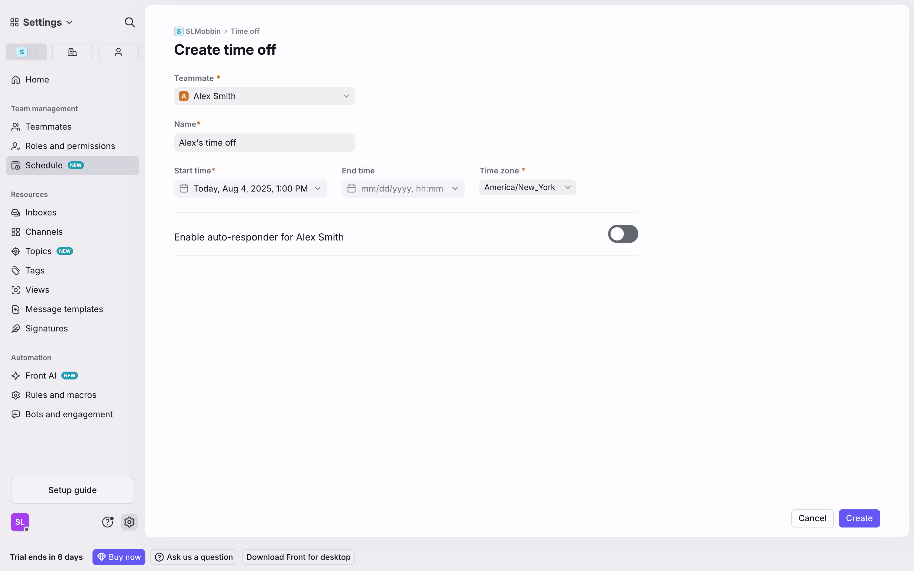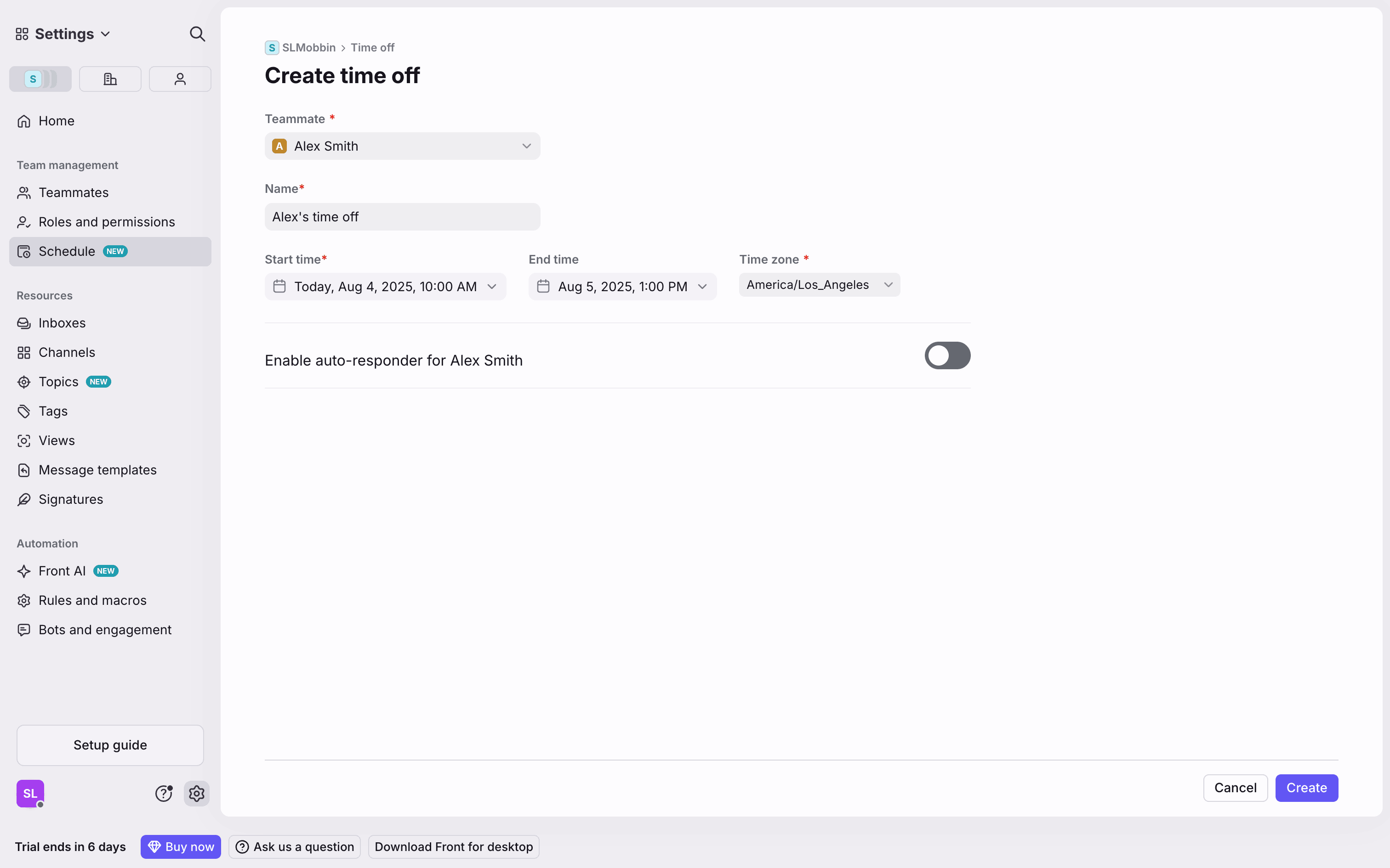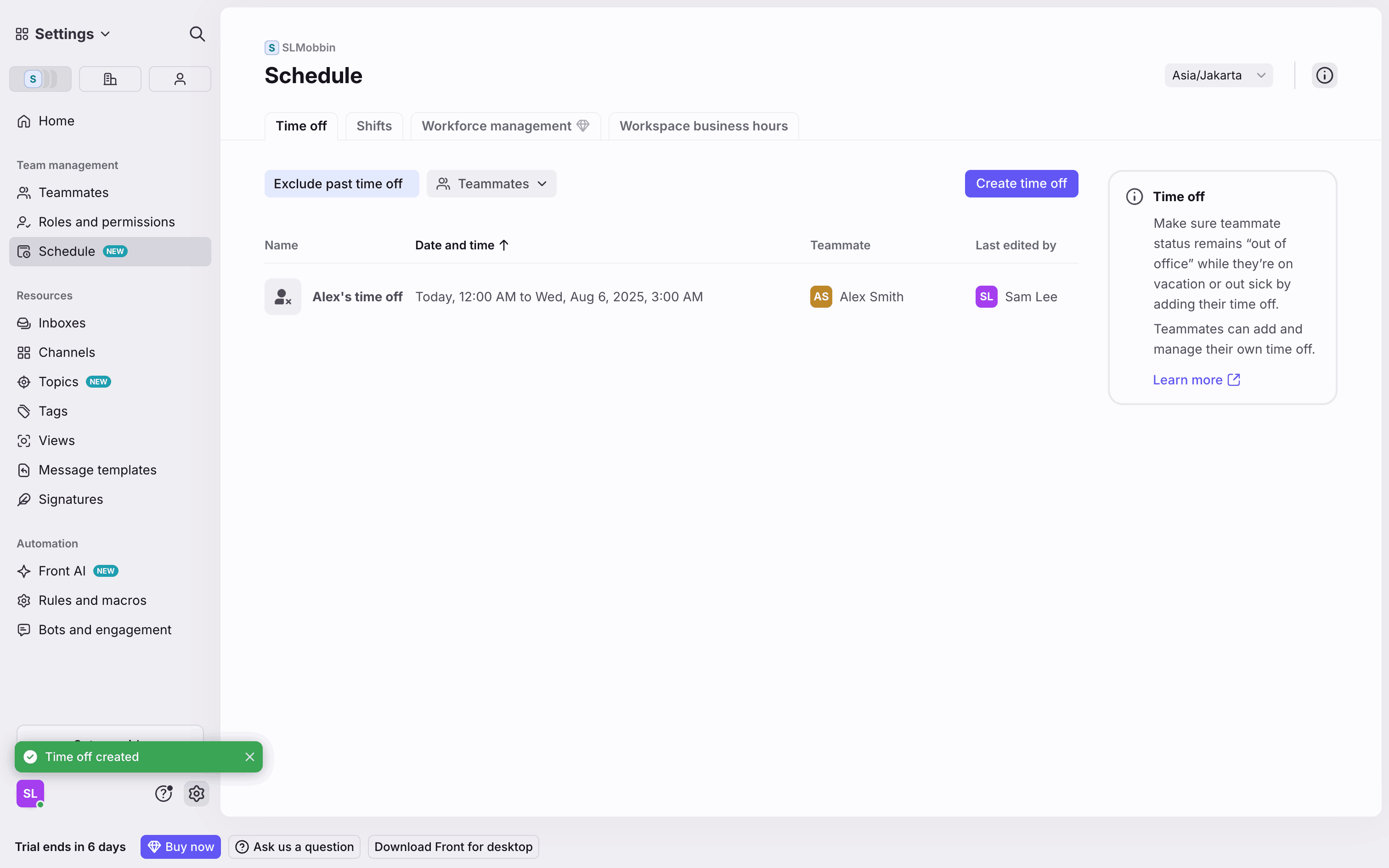 The user creates a time off request by filling out a form. The created time off is then displayed on the schedule page.