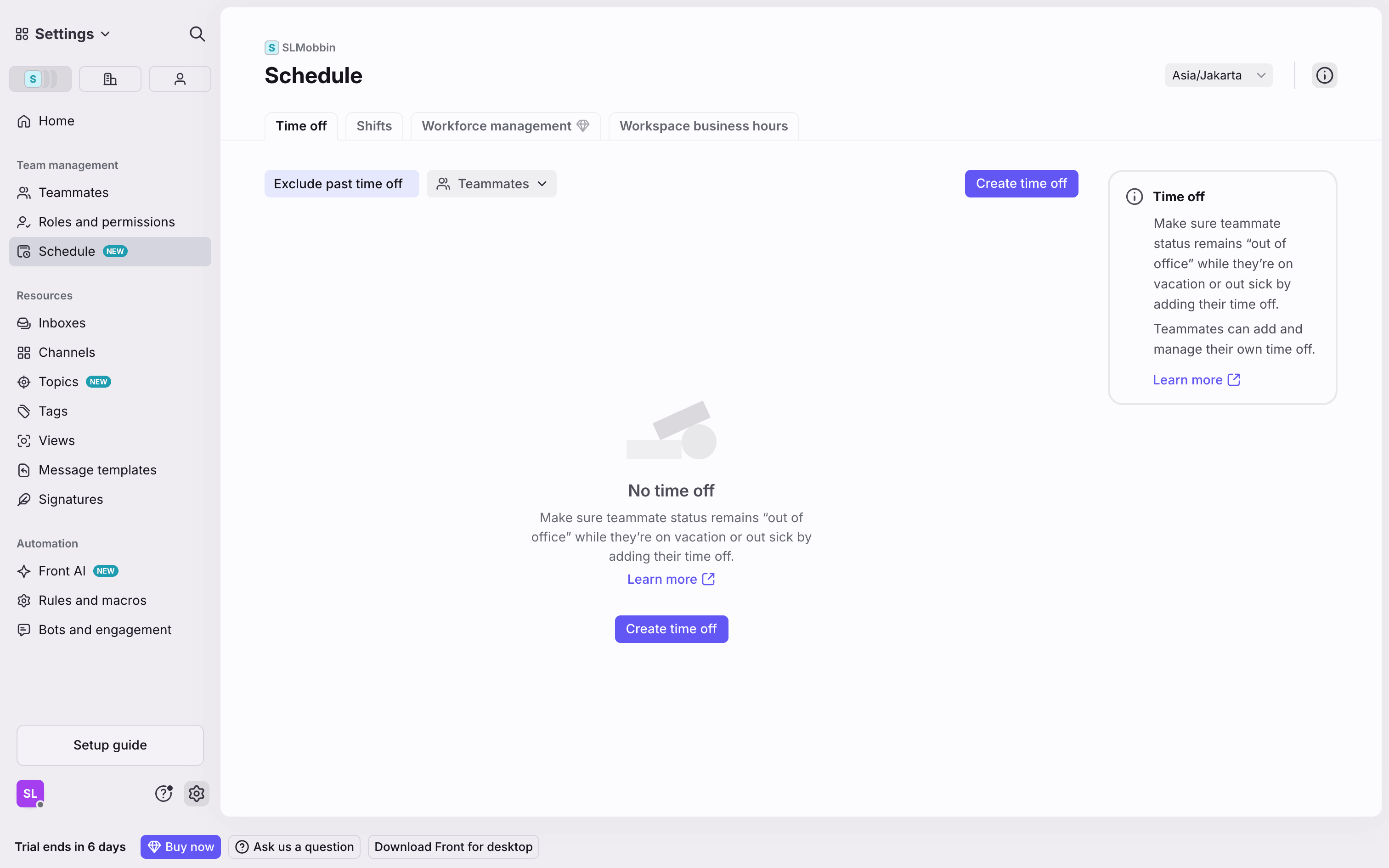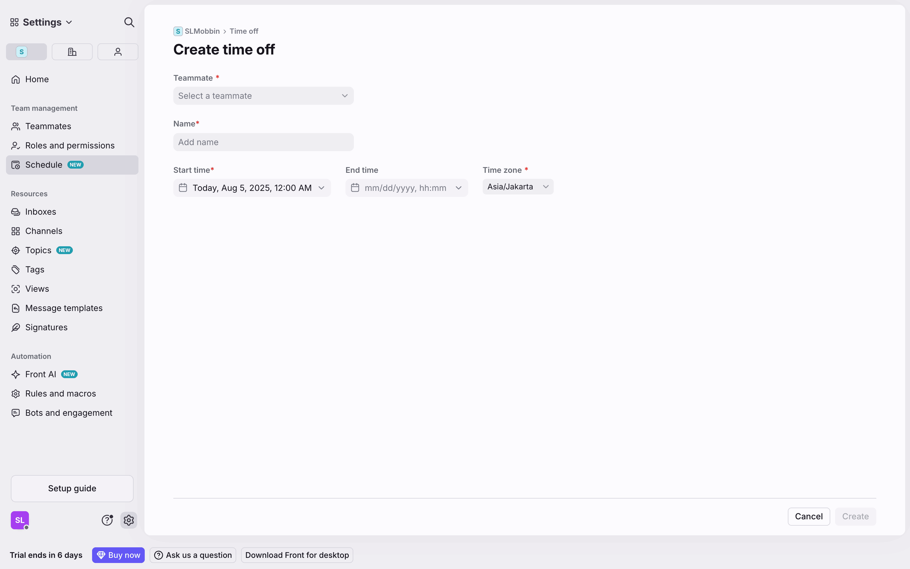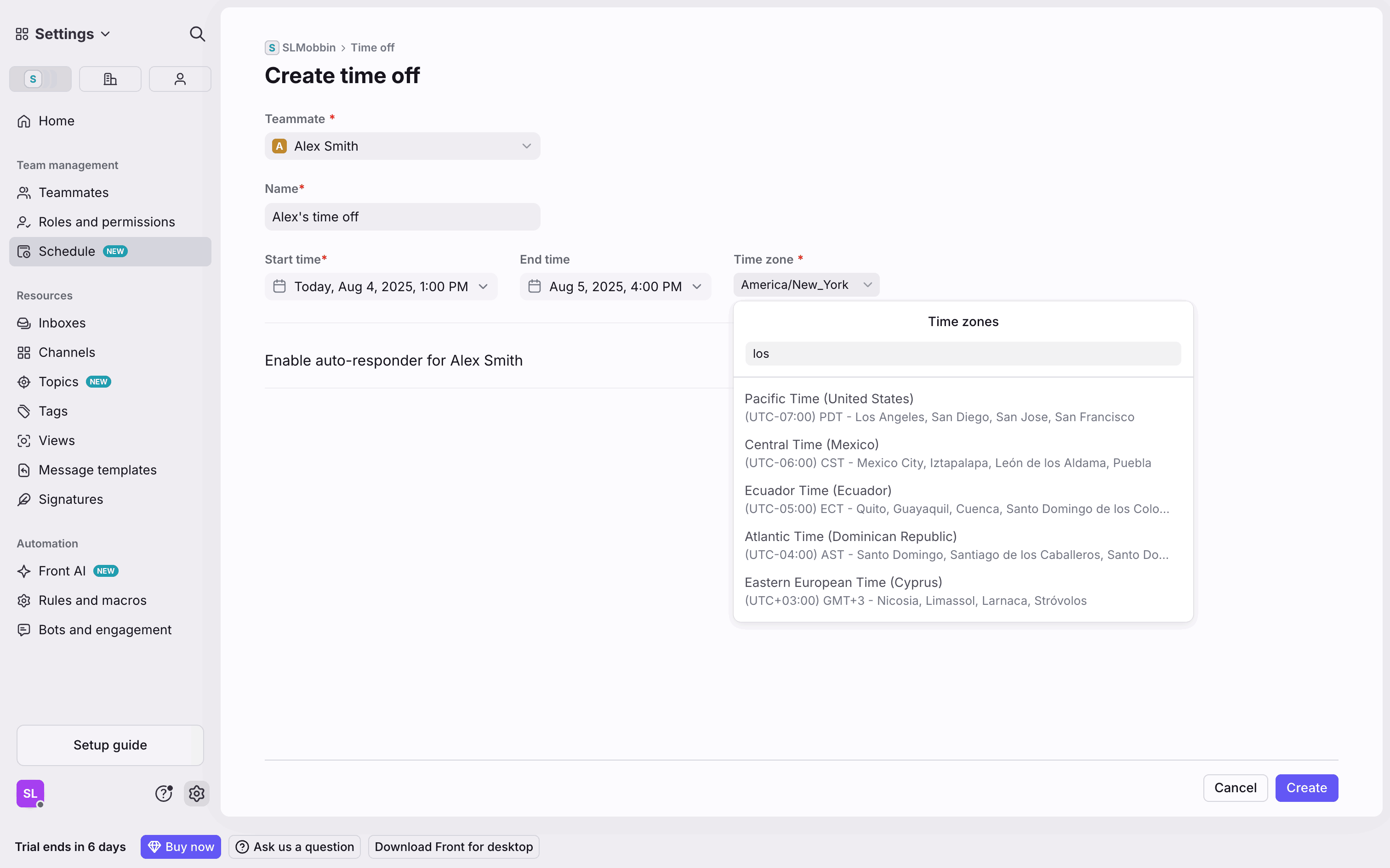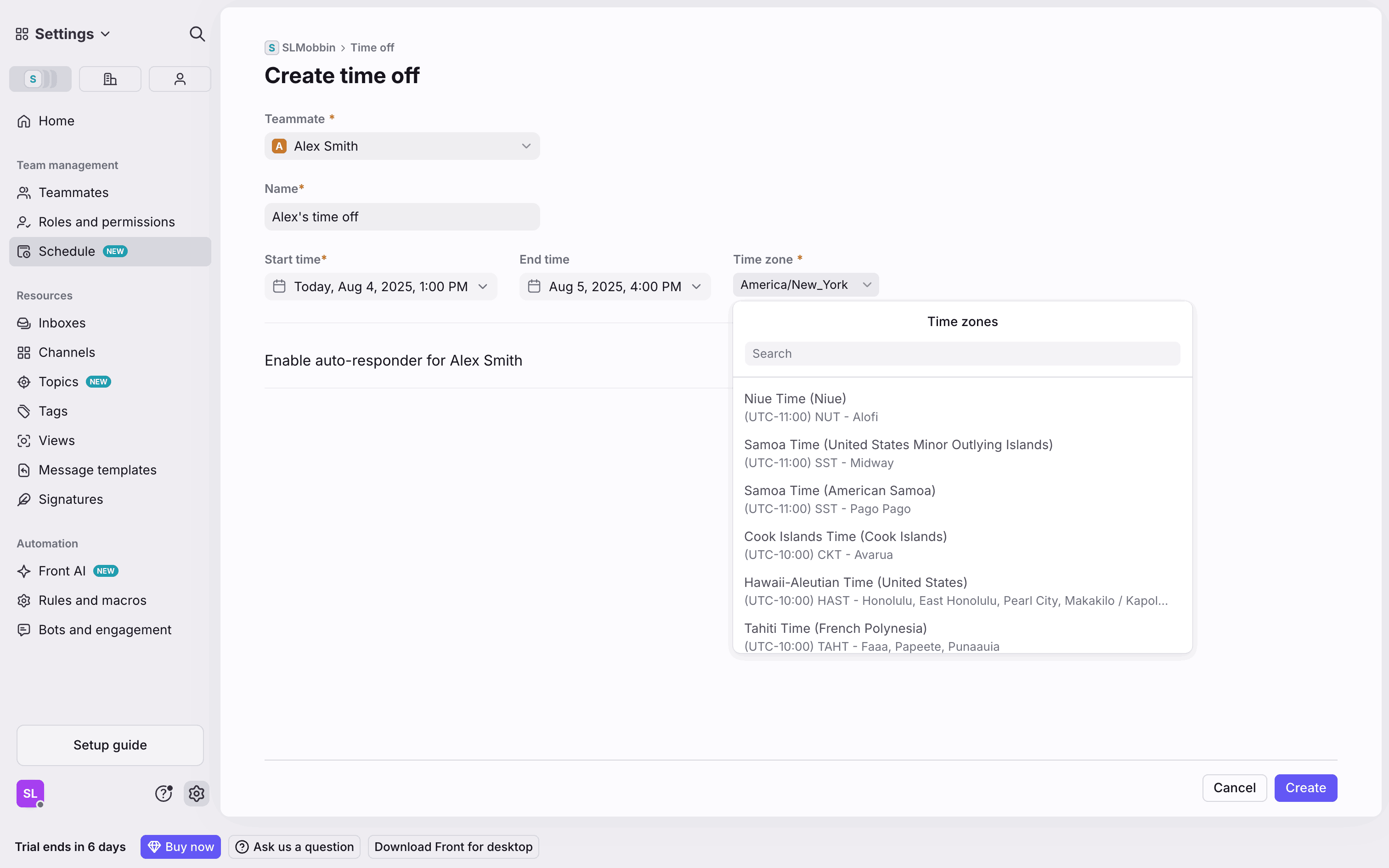 The user creates a time off request by filling out a form. The created time off is then displayed on the schedule page.