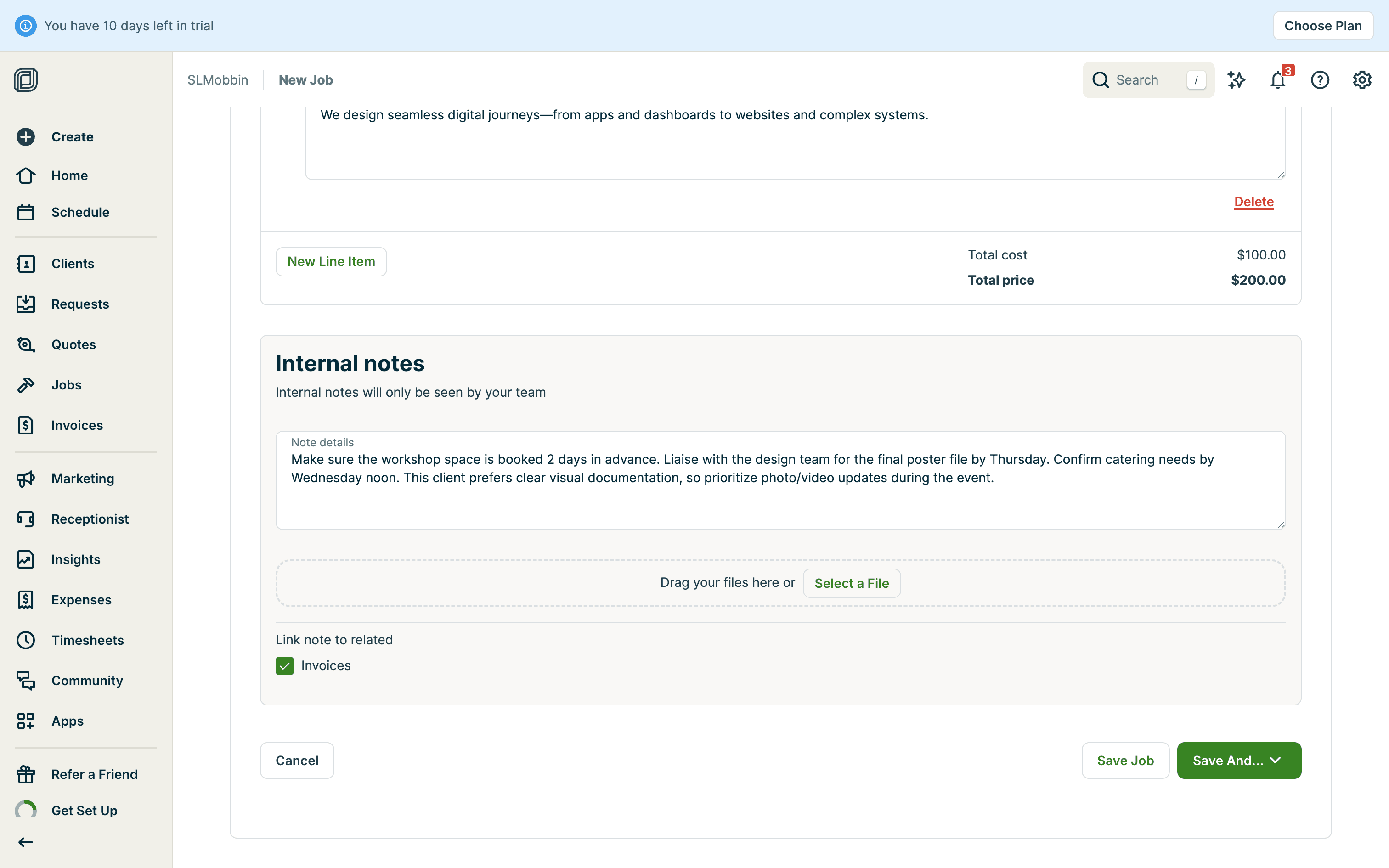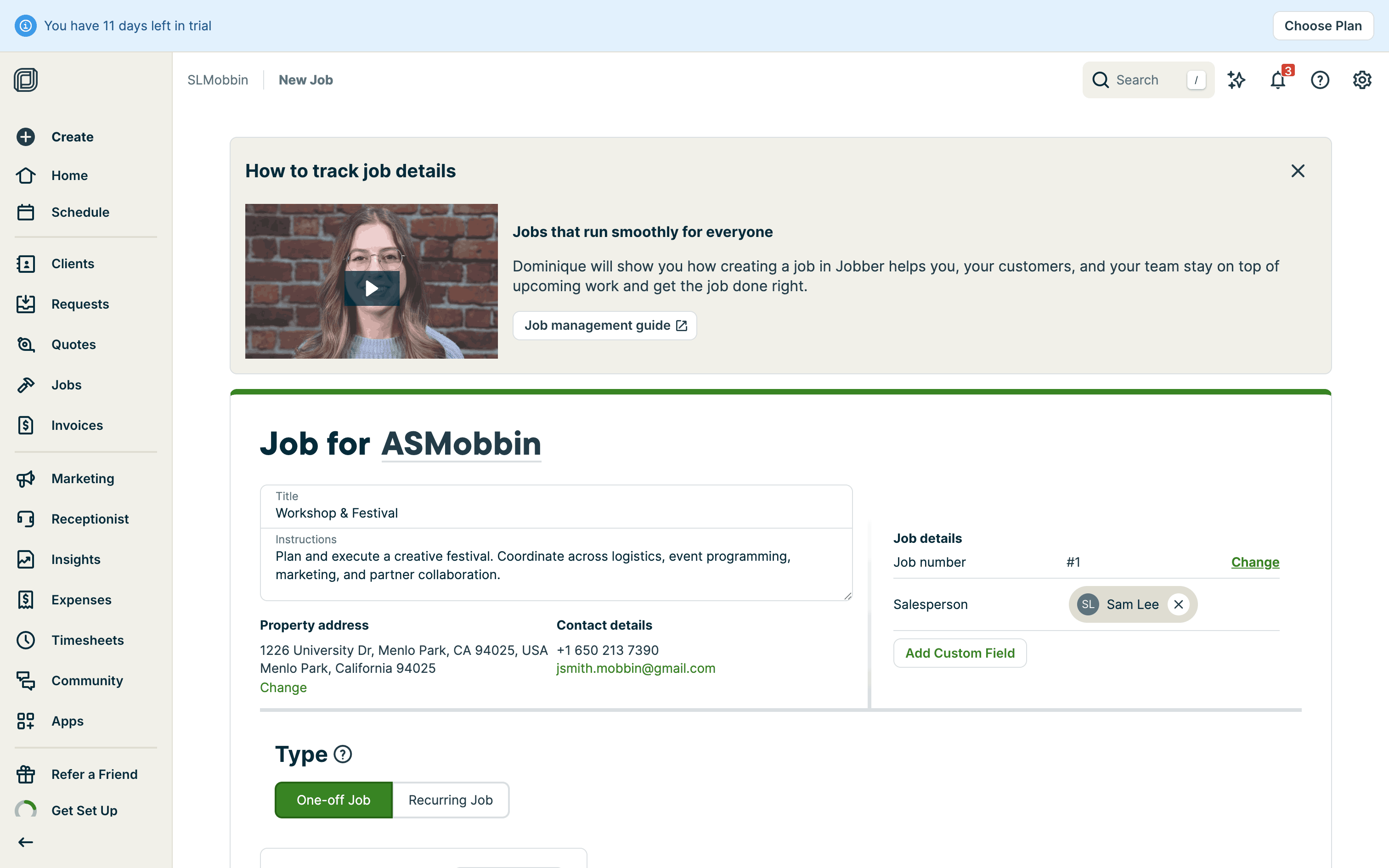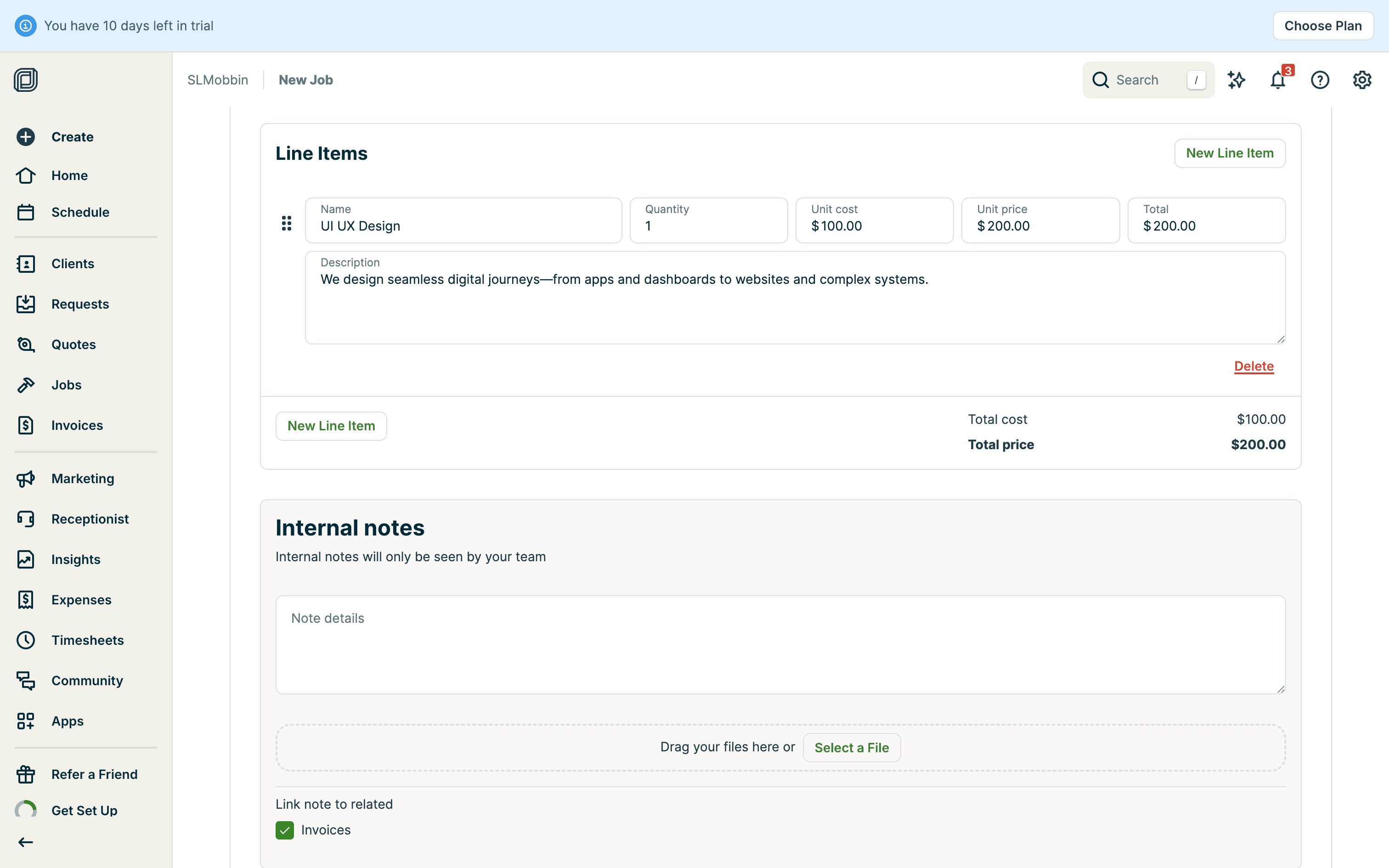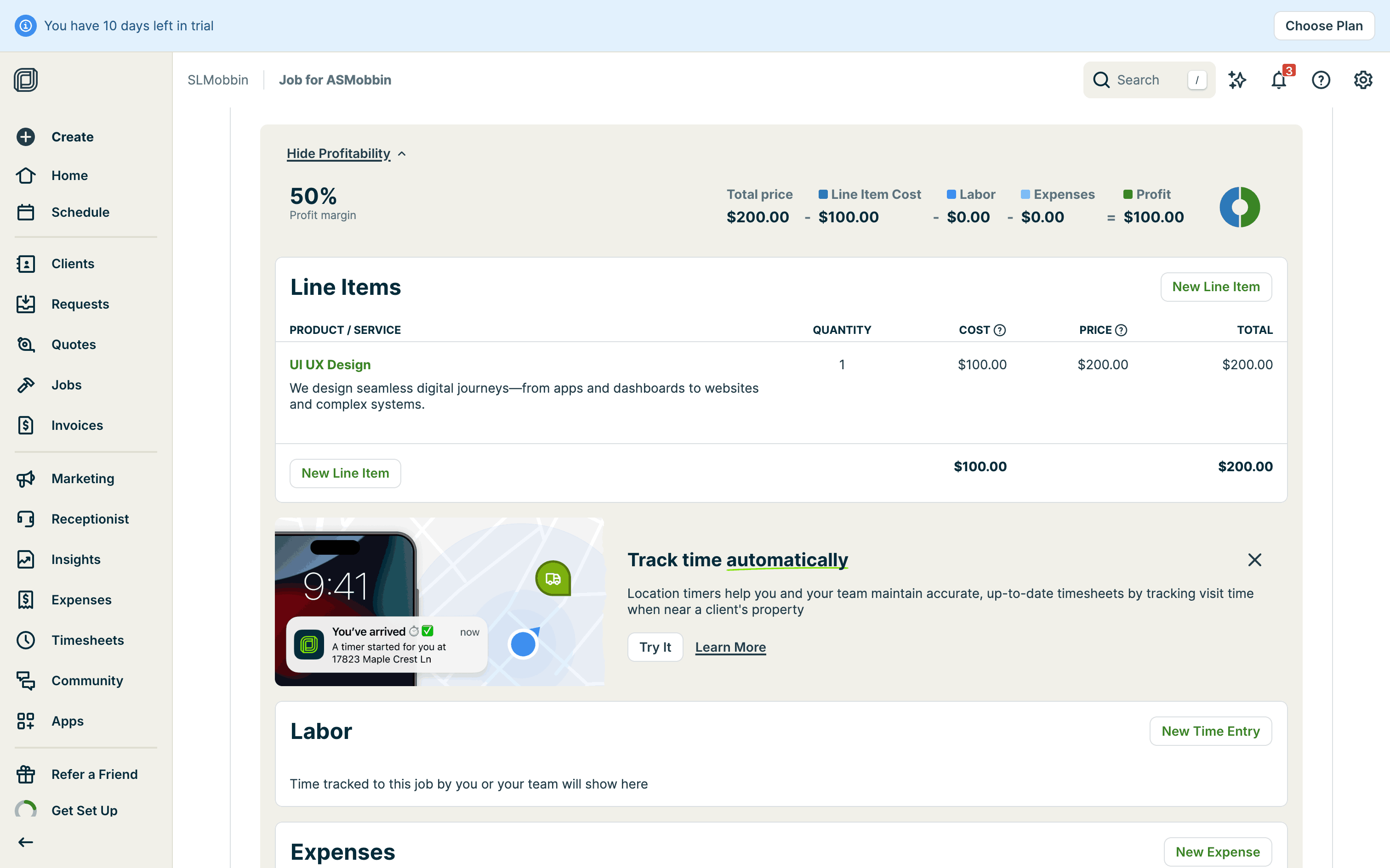 The user creates a new job by filling out the job creation form and then views the completed job details and profitability.