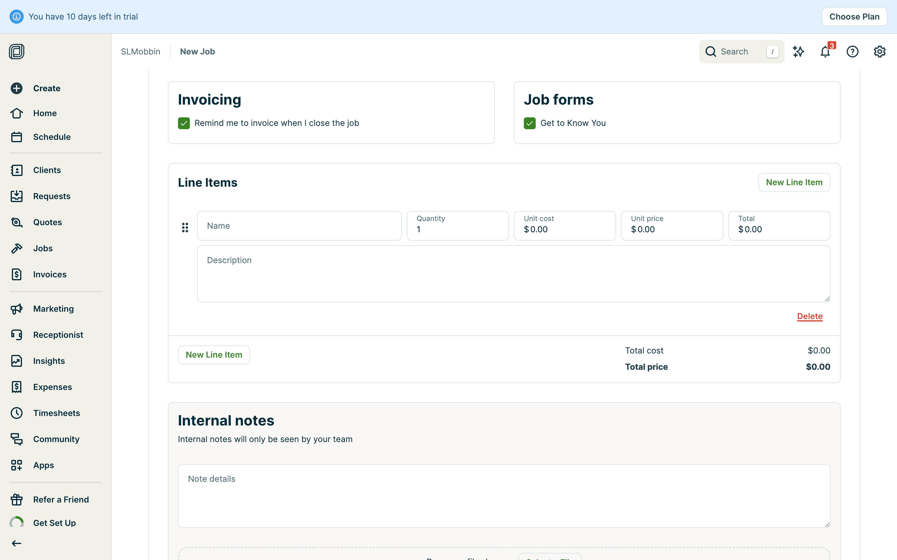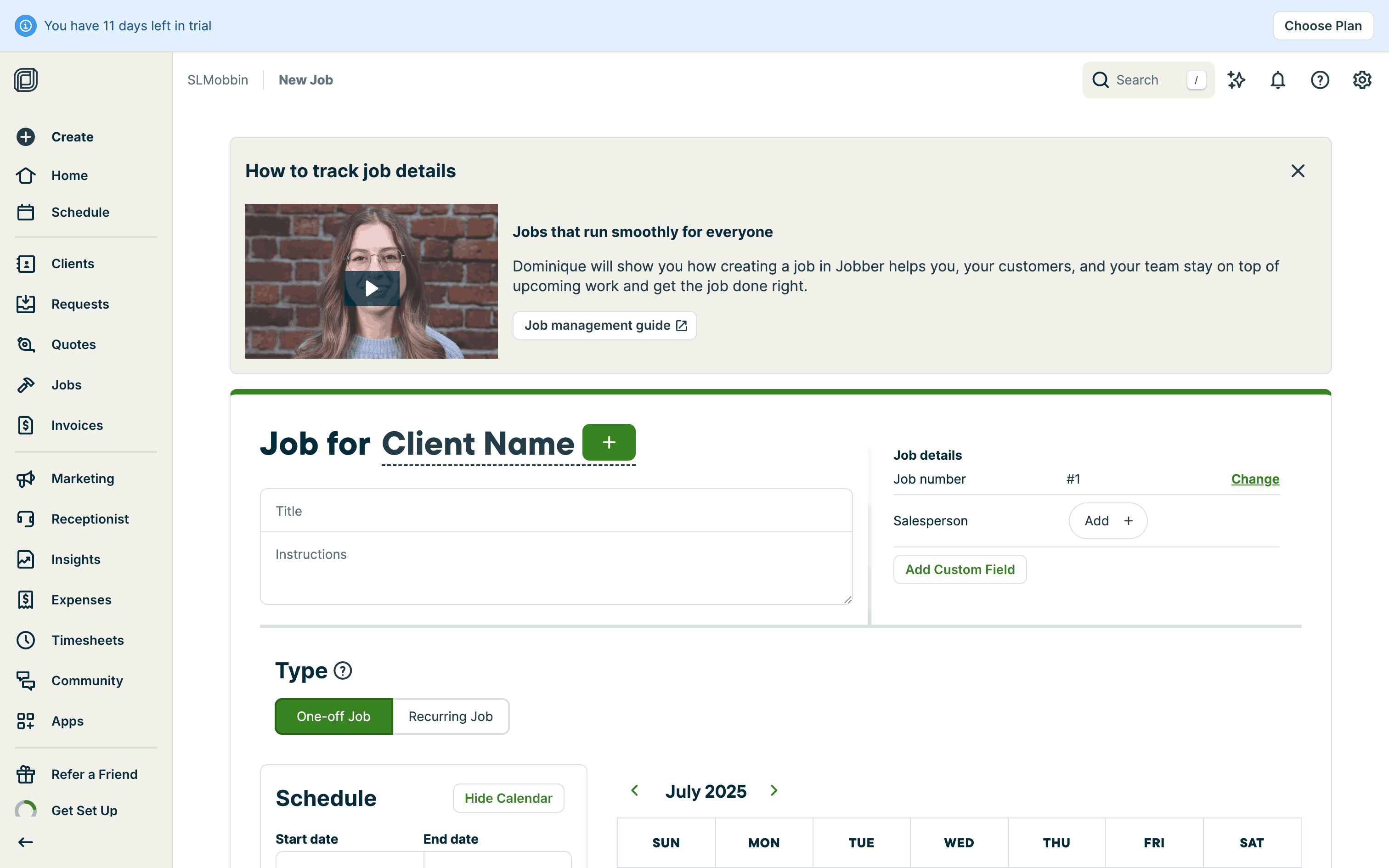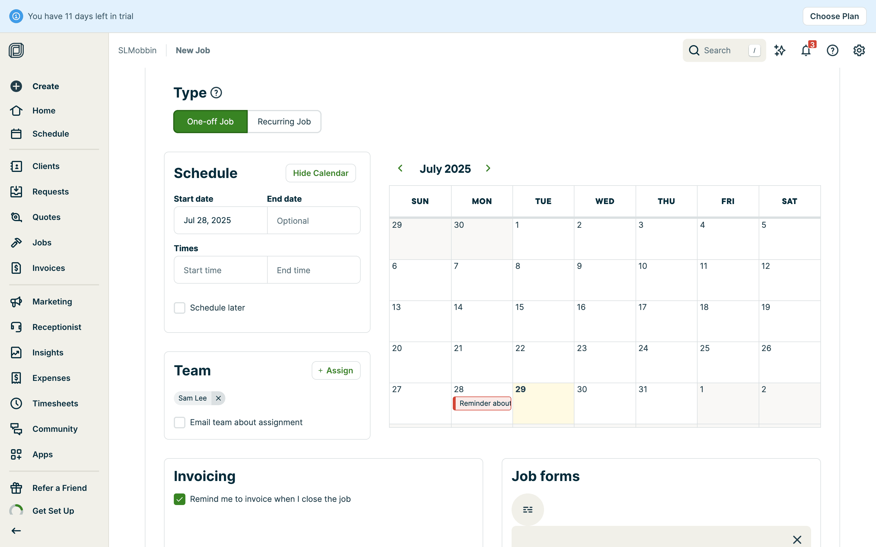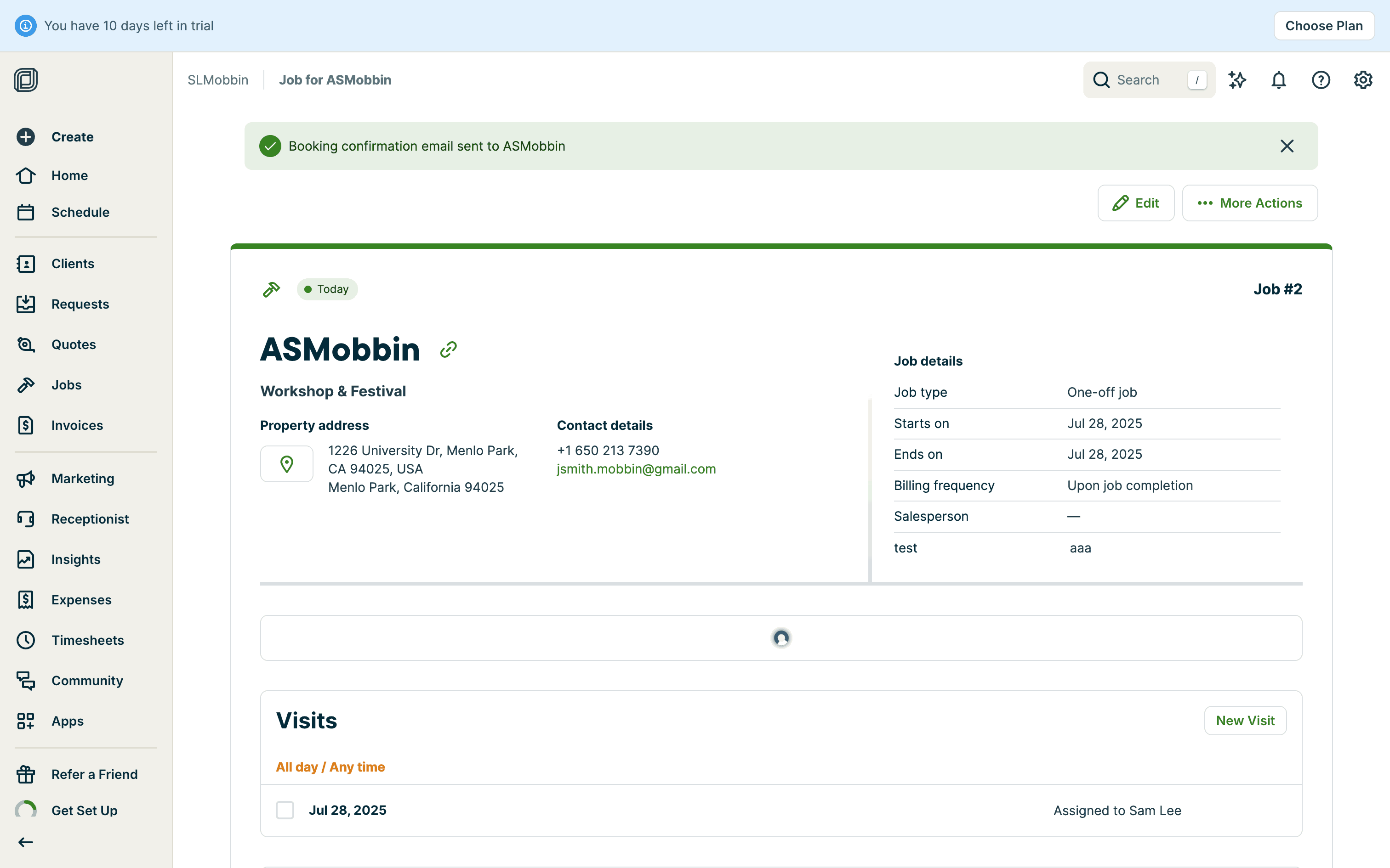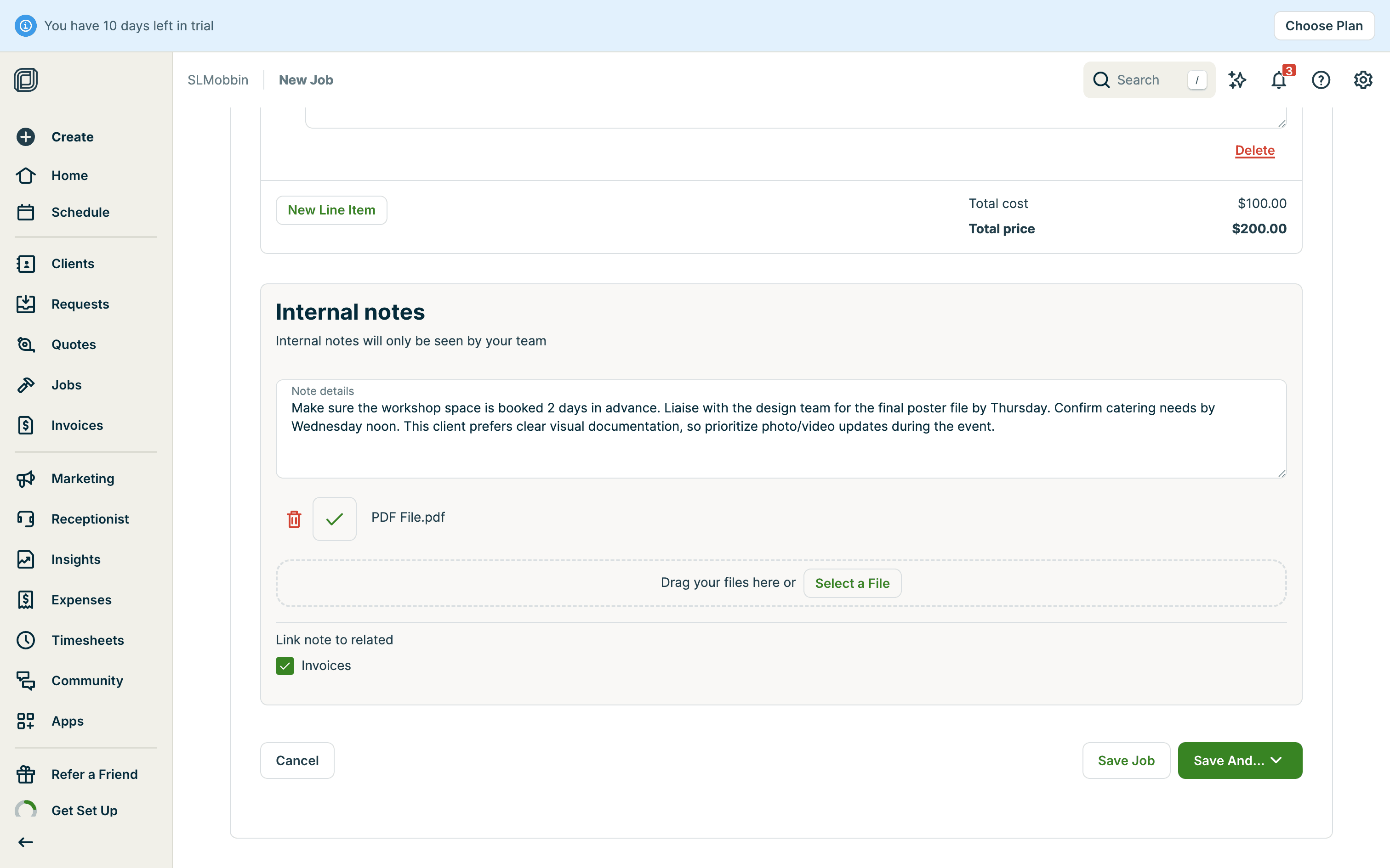 The user creates a new job by filling out the job creation form and then views the completed job details and profitability.