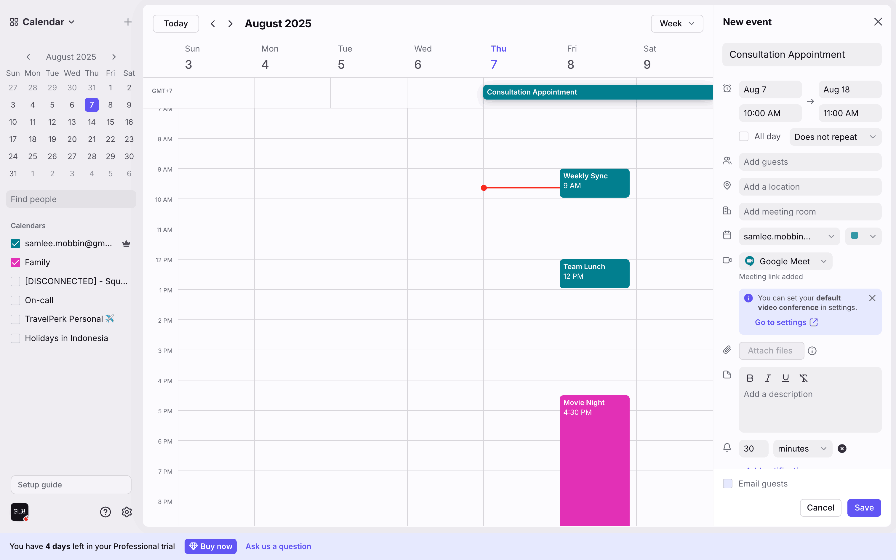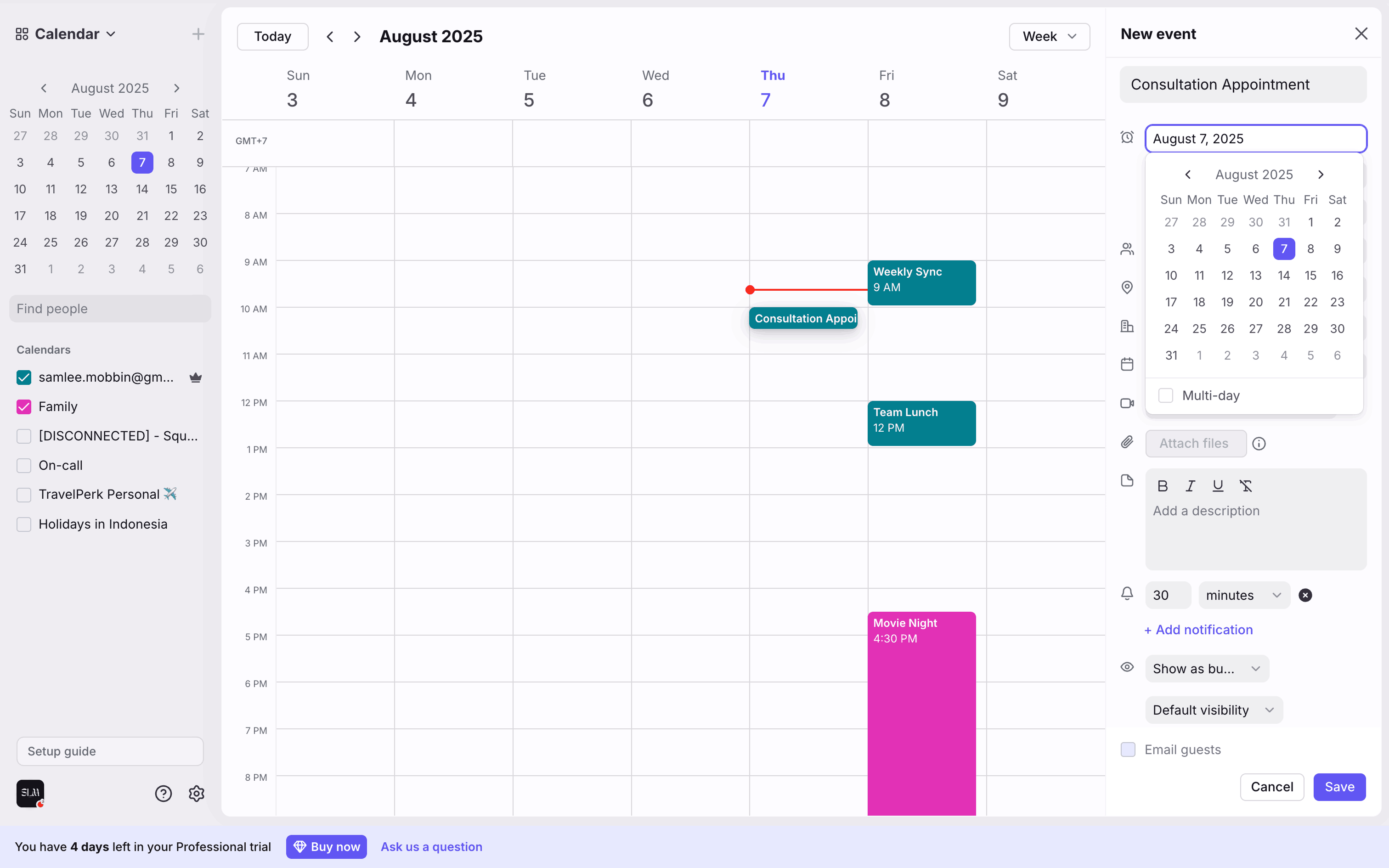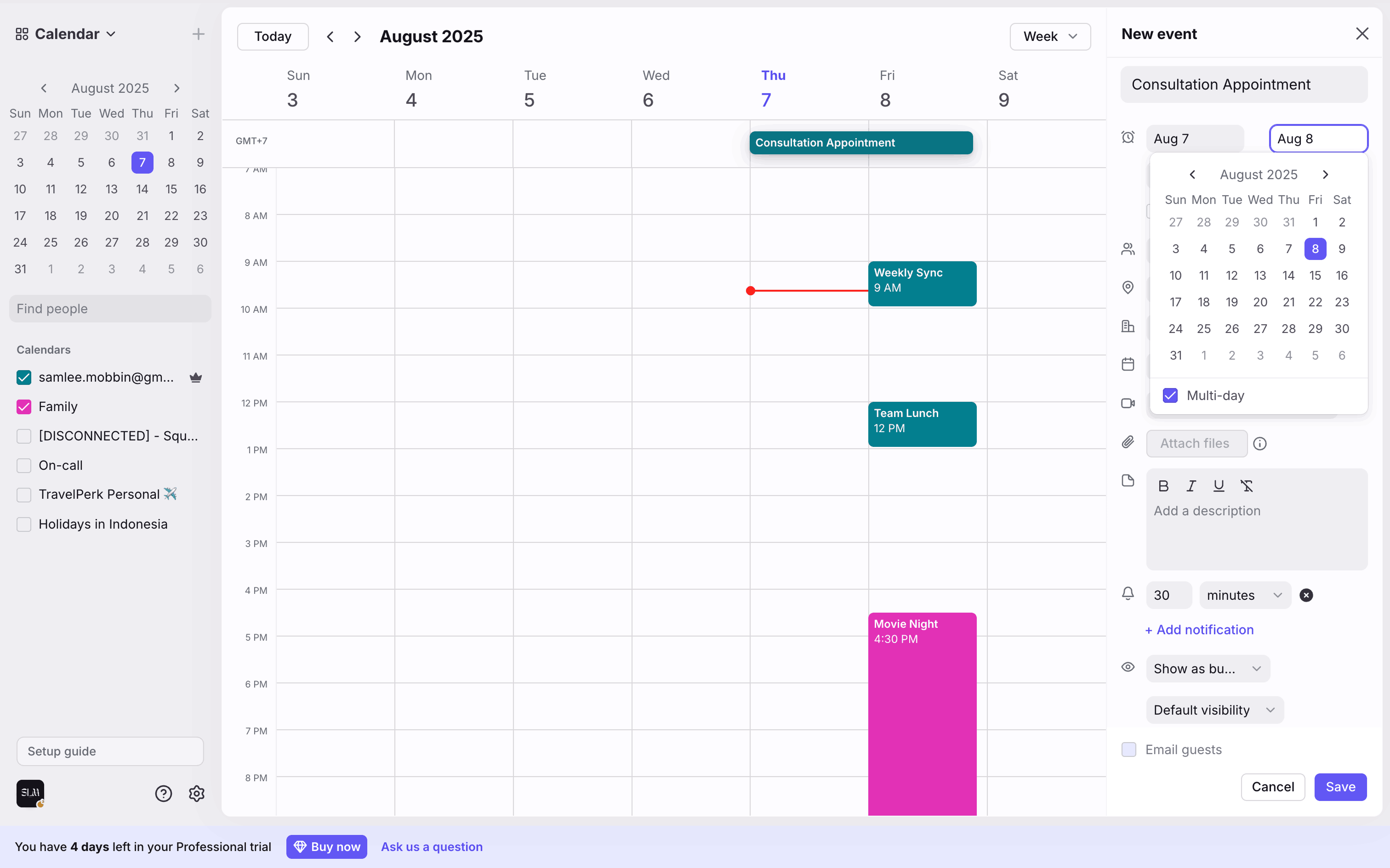 The user creates a new event by entering details and saving it. The event is then displayed on the calendar.