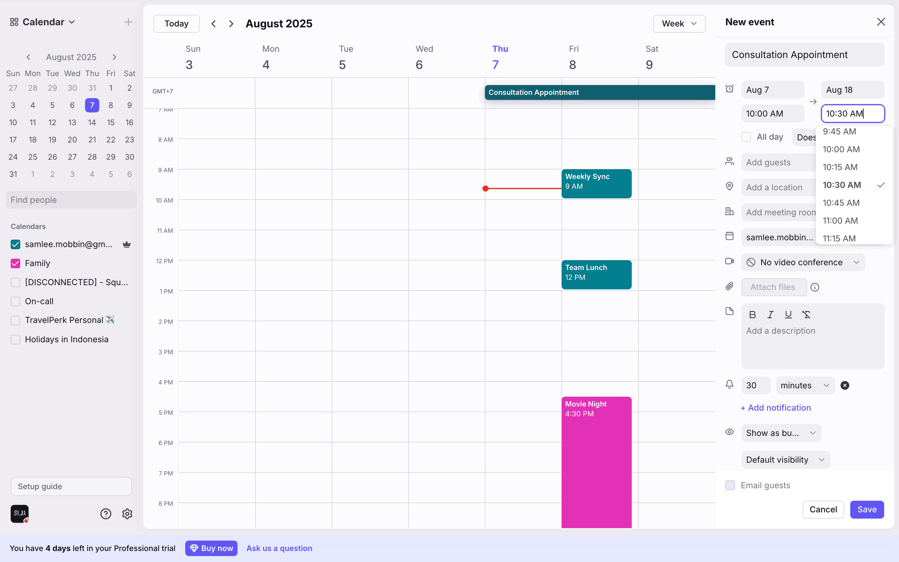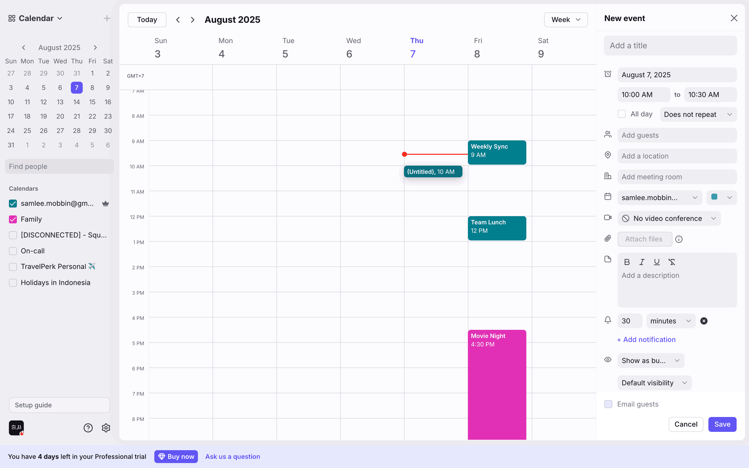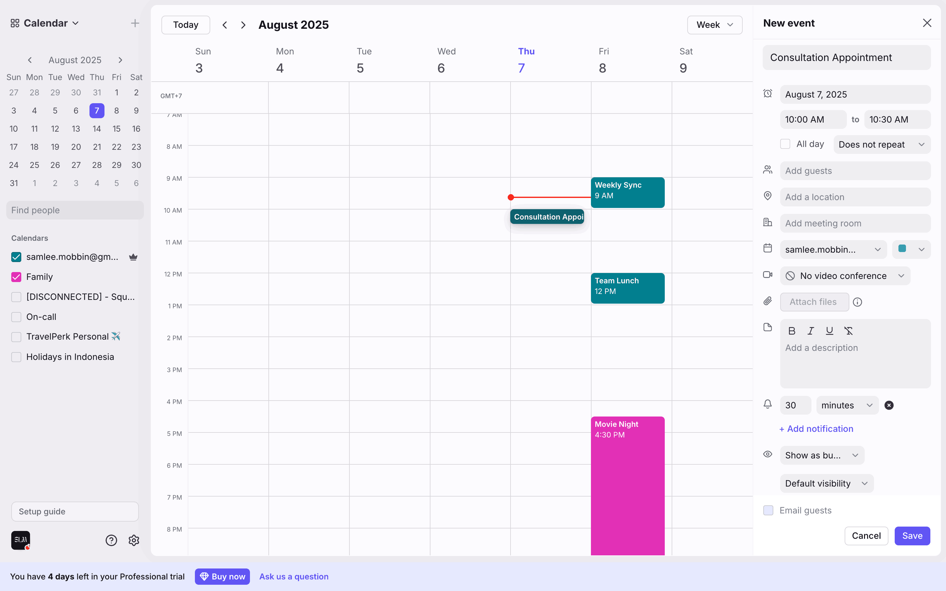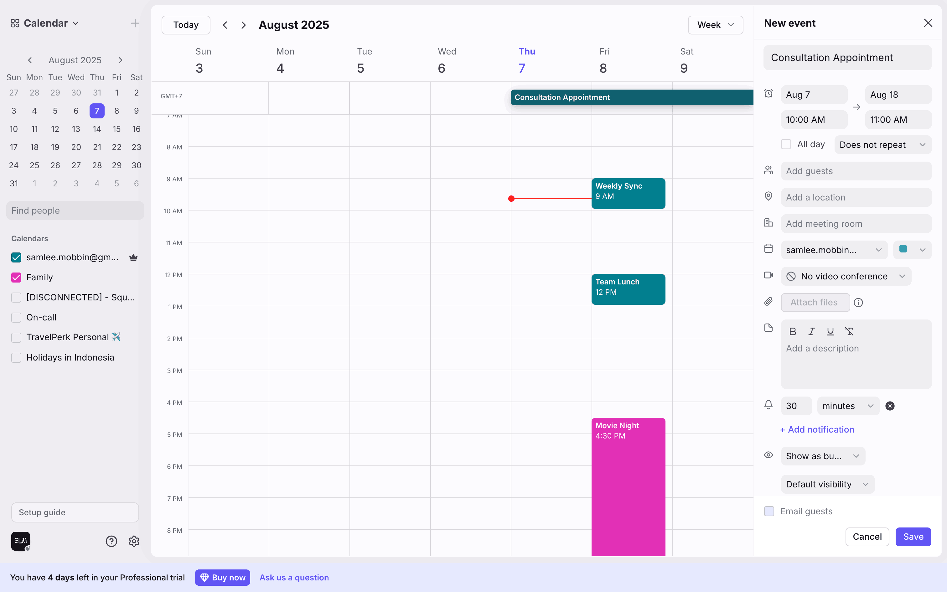 The user creates a new event by entering details and saving it. The event is then displayed on the calendar.