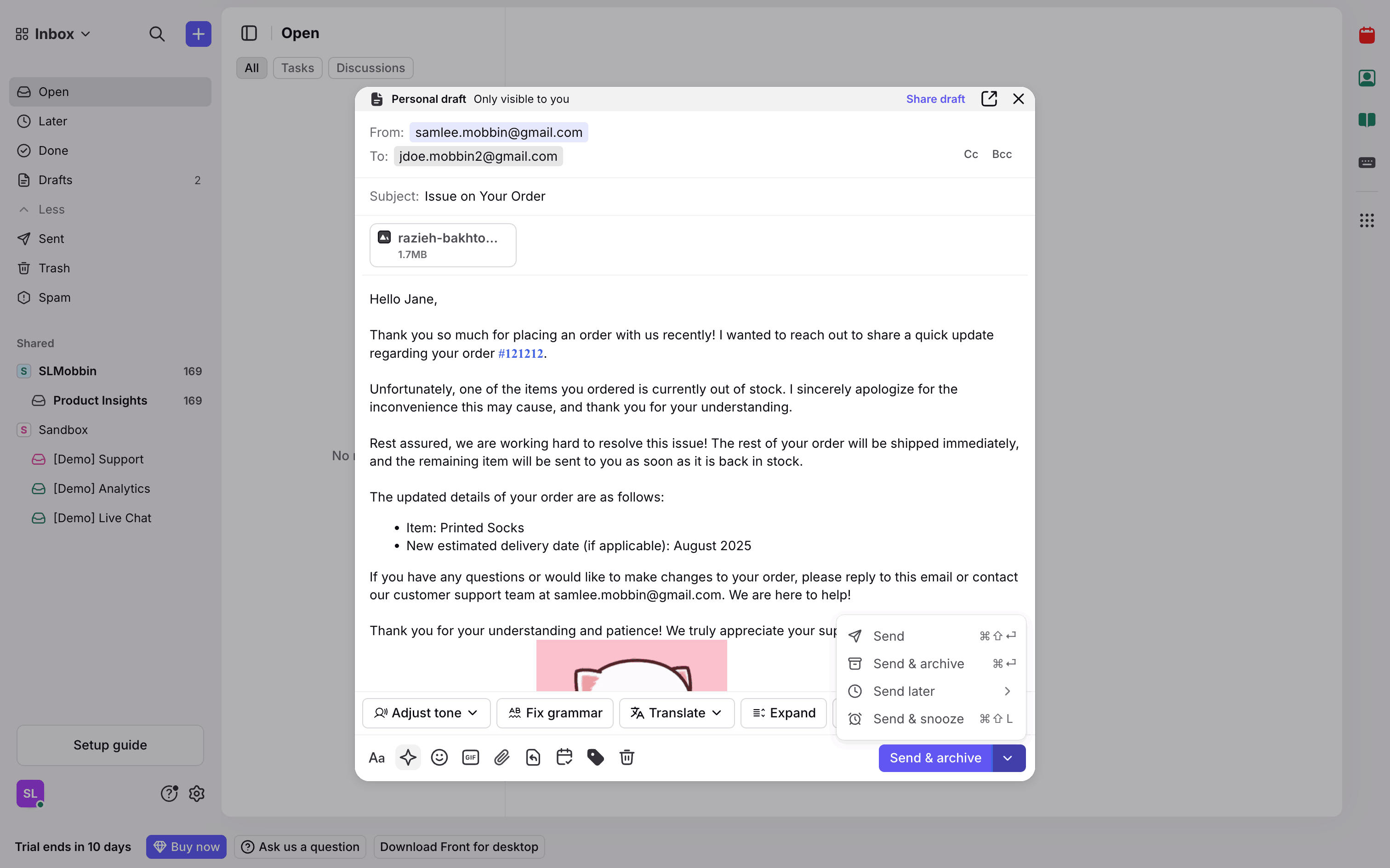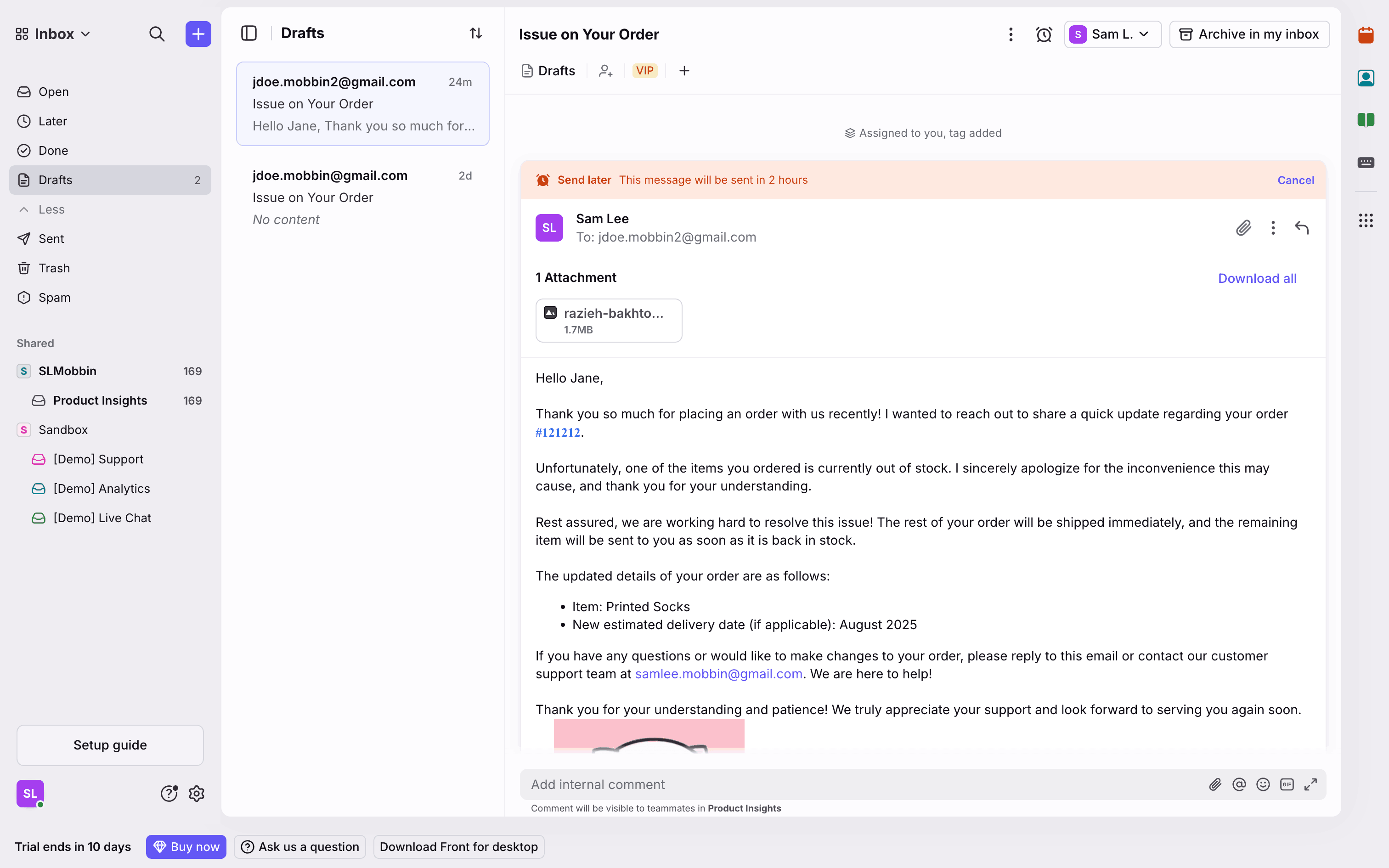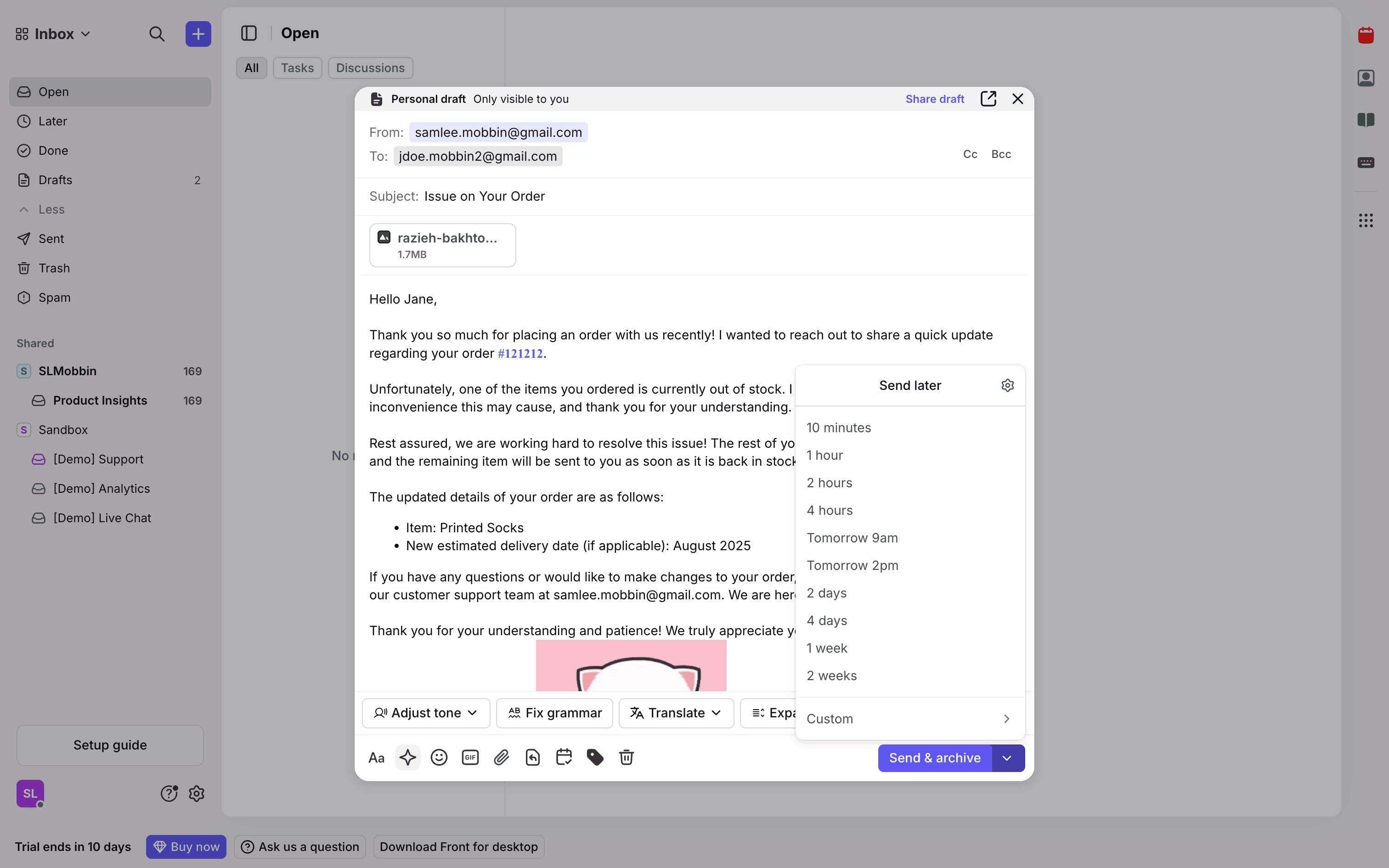 The user composes an email and schedules it to be sent later. The email is then saved in drafts with a confirmation of the scheduled send time.