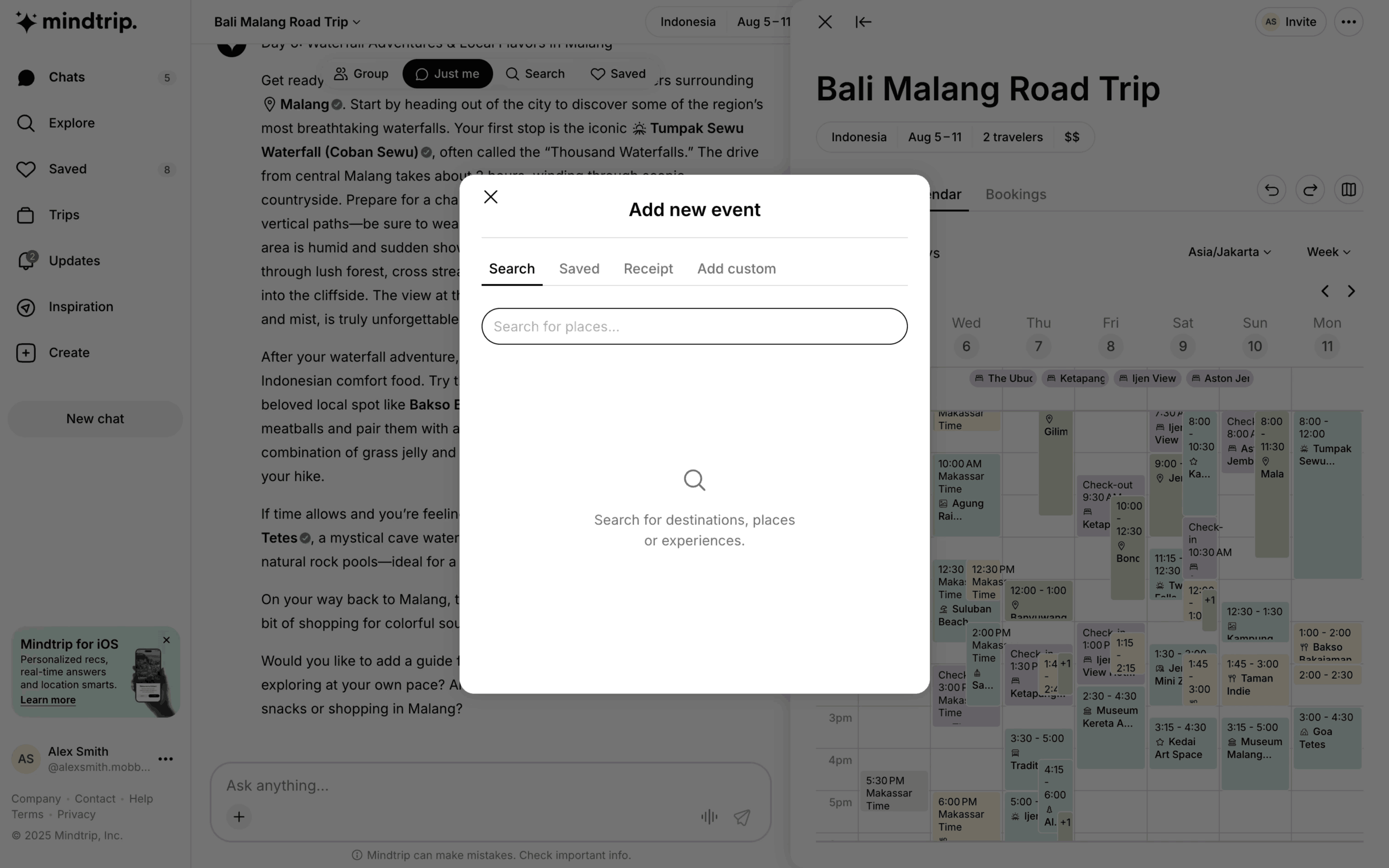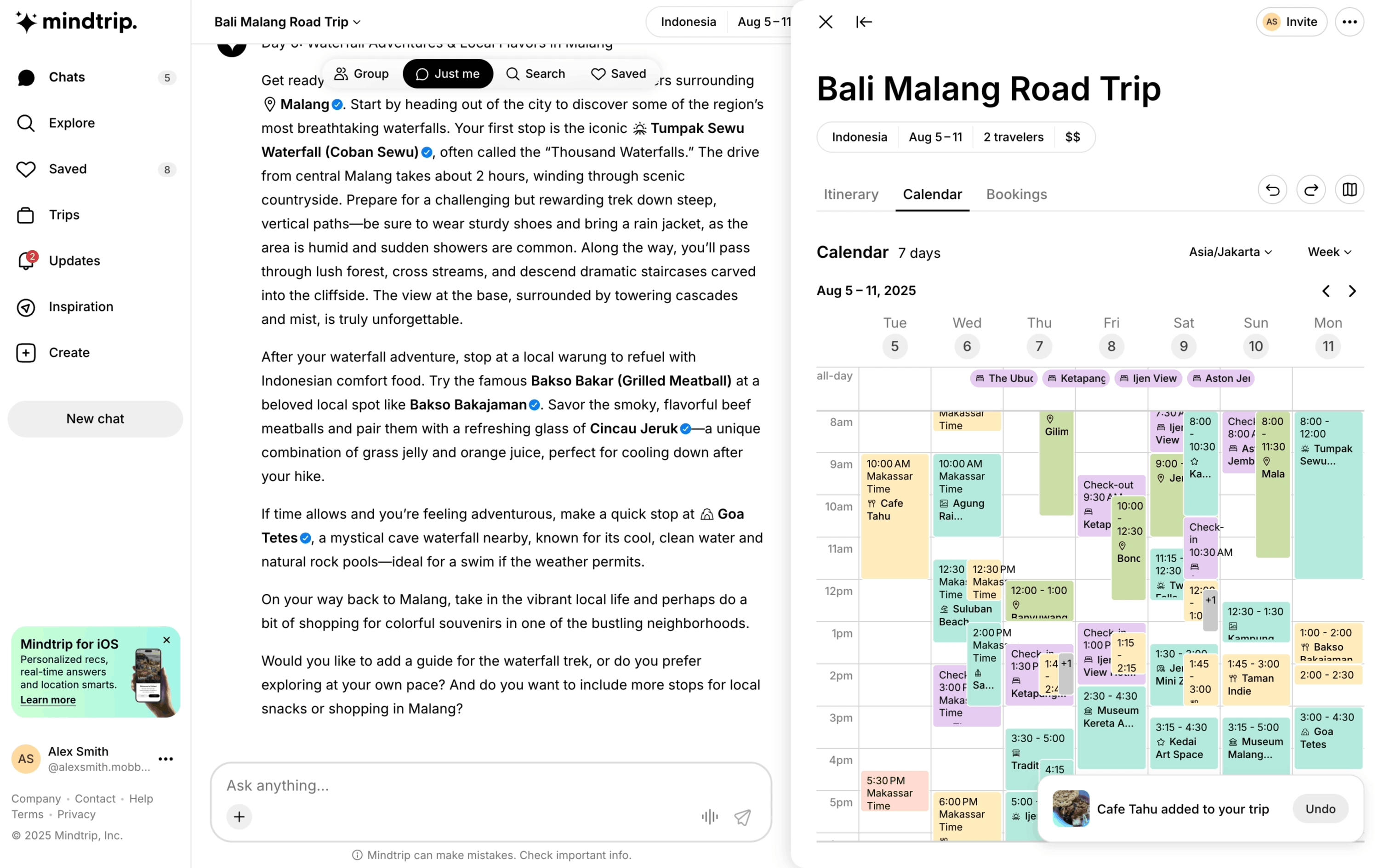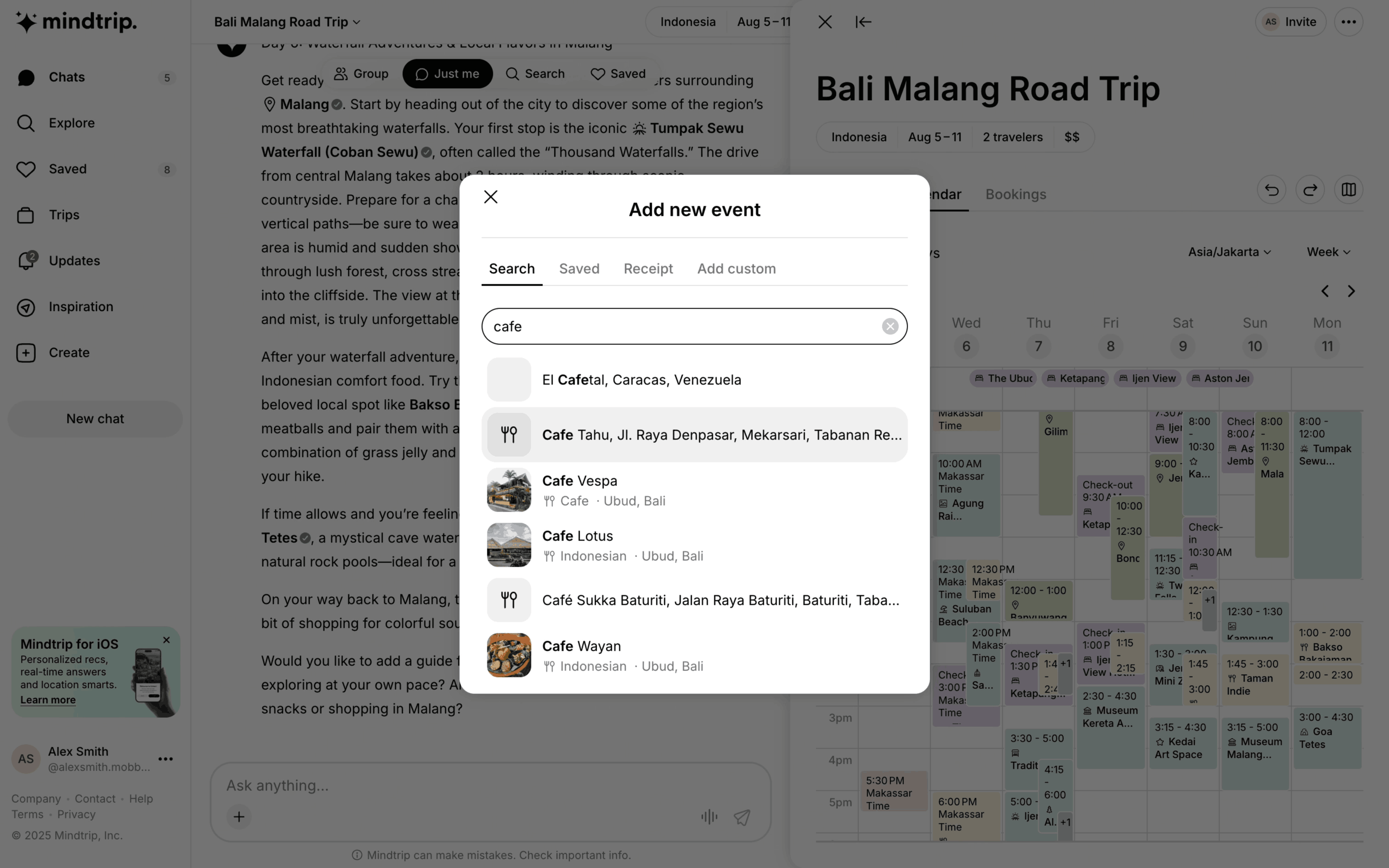 The user adds a cafe to their trip itinerary. They search for a cafe and add it to the calendar, which is then updated.