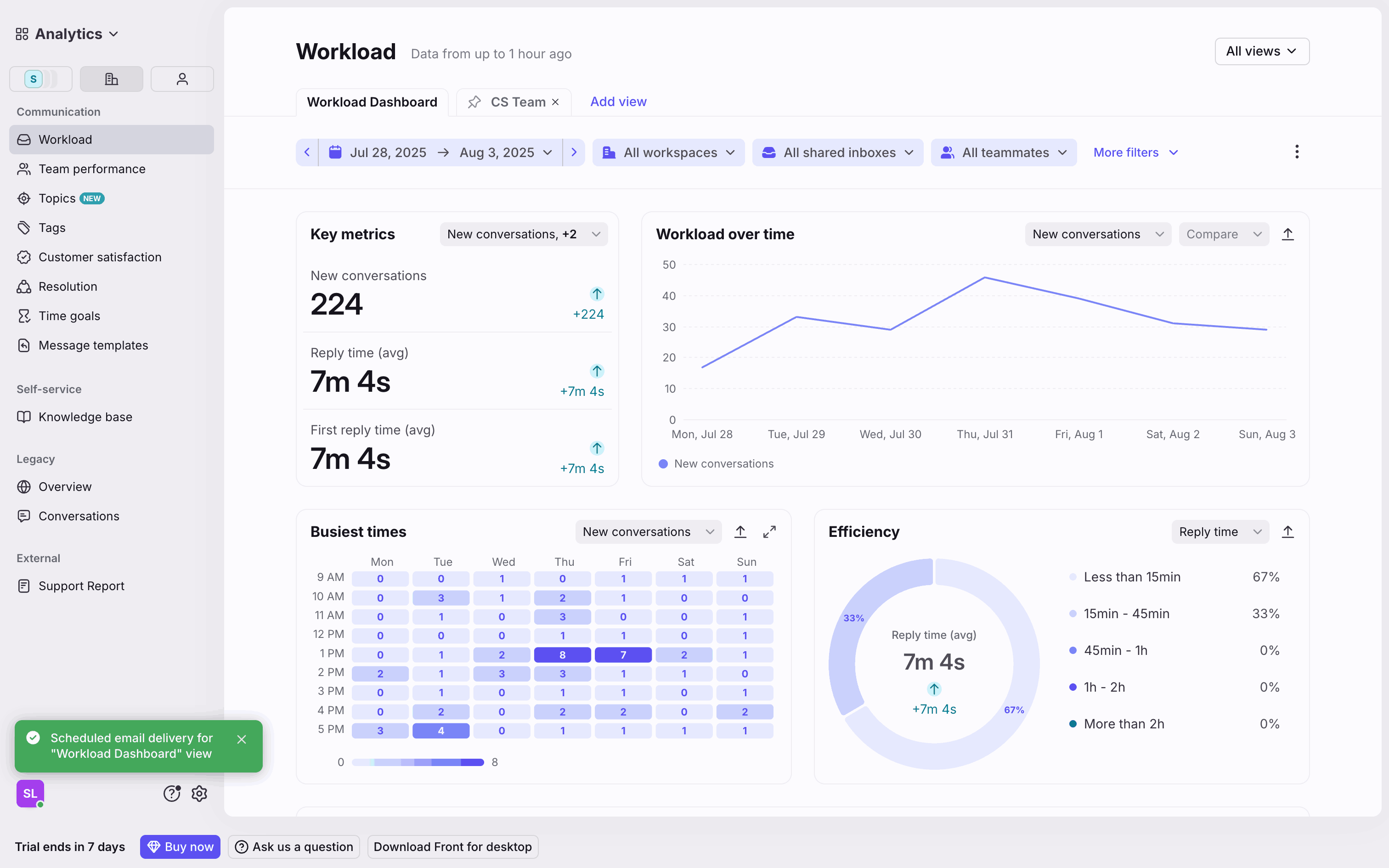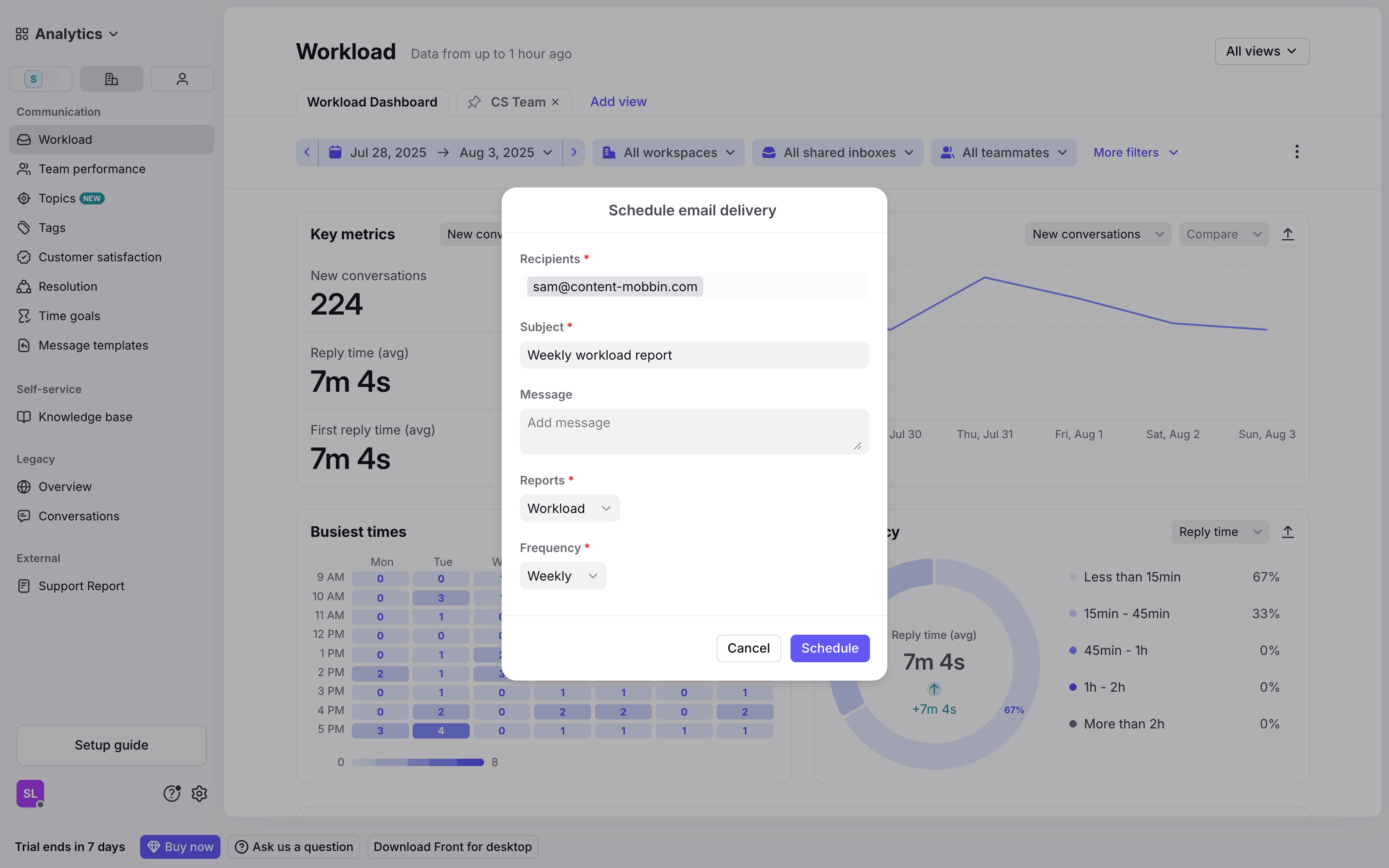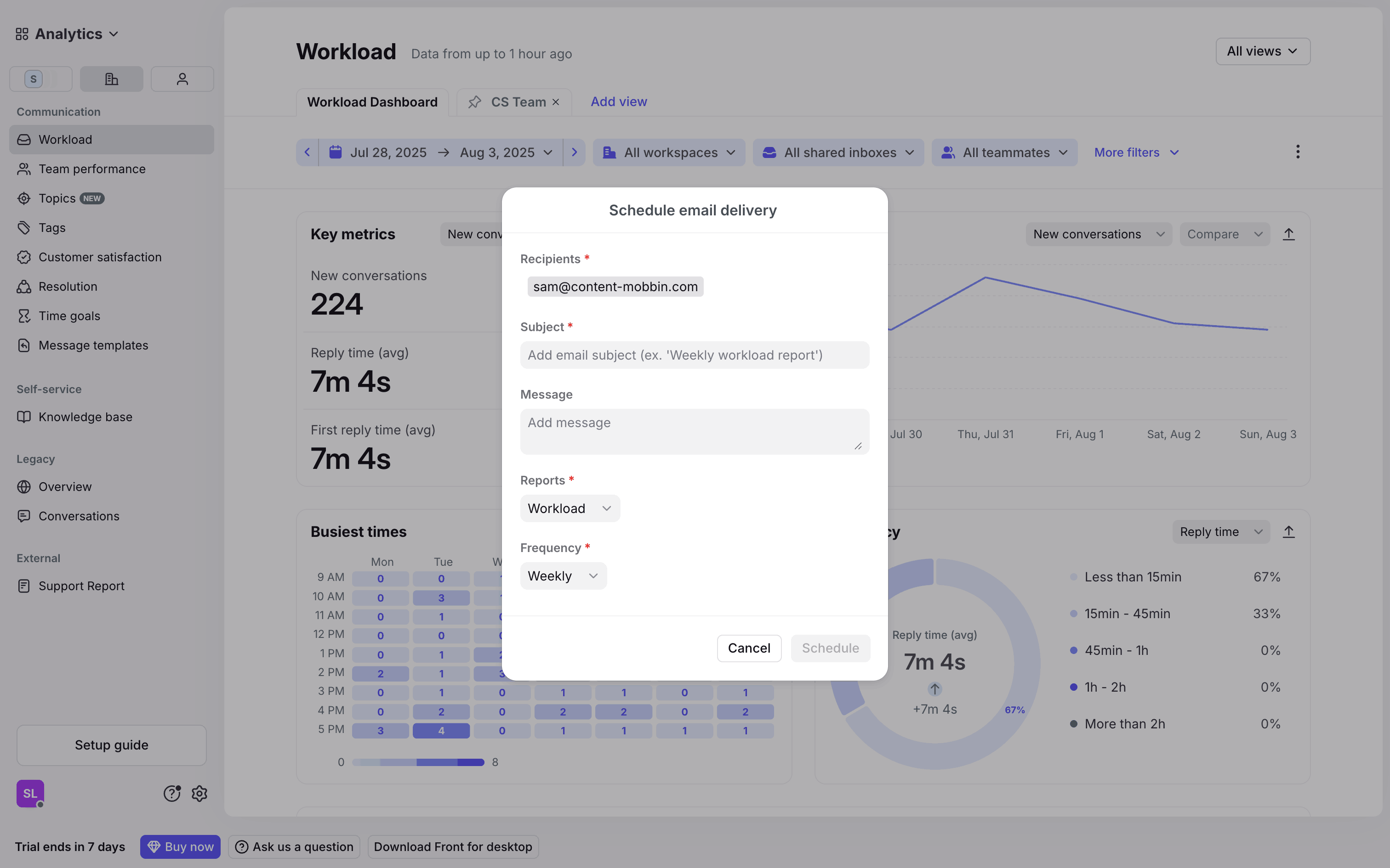 The user schedules an email delivery for the workload dashboard. They fill out a form and receive a confirmation message.