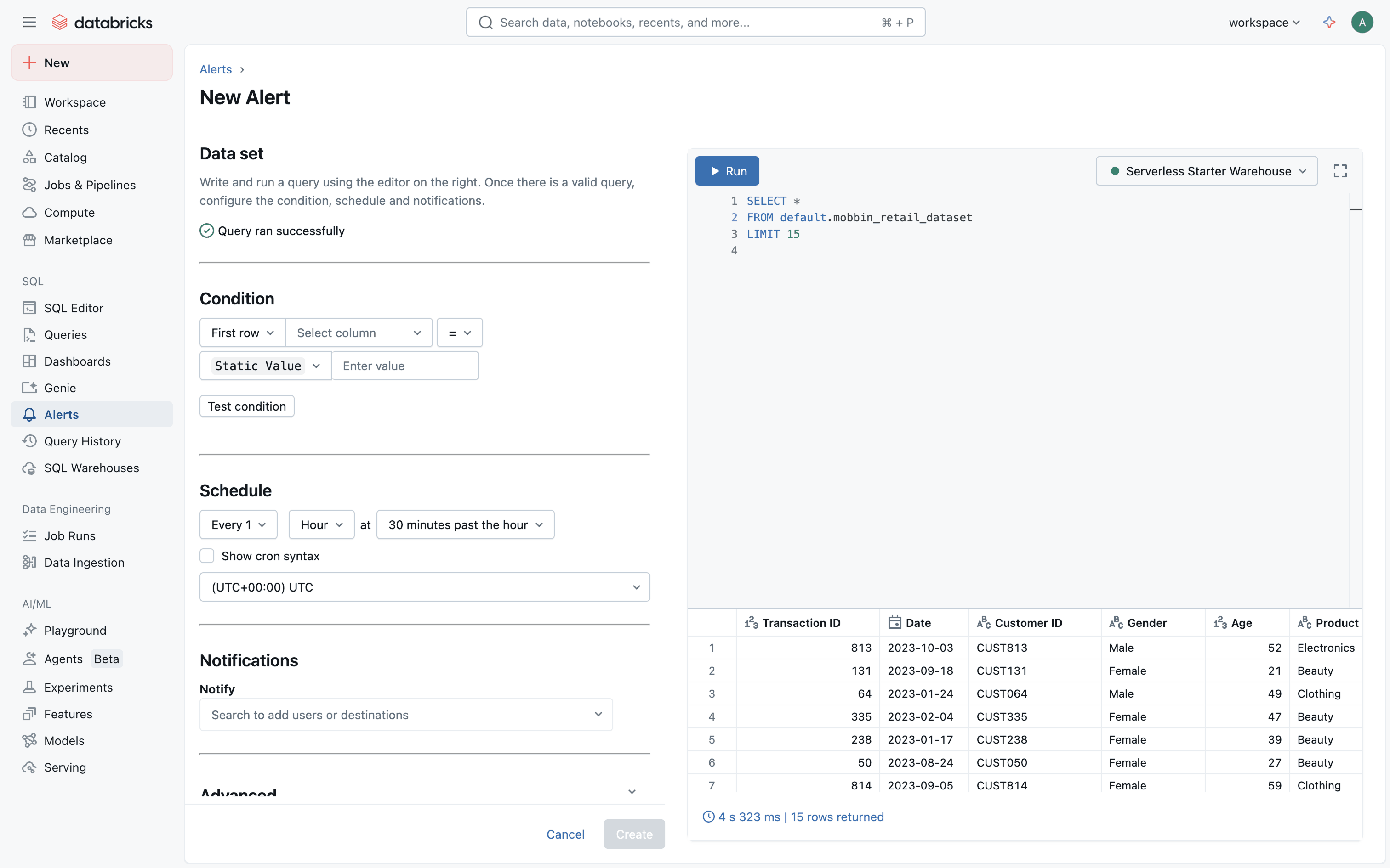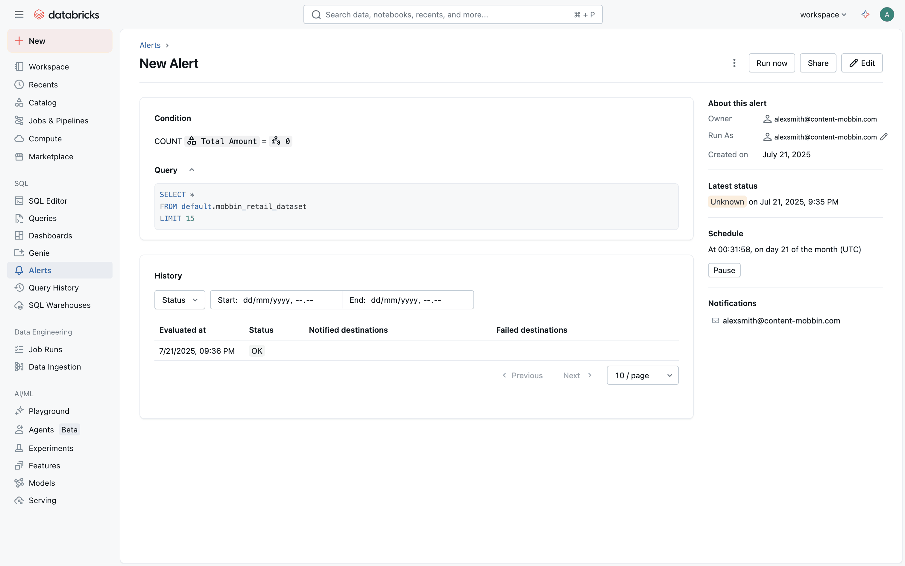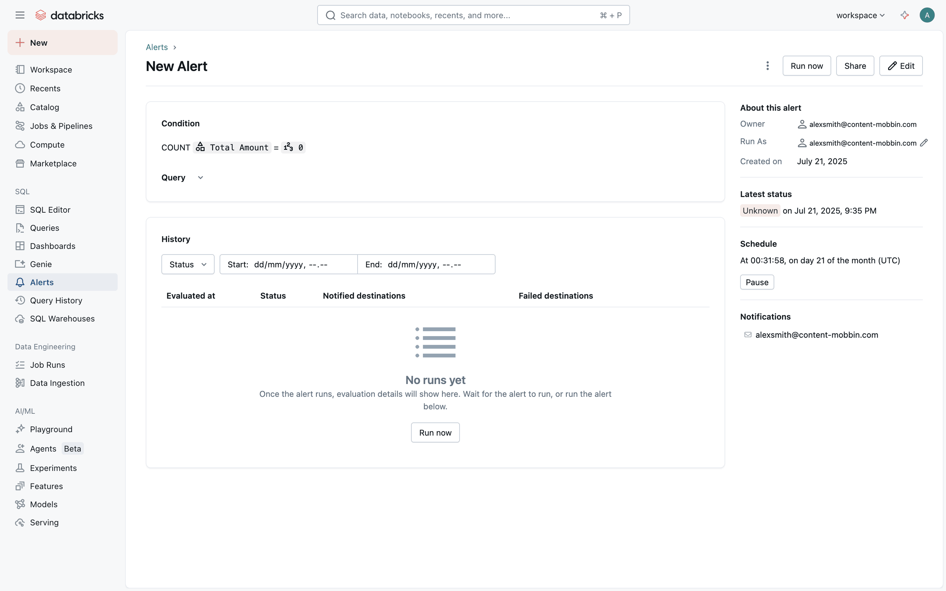 The user creates a new alert by defining a SQL query, setting conditions and schedule, and configuring notifications. The user then views the alert details and run status.