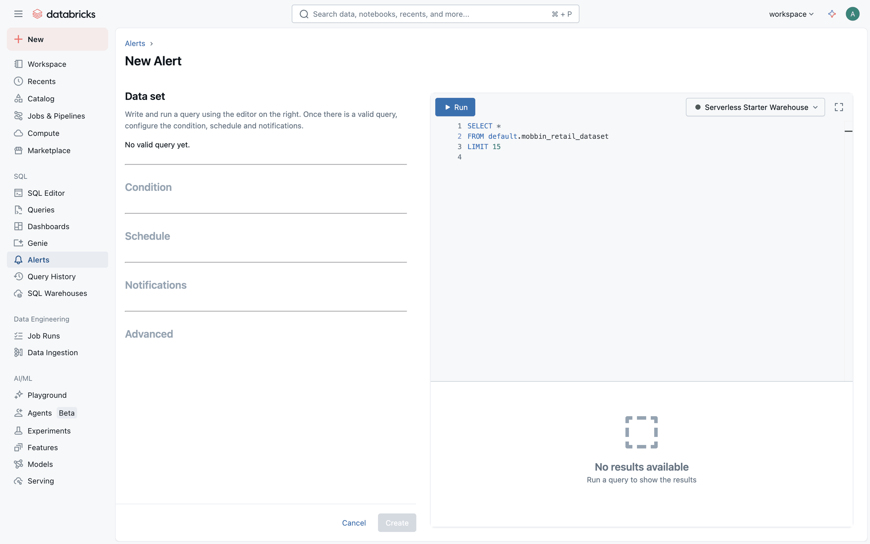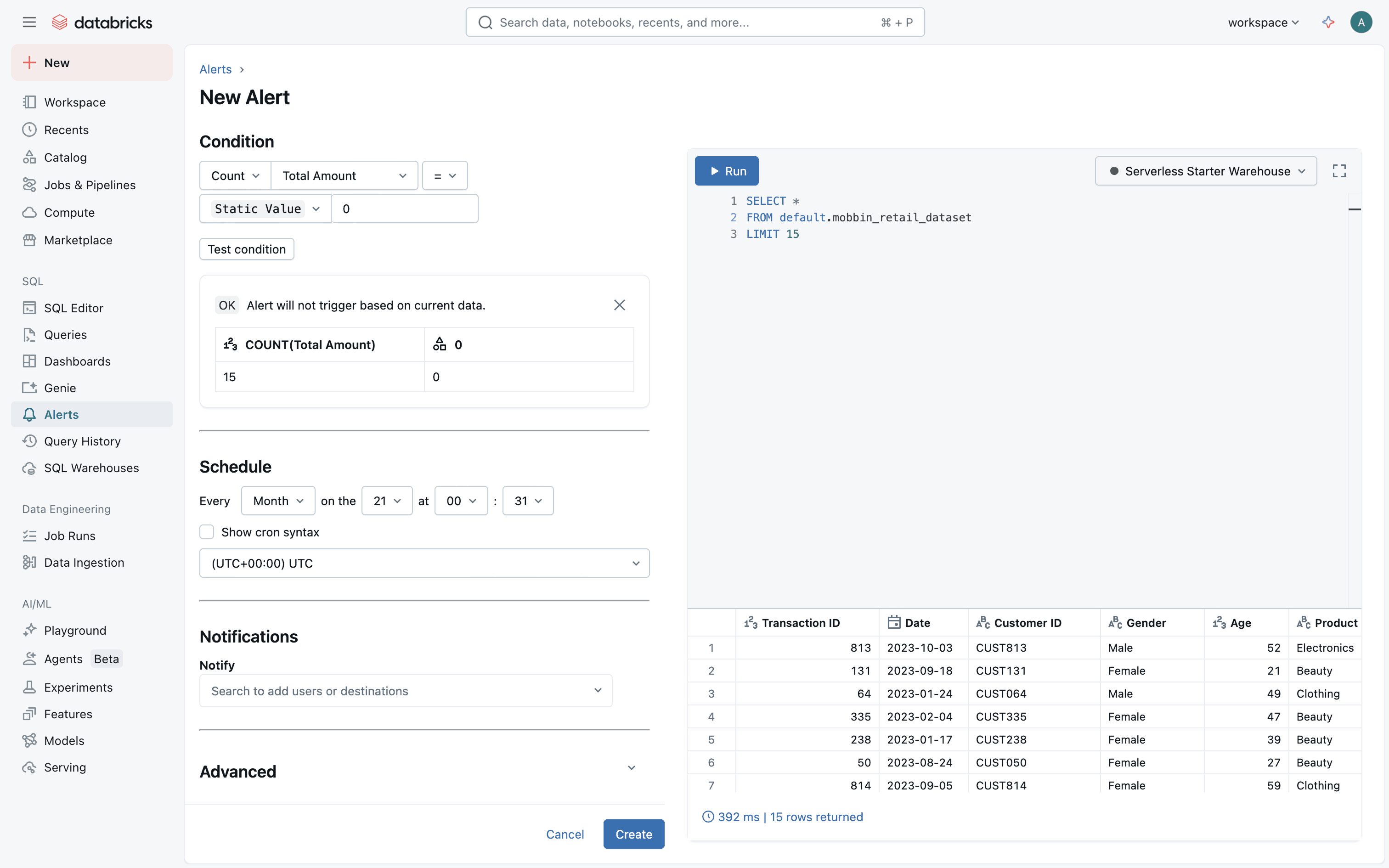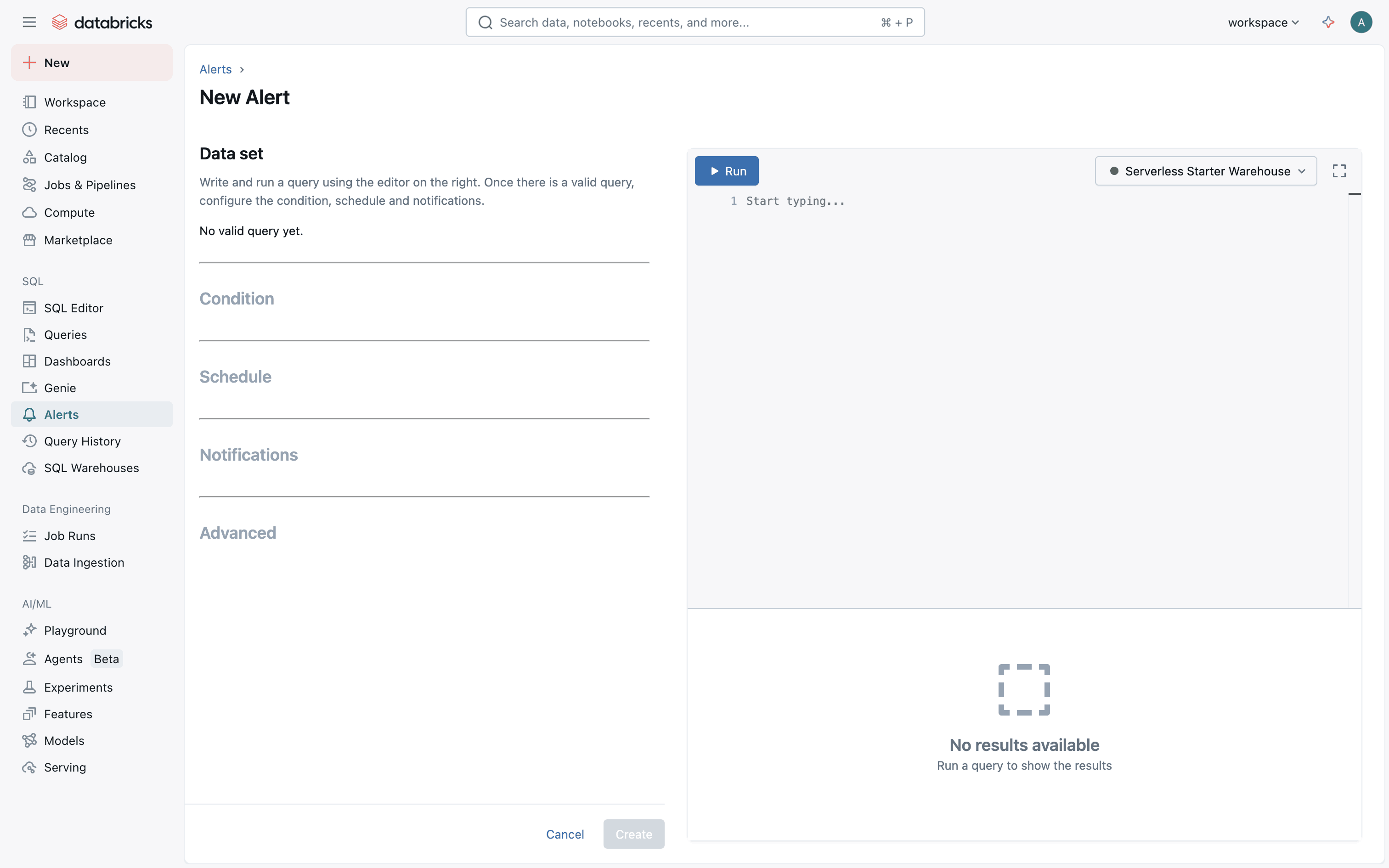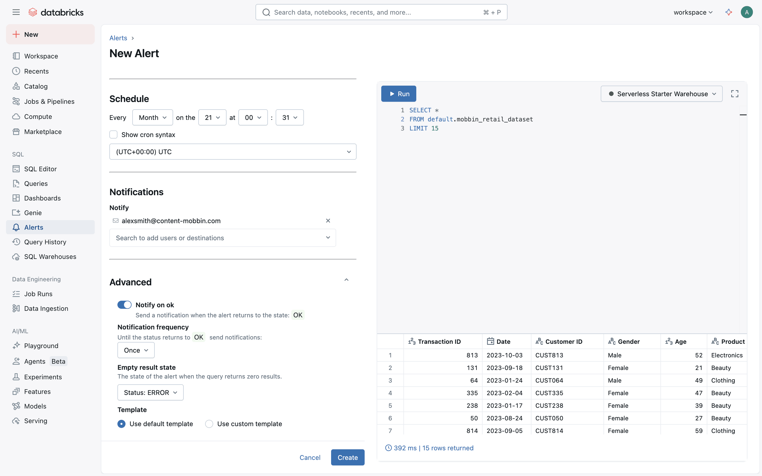 The user creates a new alert by defining a SQL query, setting conditions and schedule, and configuring notifications. The user then views the alert details and run status.