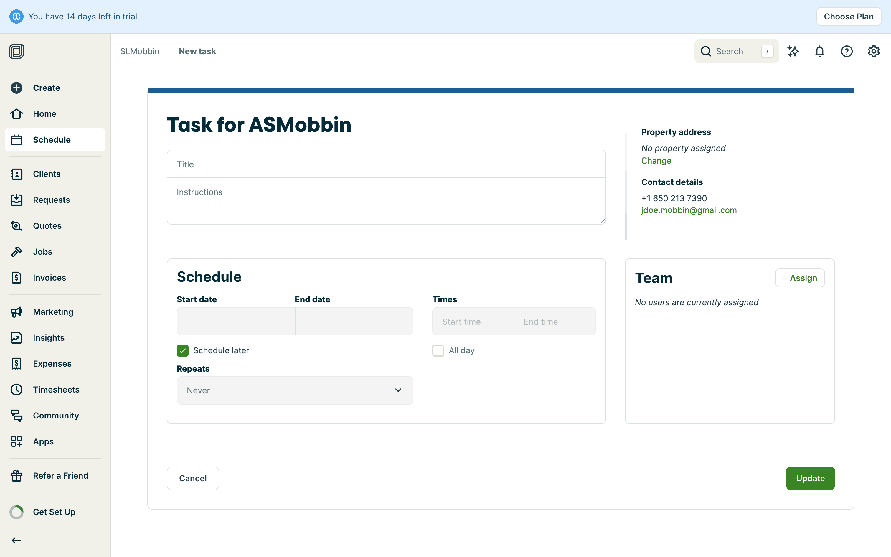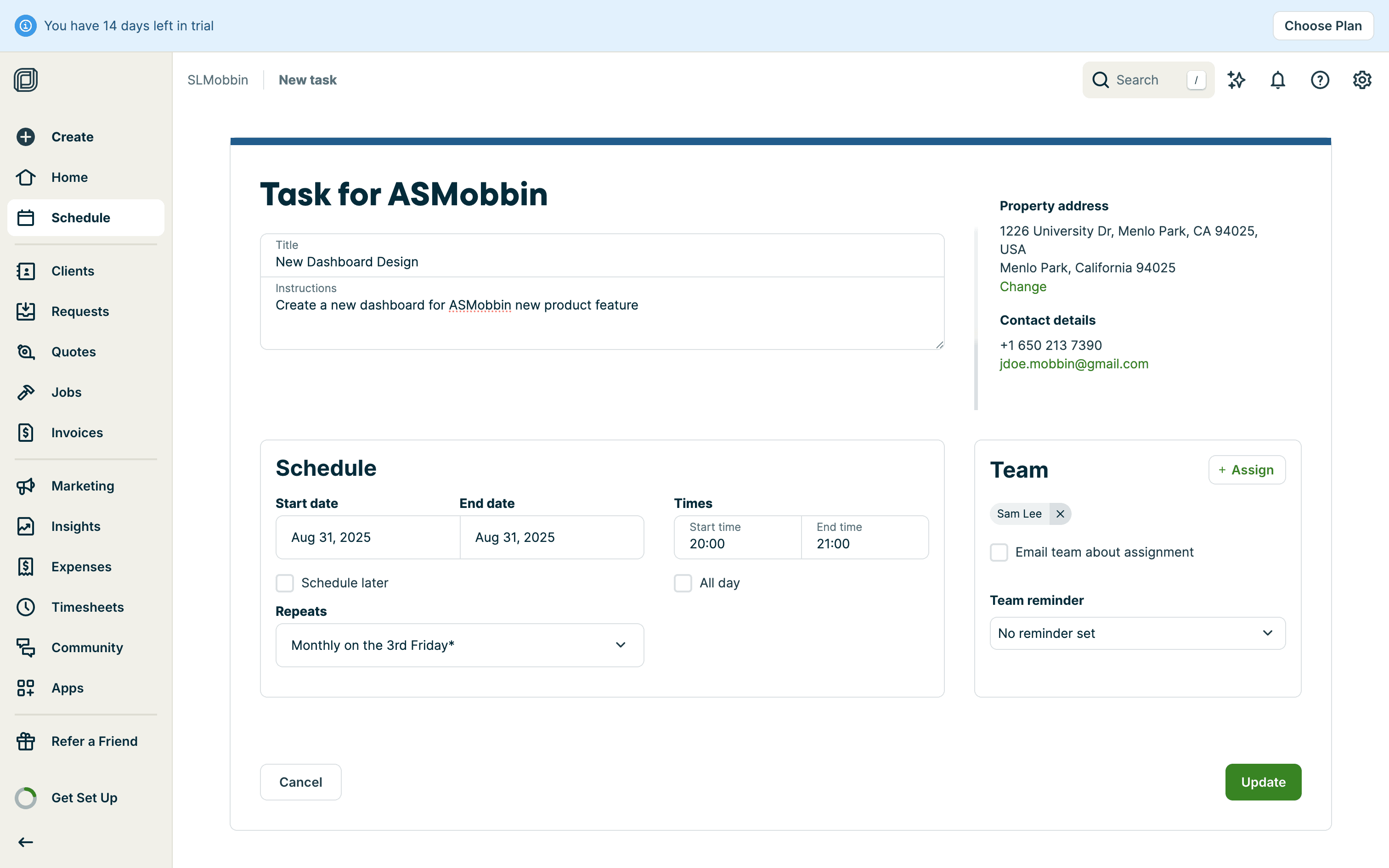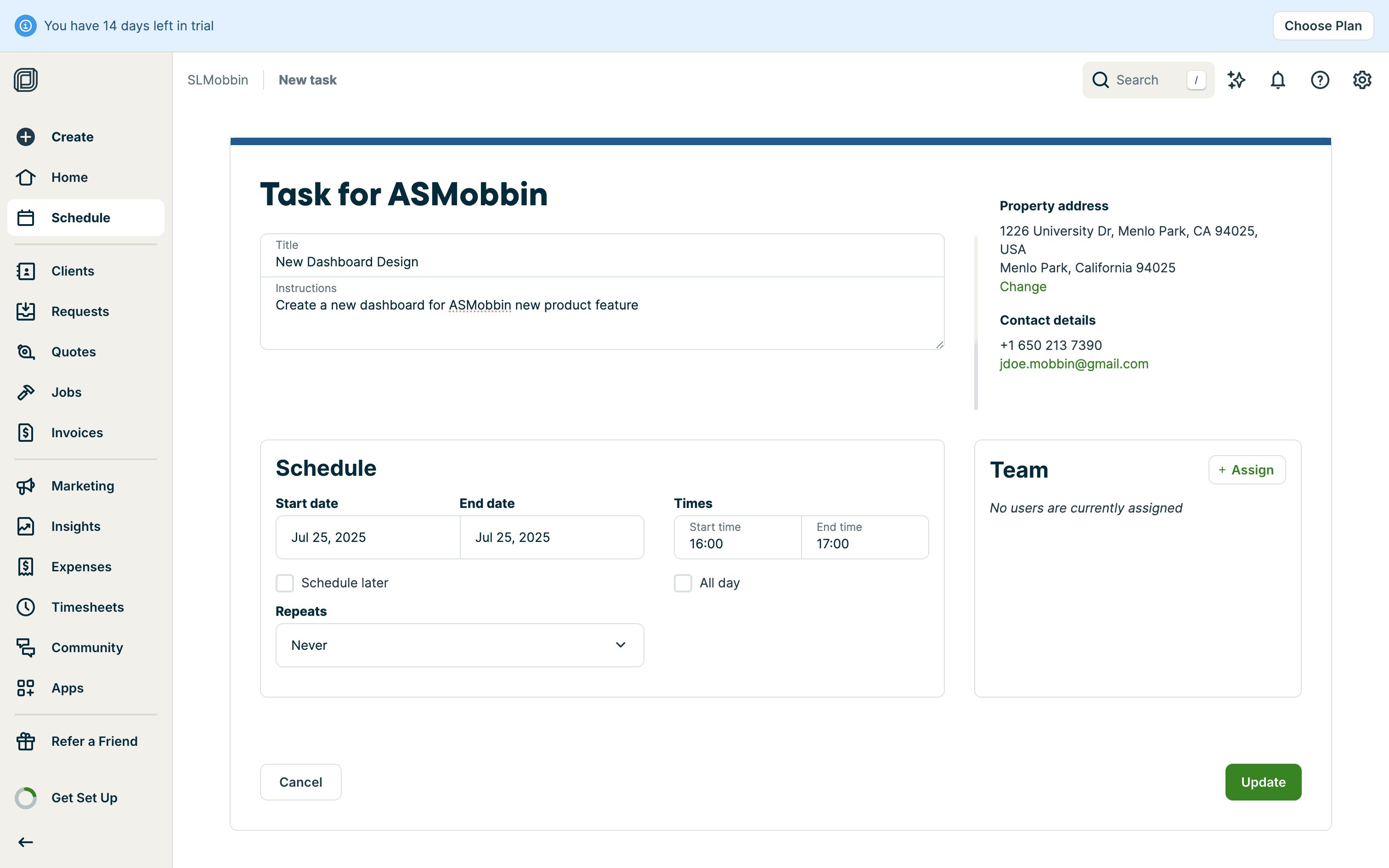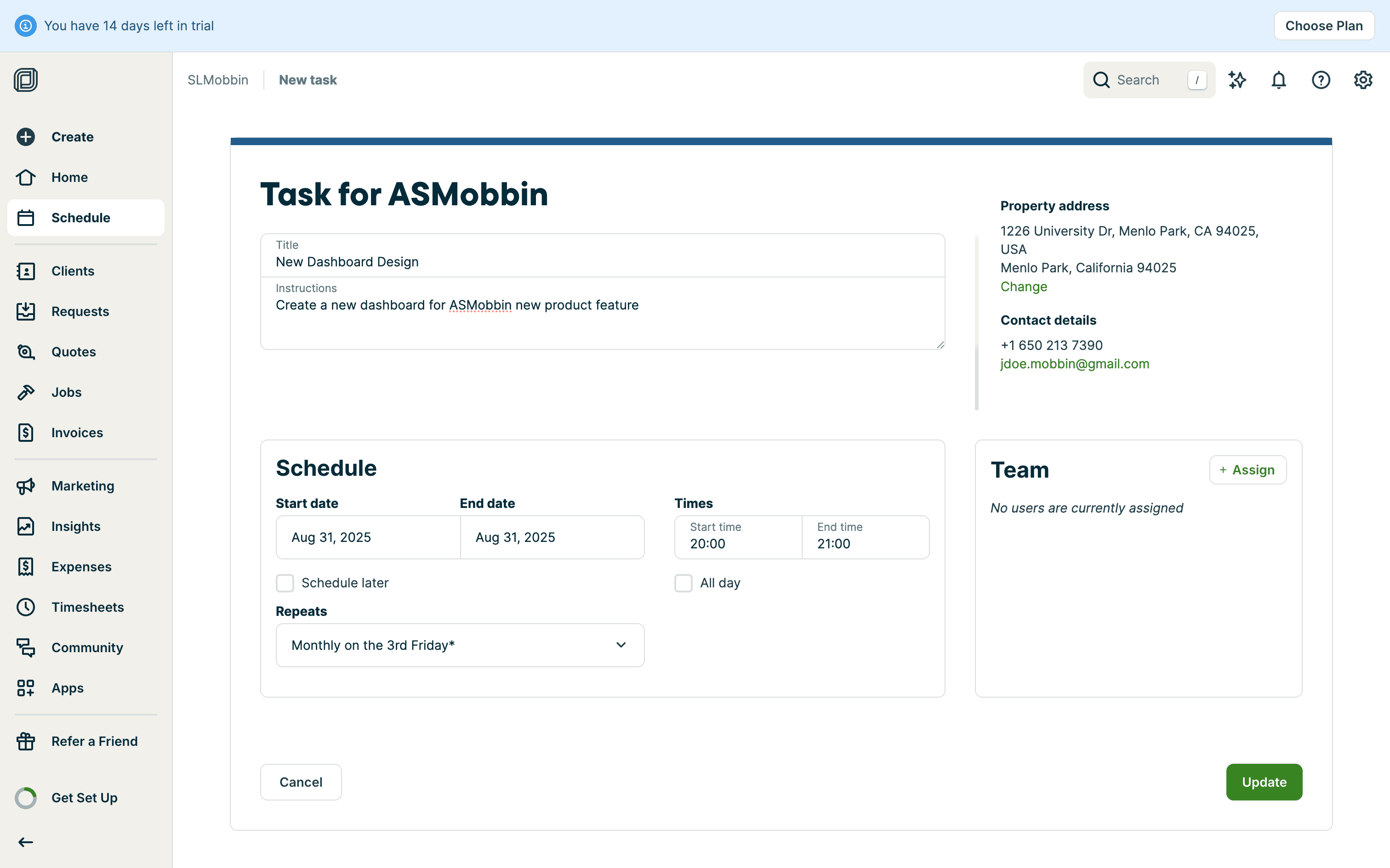 The user creates a new task for a client, including setting the schedule and assigning a team member. The task is then displayed on the client's schedule.