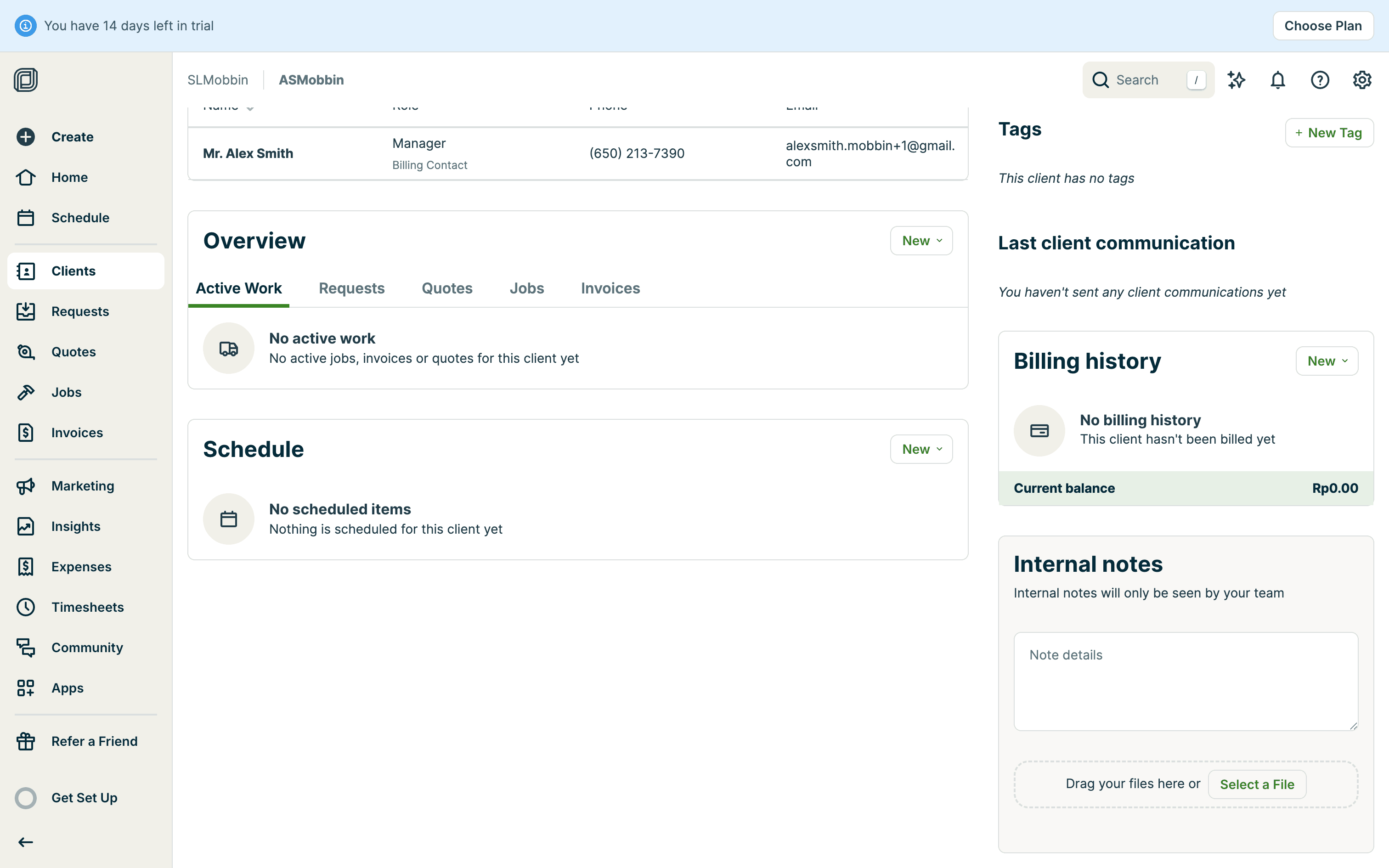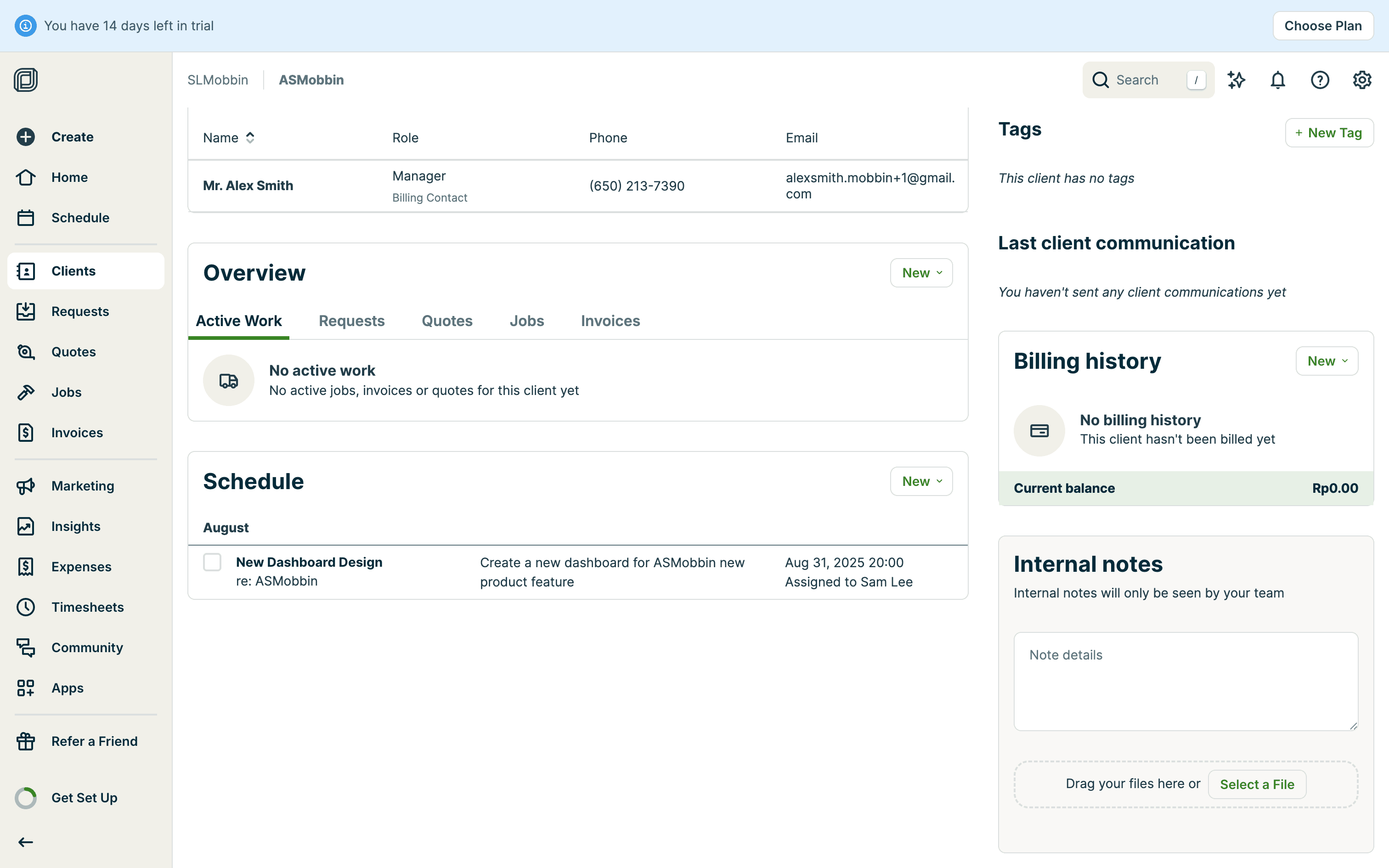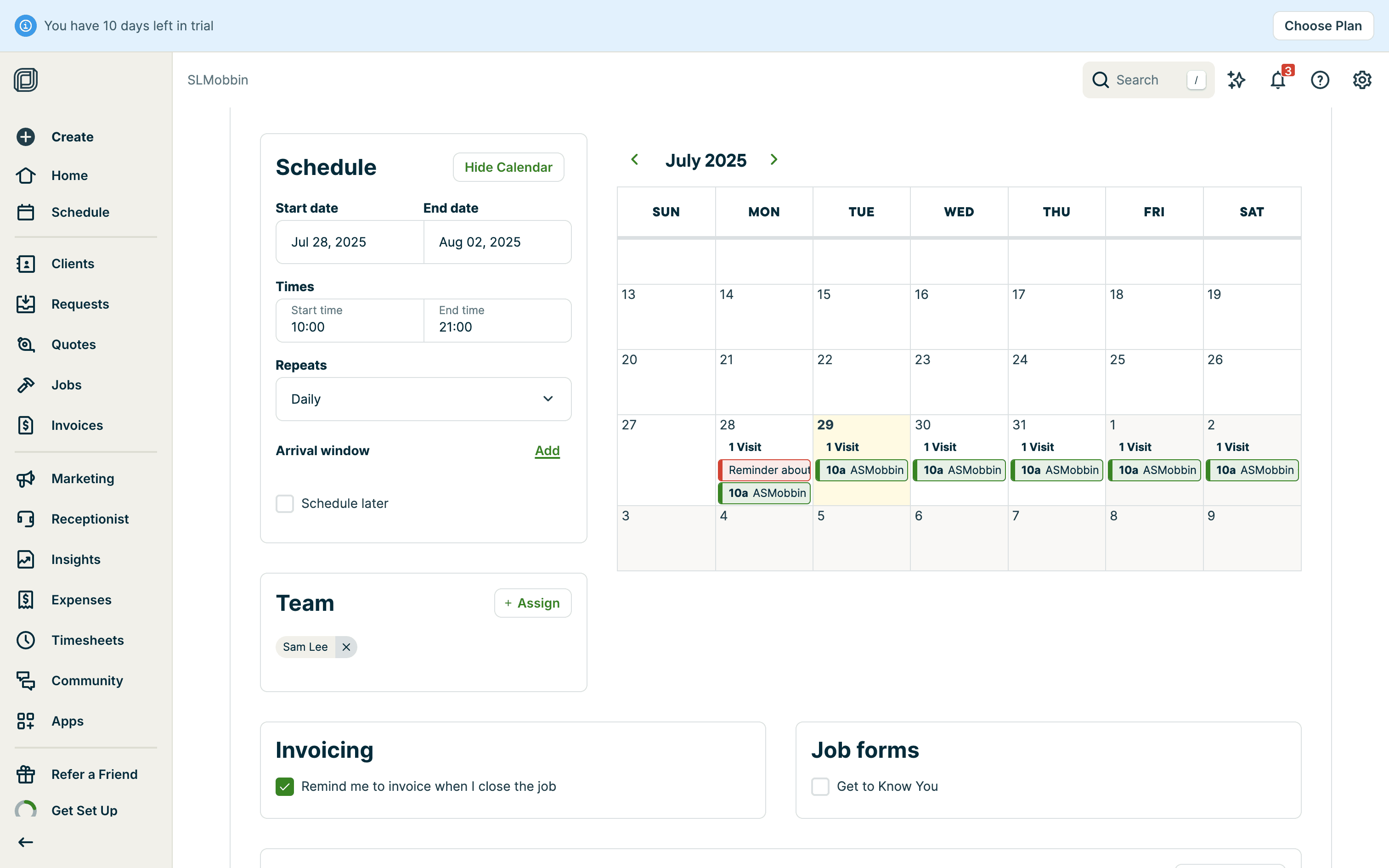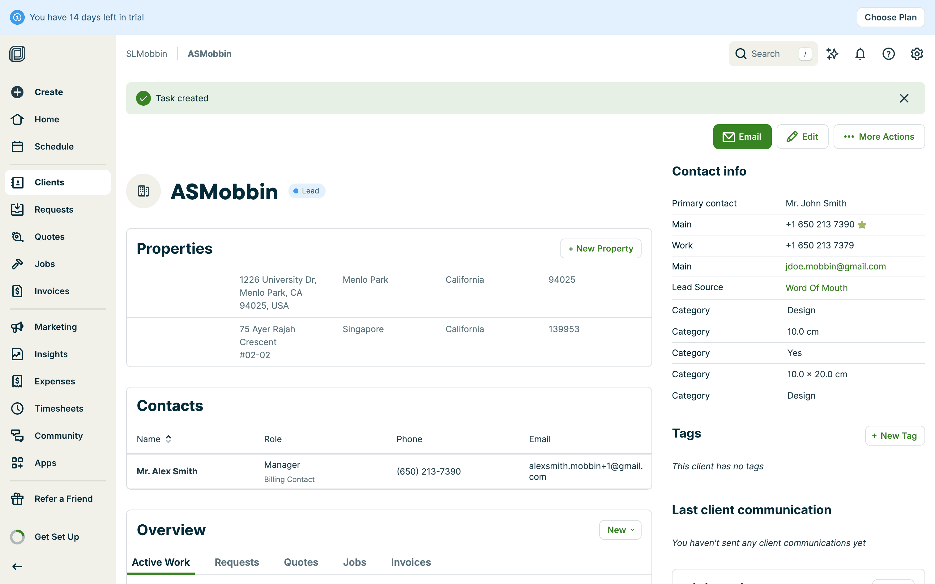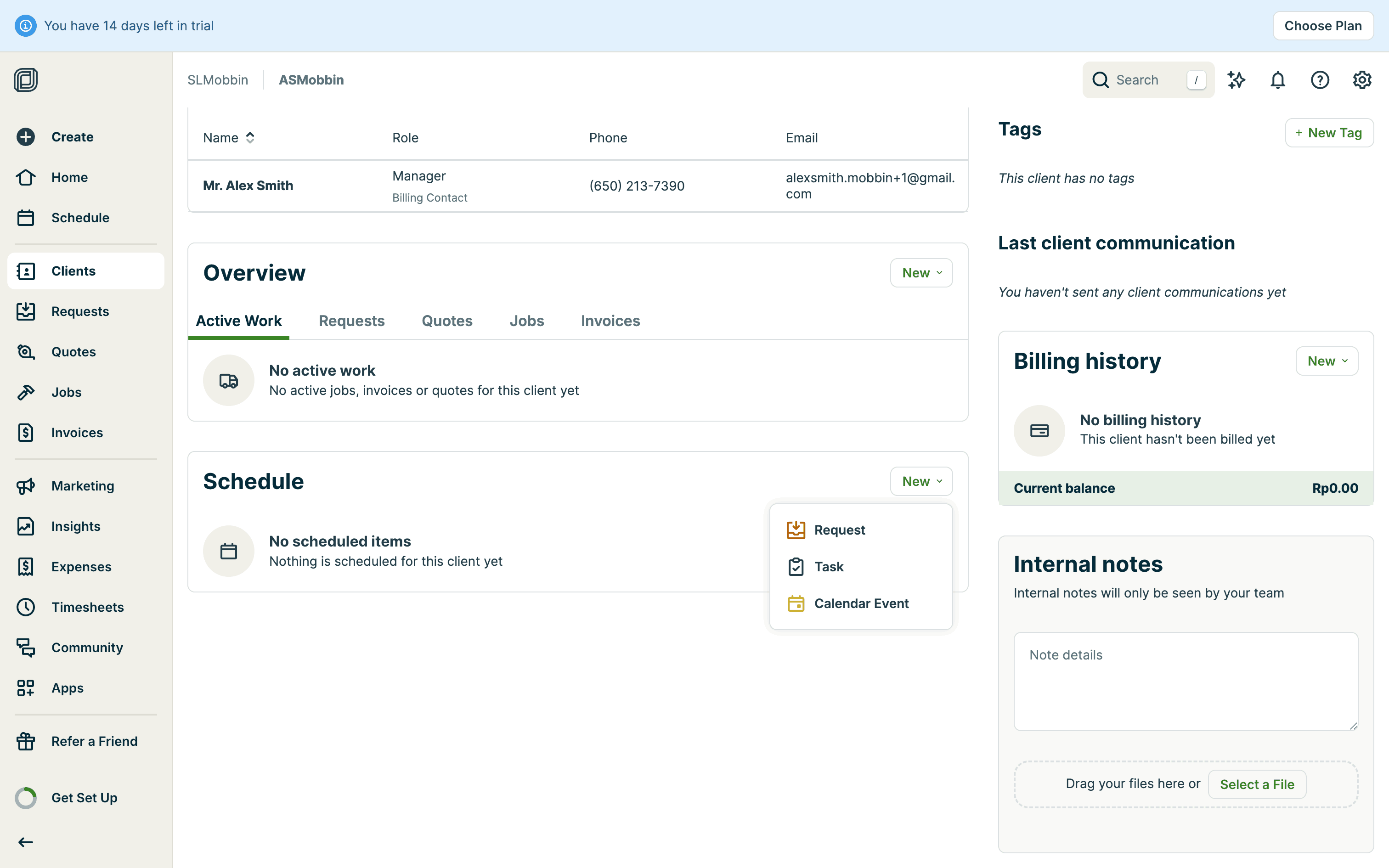 The user creates a new task for a client, including setting the schedule and assigning a team member. The task is then displayed on the client's schedule.