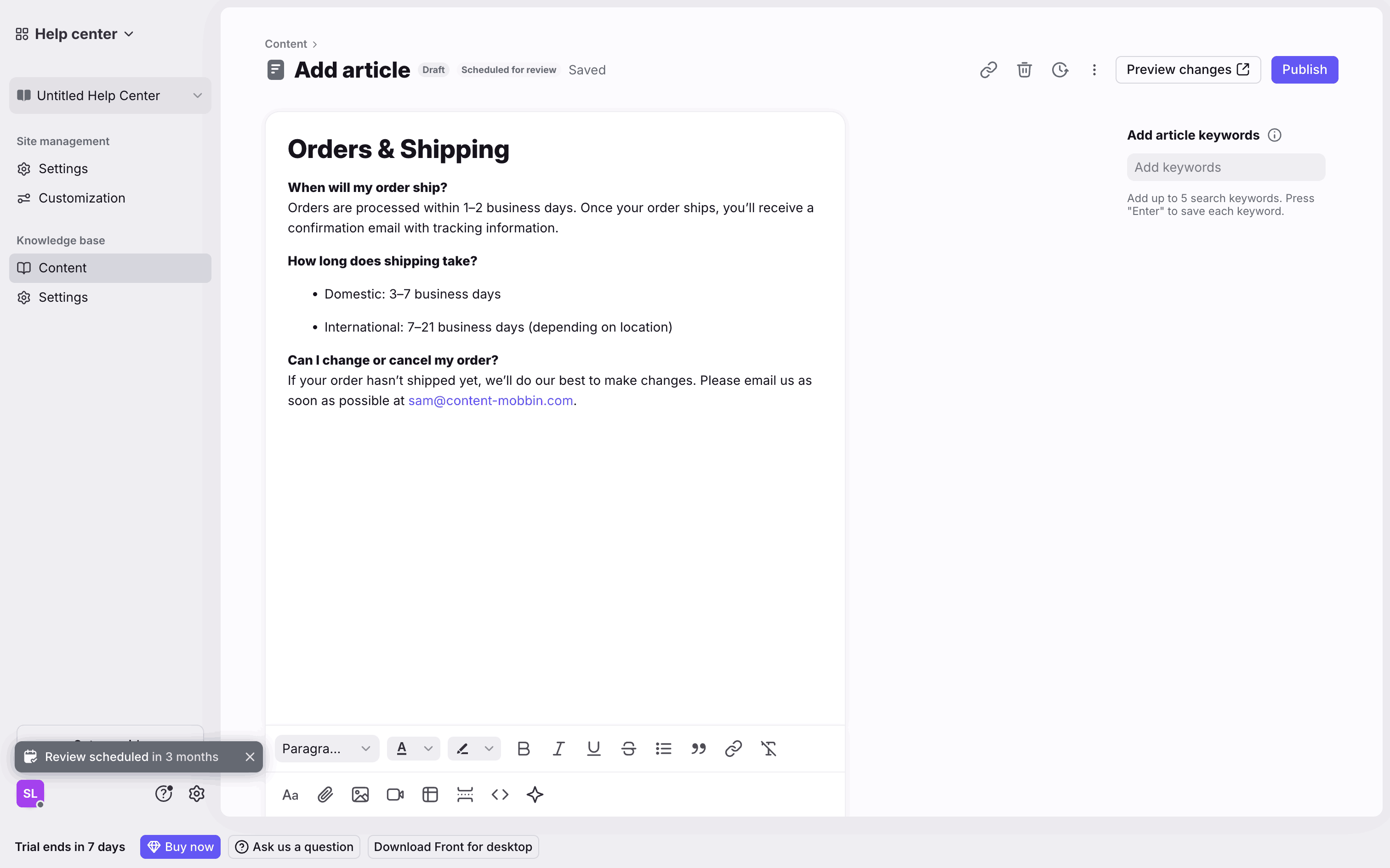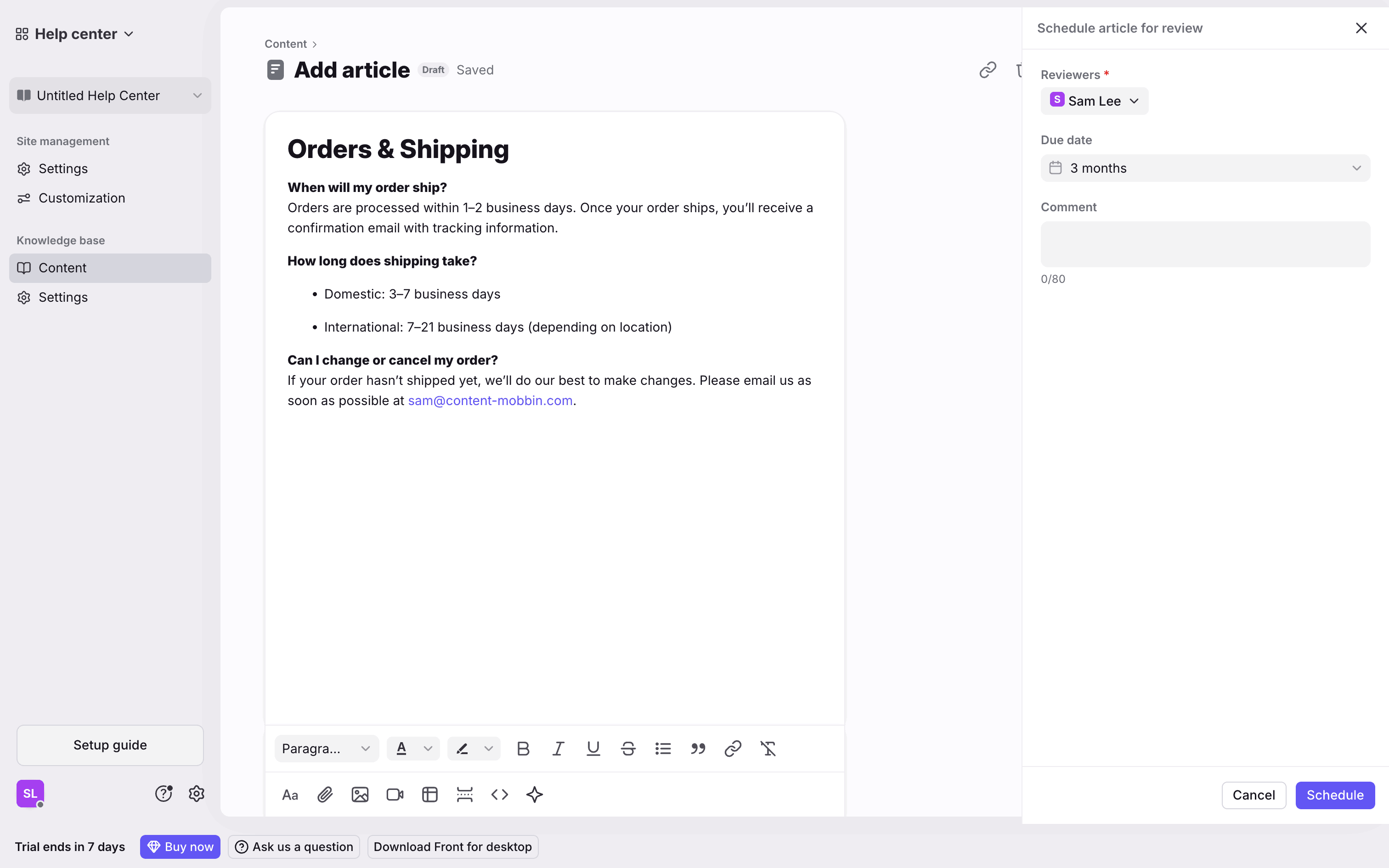 The user schedules an article for review by specifying a reviewer and due date. A confirmation message appears upon successful scheduling.