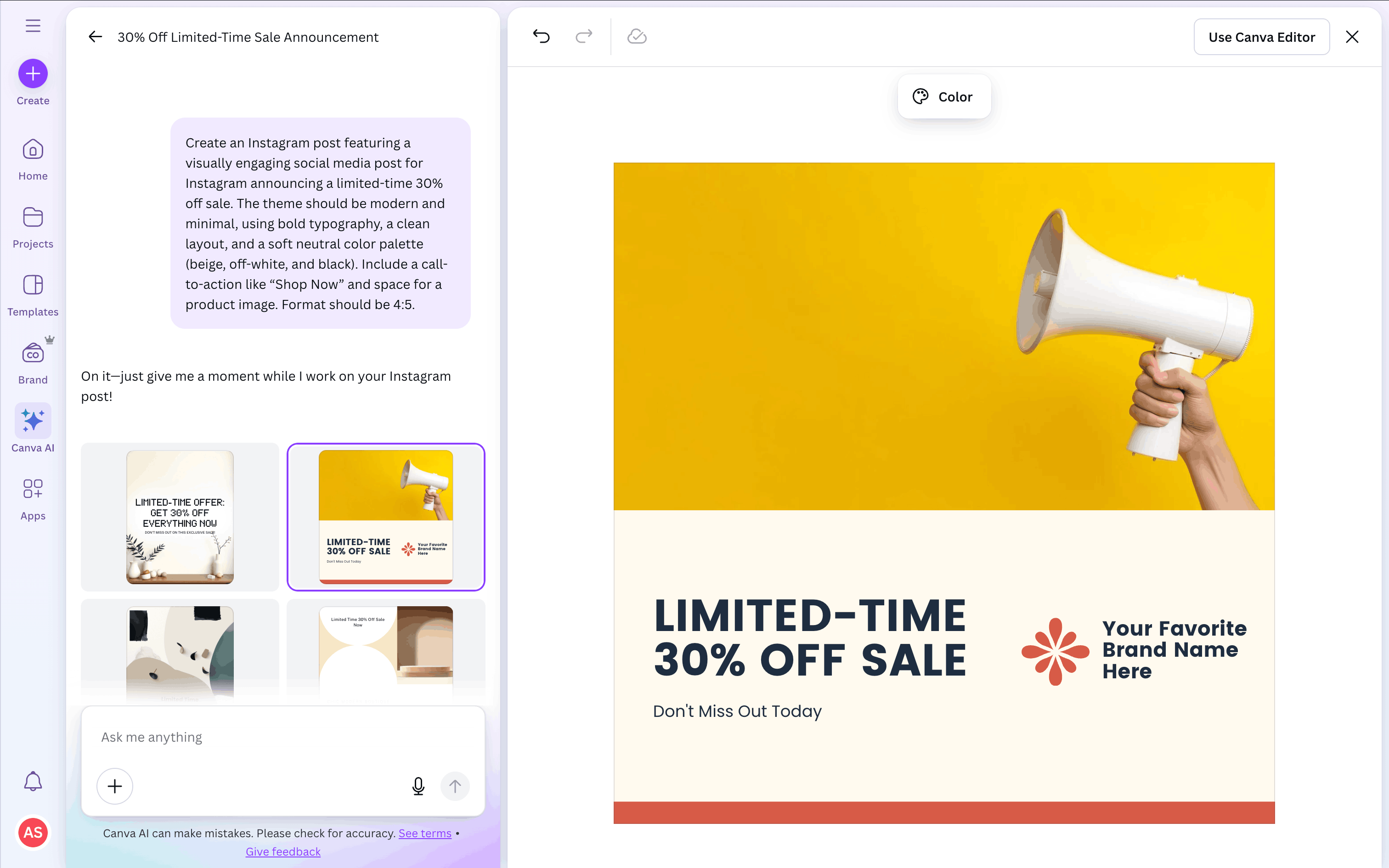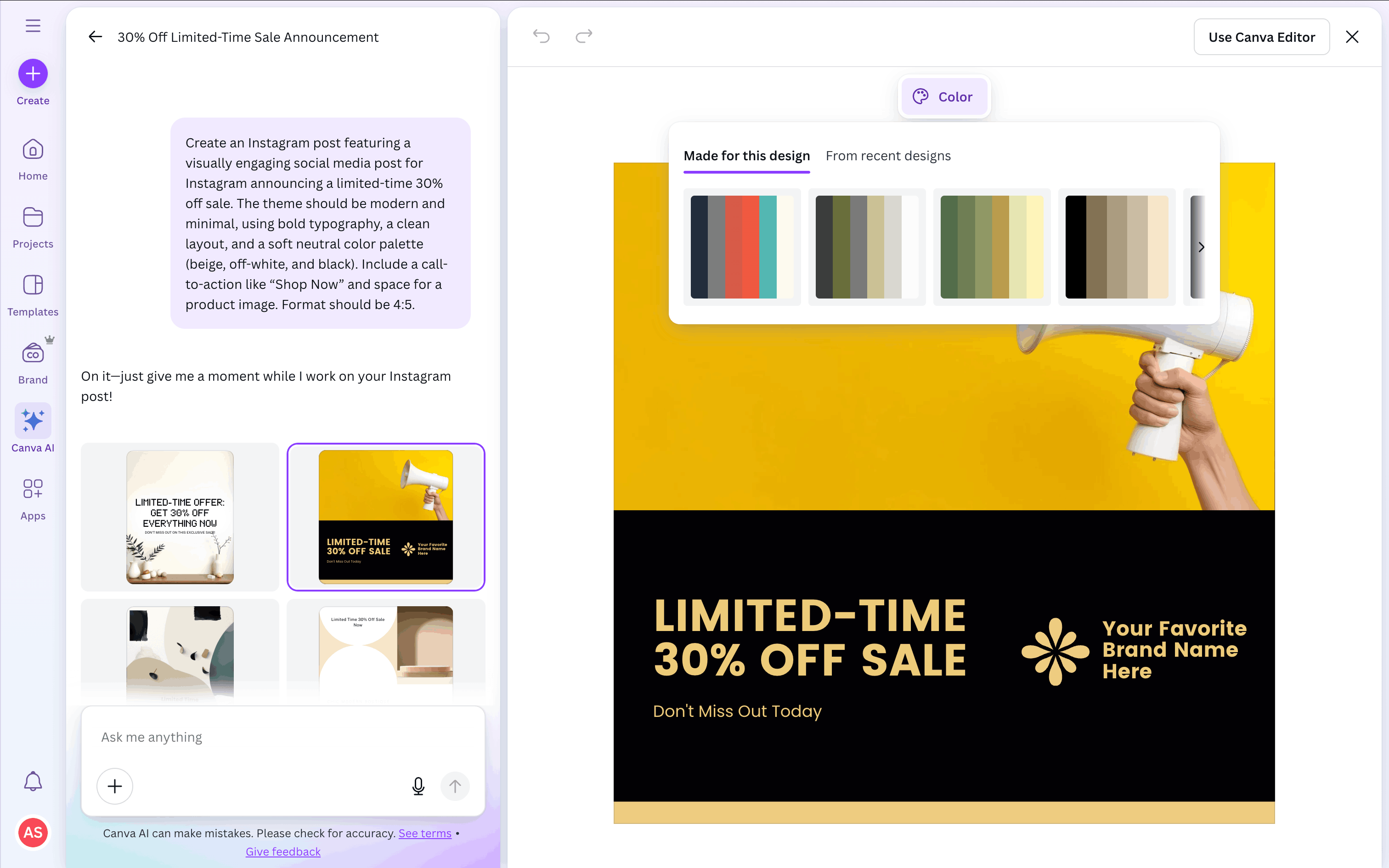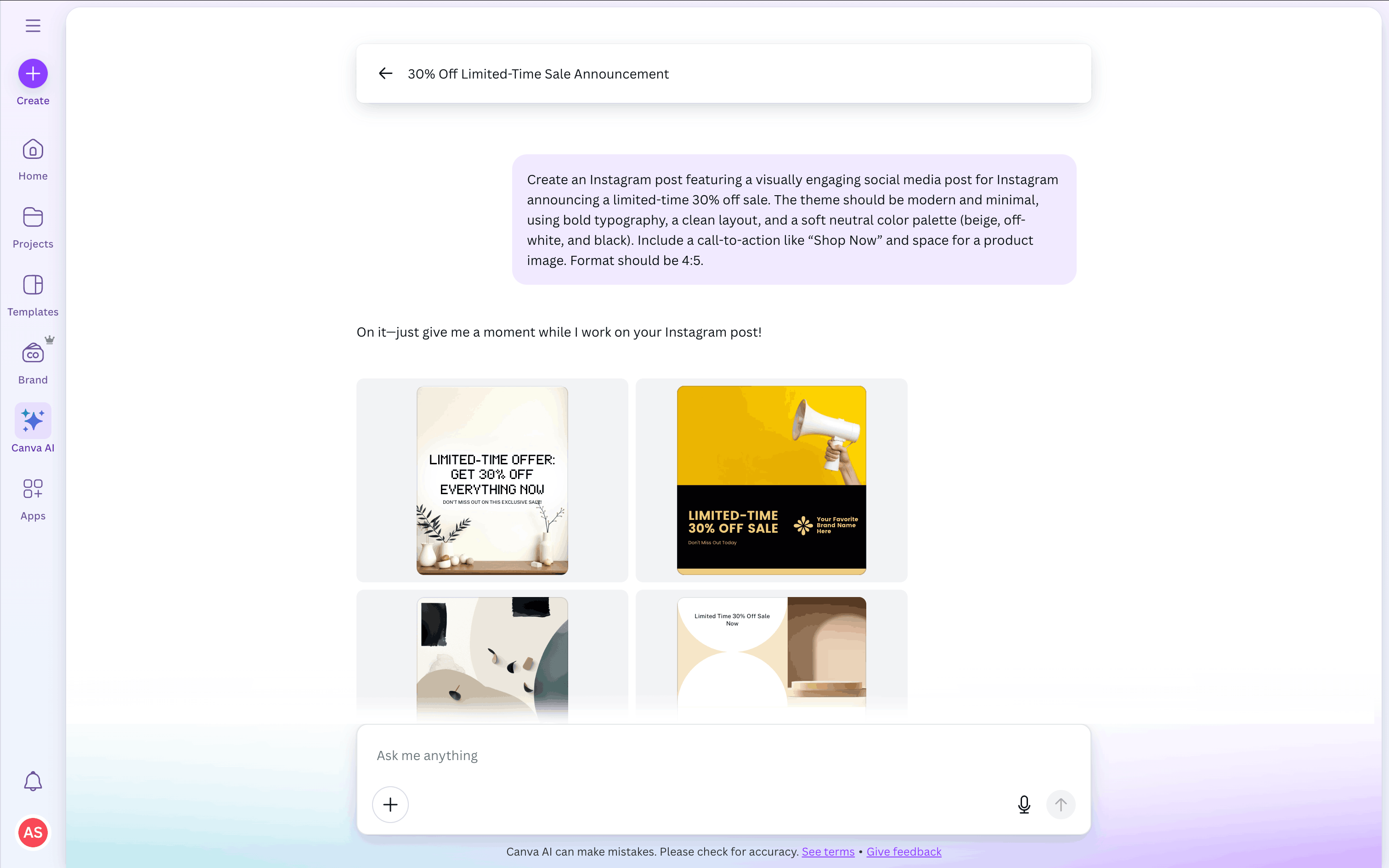 The user flow showcases the process of creating a design using Canva AI. The user provides a prompt, customizes the generated design, and prepares it for publishing.