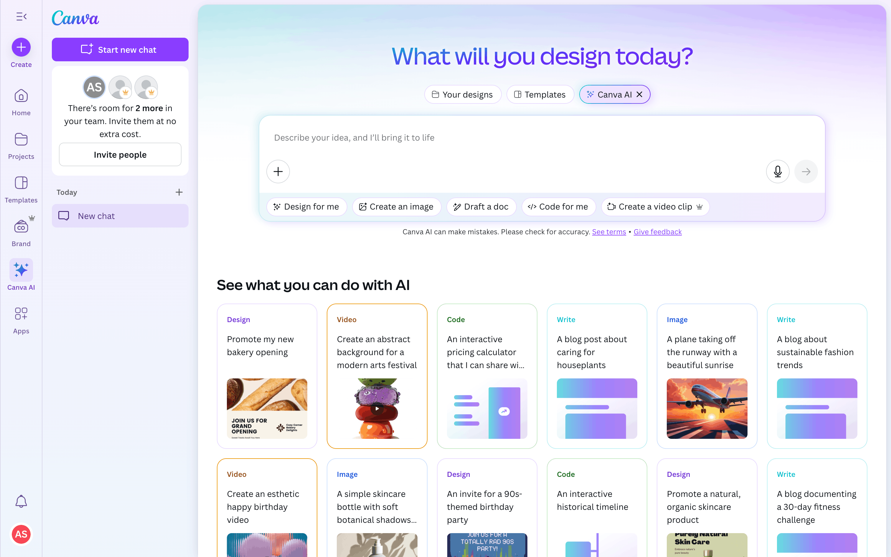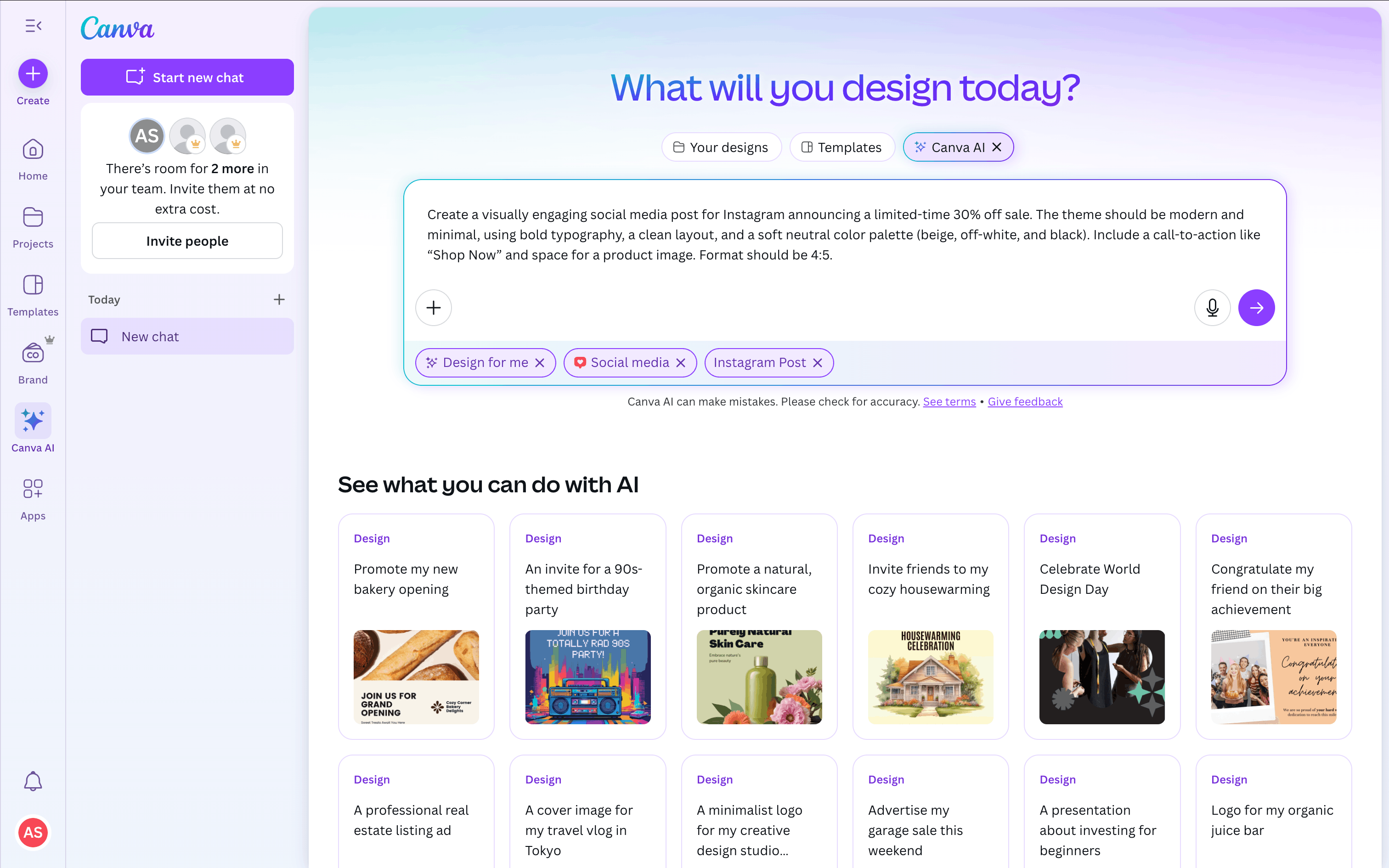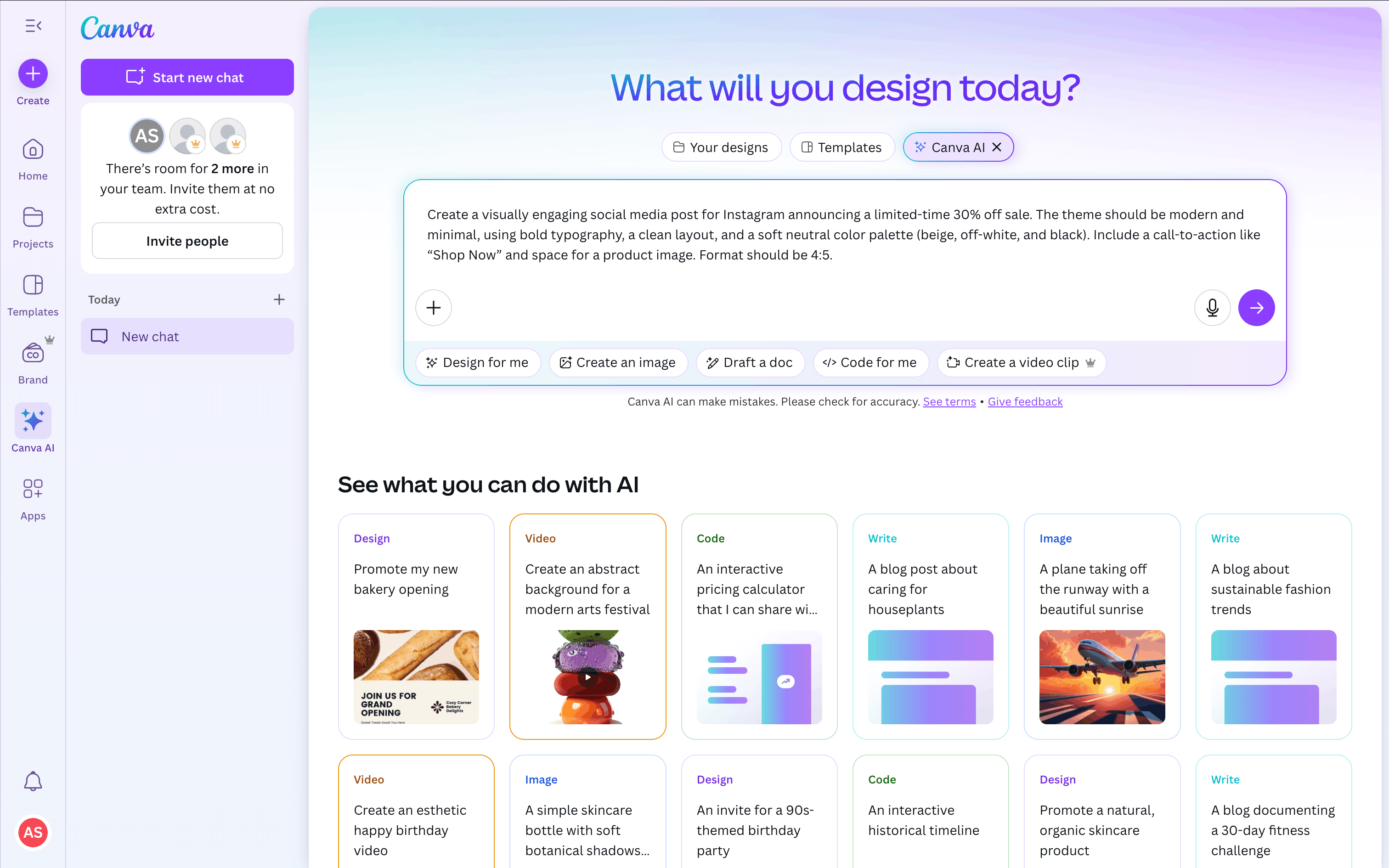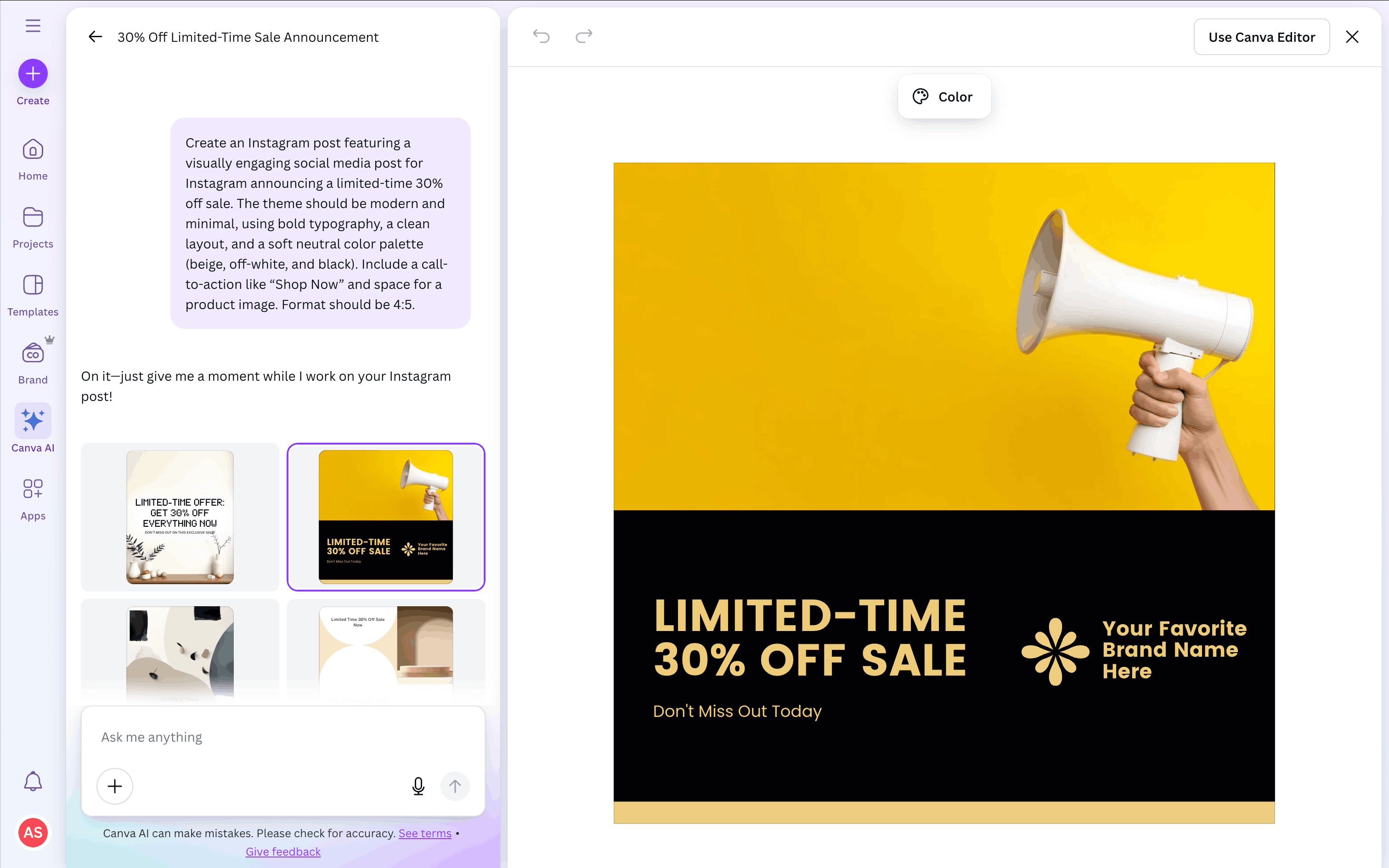 The user flow showcases the process of creating a design using Canva AI. The user provides a prompt, customizes the generated design, and prepares it for publishing.
