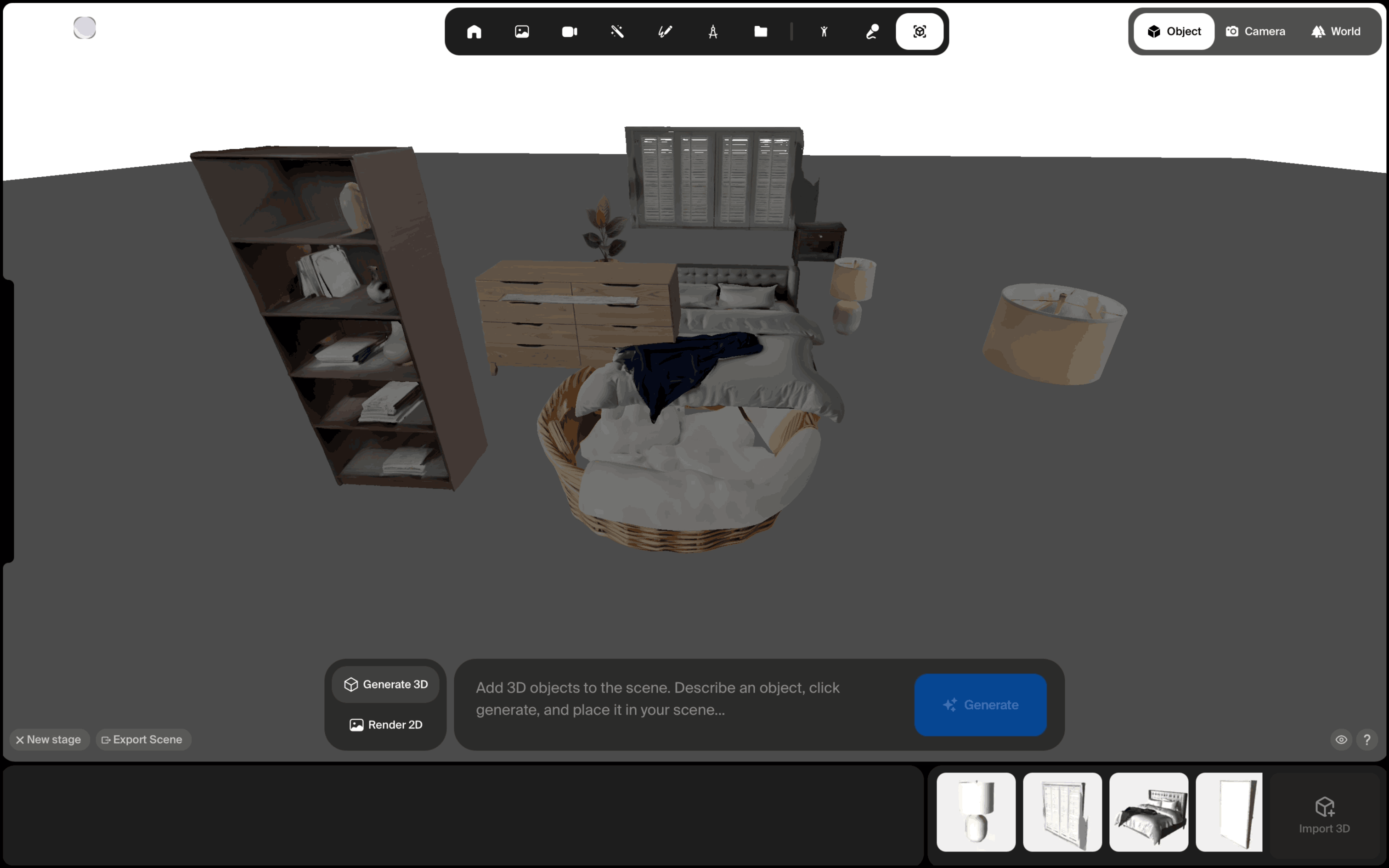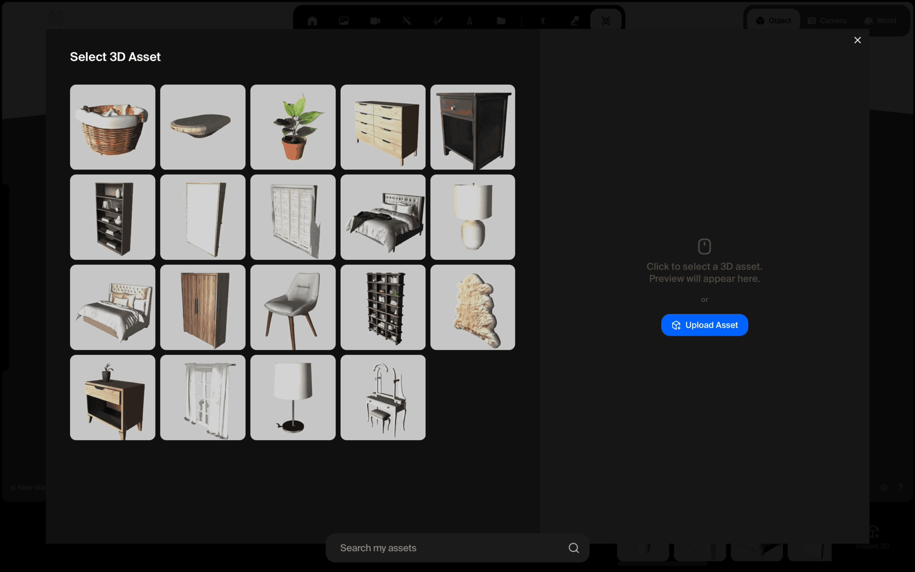 The user imports a 3D object into a scene. They select an asset, add it to the scene, and then place it.