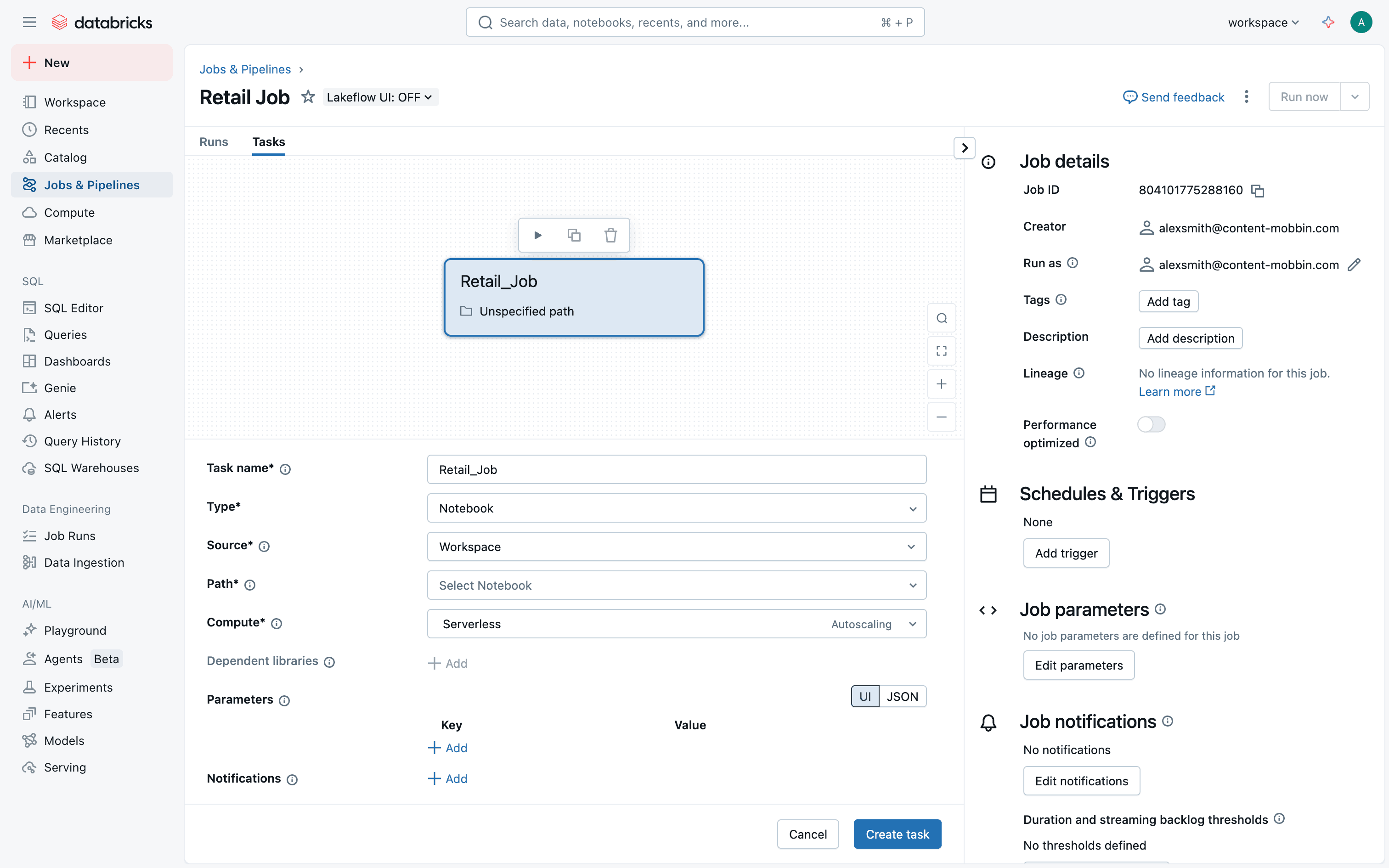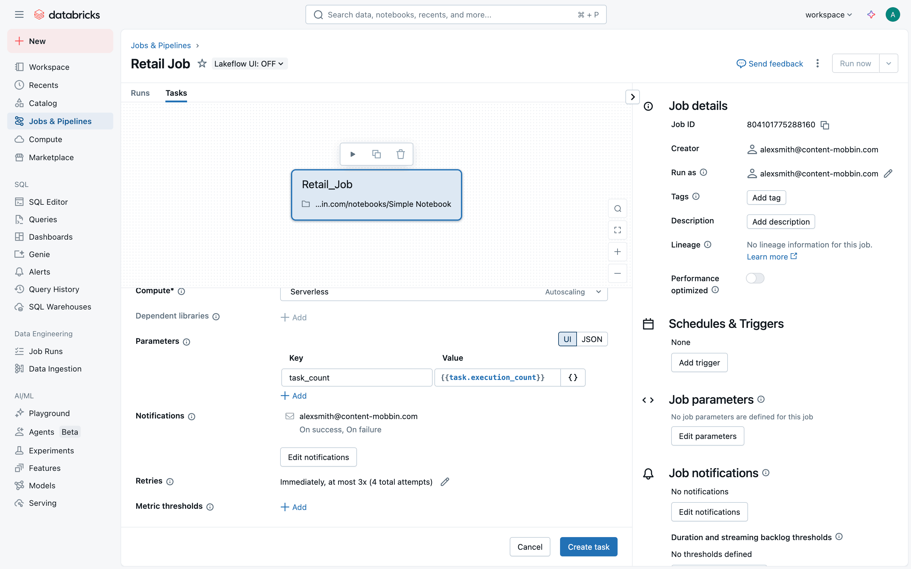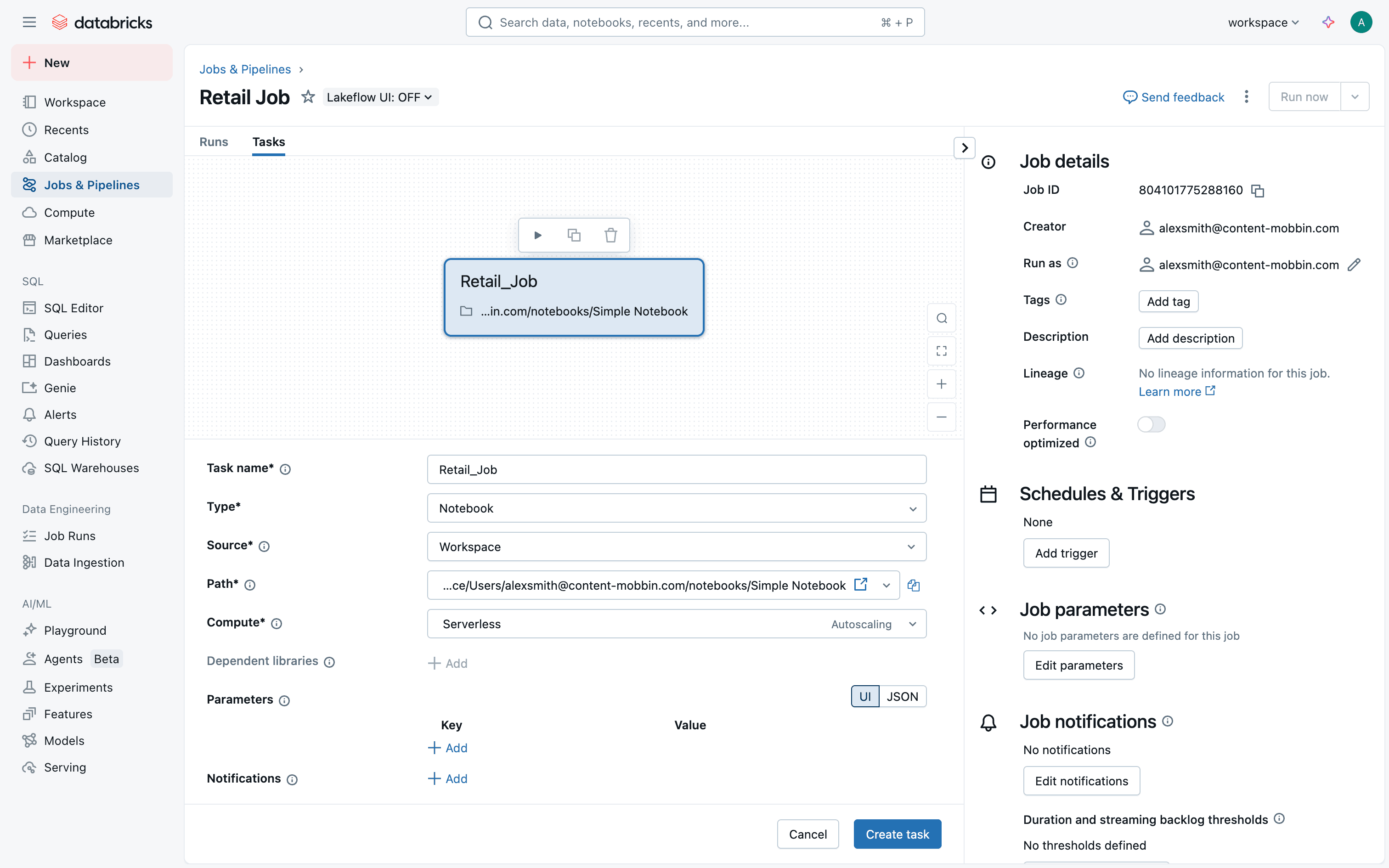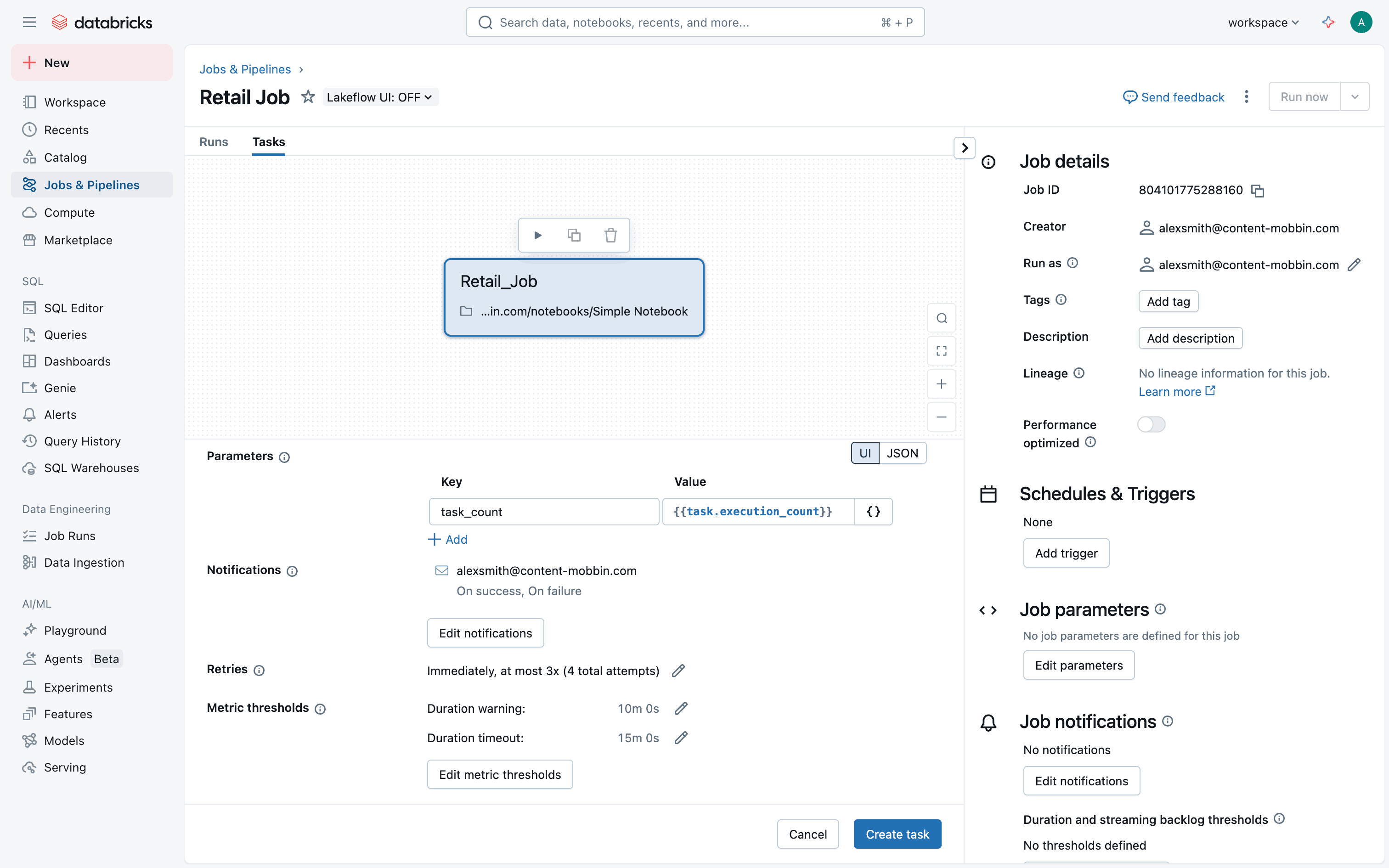 The user creates a new job, configures tasks and workflow, and monitors job execution. The flow showcases job creation and monitoring within Databricks.