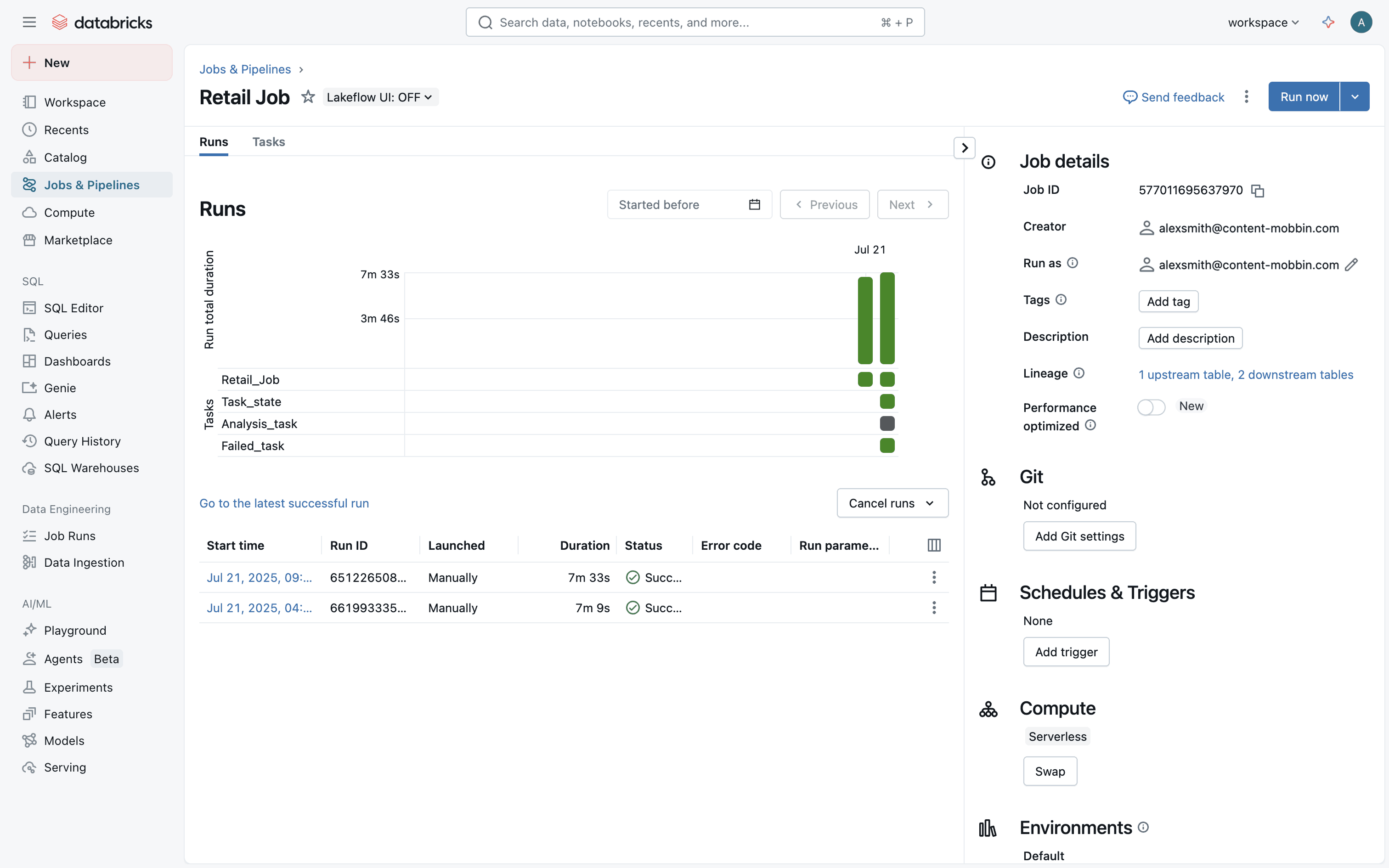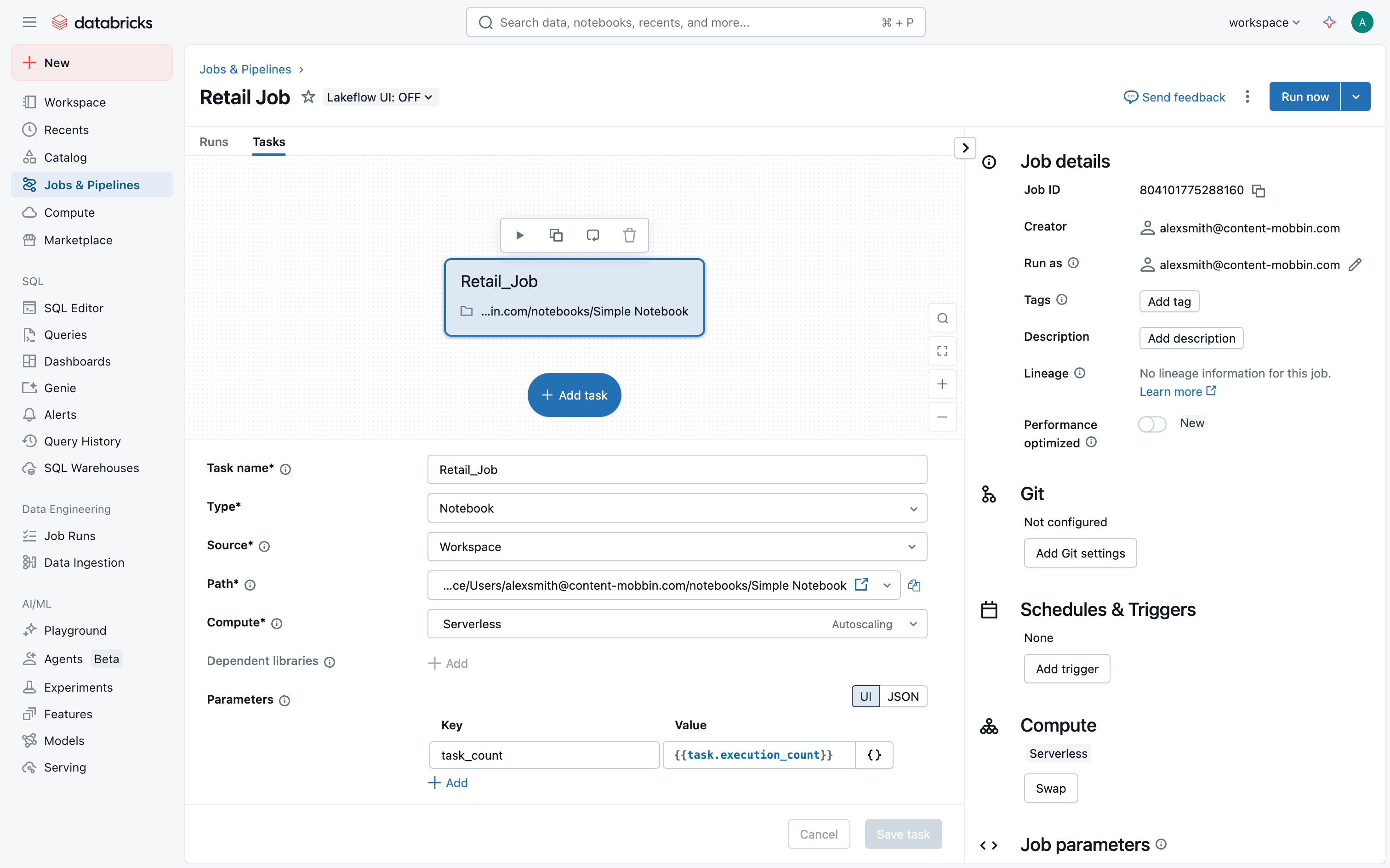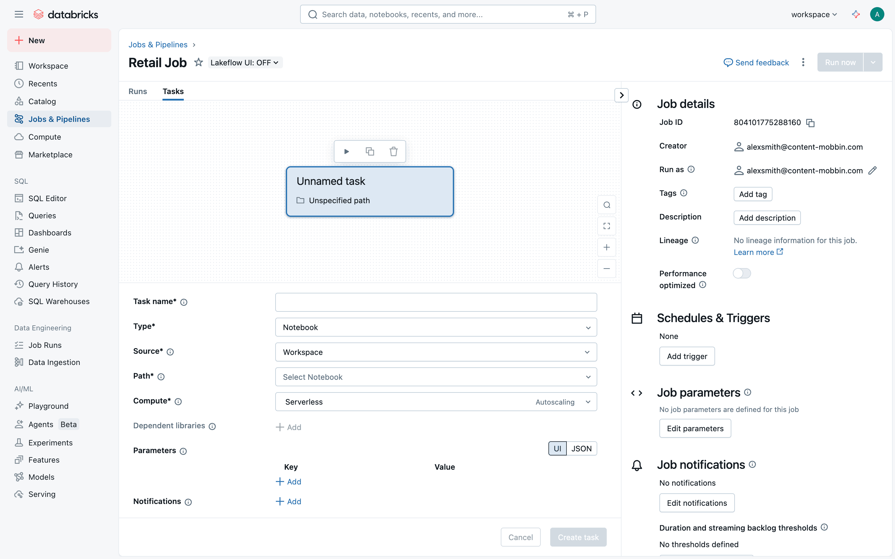 The user creates a new job, configures tasks and workflow, and monitors job execution. The flow showcases job creation and monitoring within Databricks.