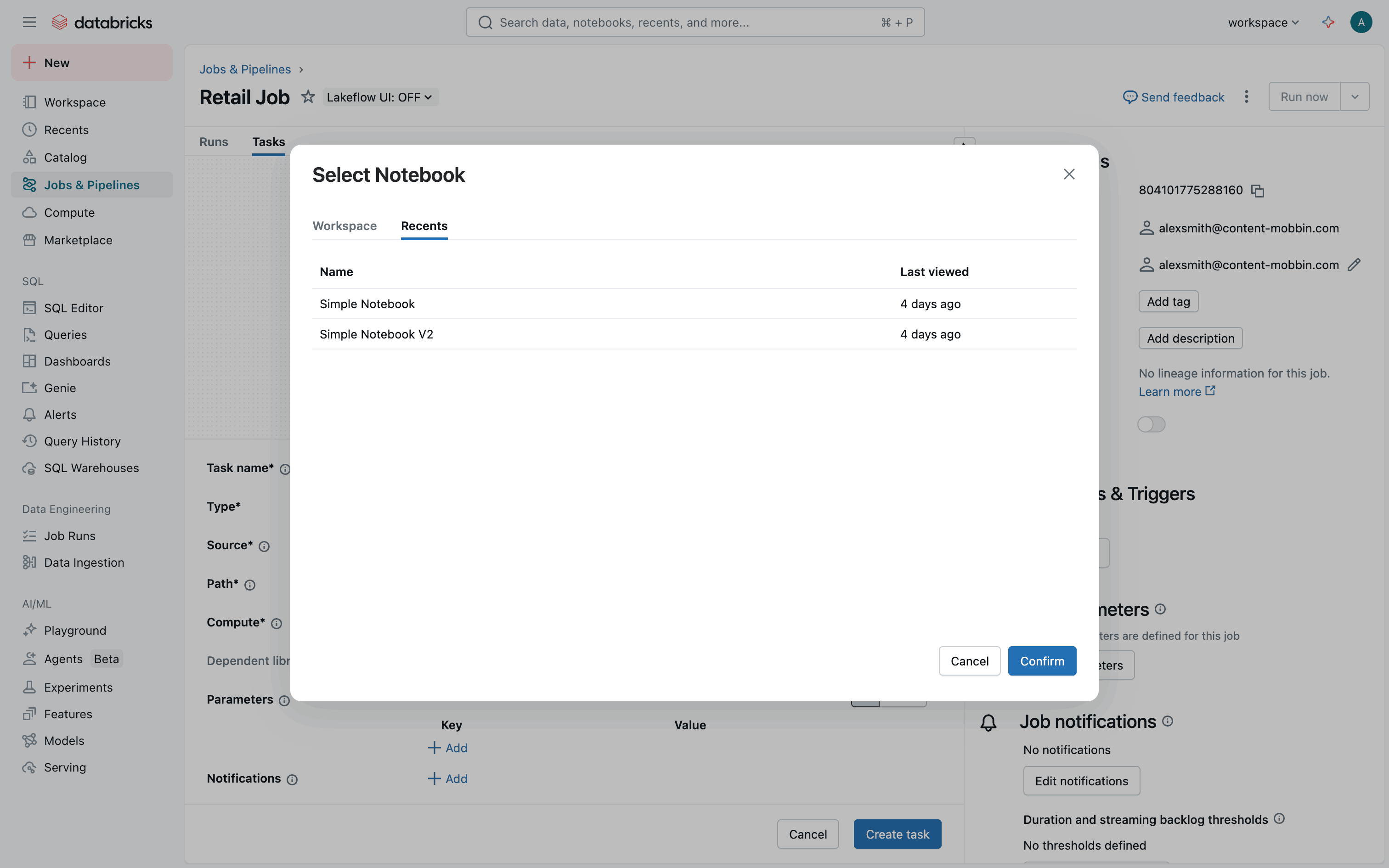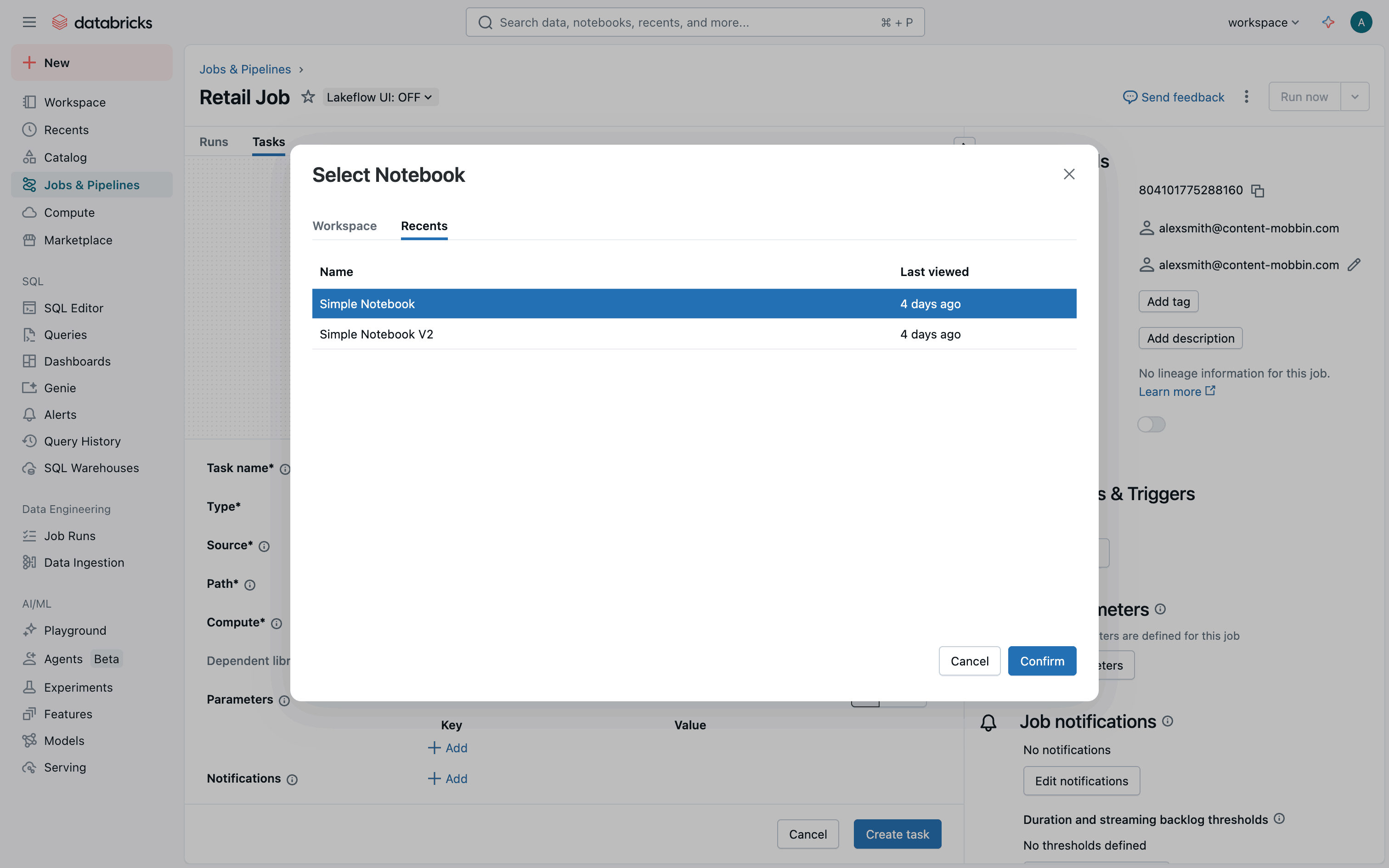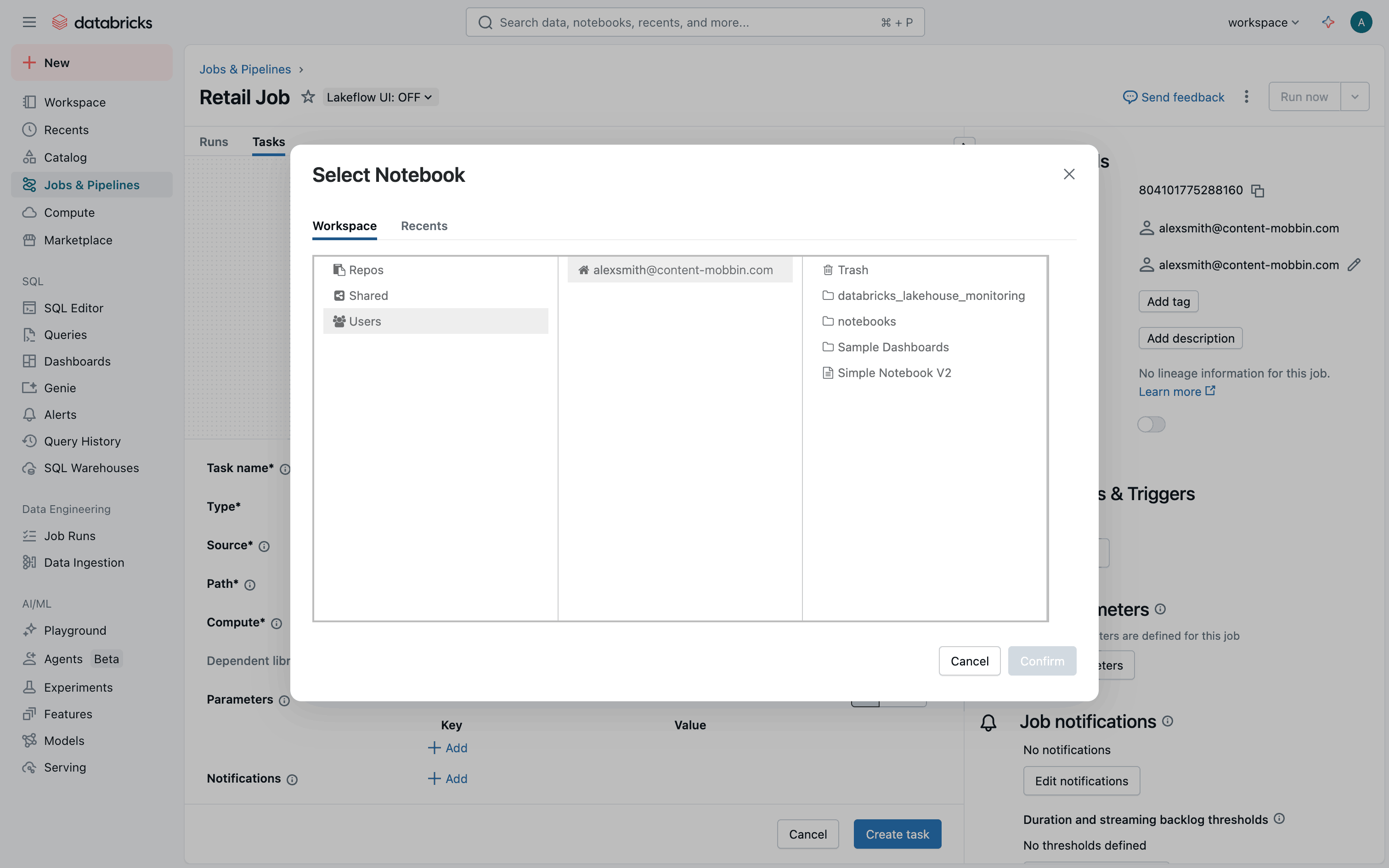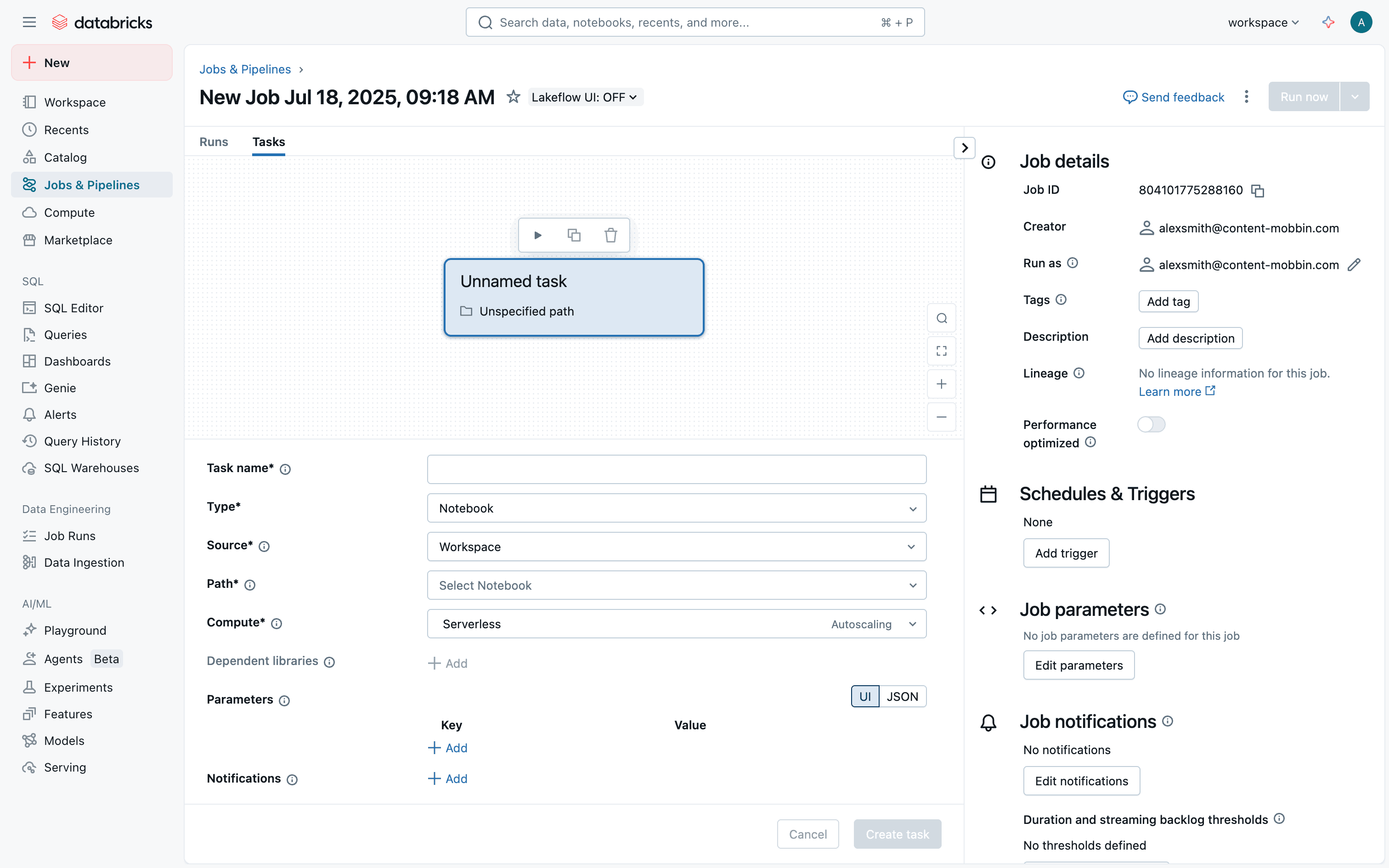 The user creates a new job, configures tasks and workflow, and monitors job execution. The flow showcases job creation and monitoring within Databricks.