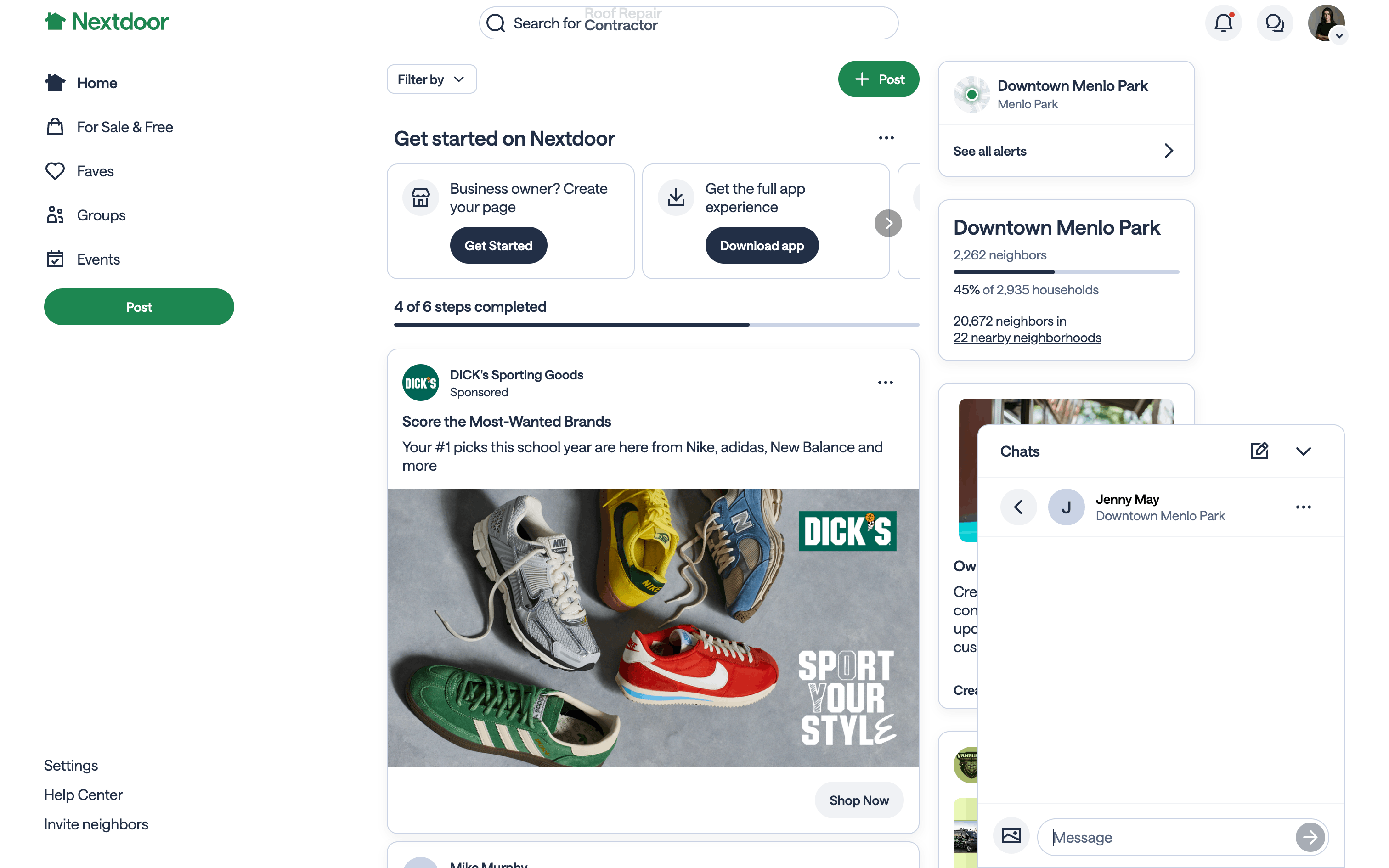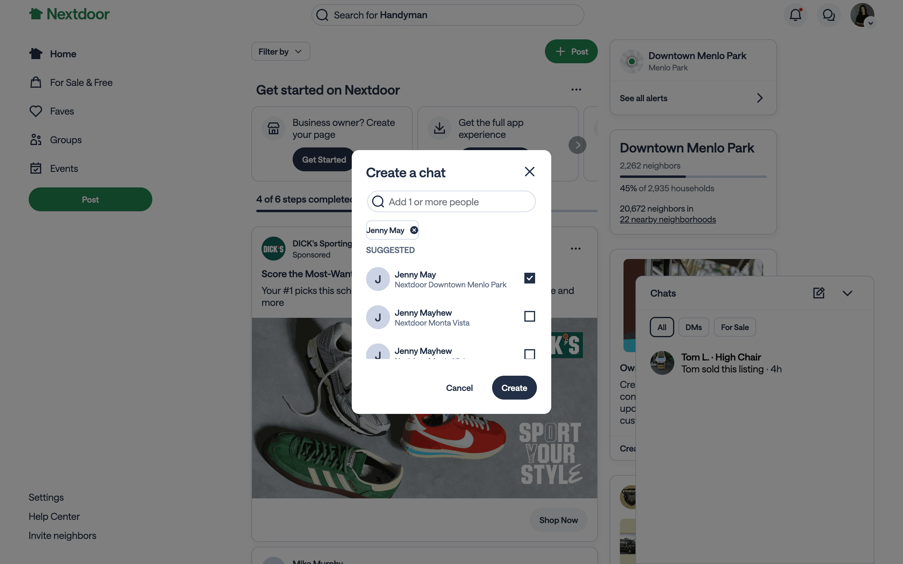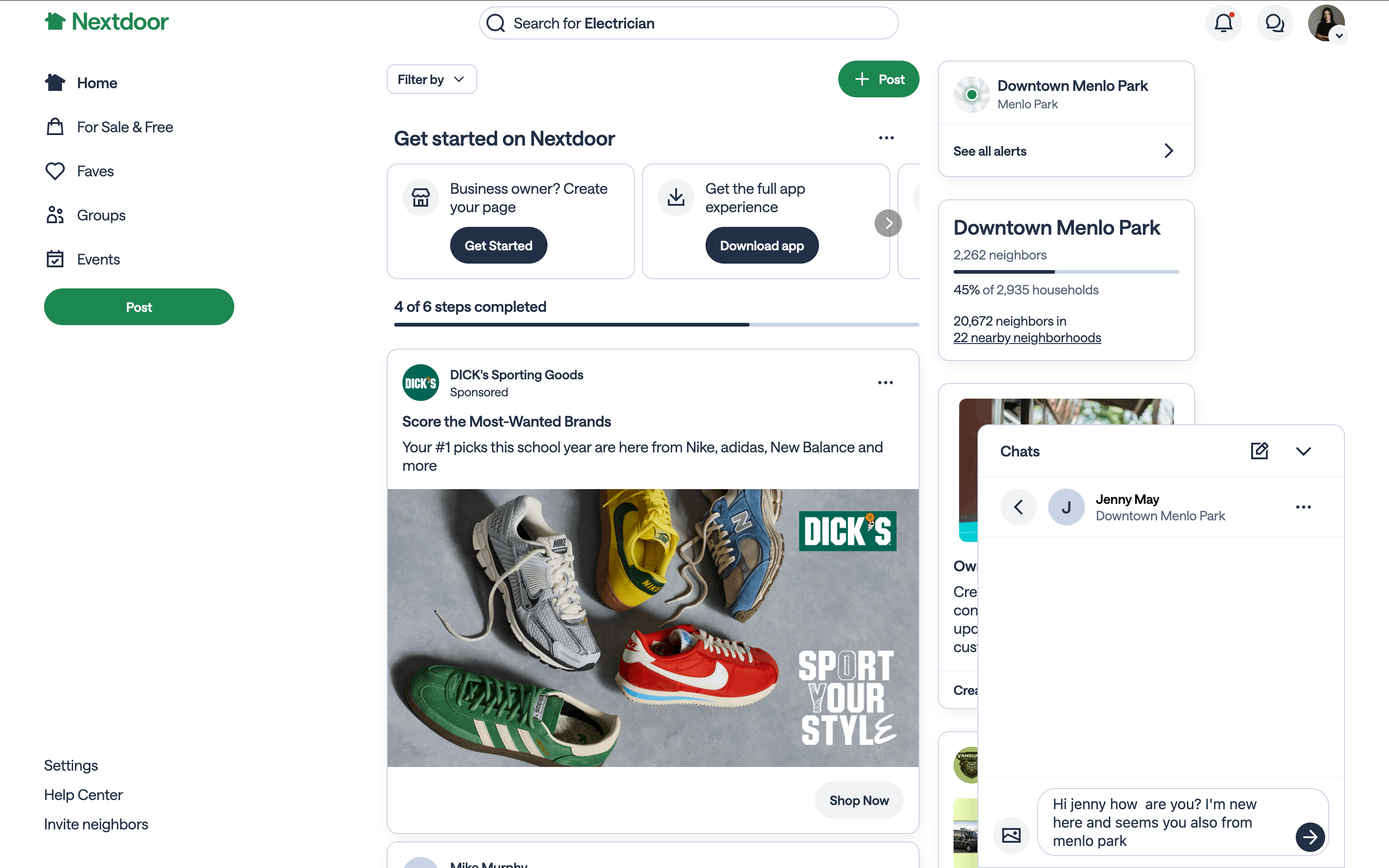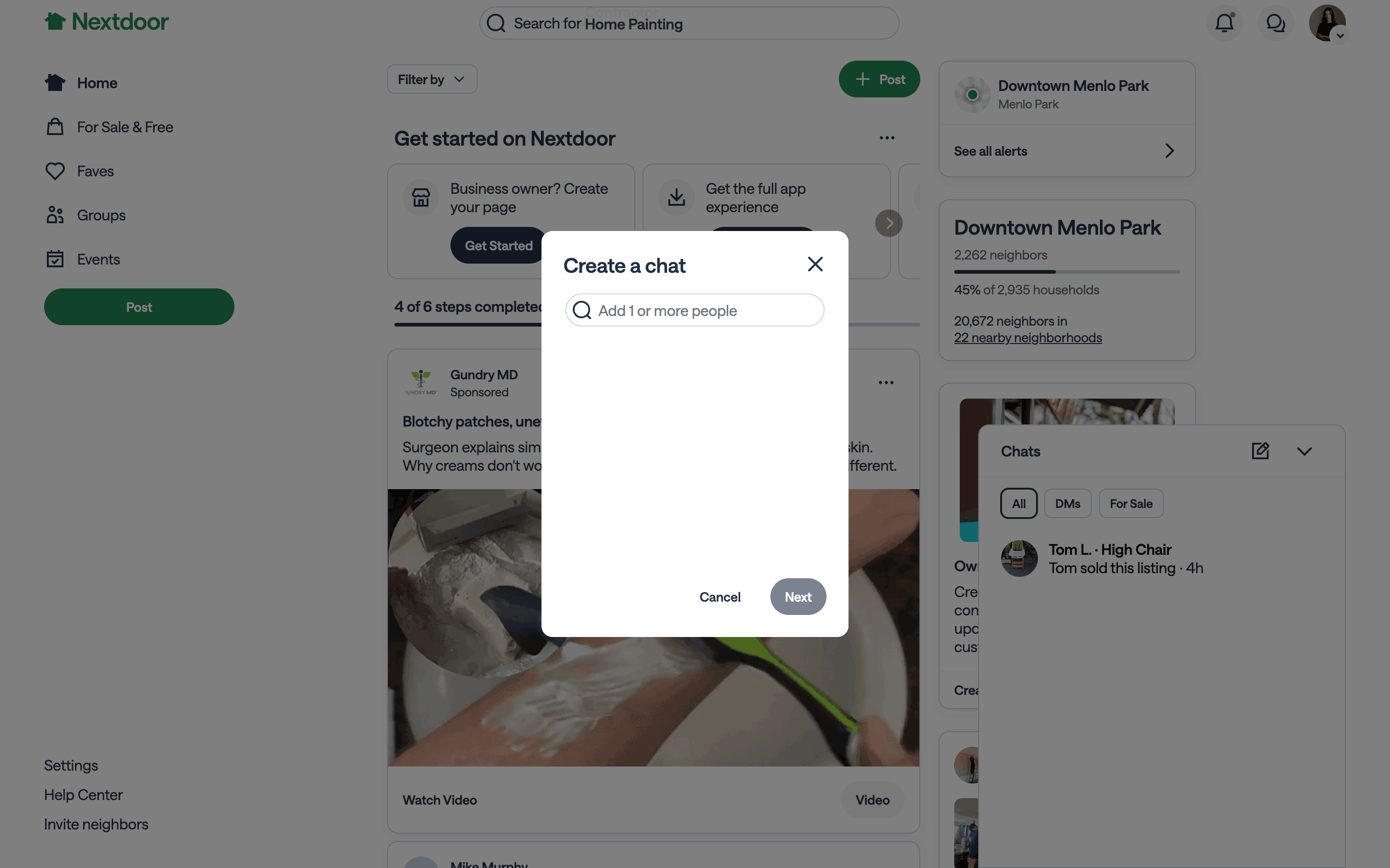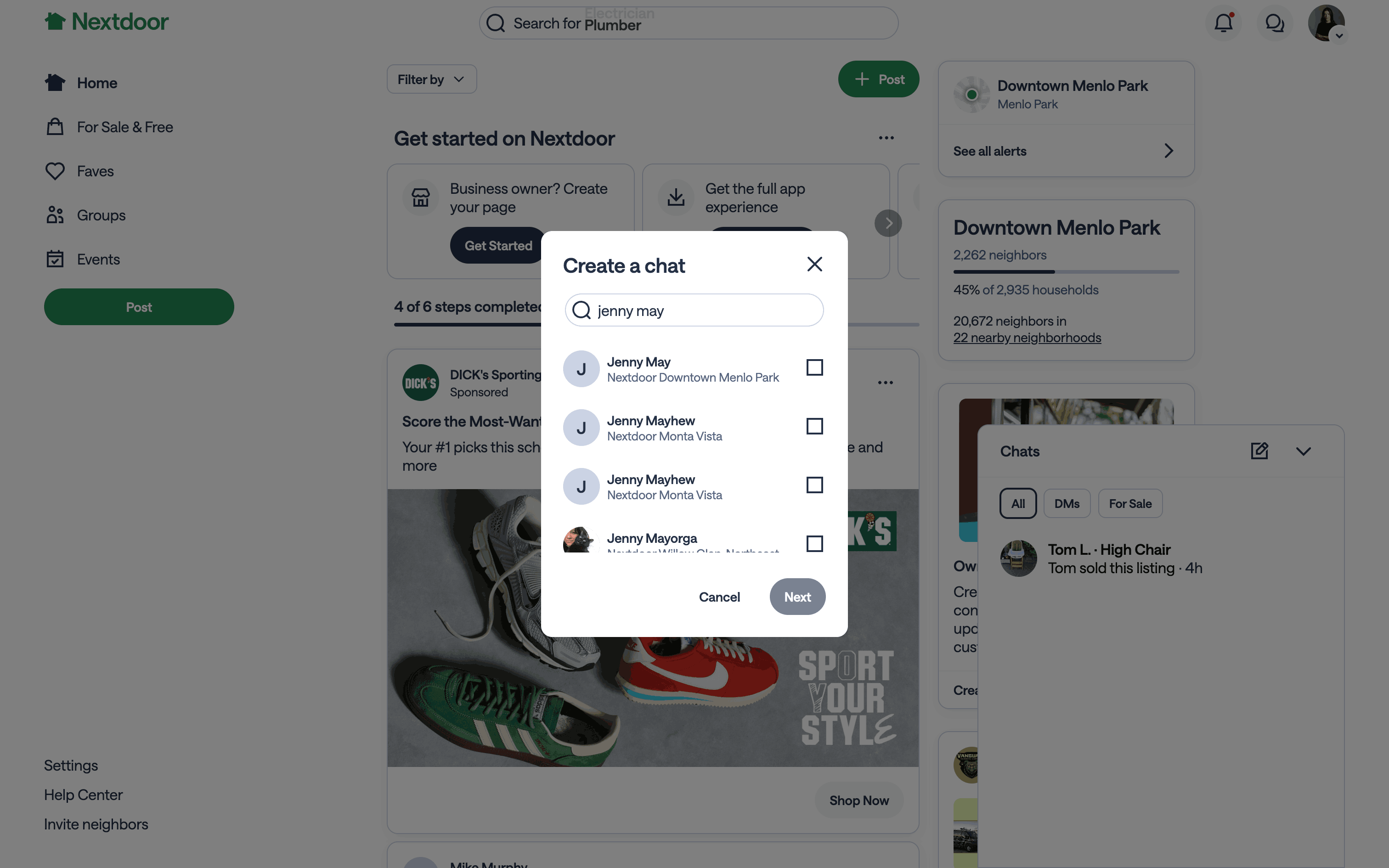 The user flow demonstrates creating a new chat with a selected user and sending an initial message. It showcases the process of initiating a conversation on the Nextdoor platform.