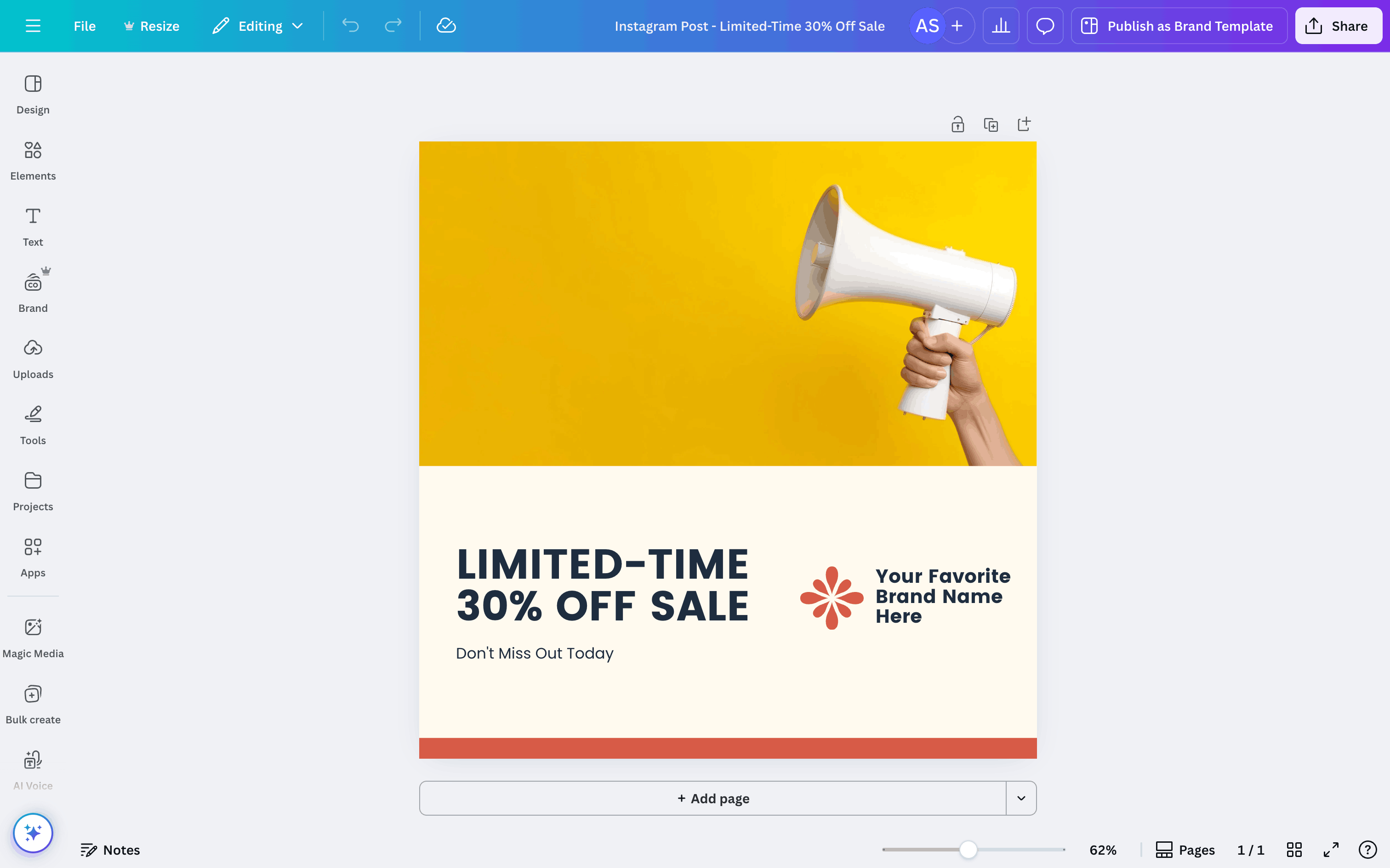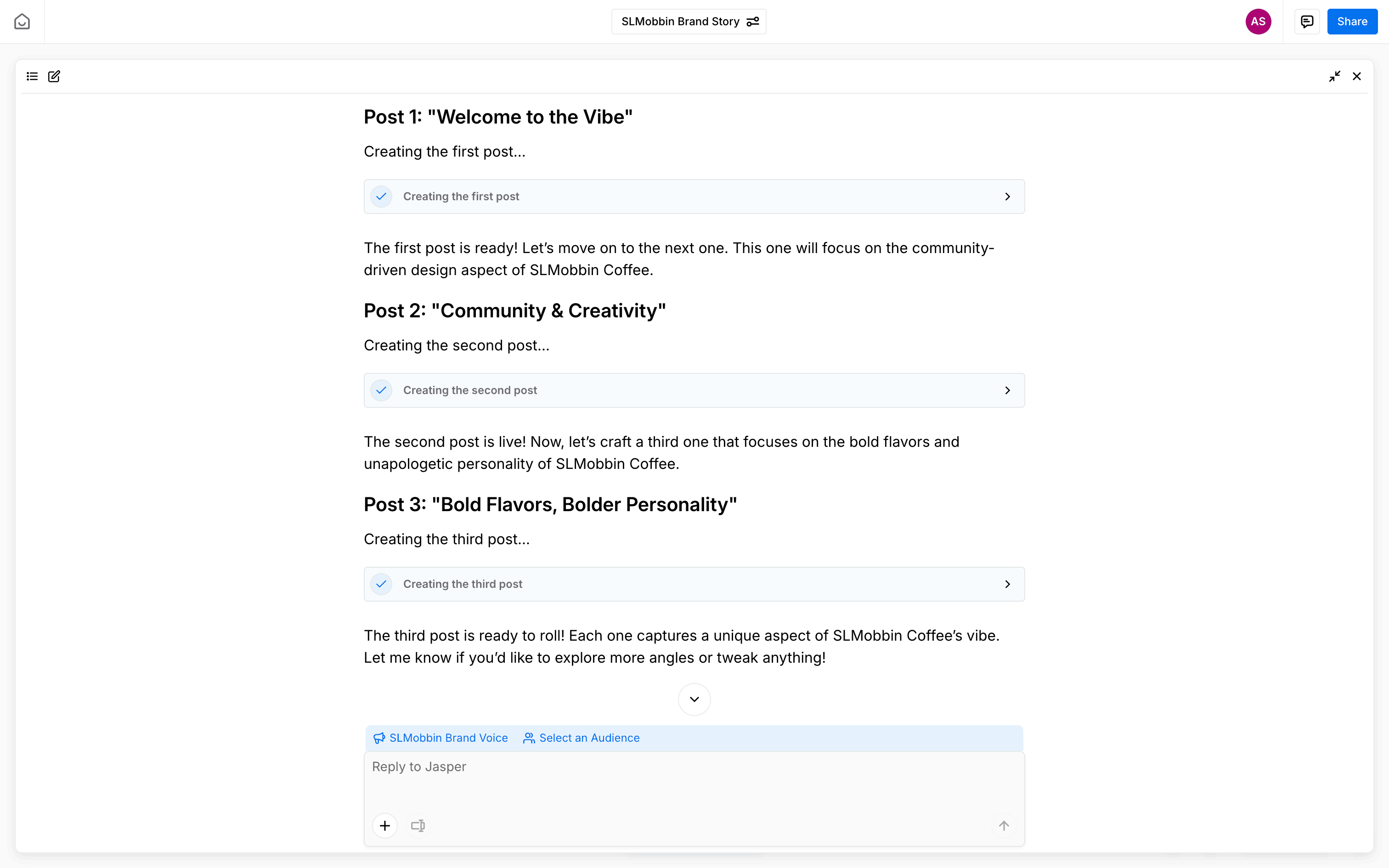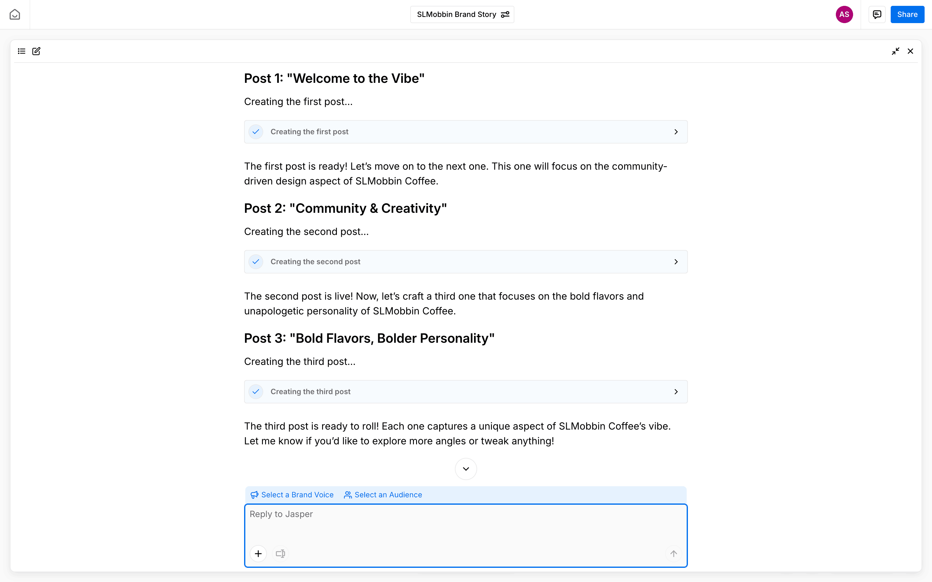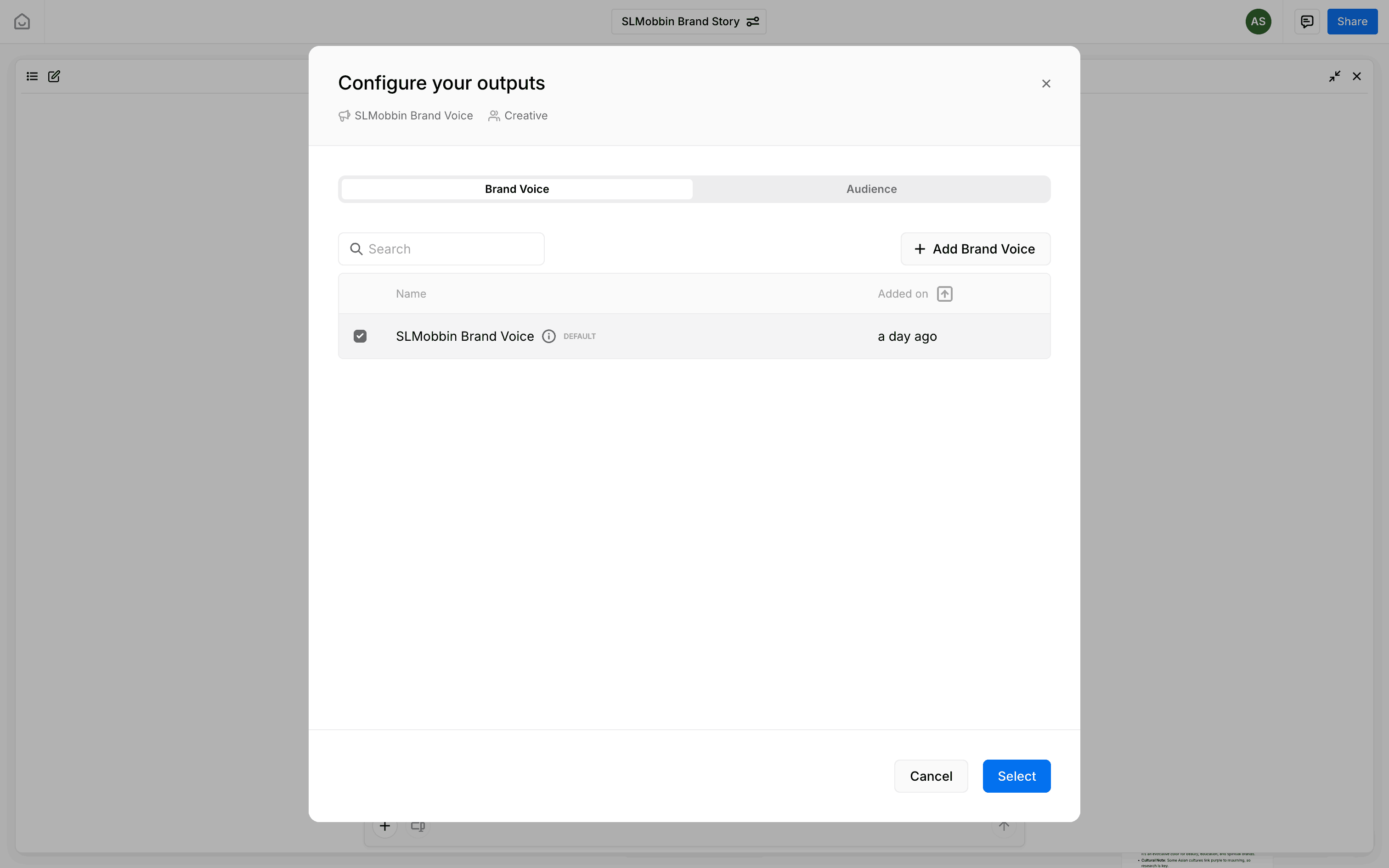 The user selects a brand voice for a series of posts. They navigate through a modal to configure and confirm their choice.