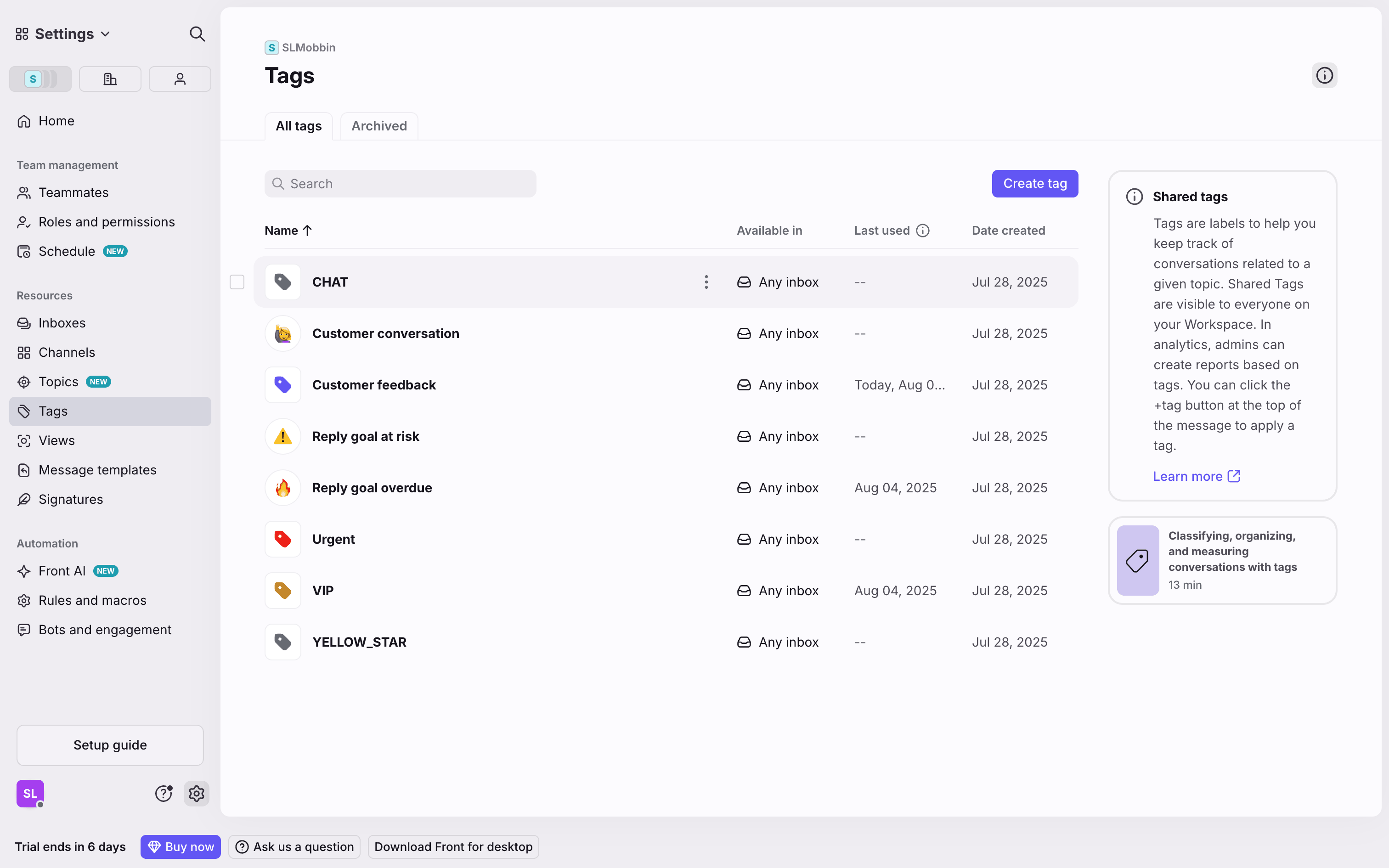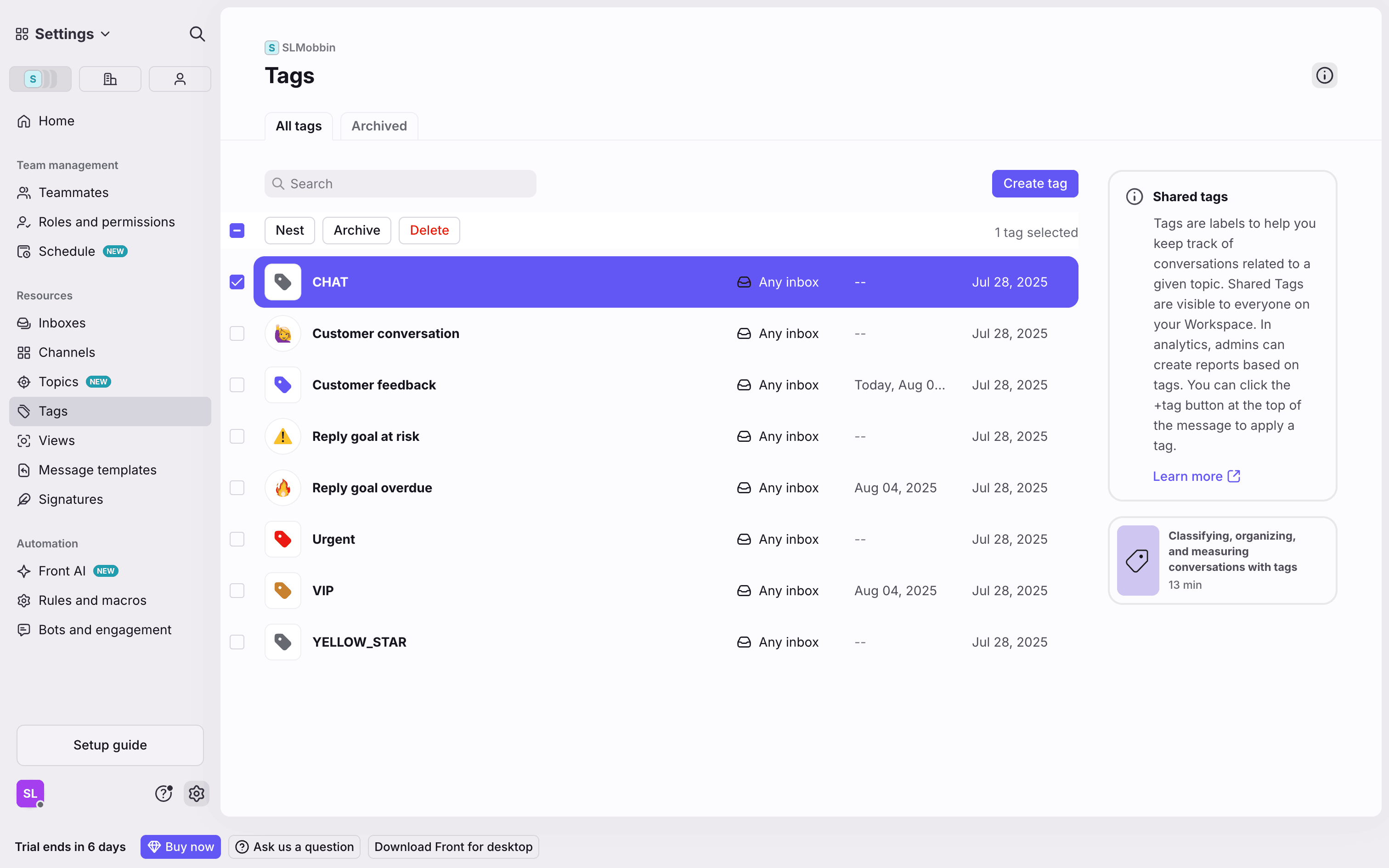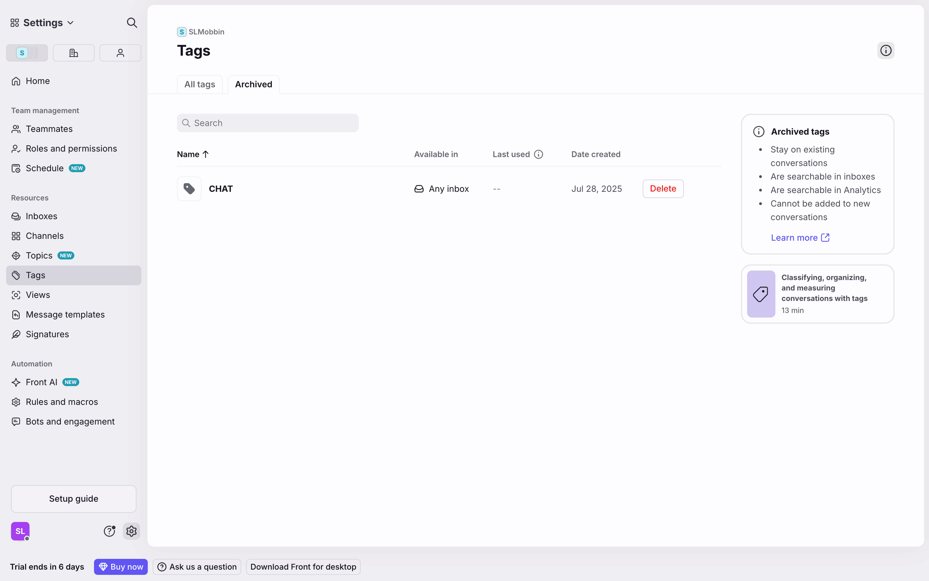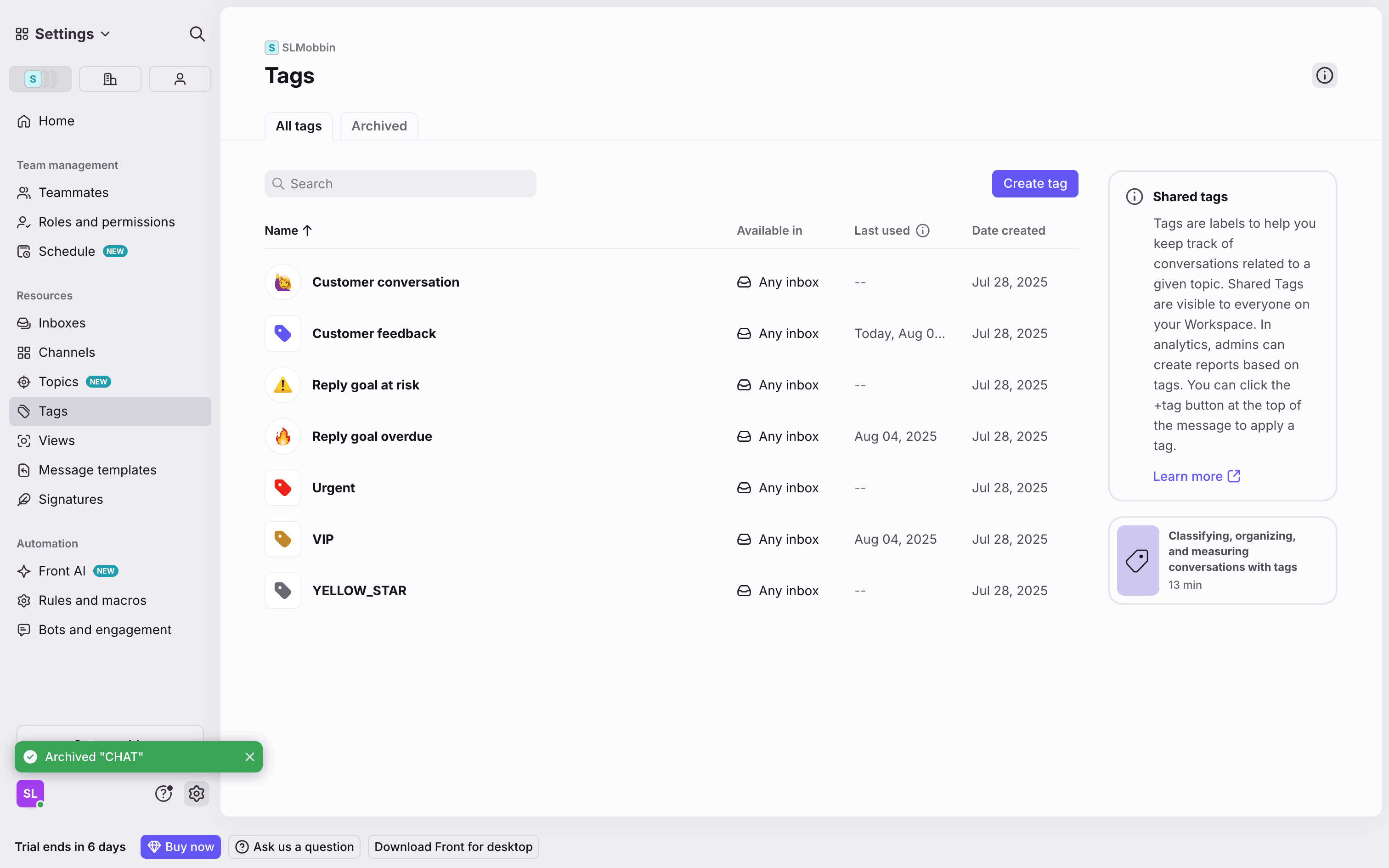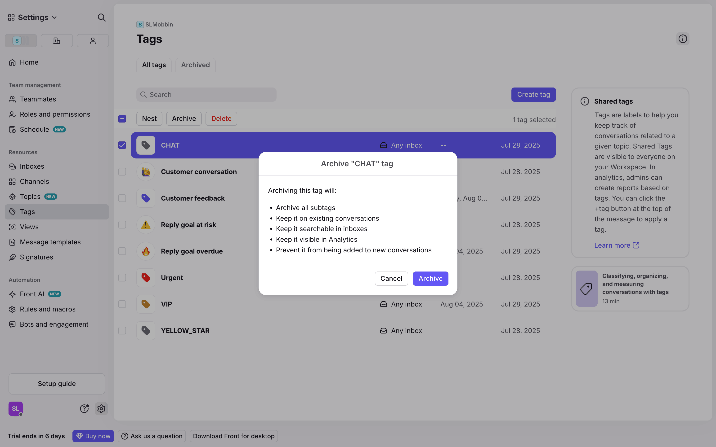 The user archives a tag by selecting it from the list, confirming the action in a modal, and then viewing the tag in the archived list.