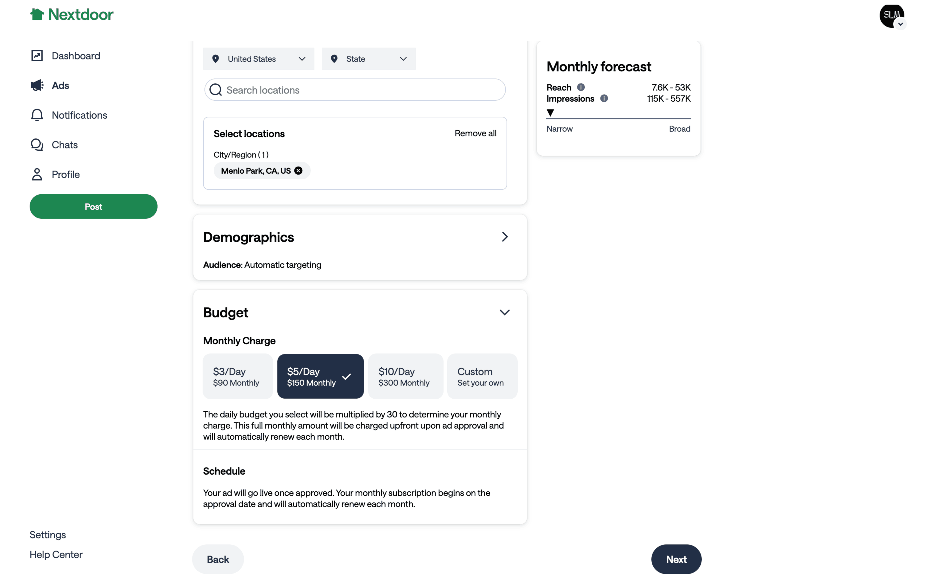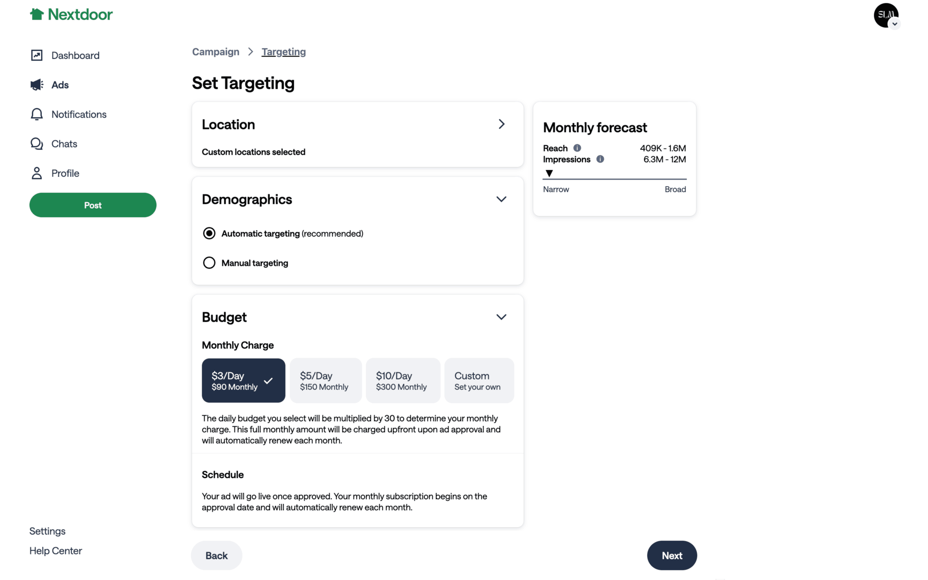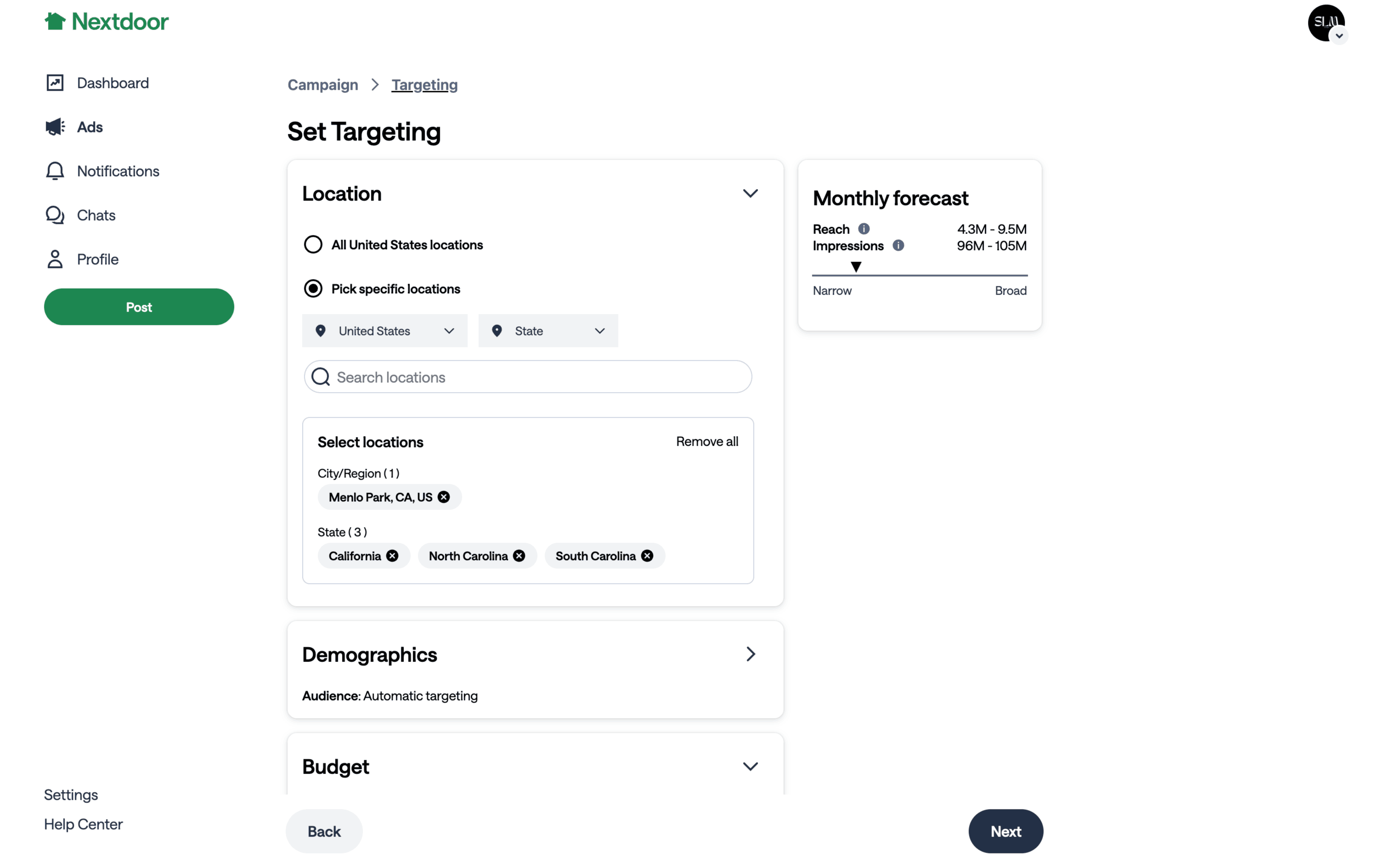 The user flow demonstrates setting up a campaign target by configuring location, demographics, and budget. The user selects specific locations and automatic demographics before choosing a budget.