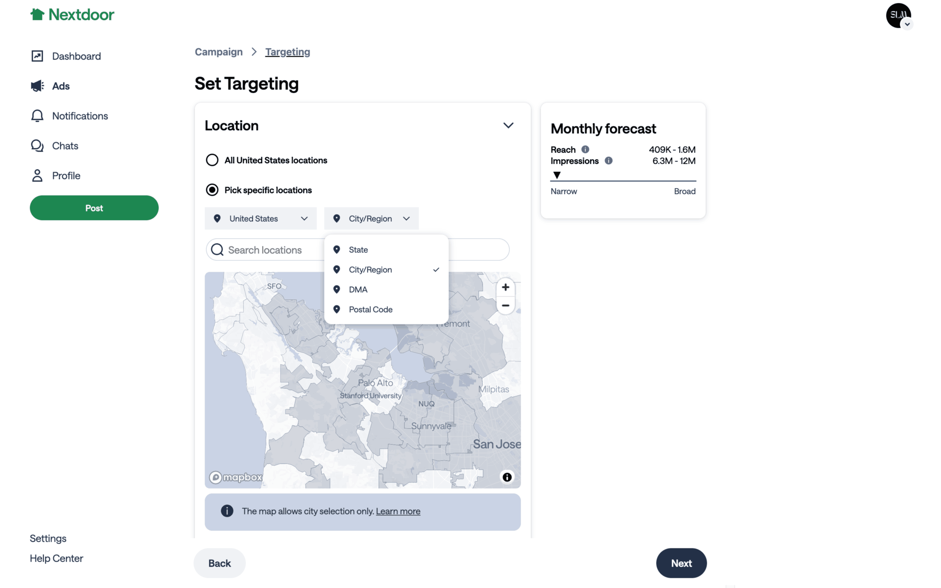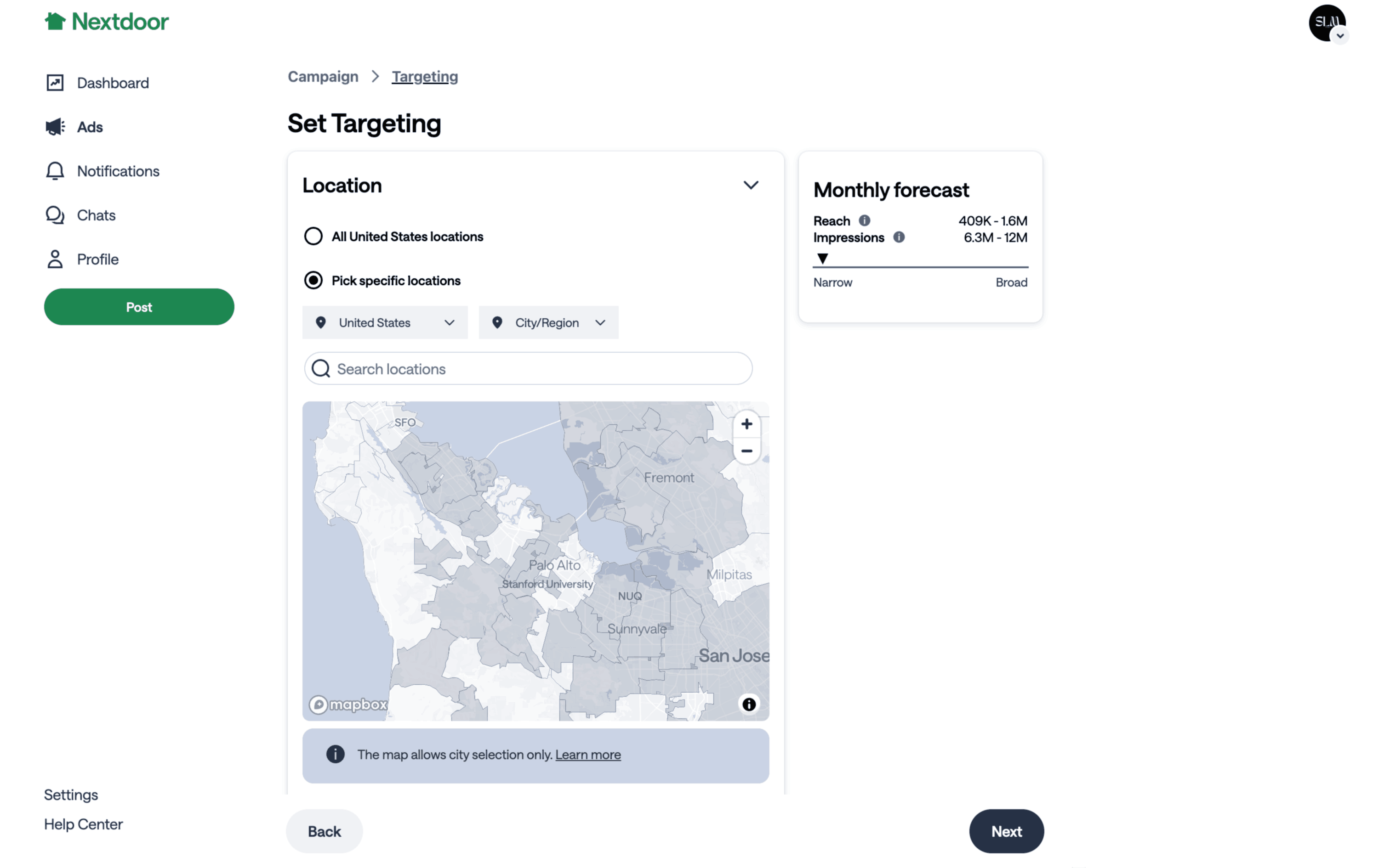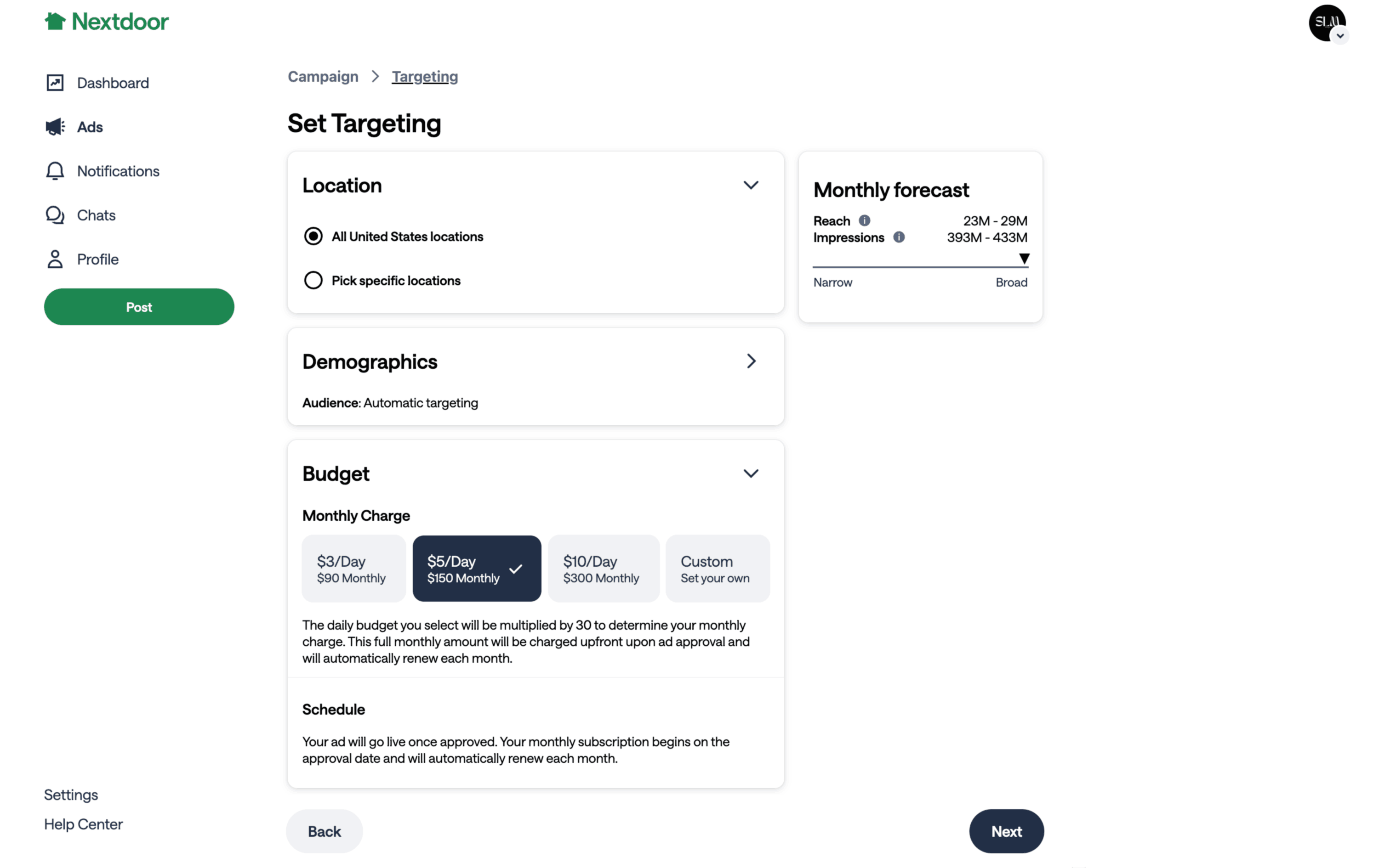 The user flow demonstrates setting up a campaign target by configuring location, demographics, and budget. The user selects specific locations and automatic demographics before choosing a budget.