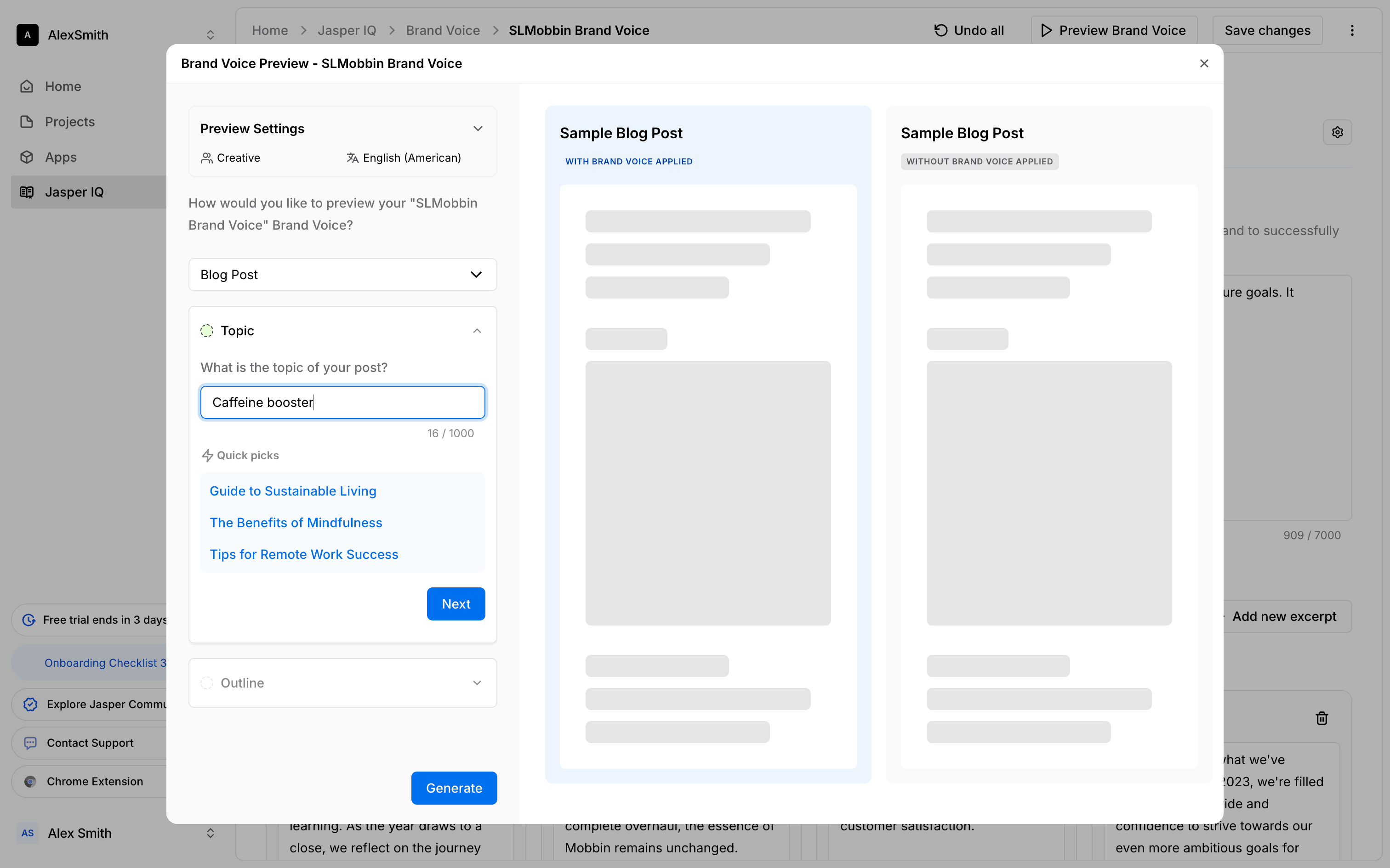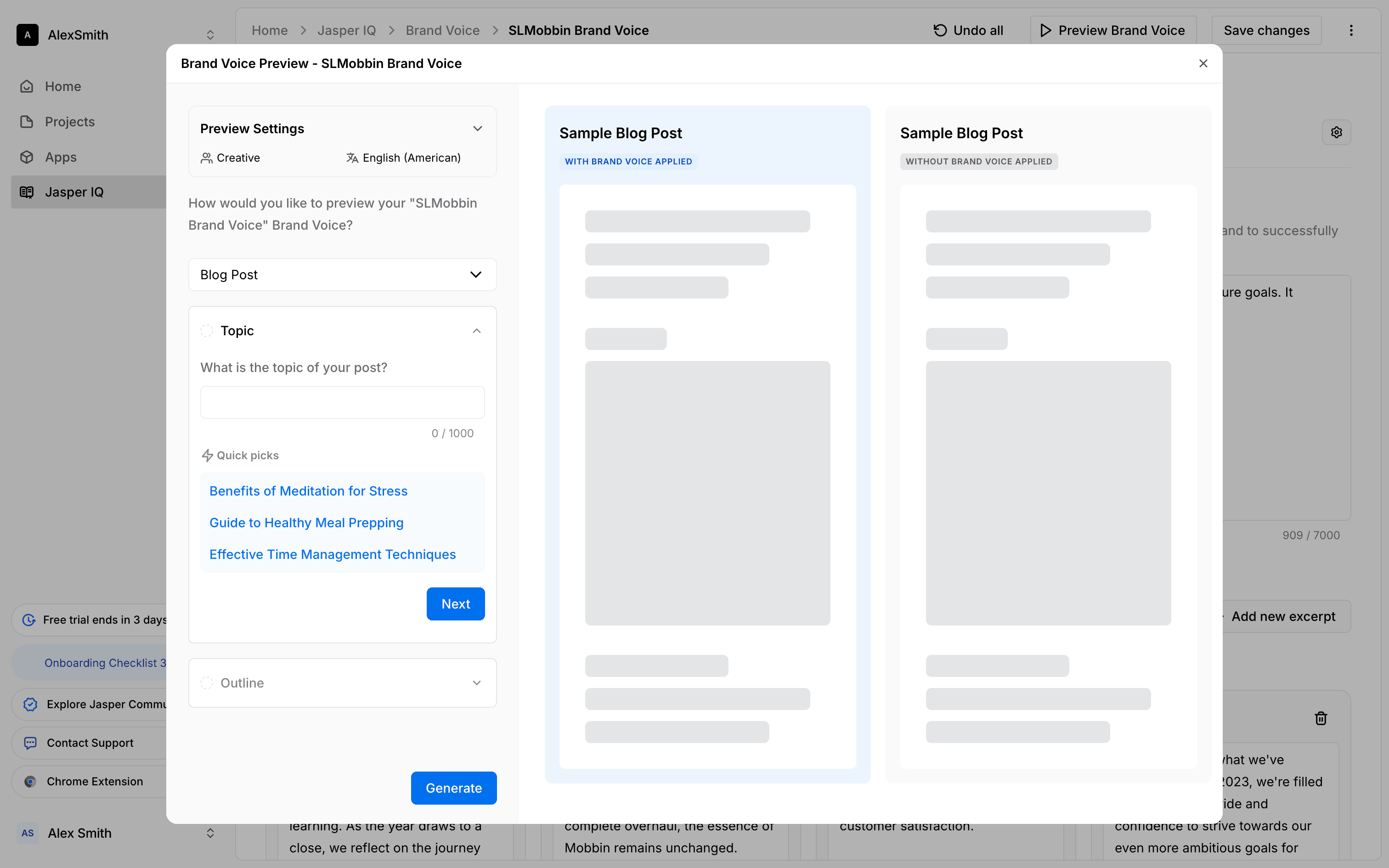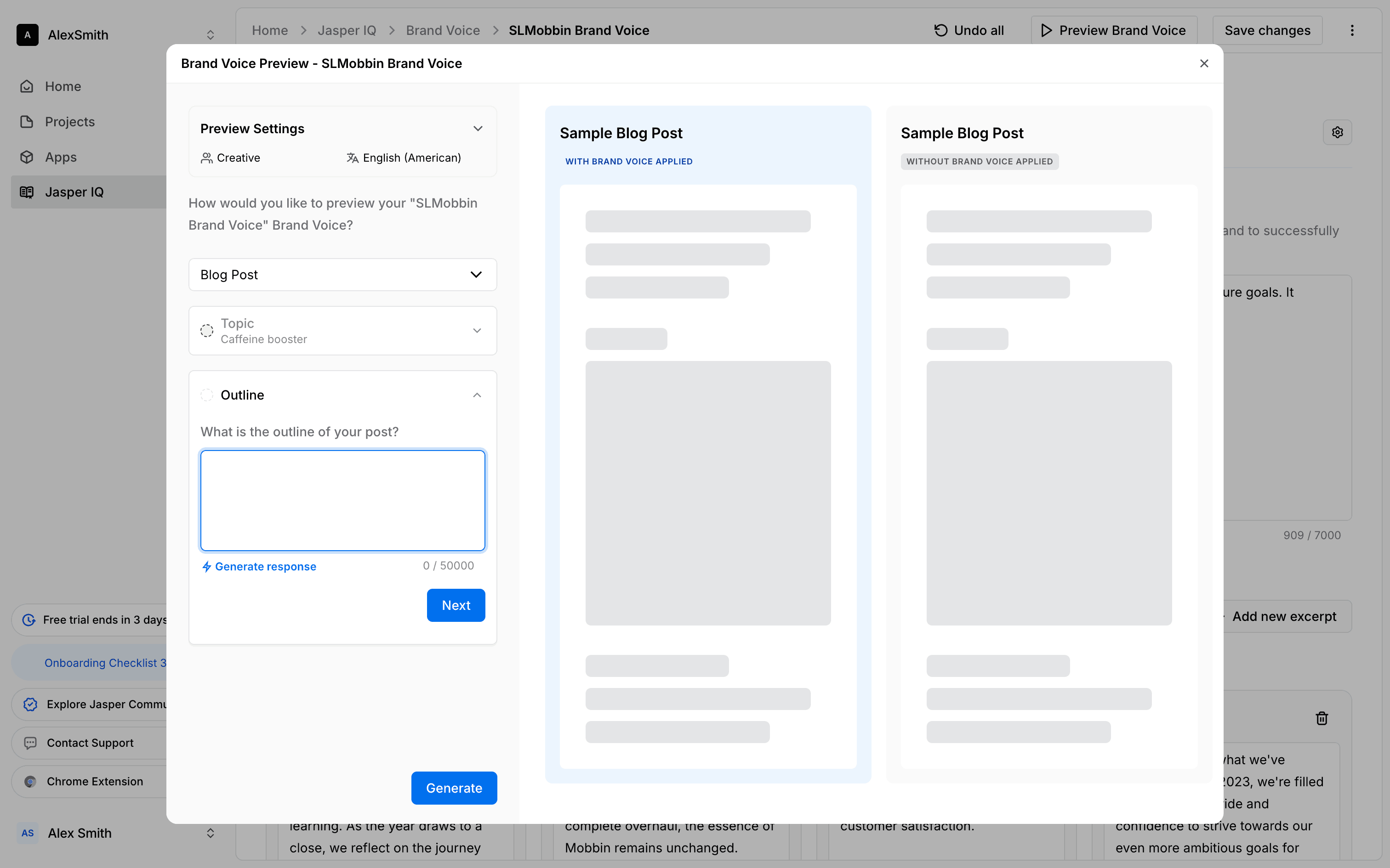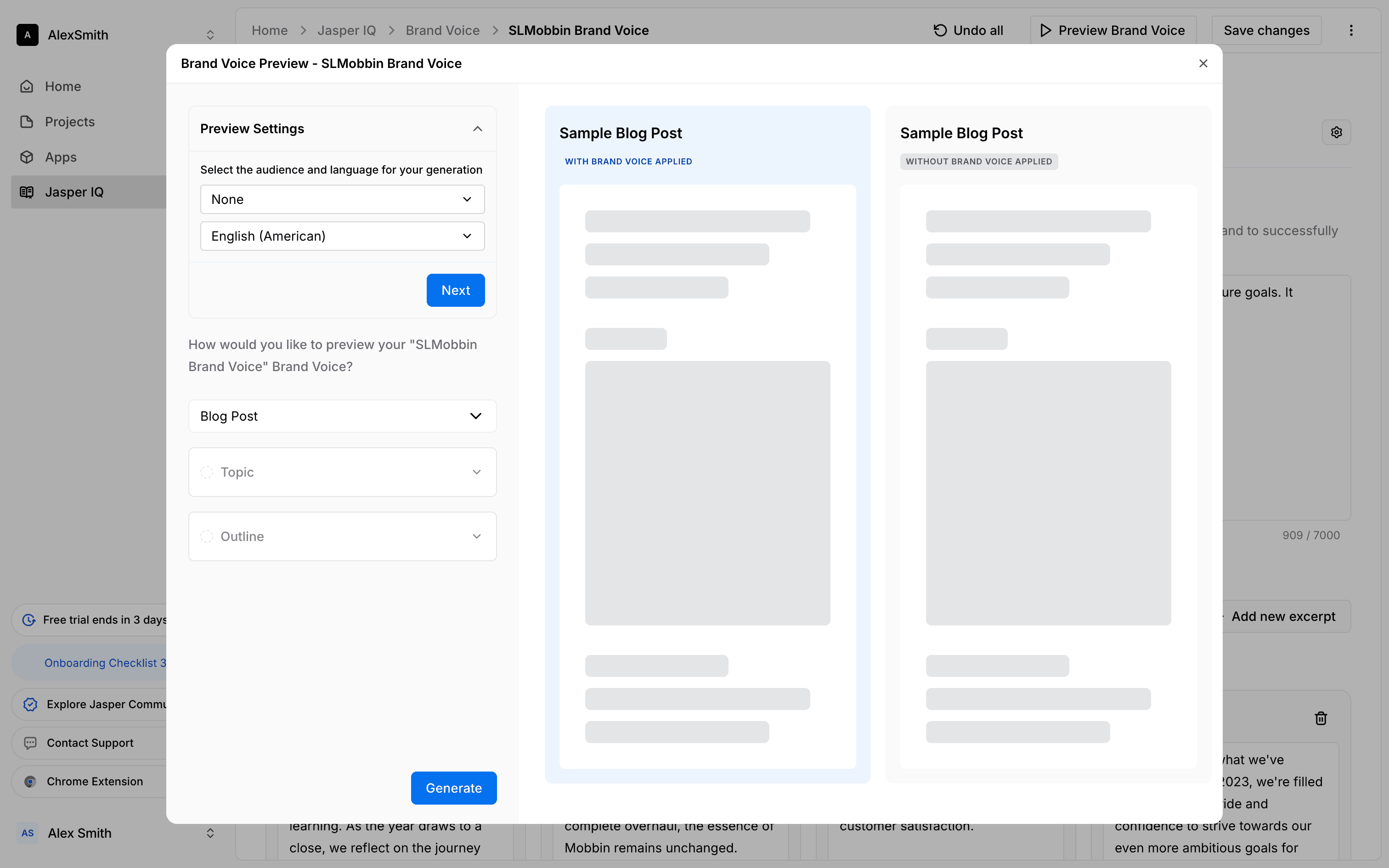 The user sets up a preview for a brand voice by configuring the audience, language, topic, and outline. They then generate the preview to see sample blog posts.