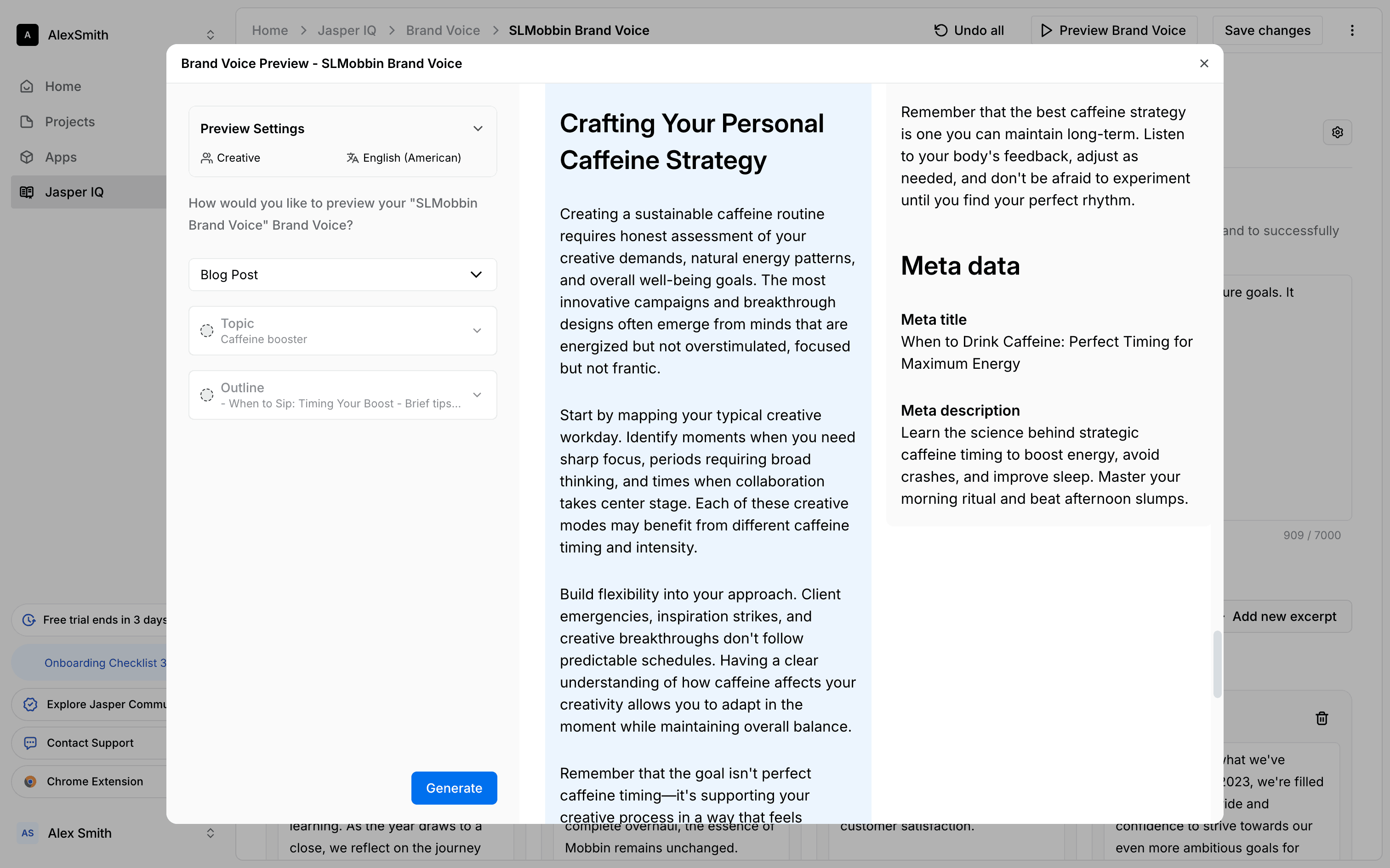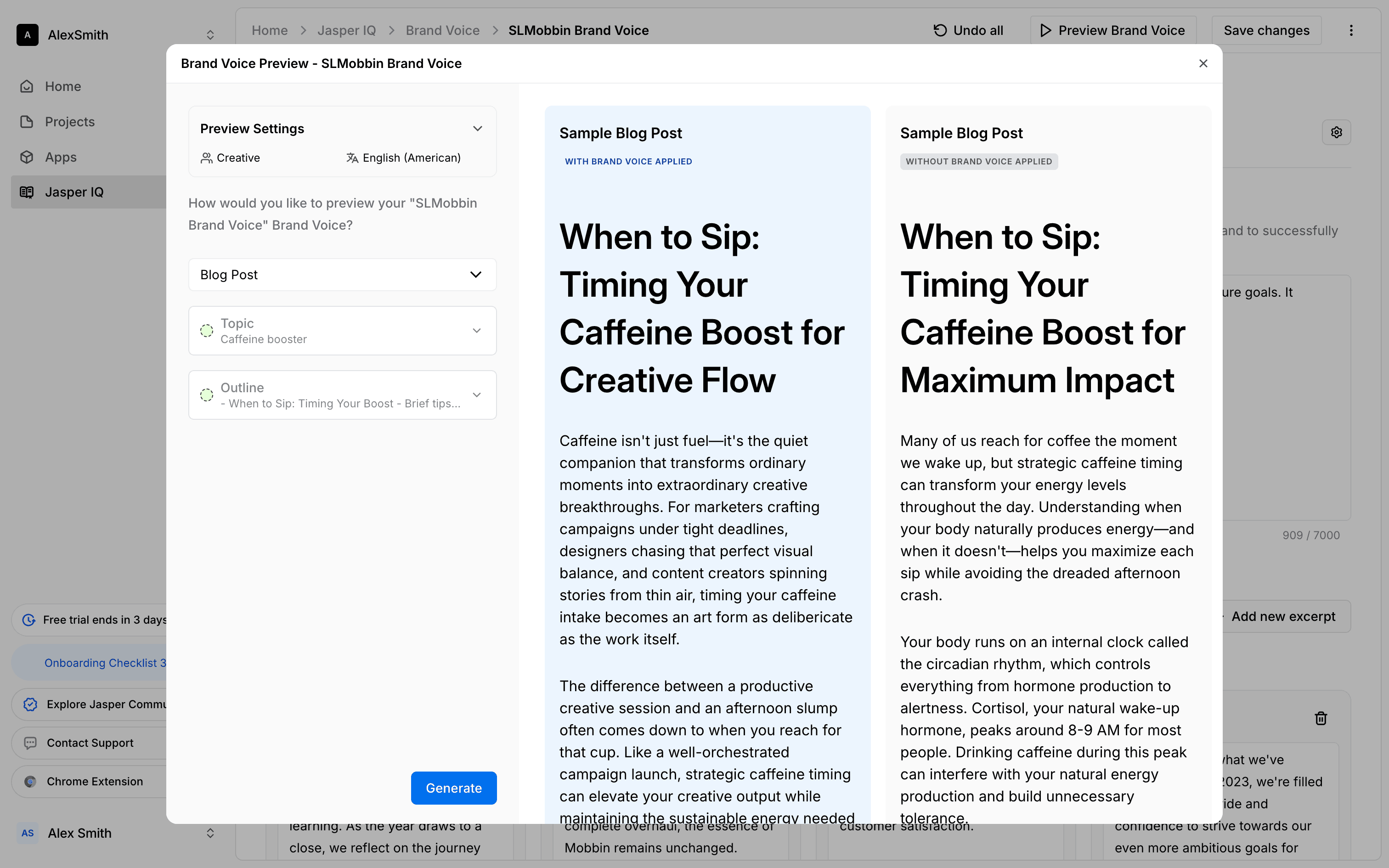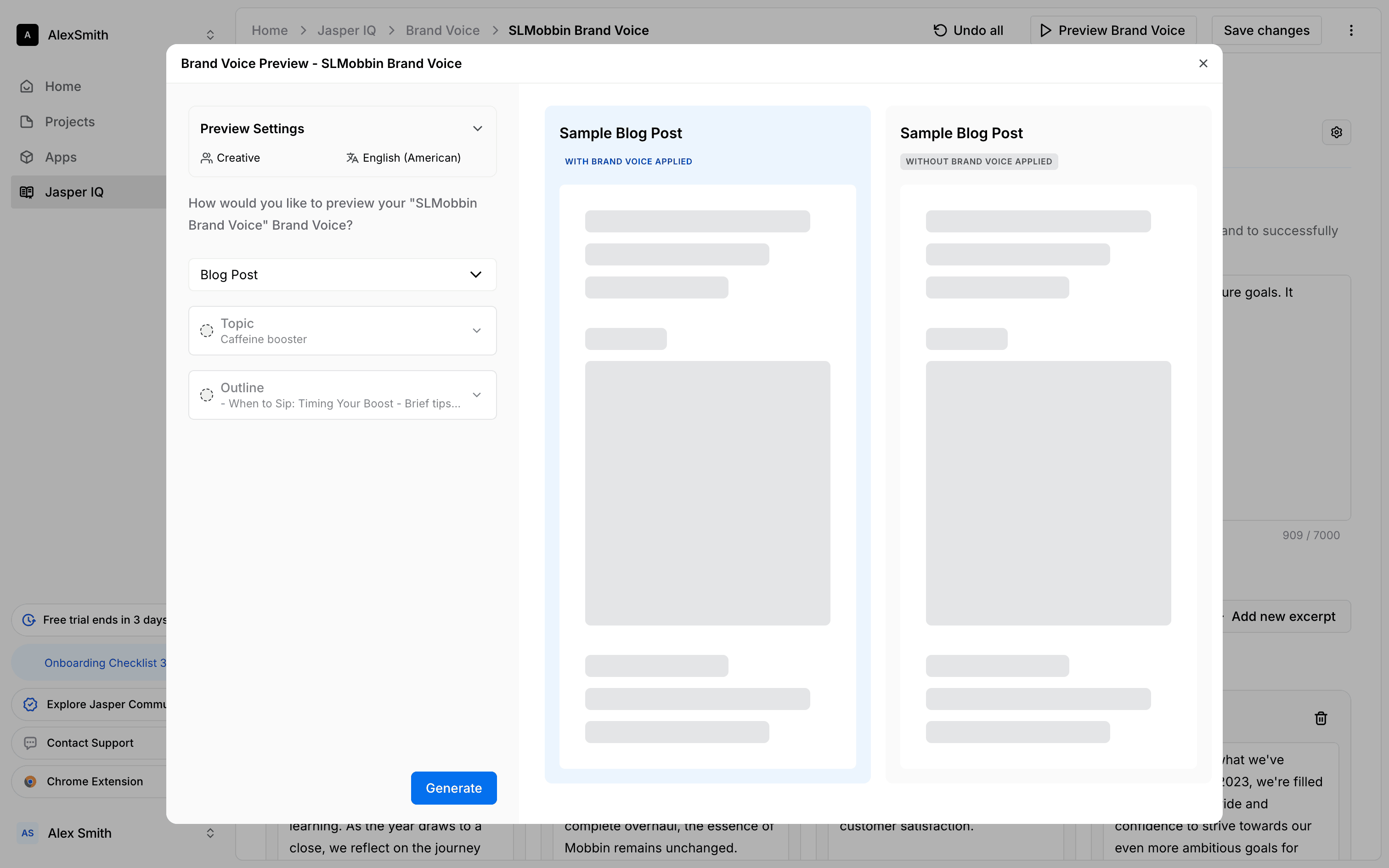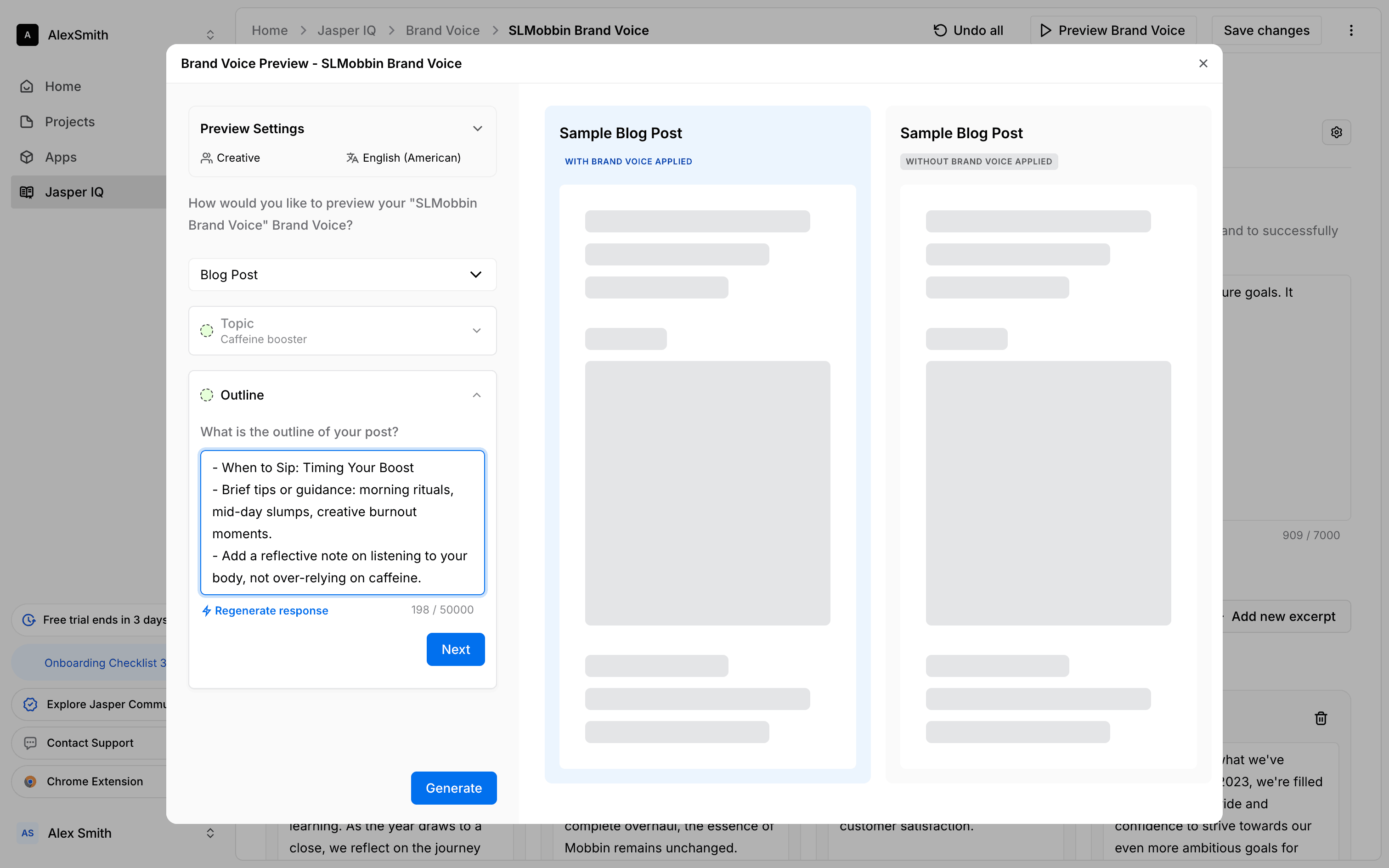 The user sets up a preview for a brand voice by configuring the audience, language, topic, and outline. They then generate the preview to see sample blog posts.