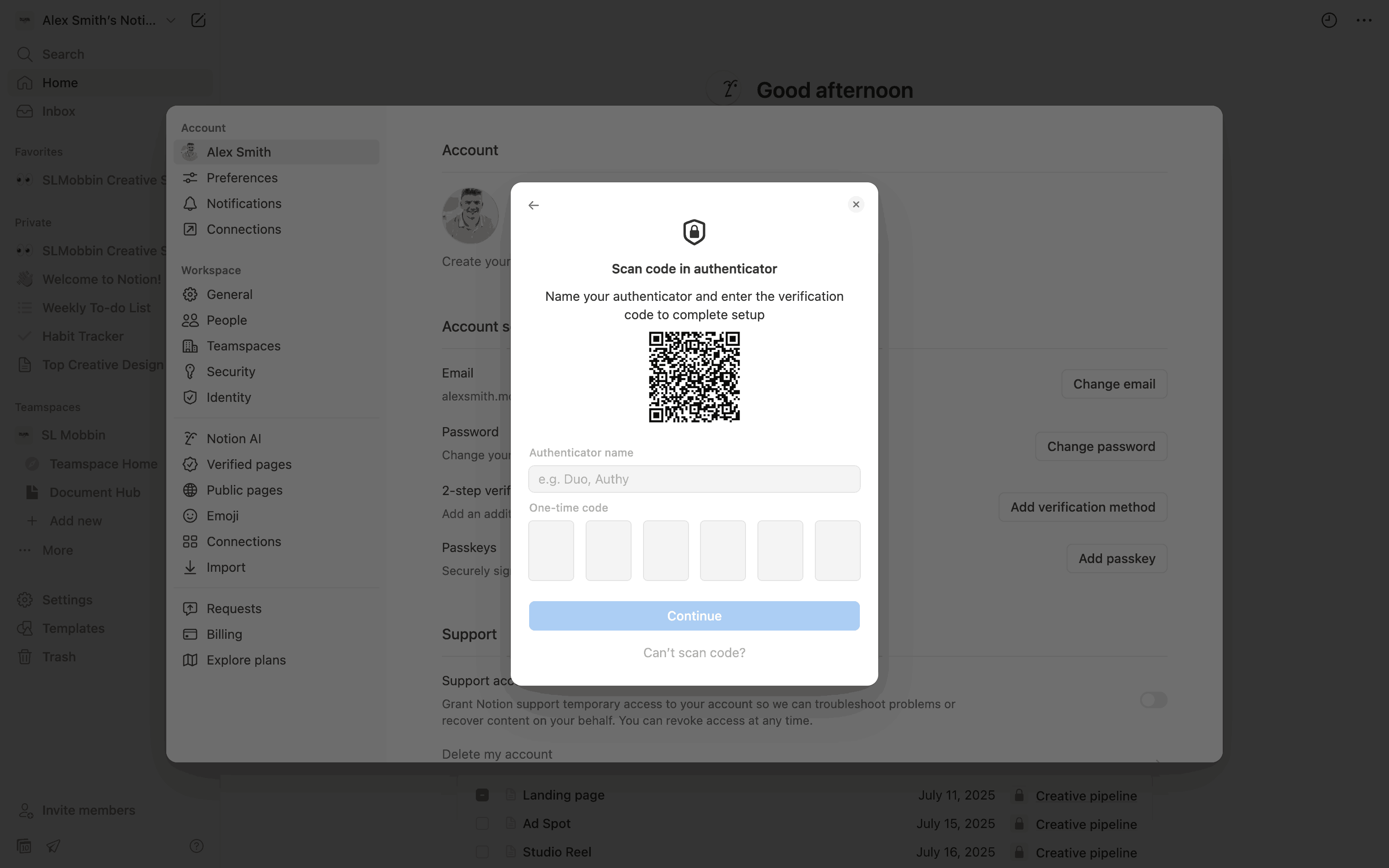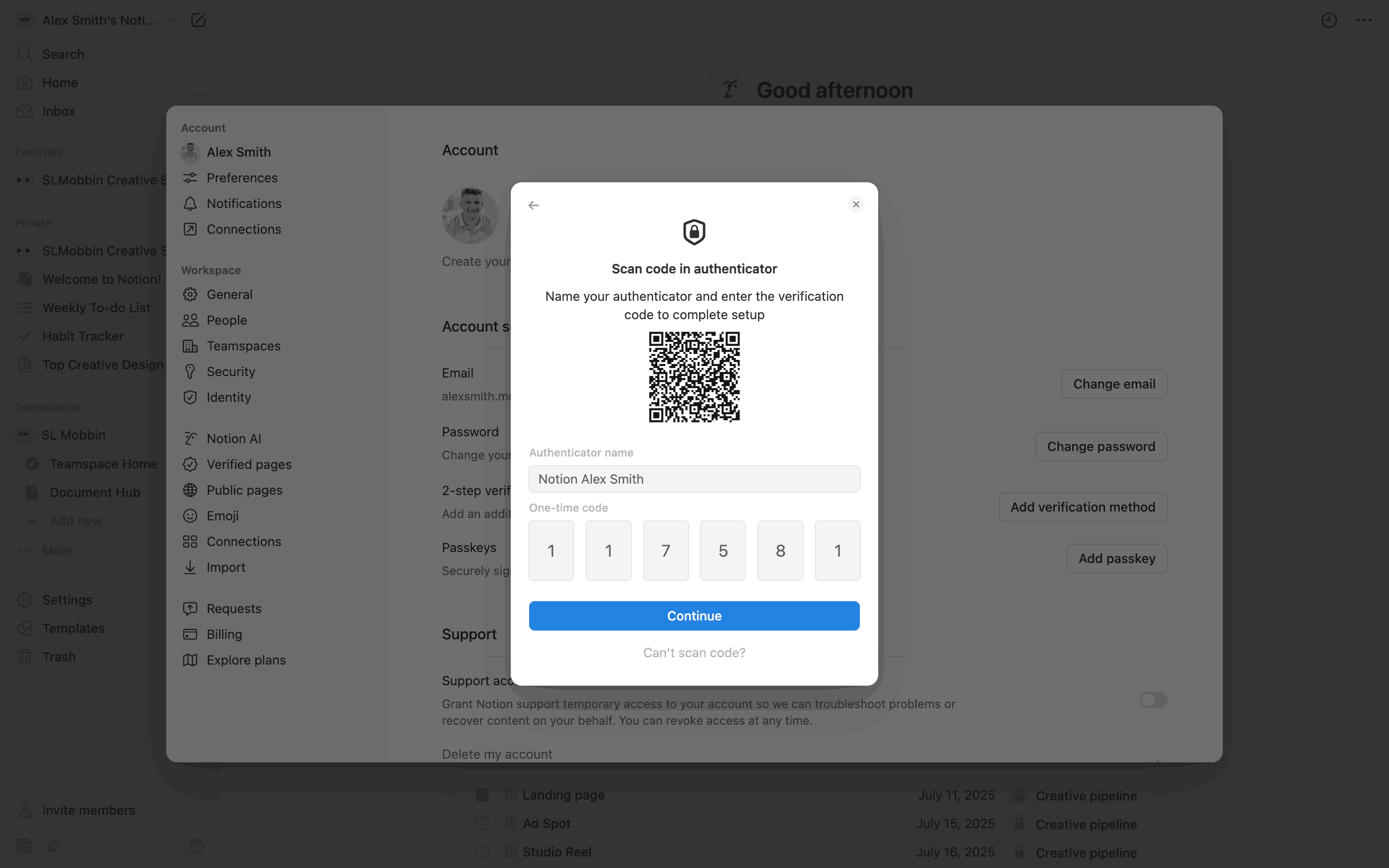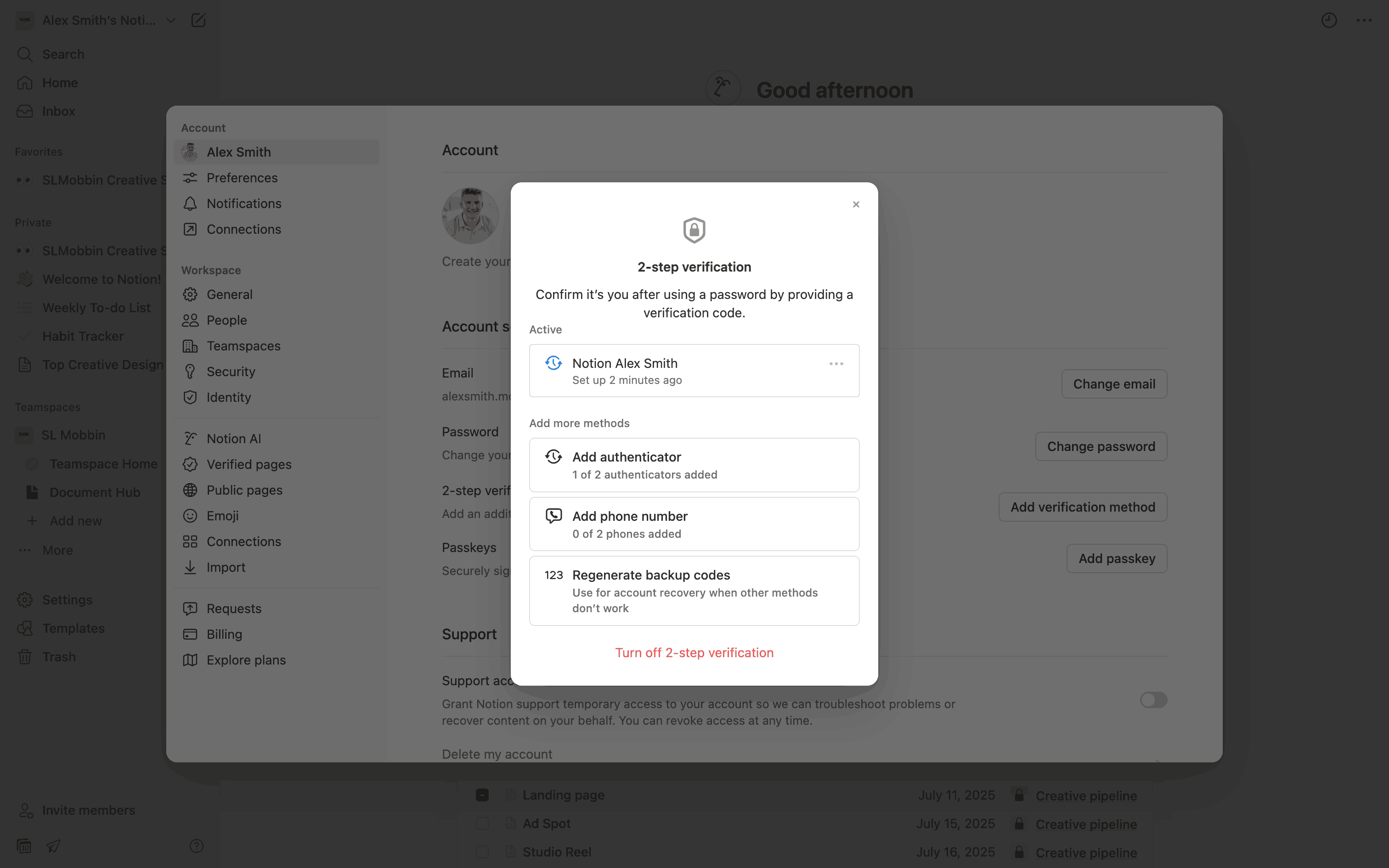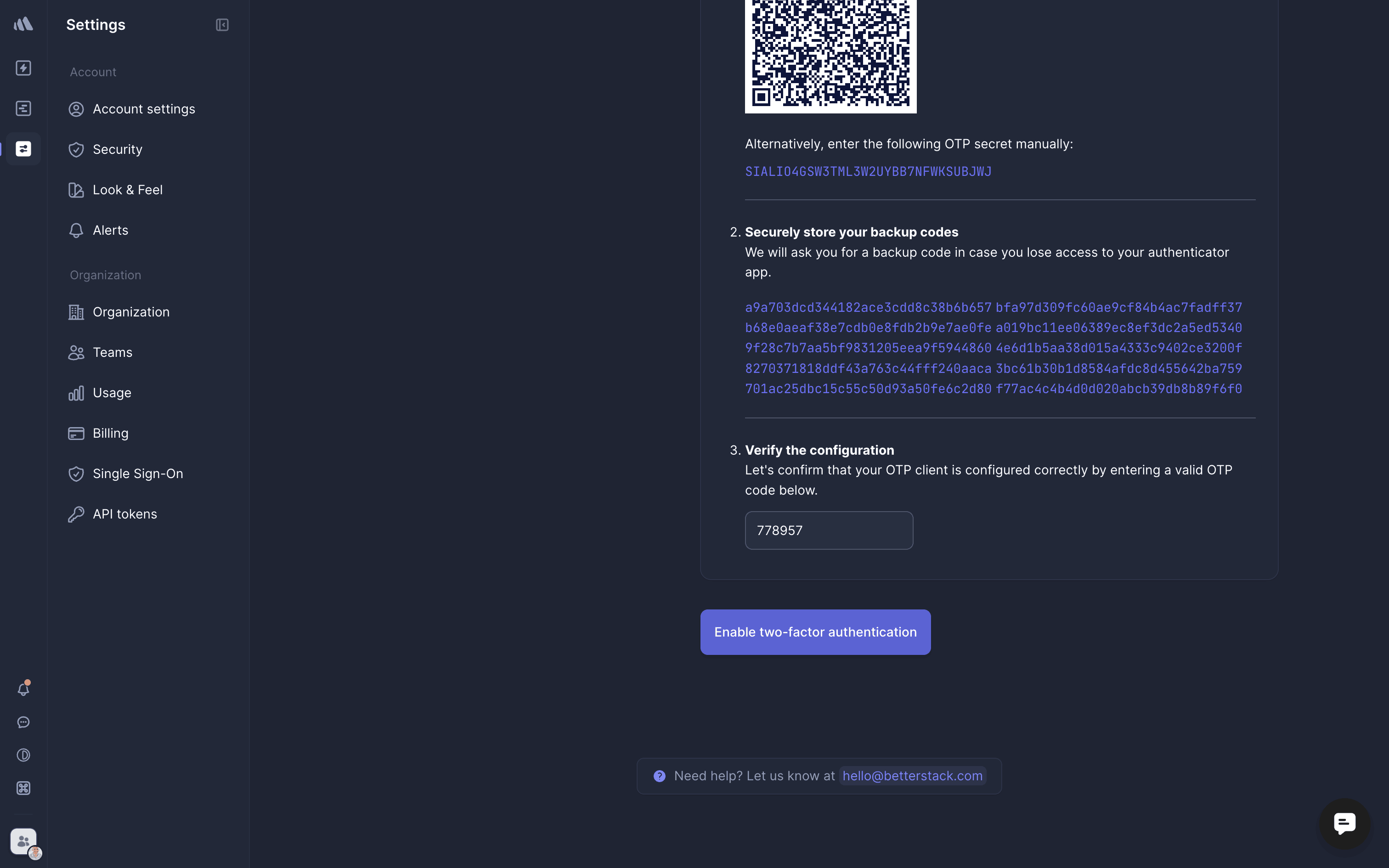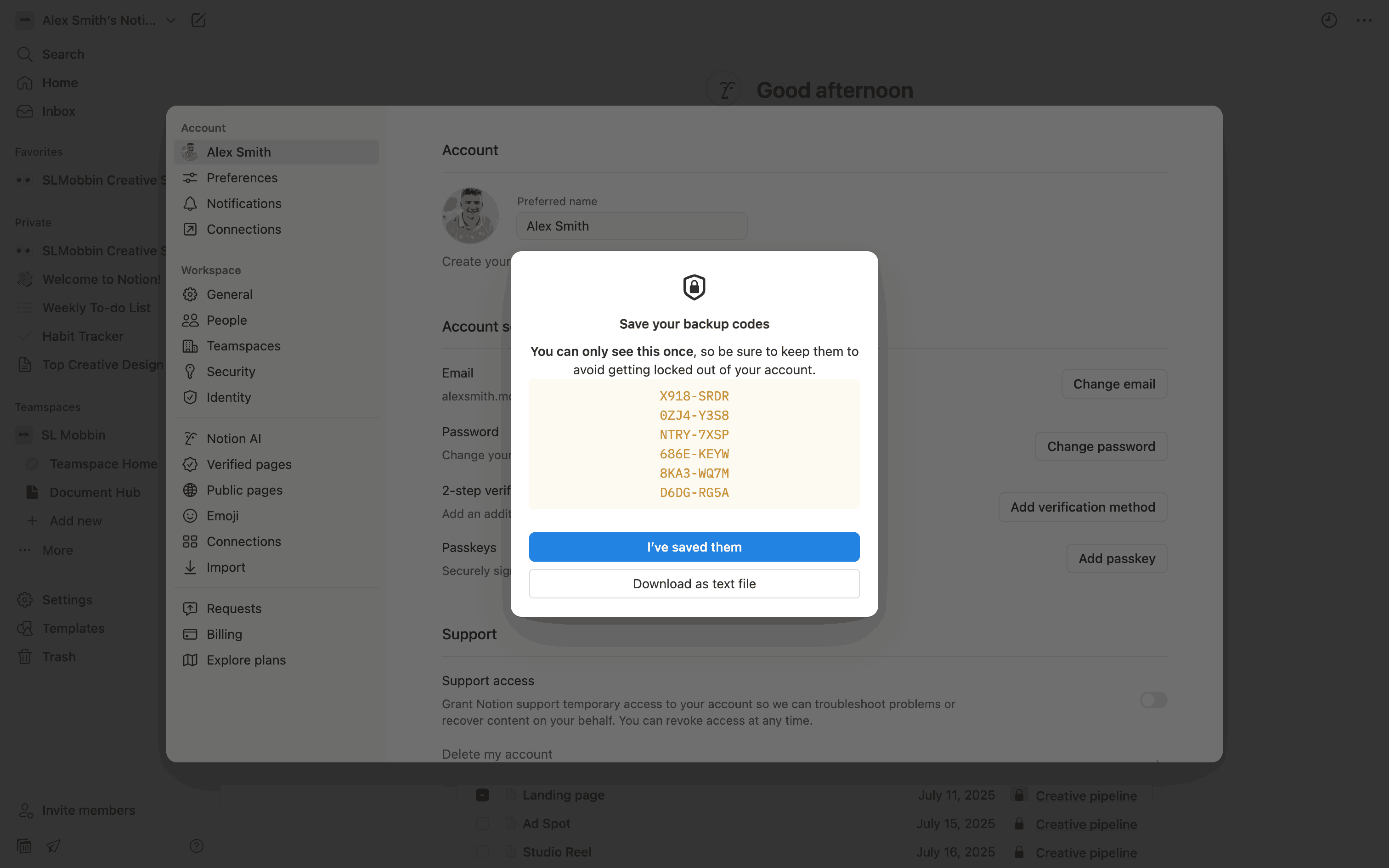 The user enables two-step verification using an authenticator app. They then save backup codes and confirm the successful setup.
