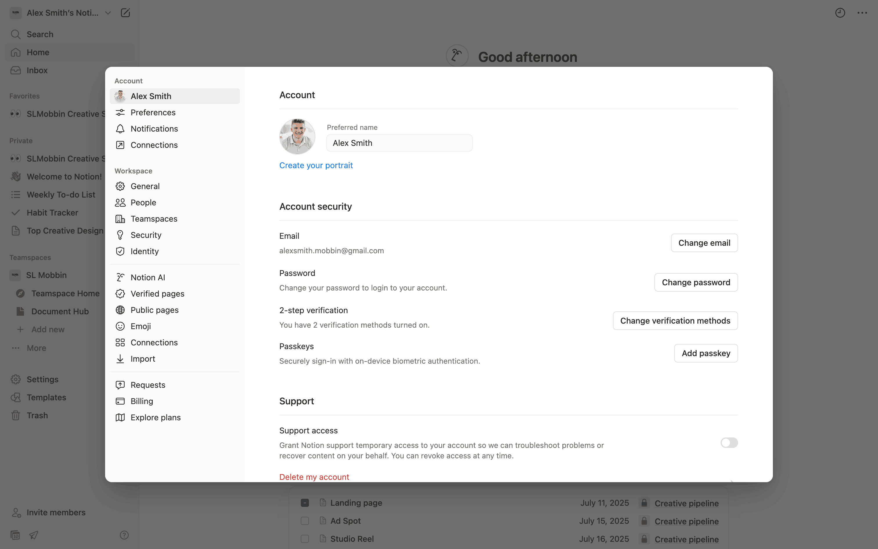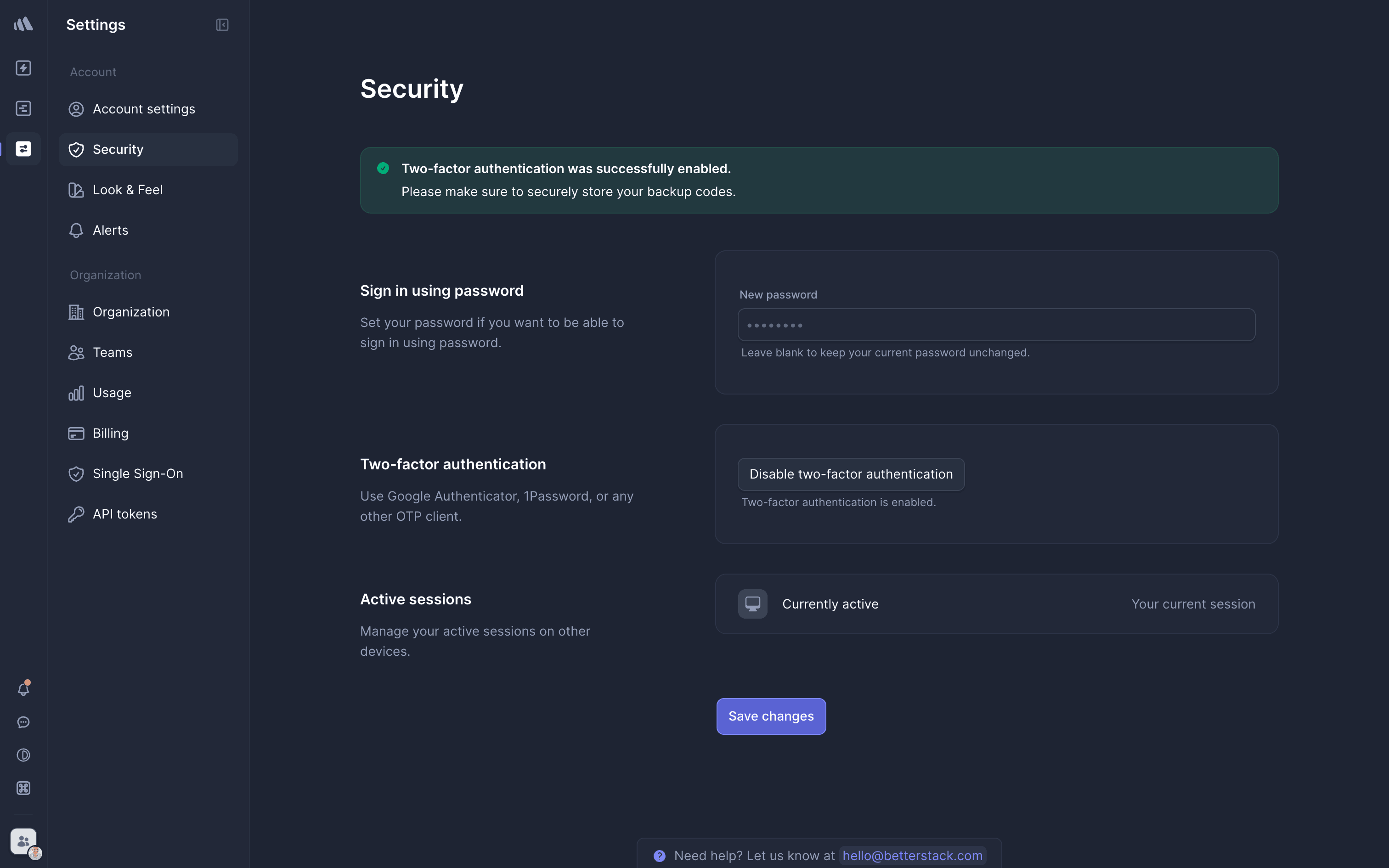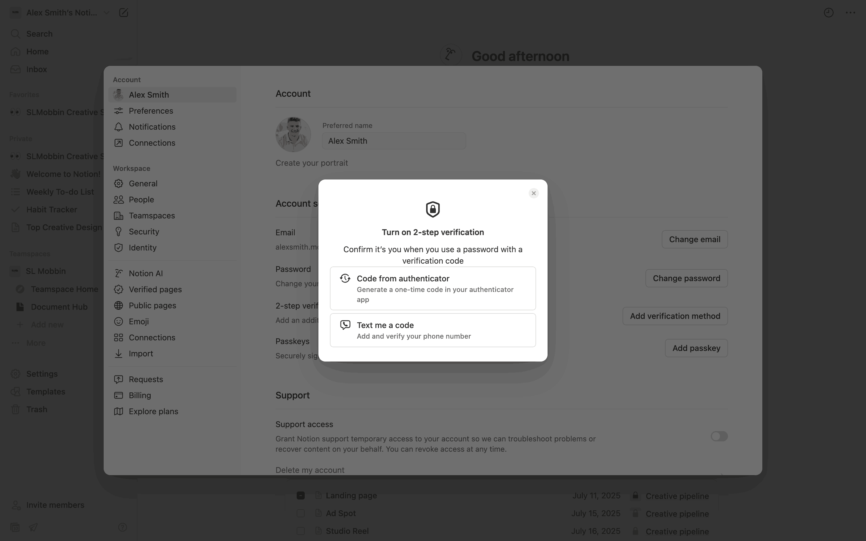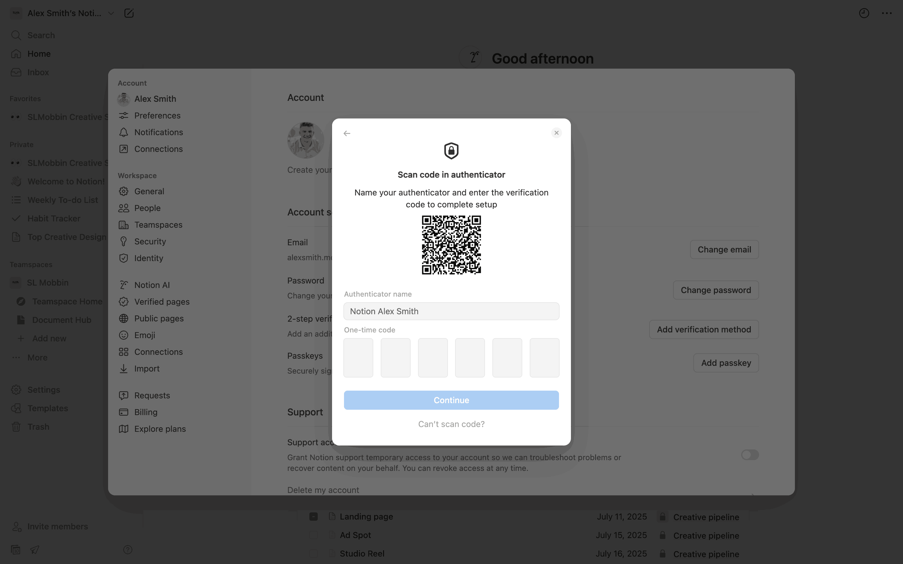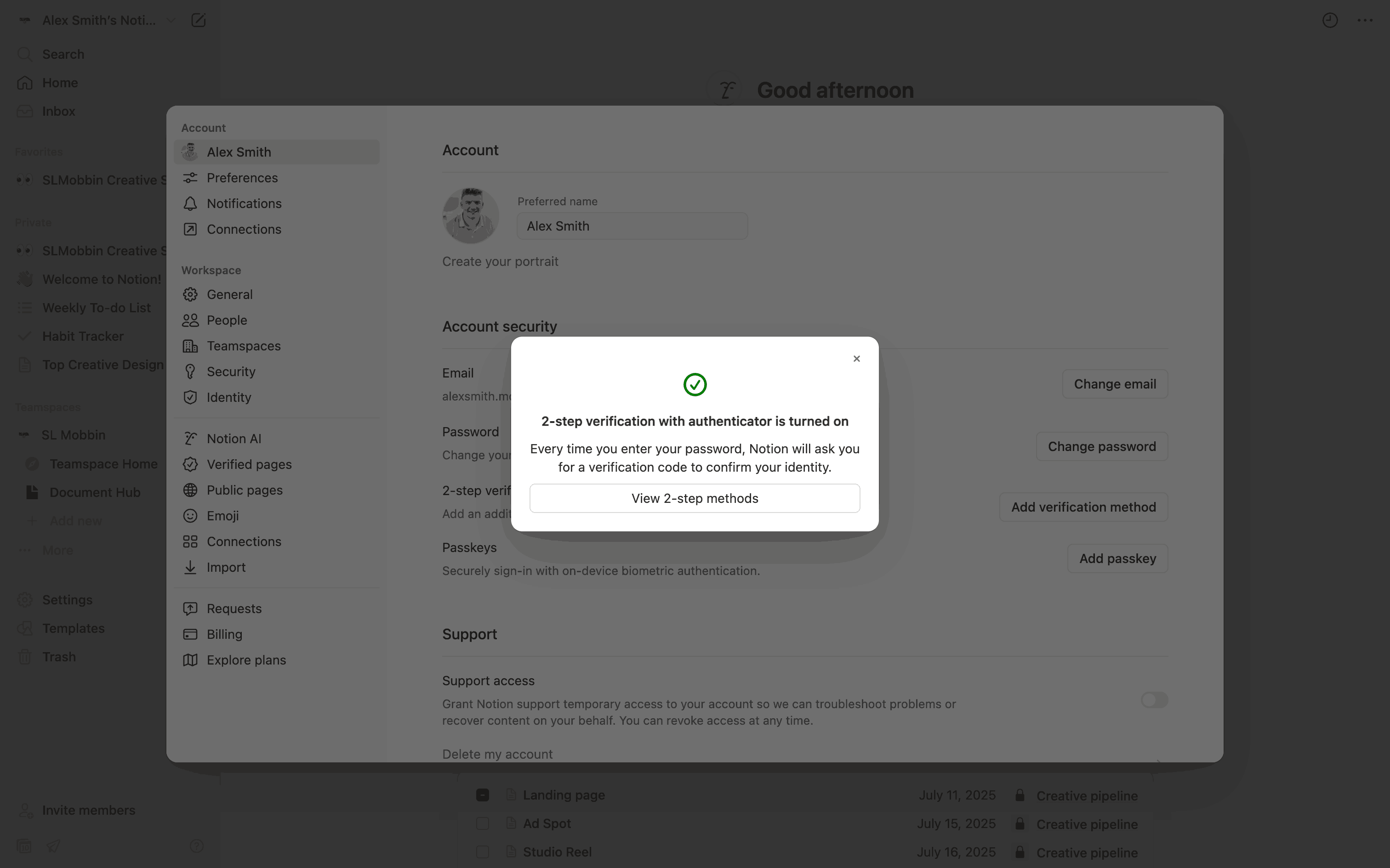 The user enables two-step verification using an authenticator app. They then save backup codes and confirm the successful setup.