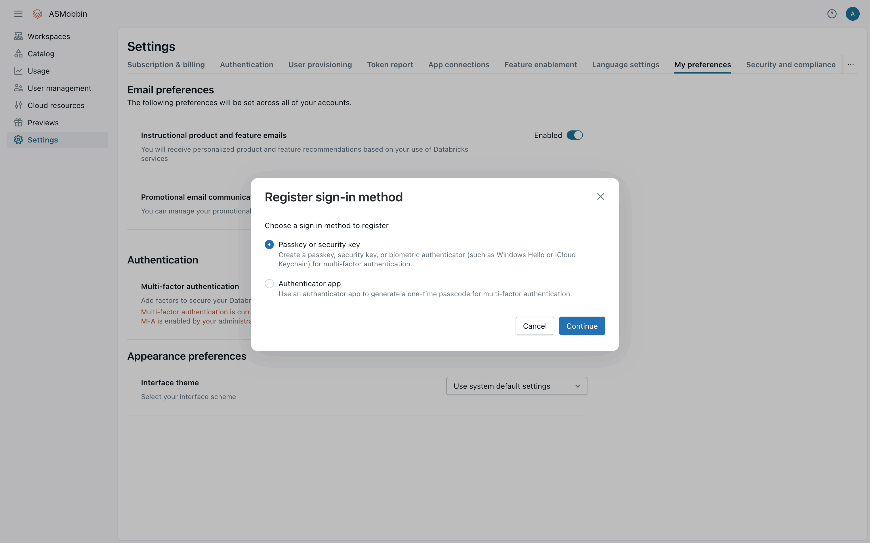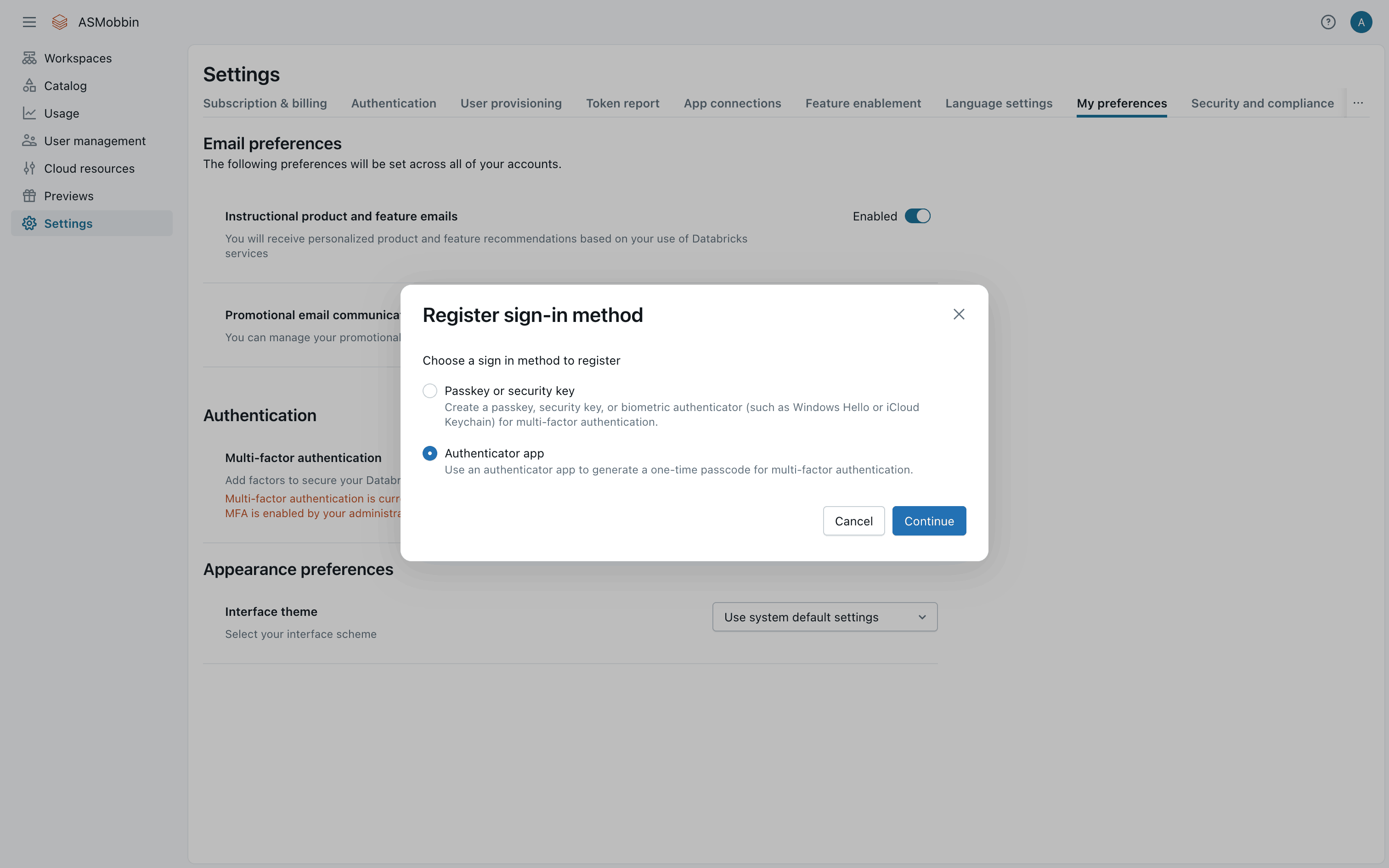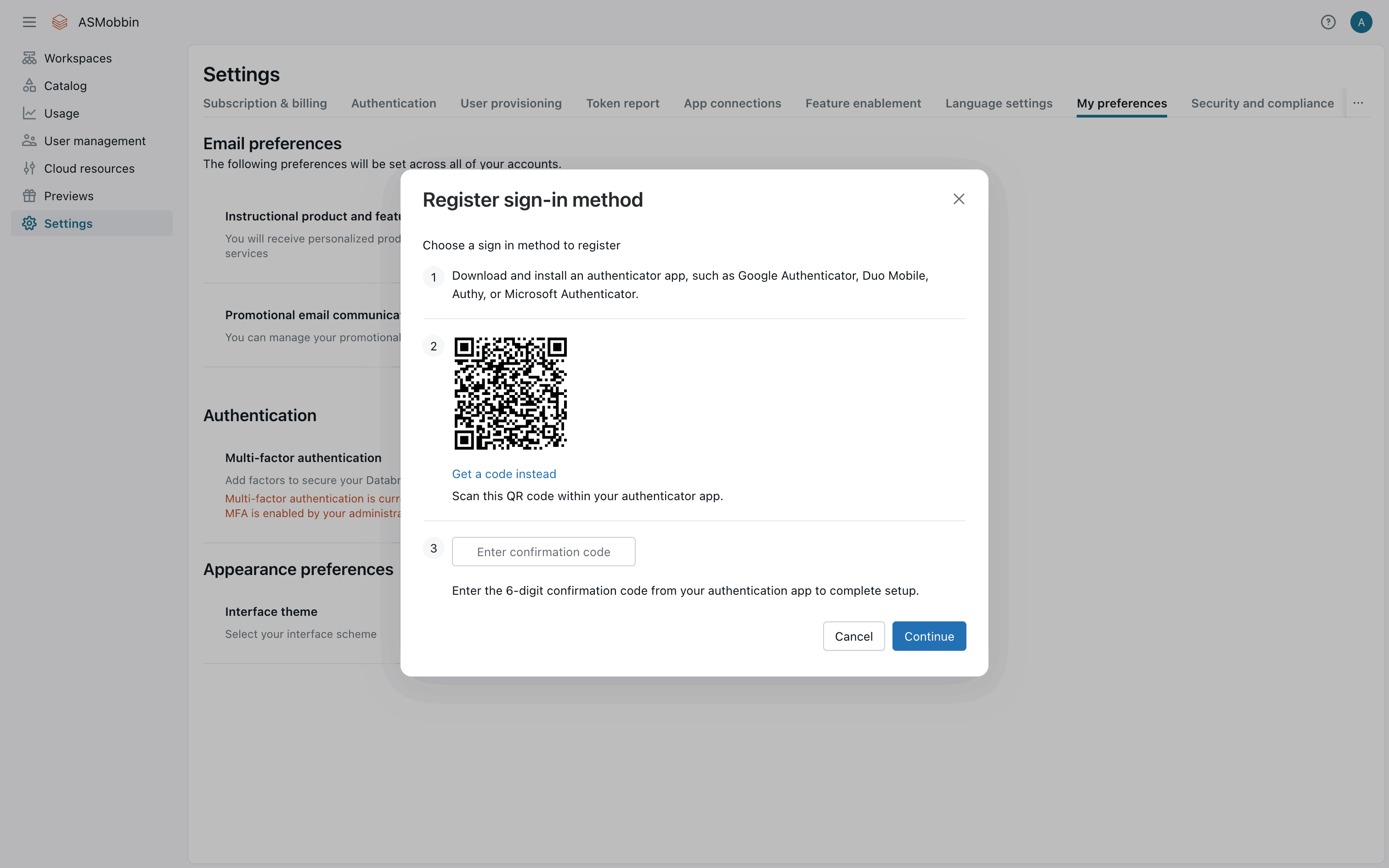 The user flow demonstrates setting up two-factor authentication using an authenticator app. It involves navigating to settings, selecting the authenticator app, and confirming the setup.