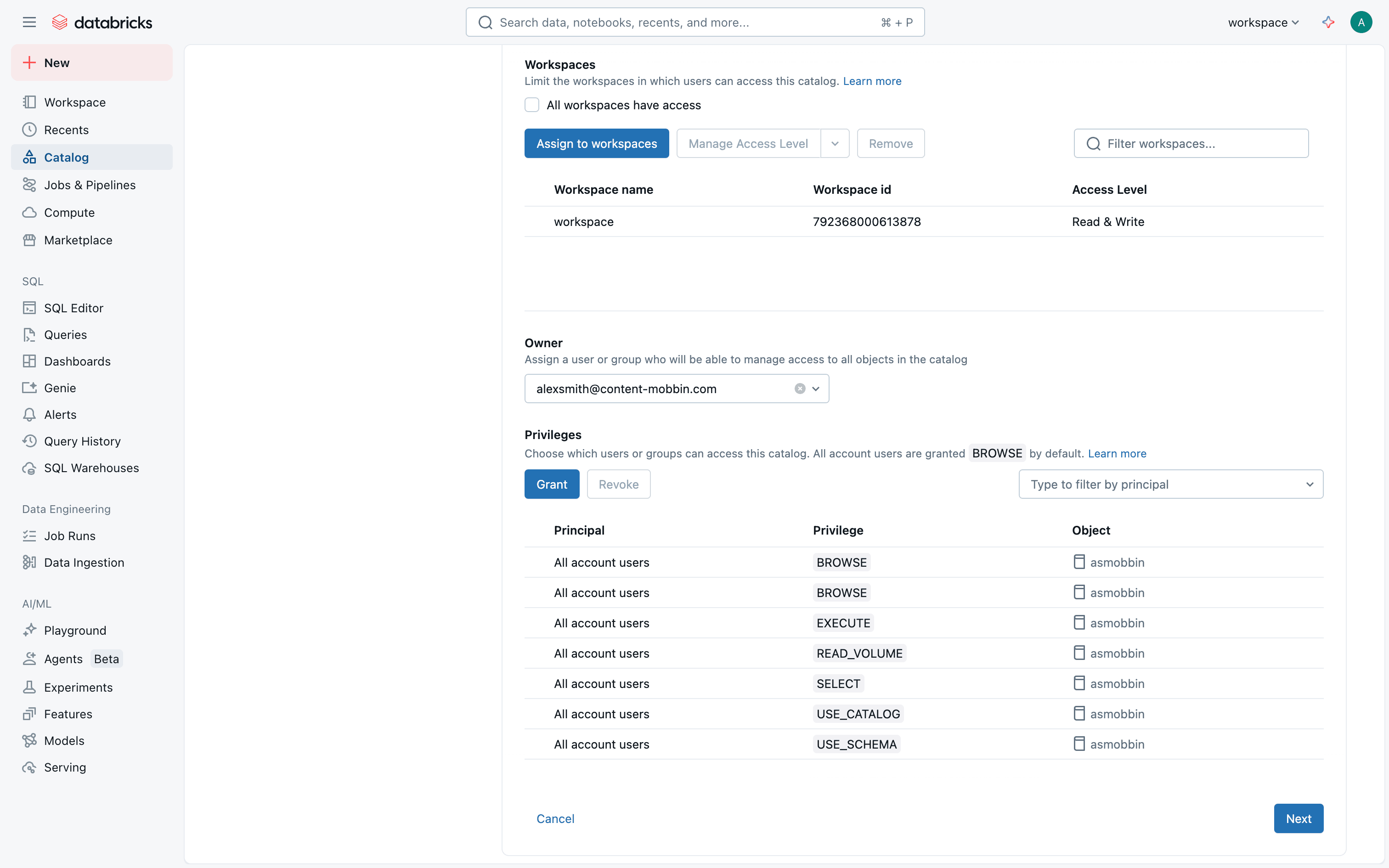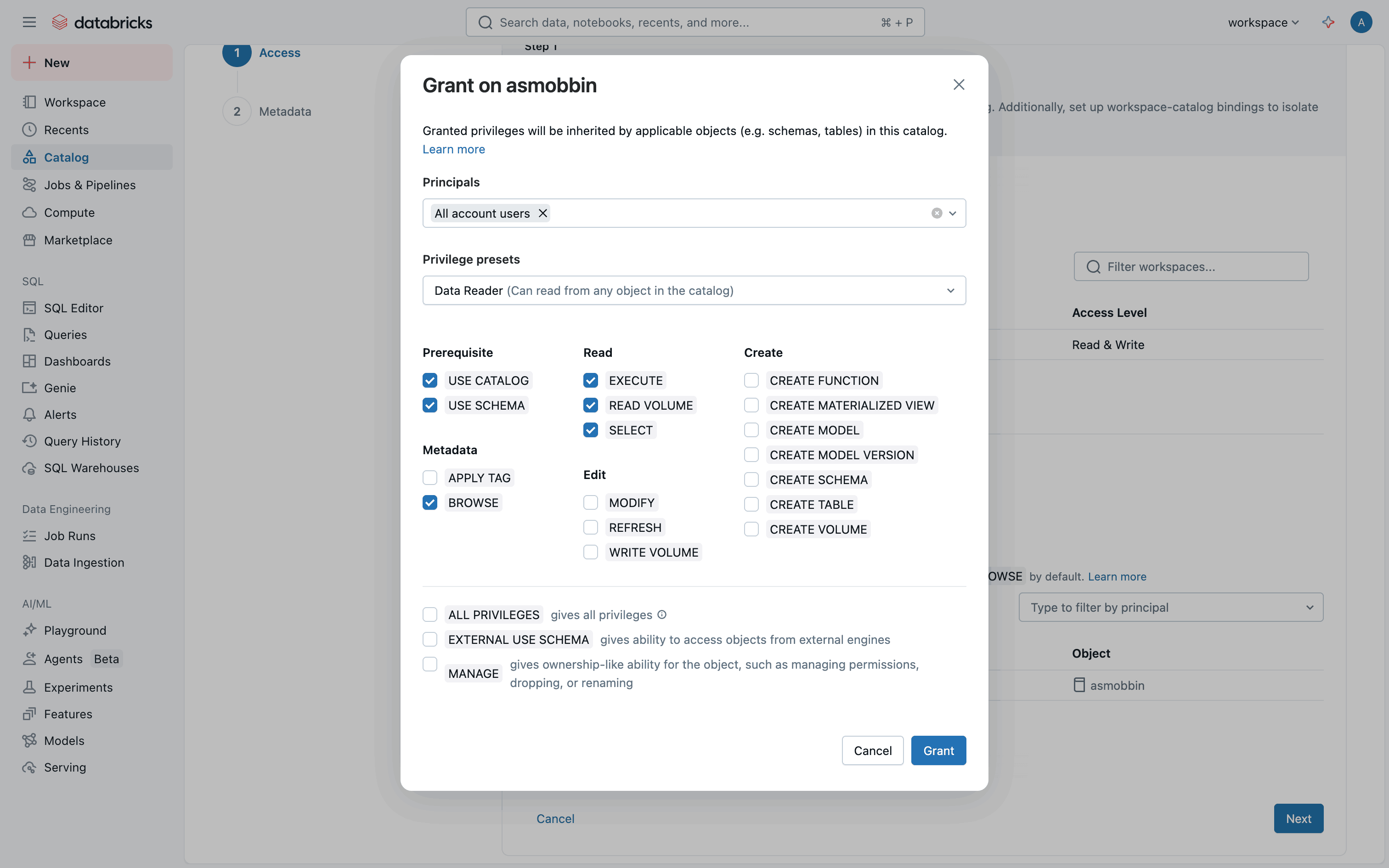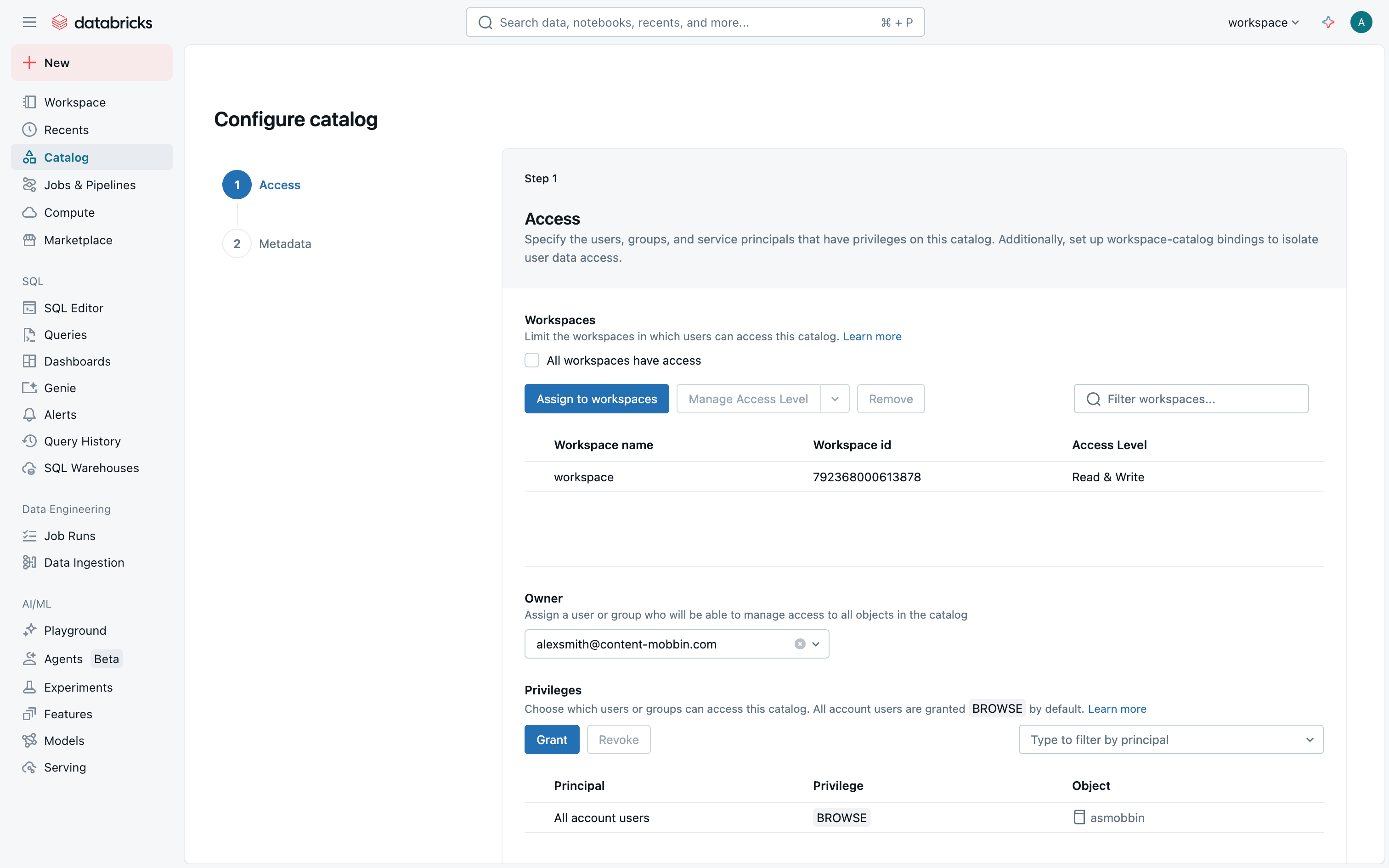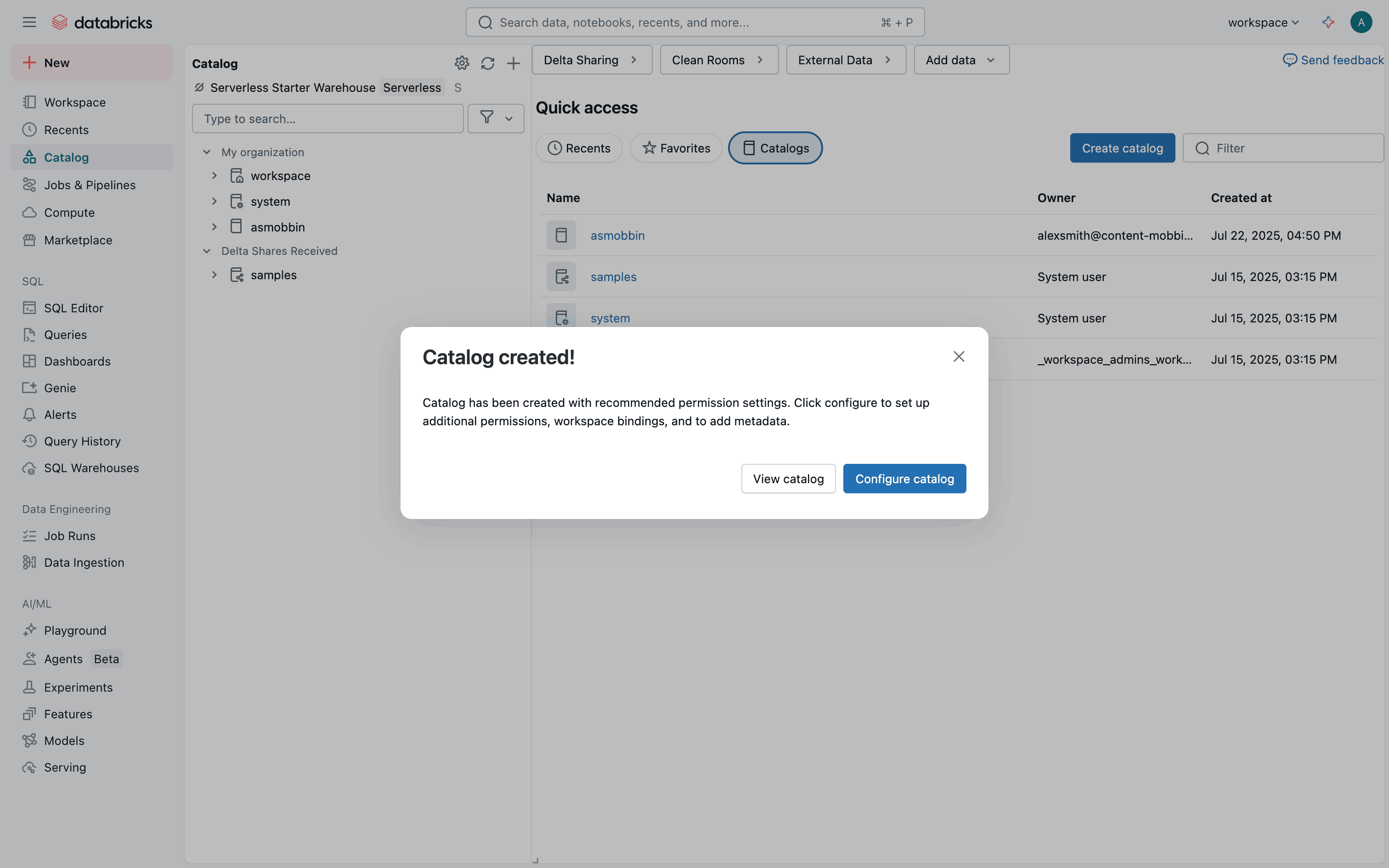 The user flow demonstrates setting up a catalog by configuring access permissions and metadata. It concludes with viewing the catalog in the catalog explorer.
