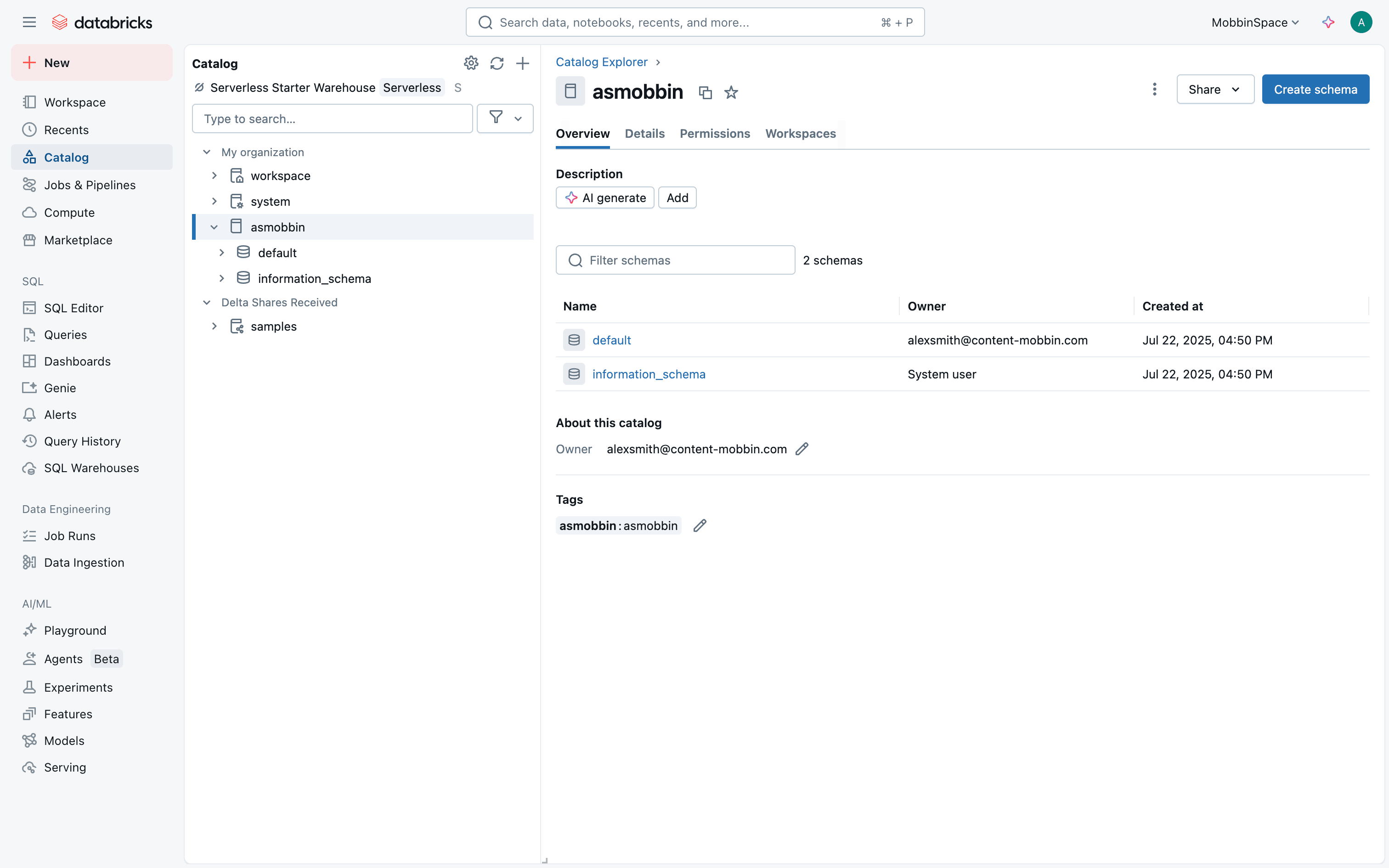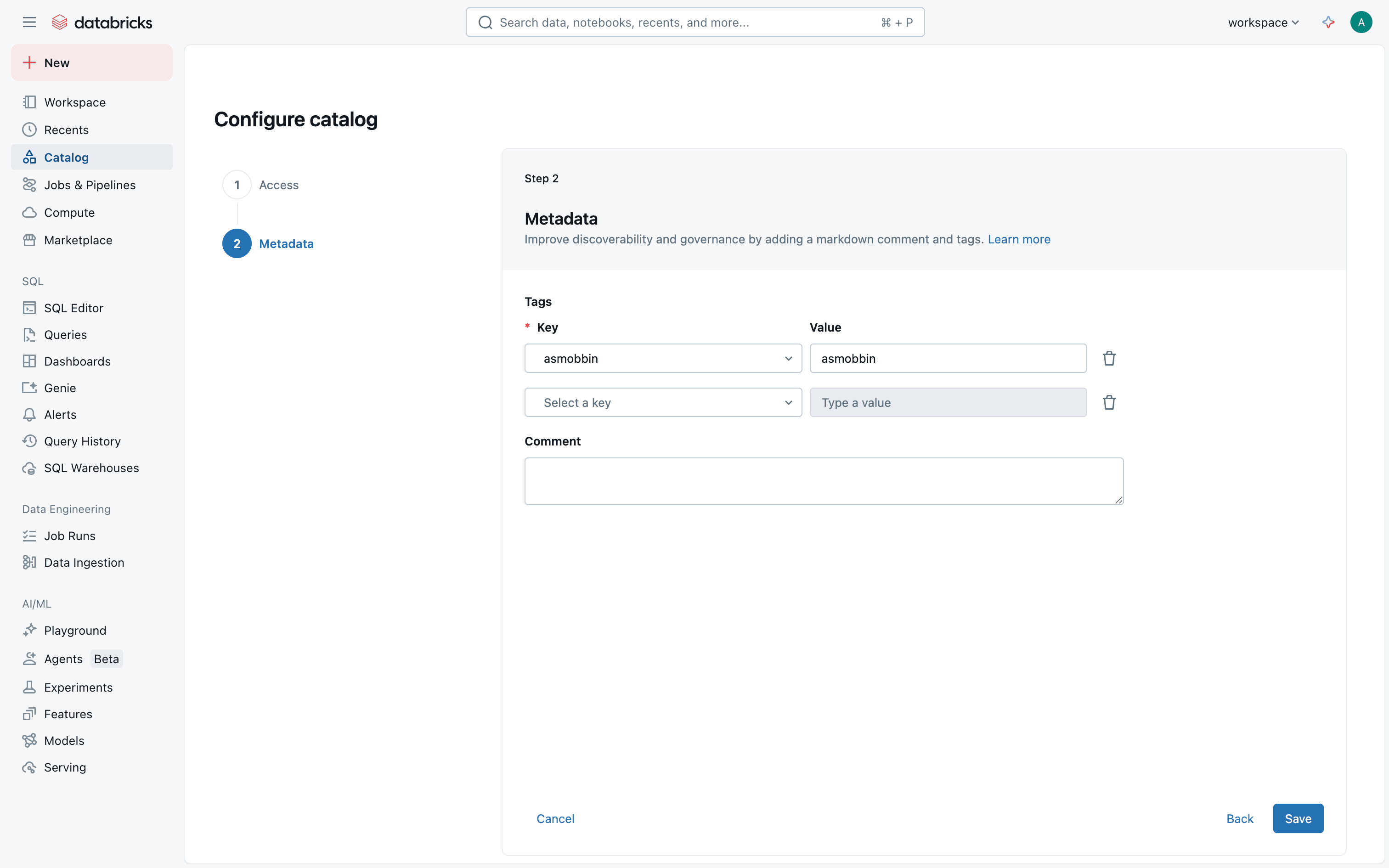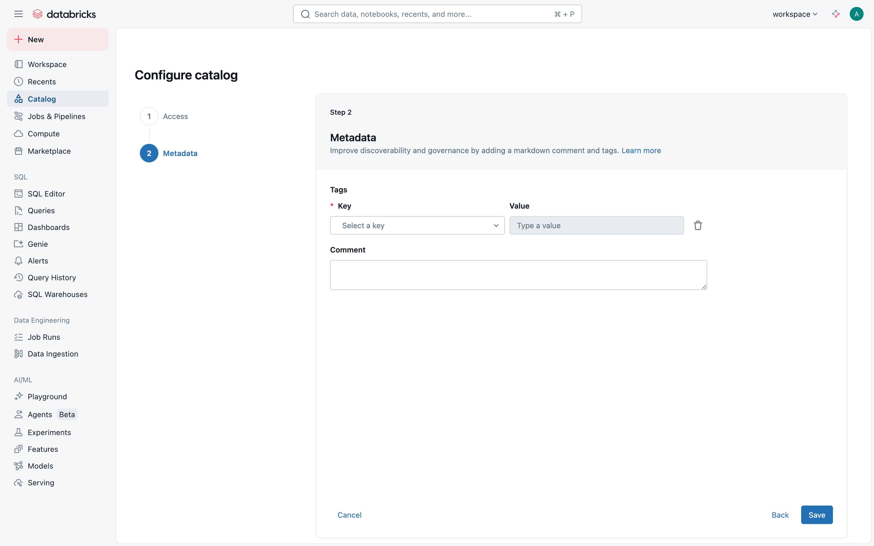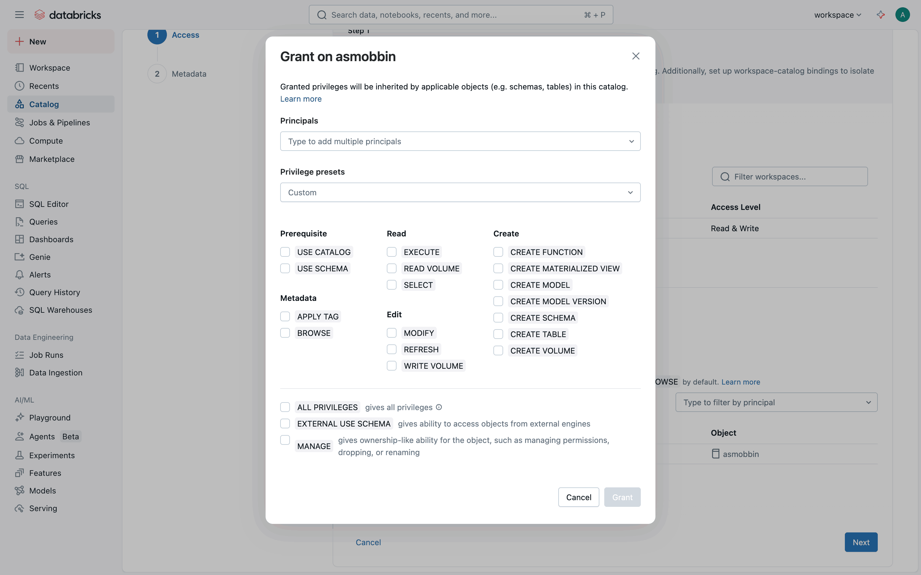 The user flow demonstrates setting up a catalog by configuring access permissions and metadata. It concludes with viewing the catalog in the catalog explorer.