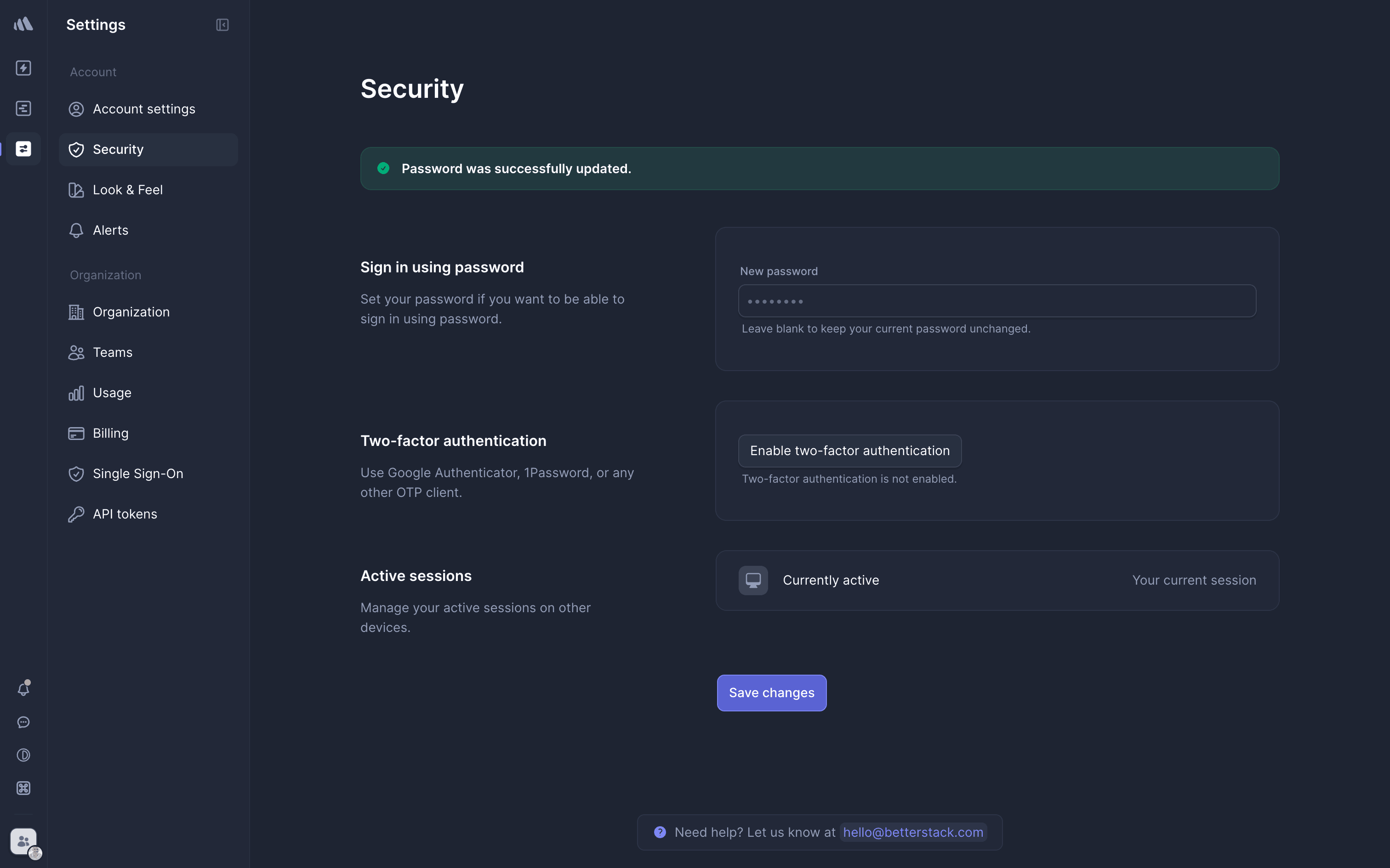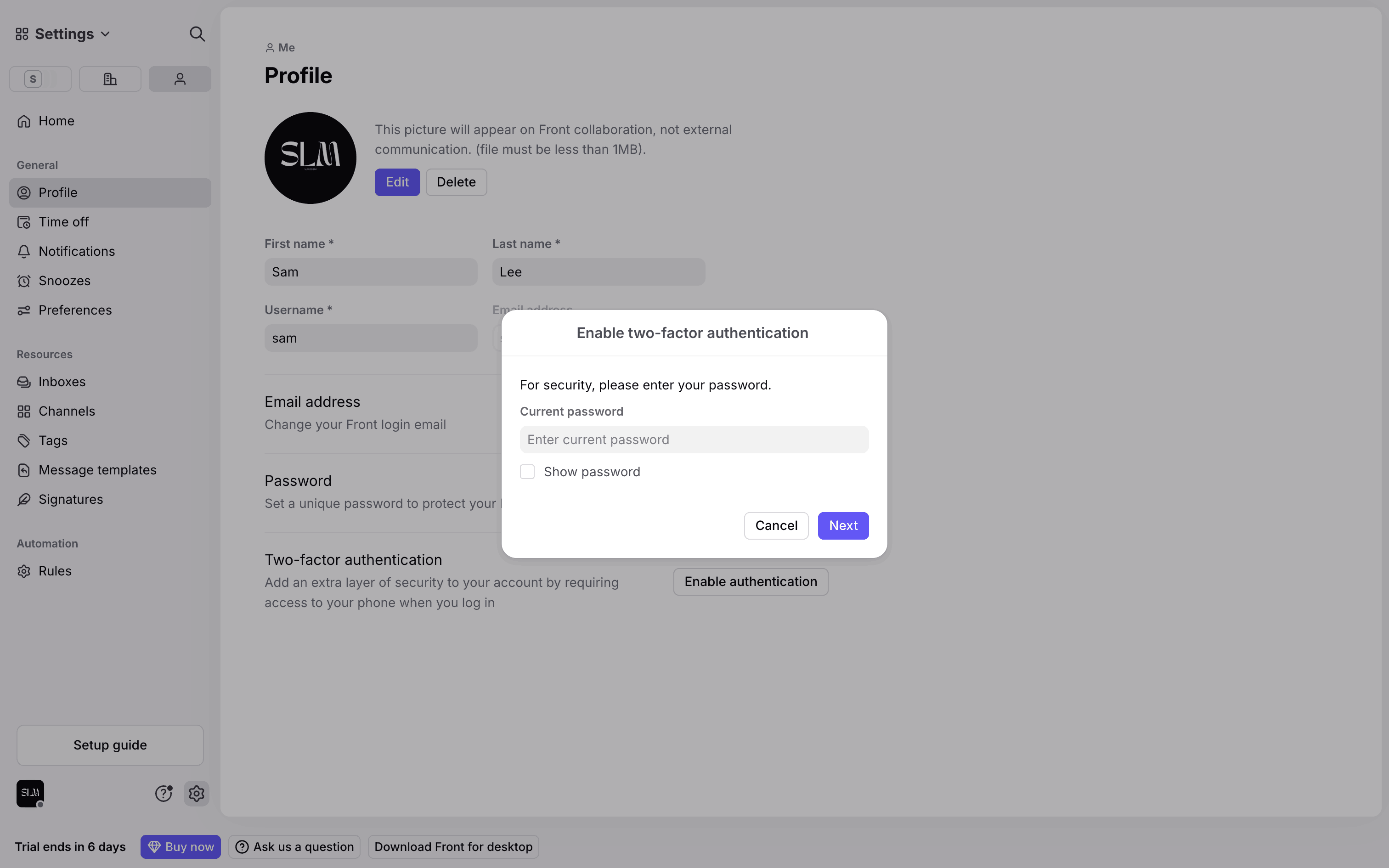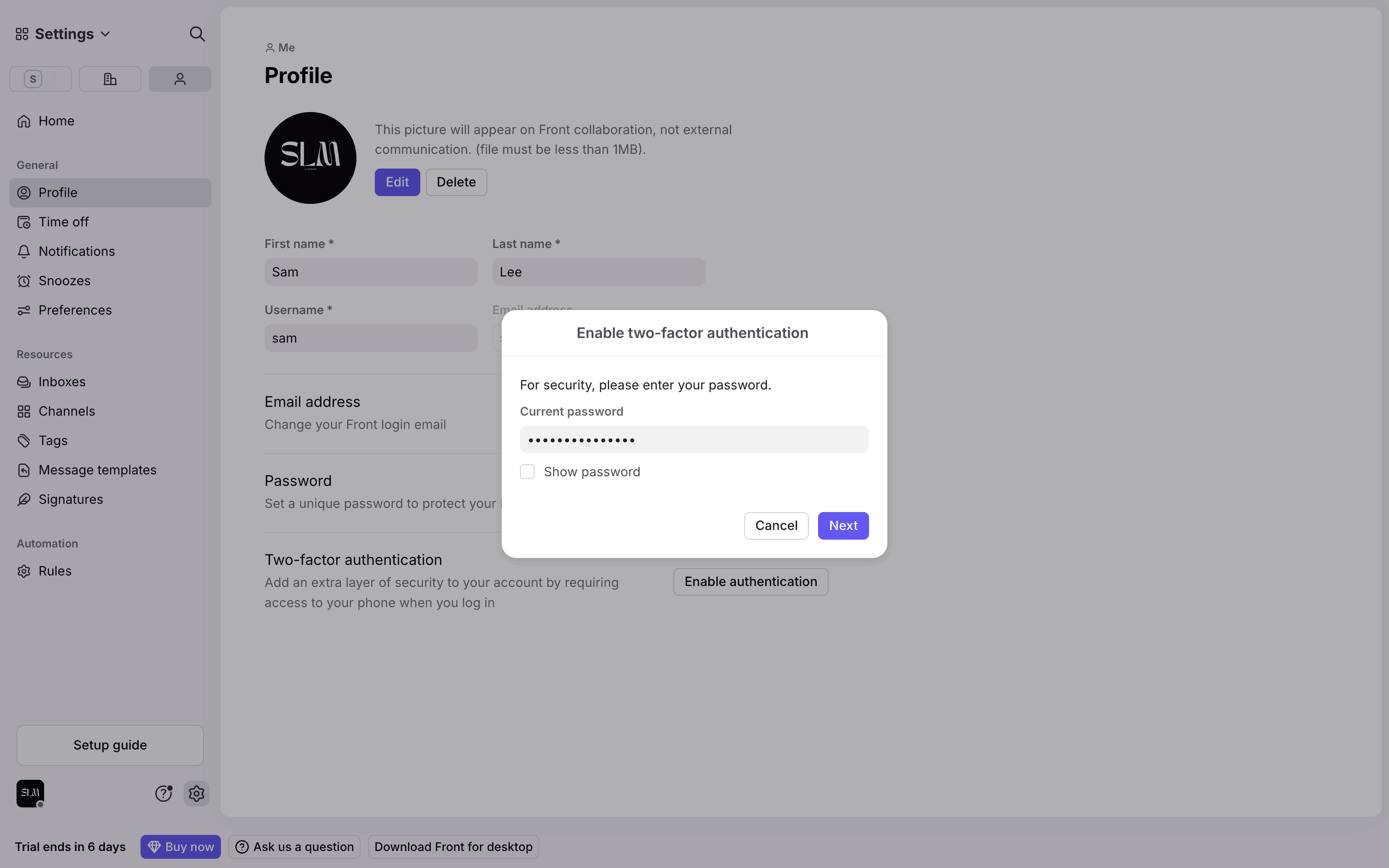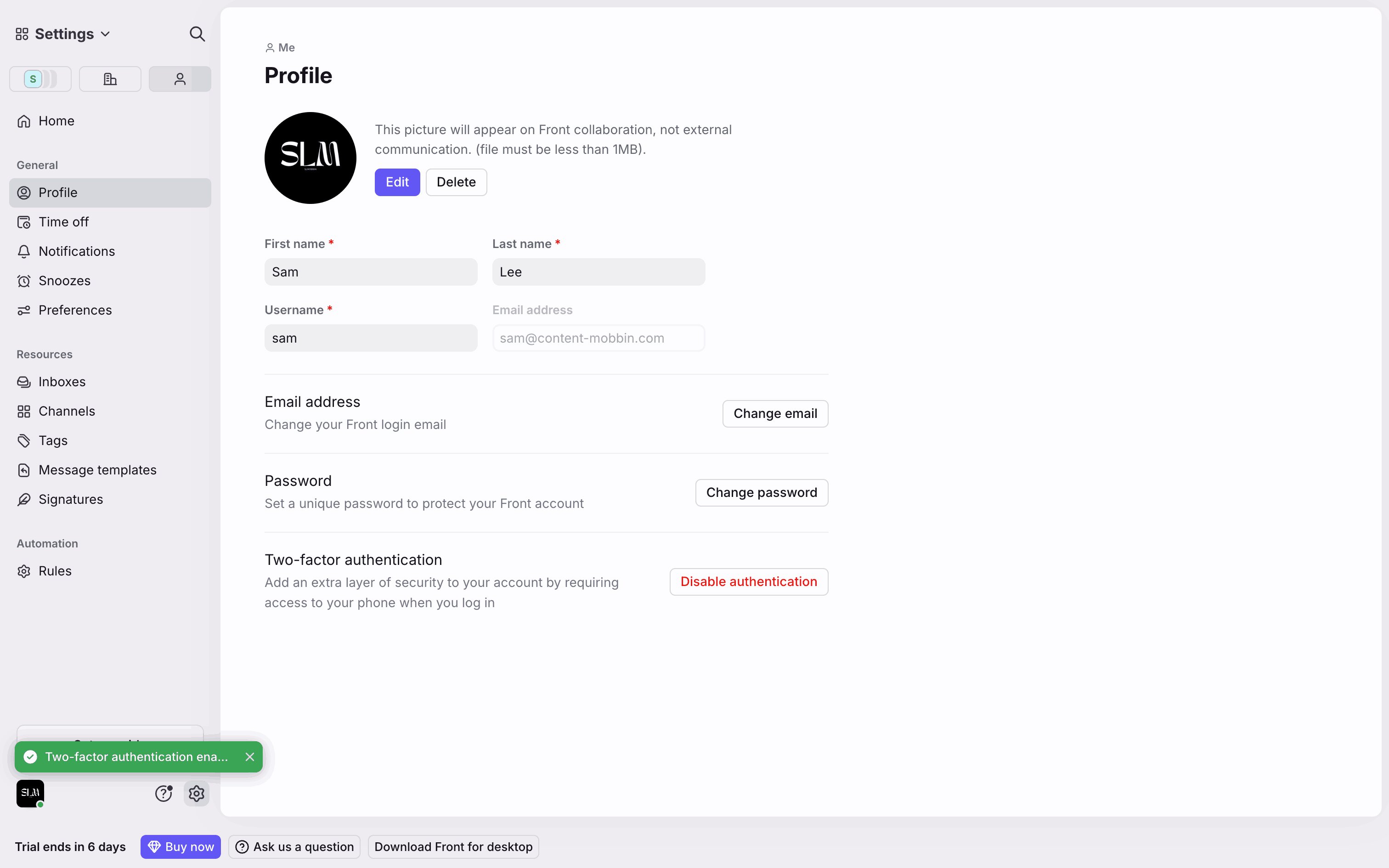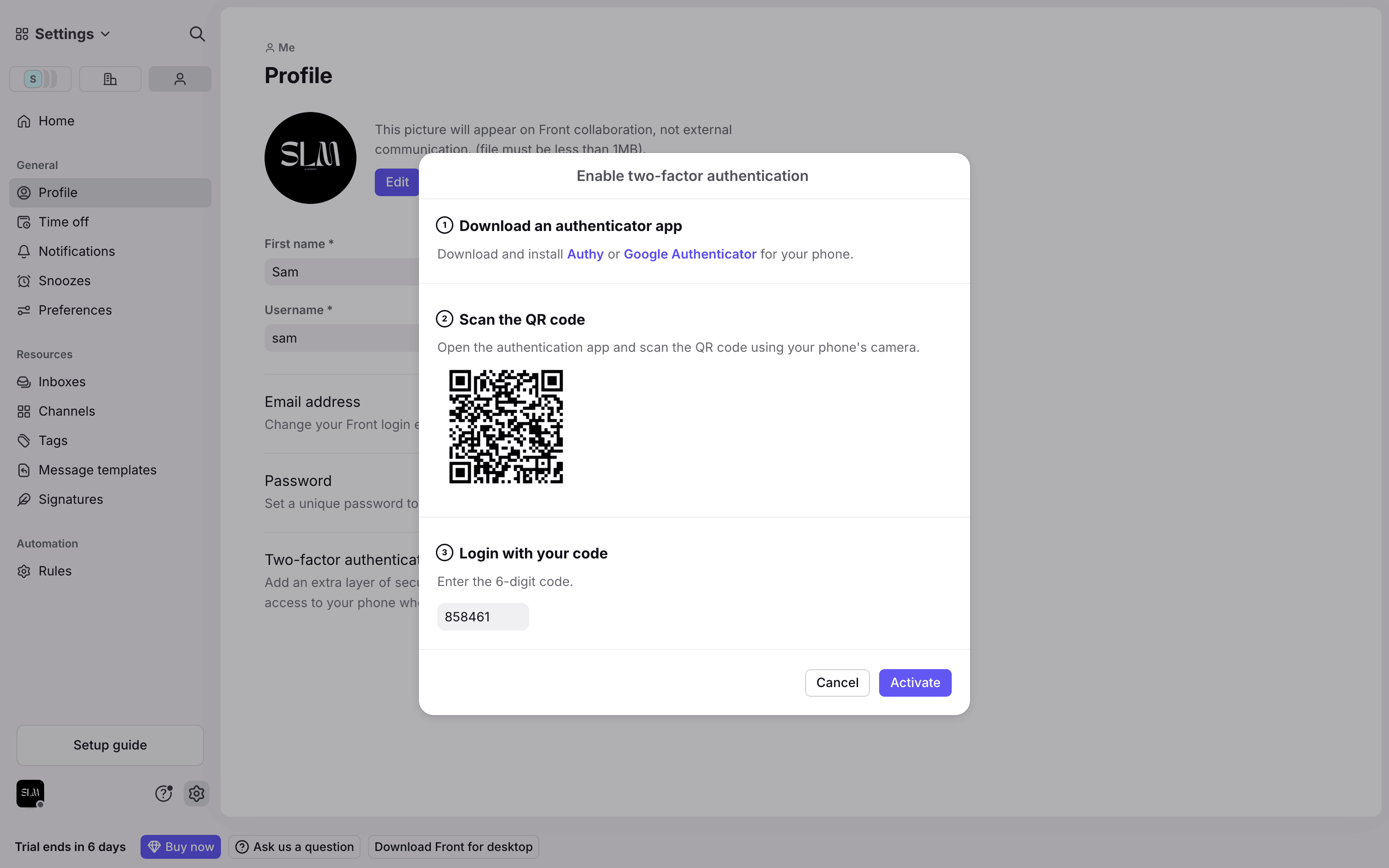 The user enables two-factor authentication by scanning a QR code, entering an OTP, and confirming the setup. The flow concludes with a success message and the option to disable it.
