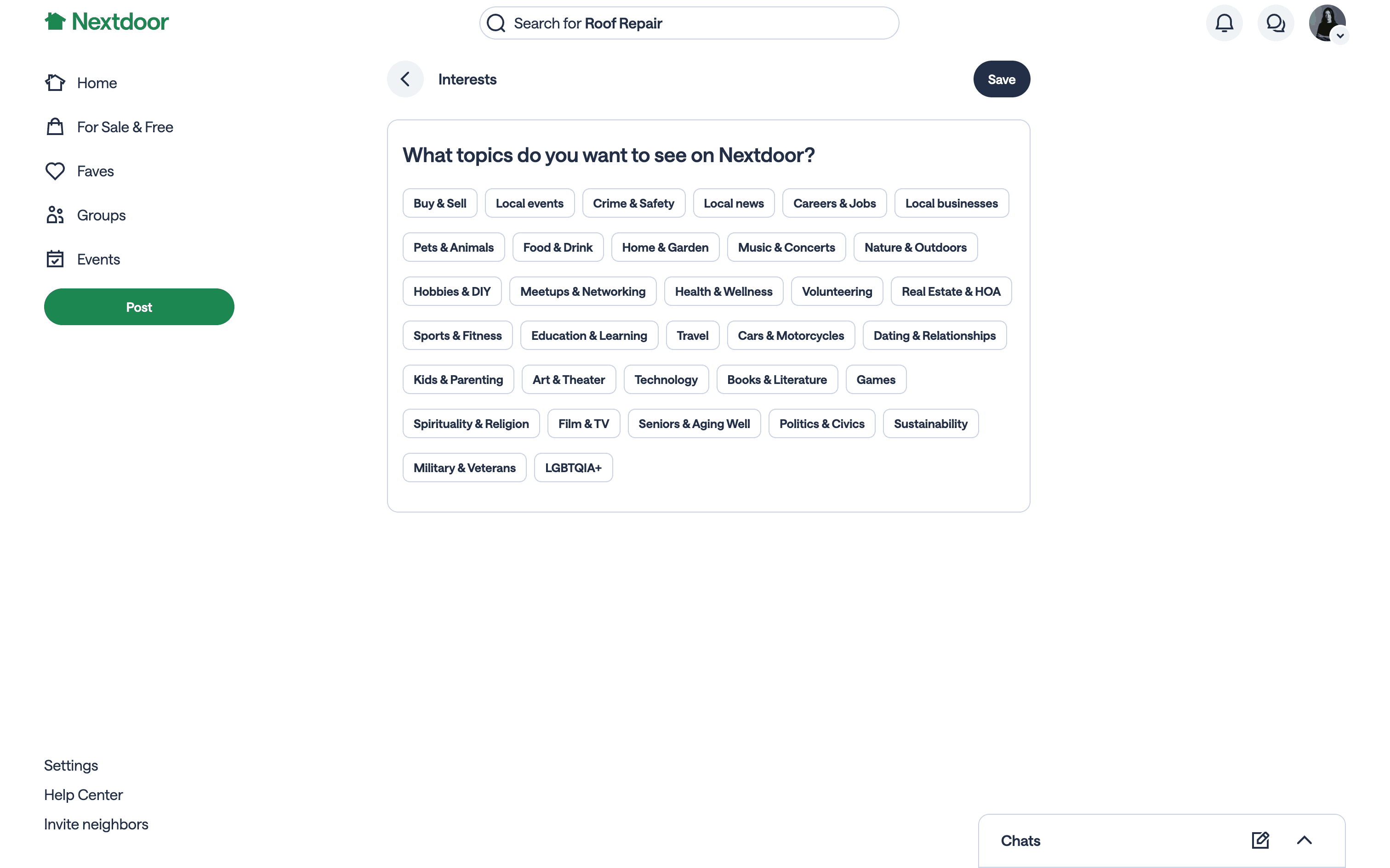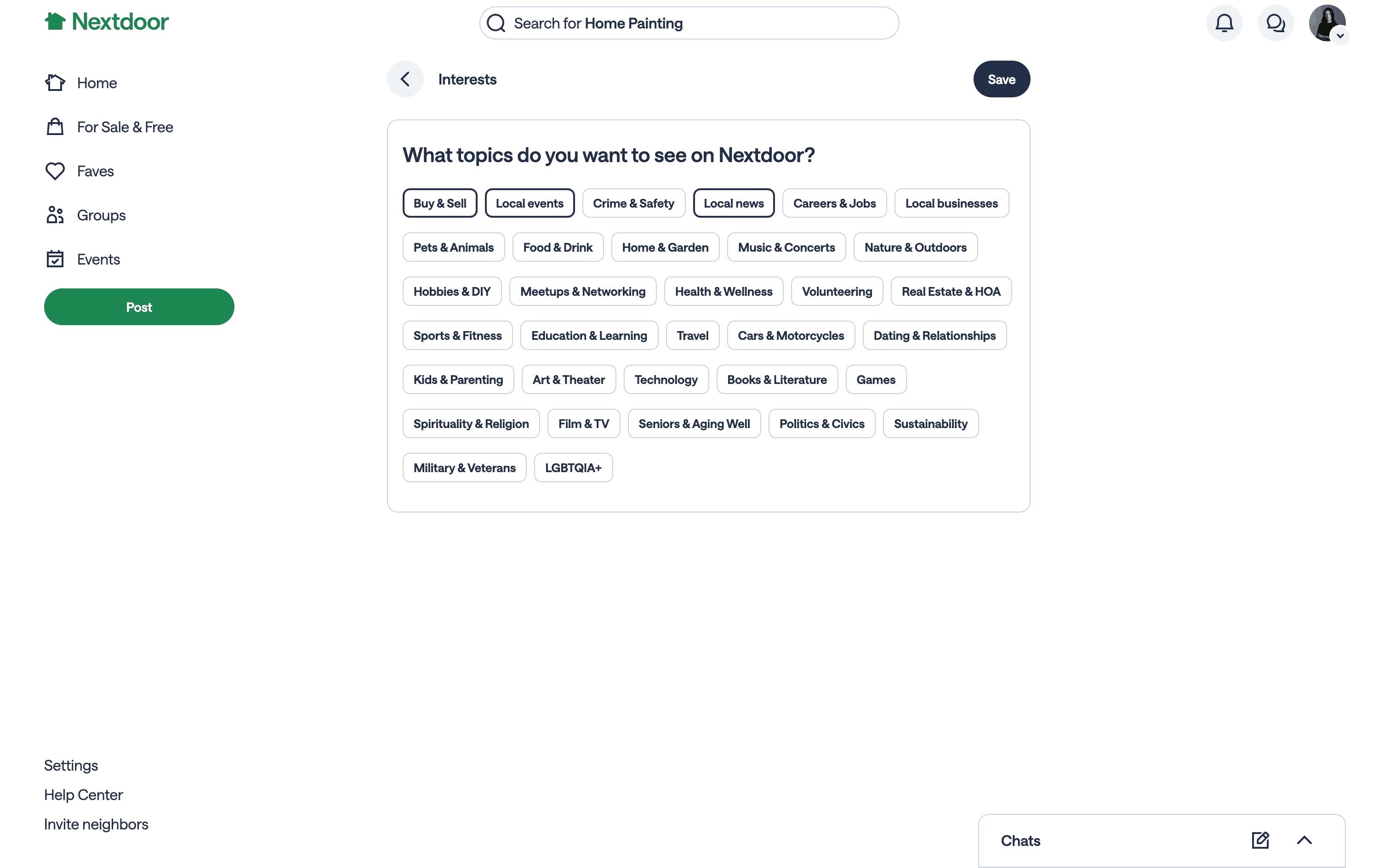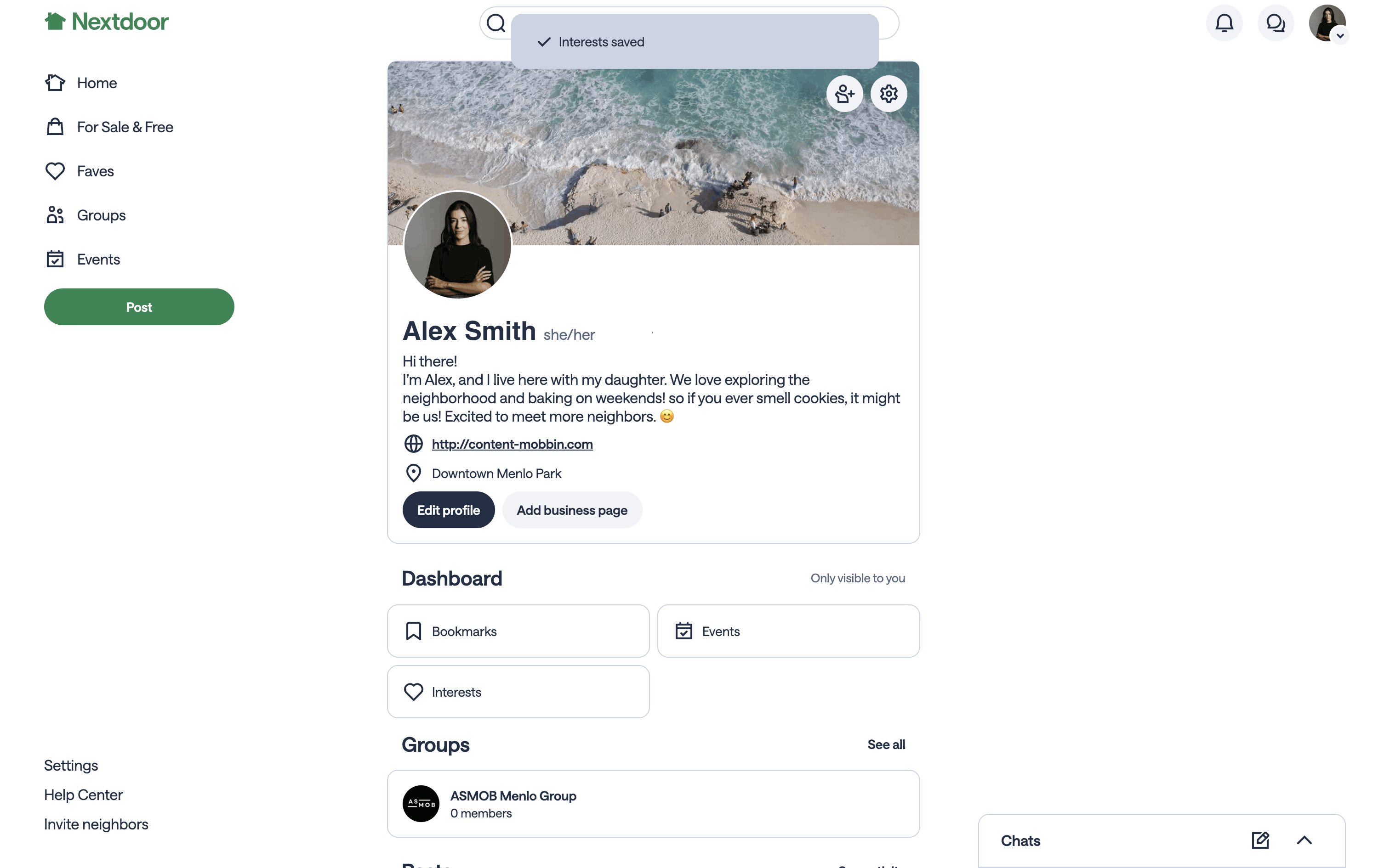 The user navigates from their dashboard to select and save their interests. The updated dashboard confirms the saved interests.