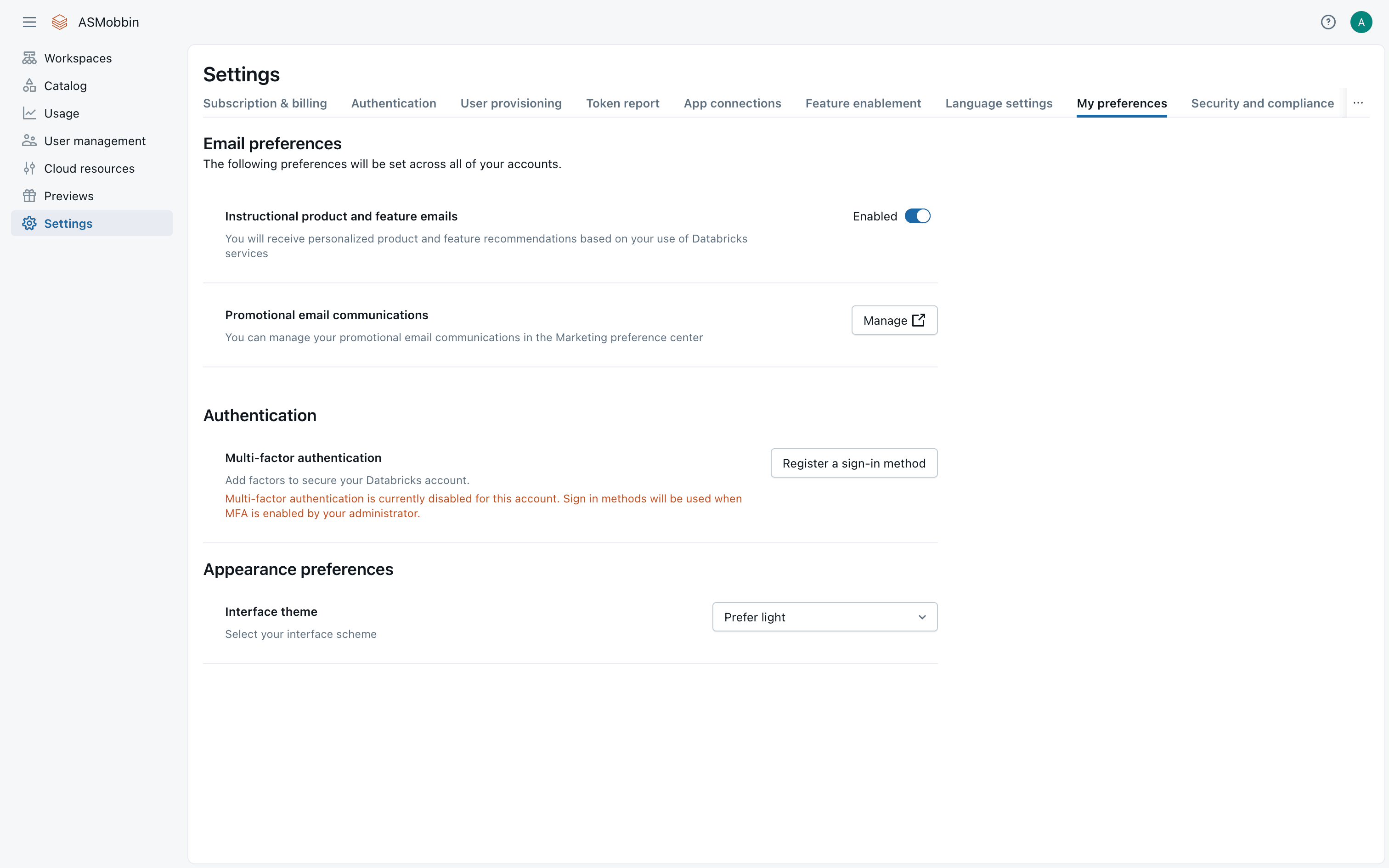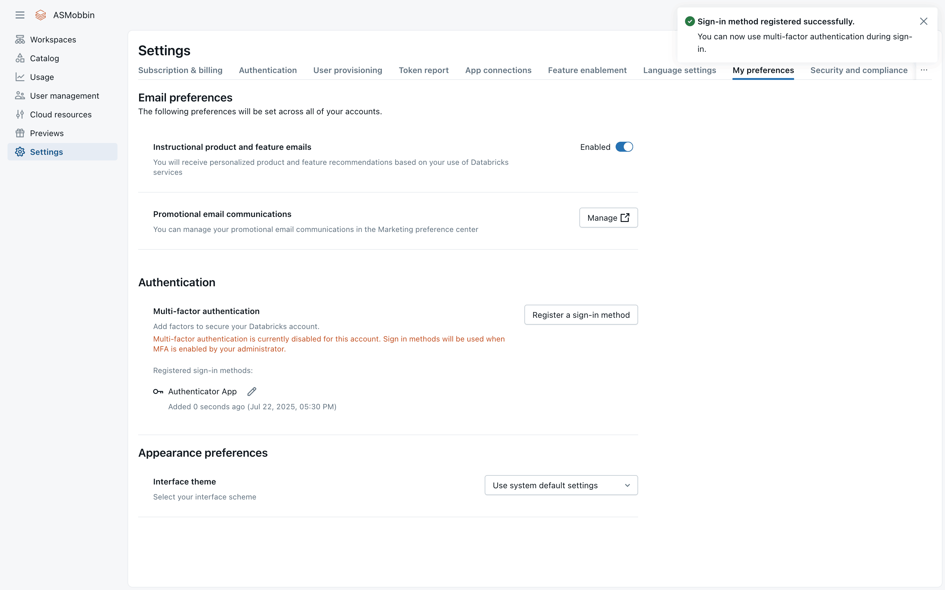 The user sets up a usage dashboard by selecting a workspace. A confirmation message appears with a link to the new dashboard.