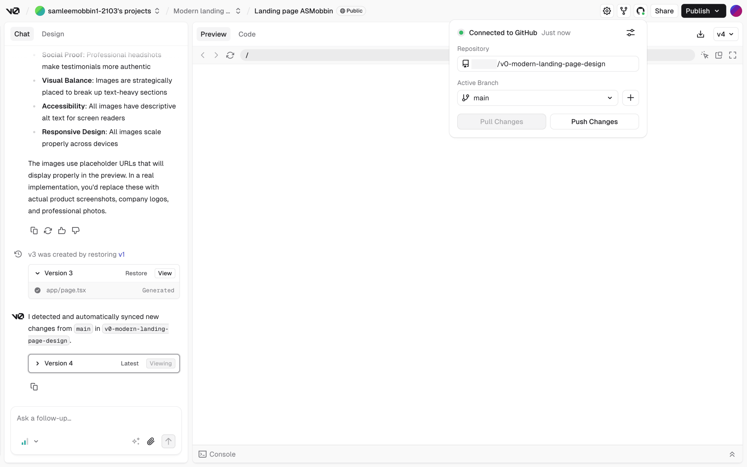The user flow involves selecting a branch for a project and connecting it to GitHub. The user can then pull or push changes.