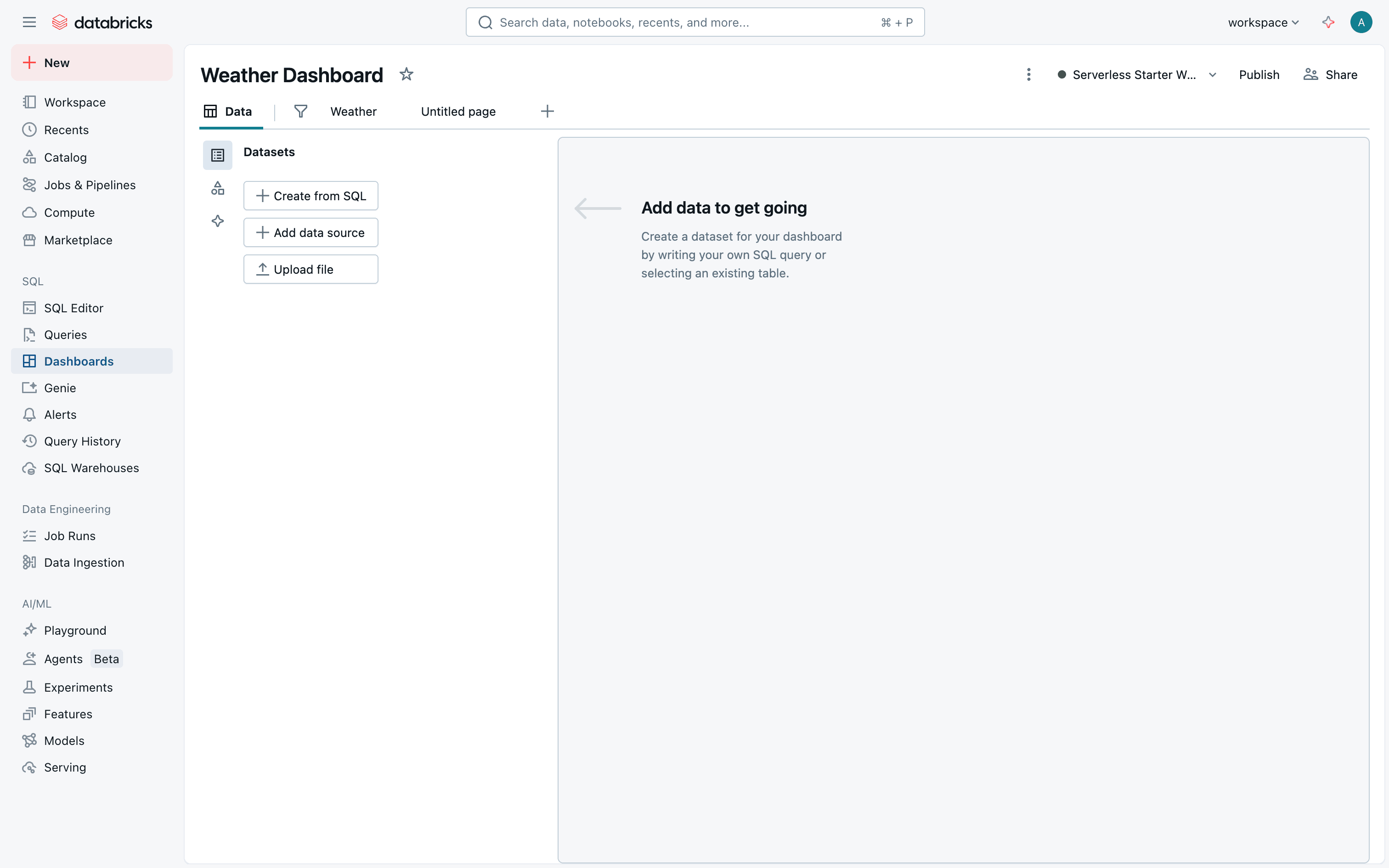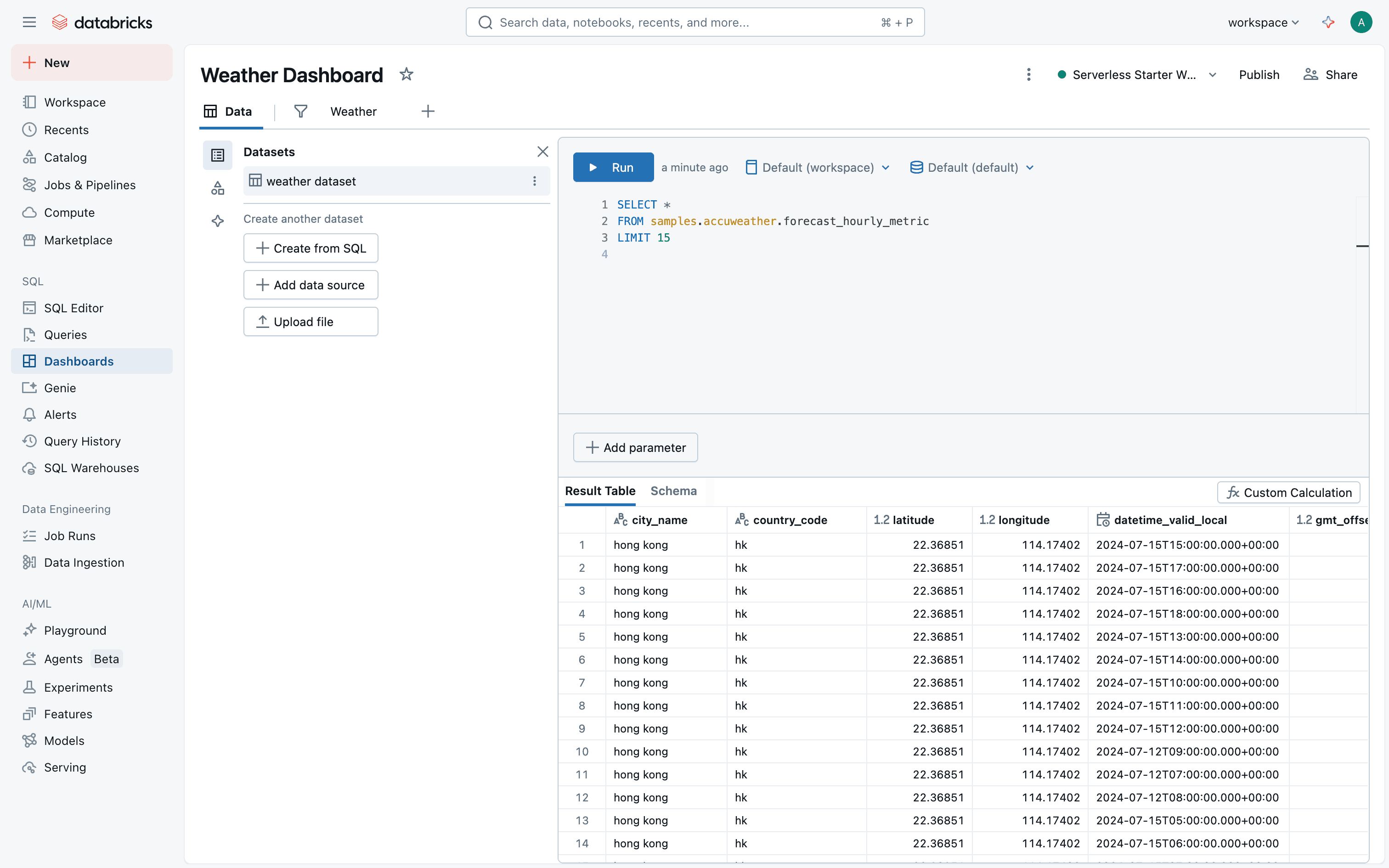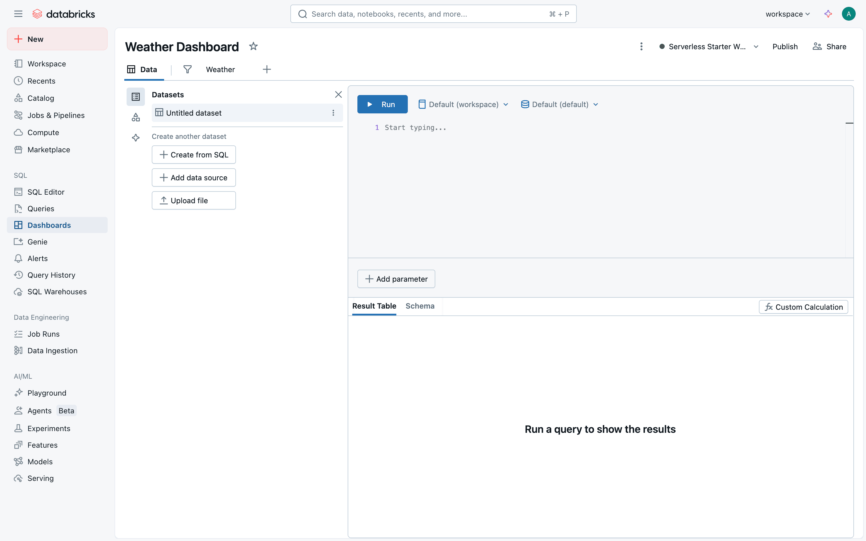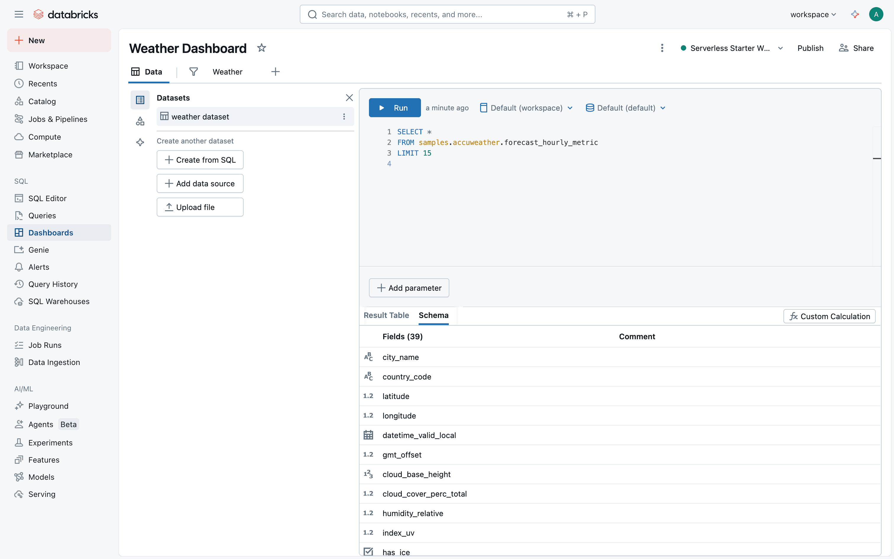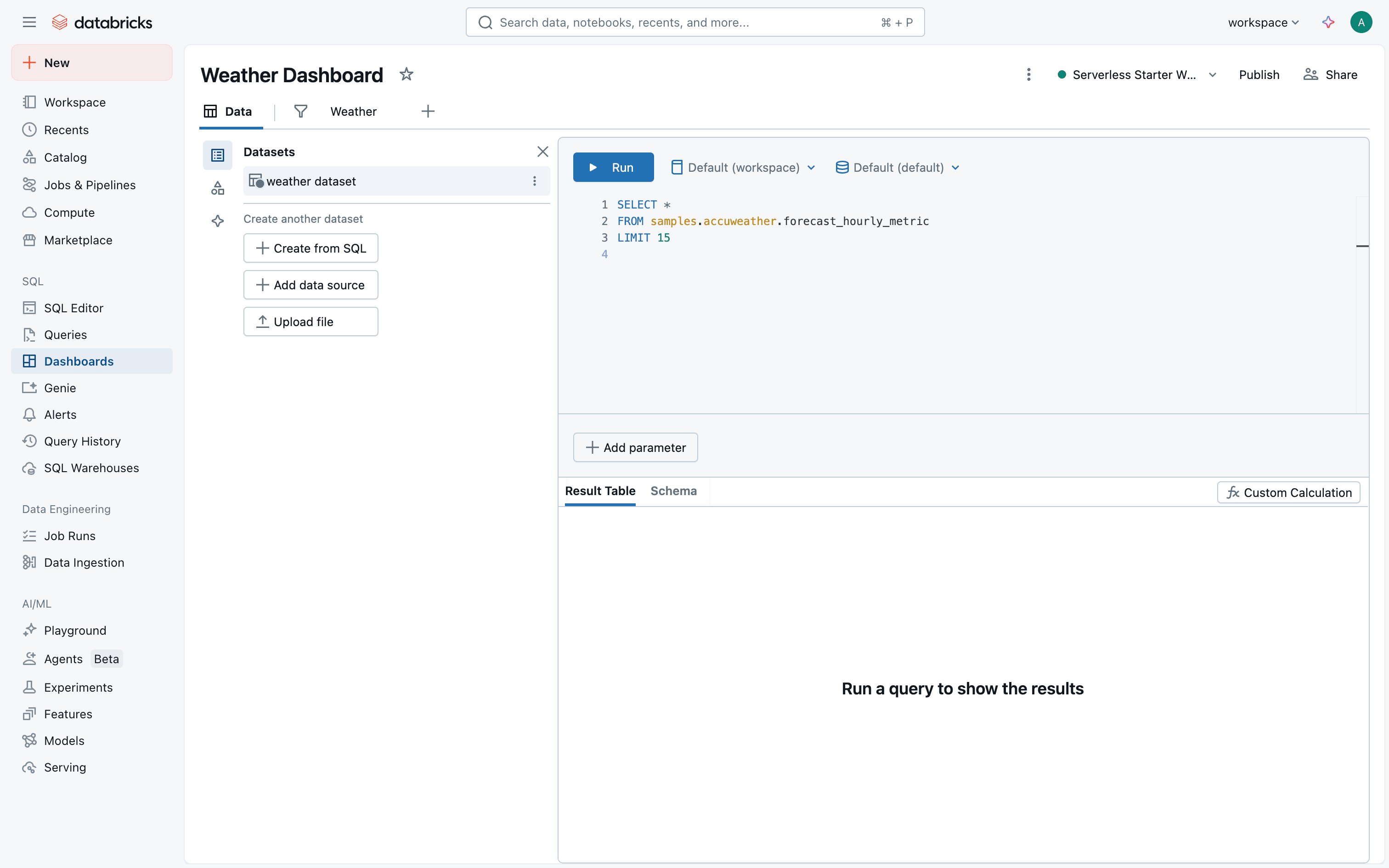 The user creates a dataset by writing a SQL query. They then view the results and schema of the query.