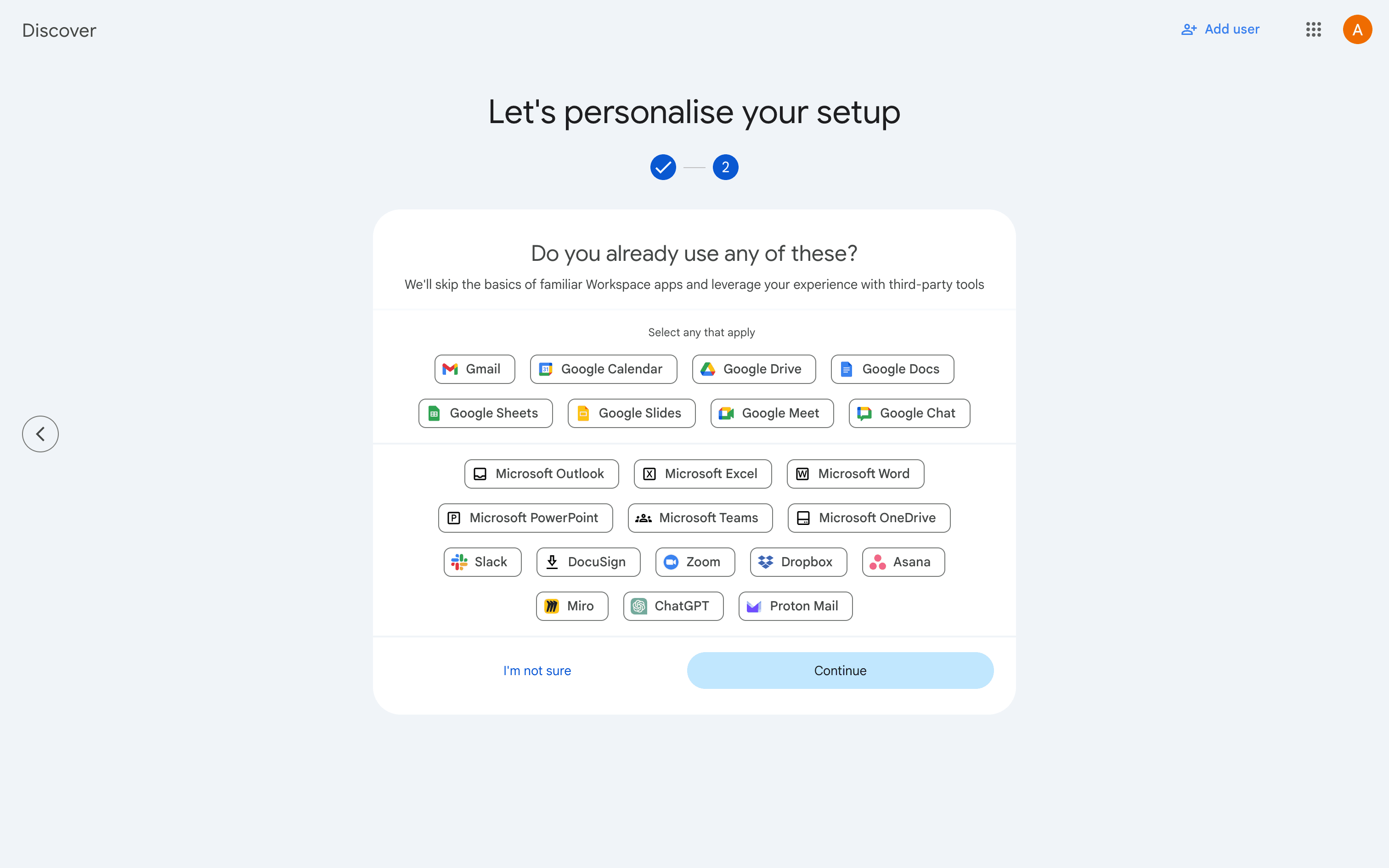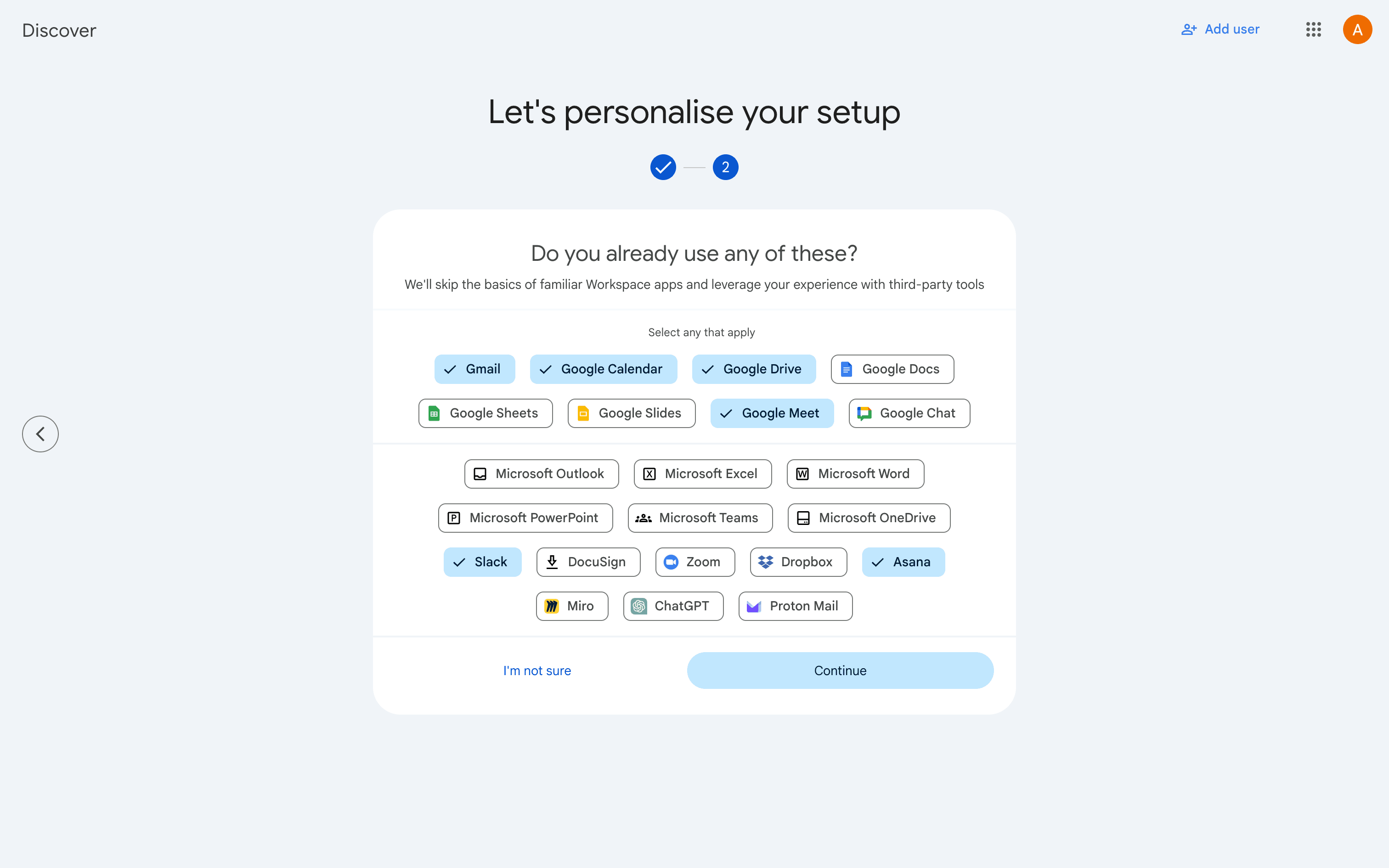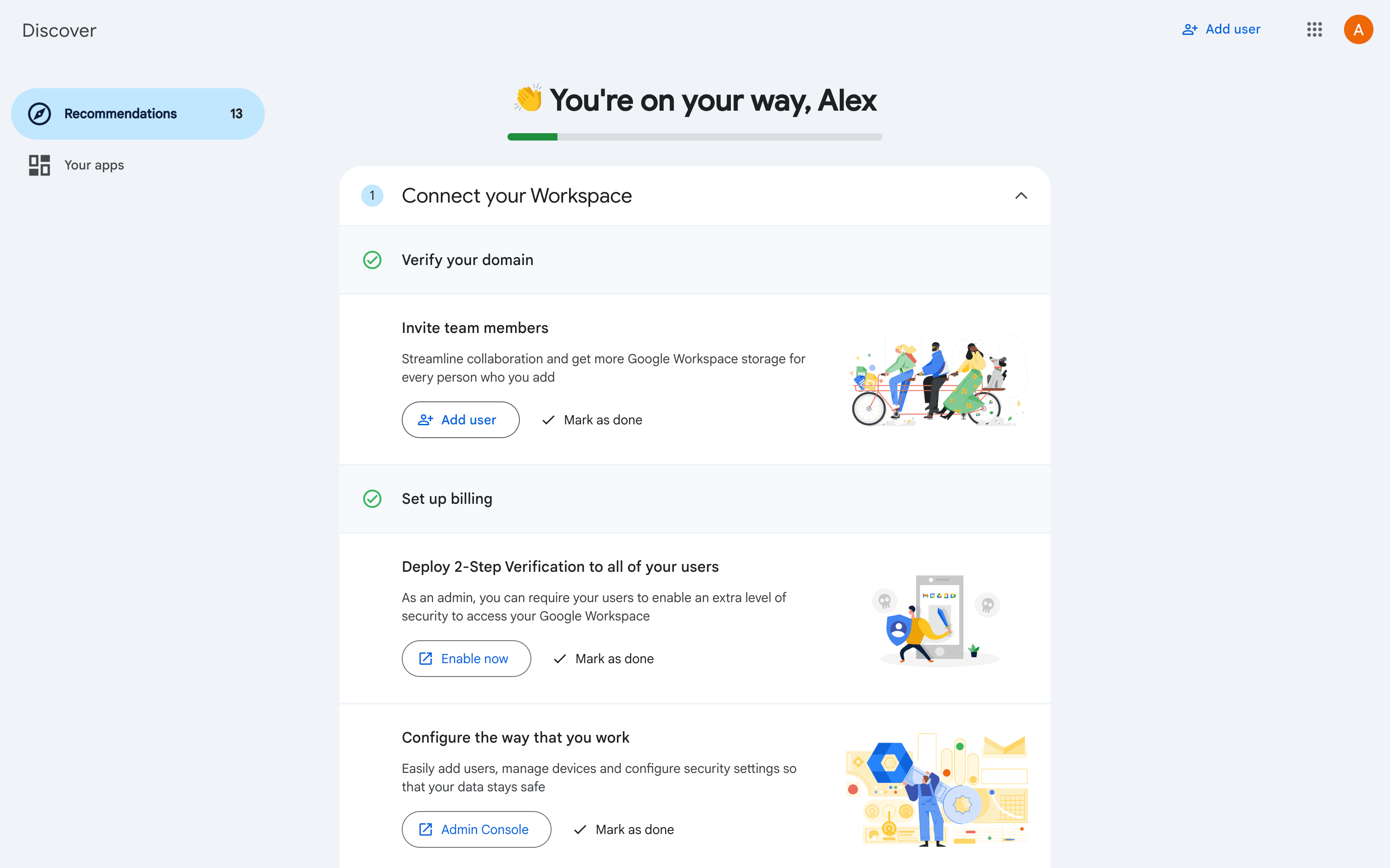 The user completes the initial setup, personalizes their workspace by selecting goals and apps, and views a progress page with remaining tasks. They then arrive at the application list.