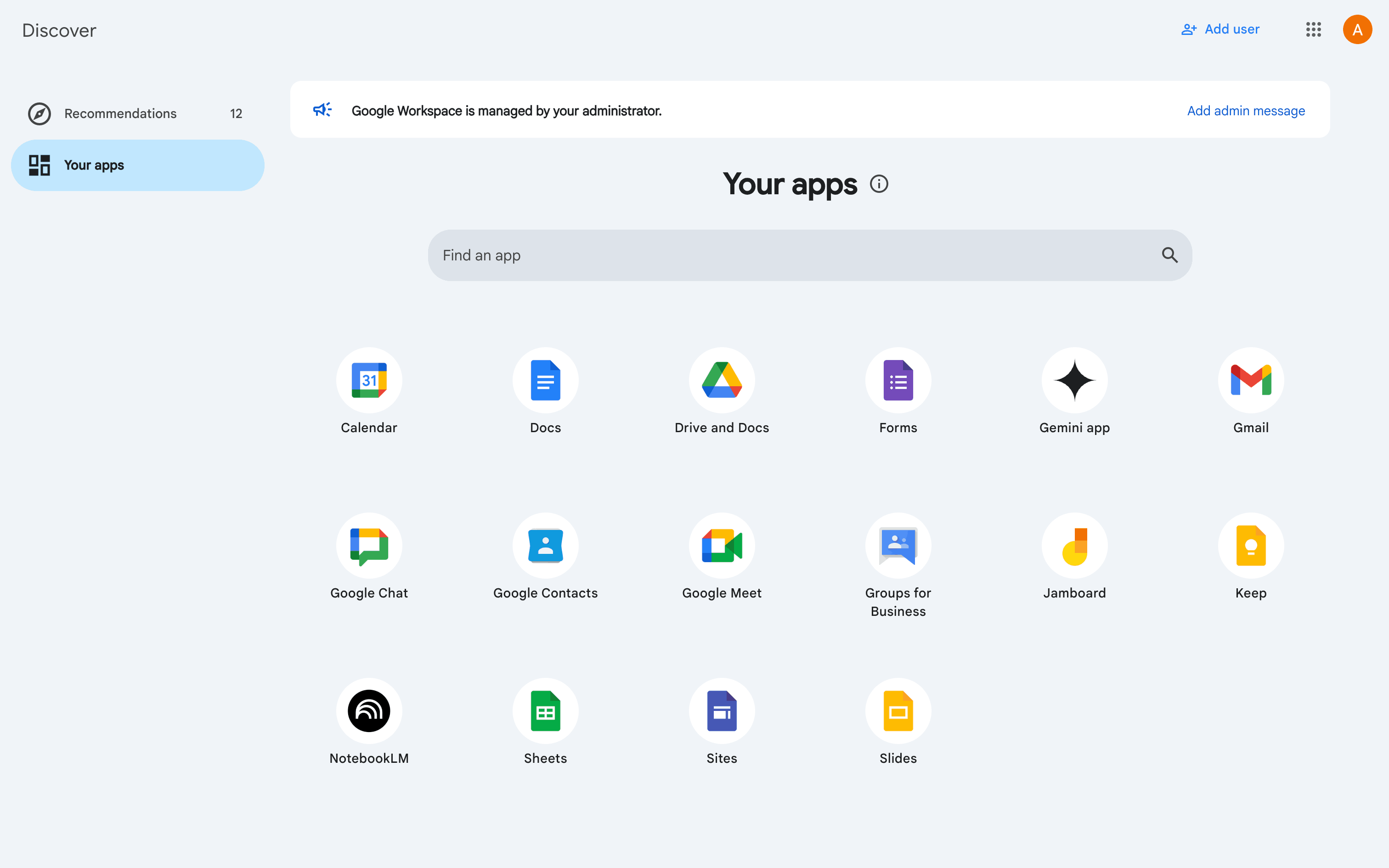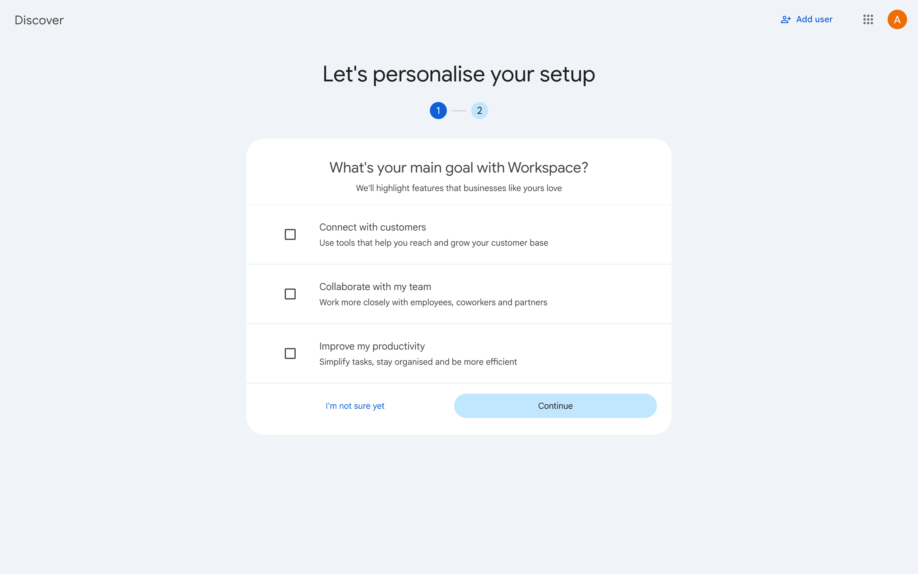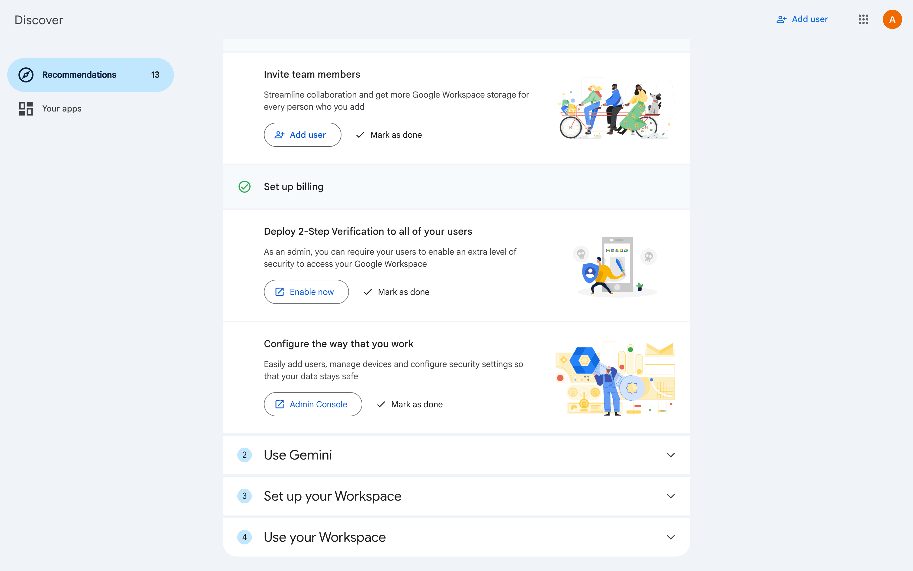 The user completes the initial setup, personalizes their workspace by selecting goals and apps, and views a progress page with remaining tasks. They then arrive at the application list.