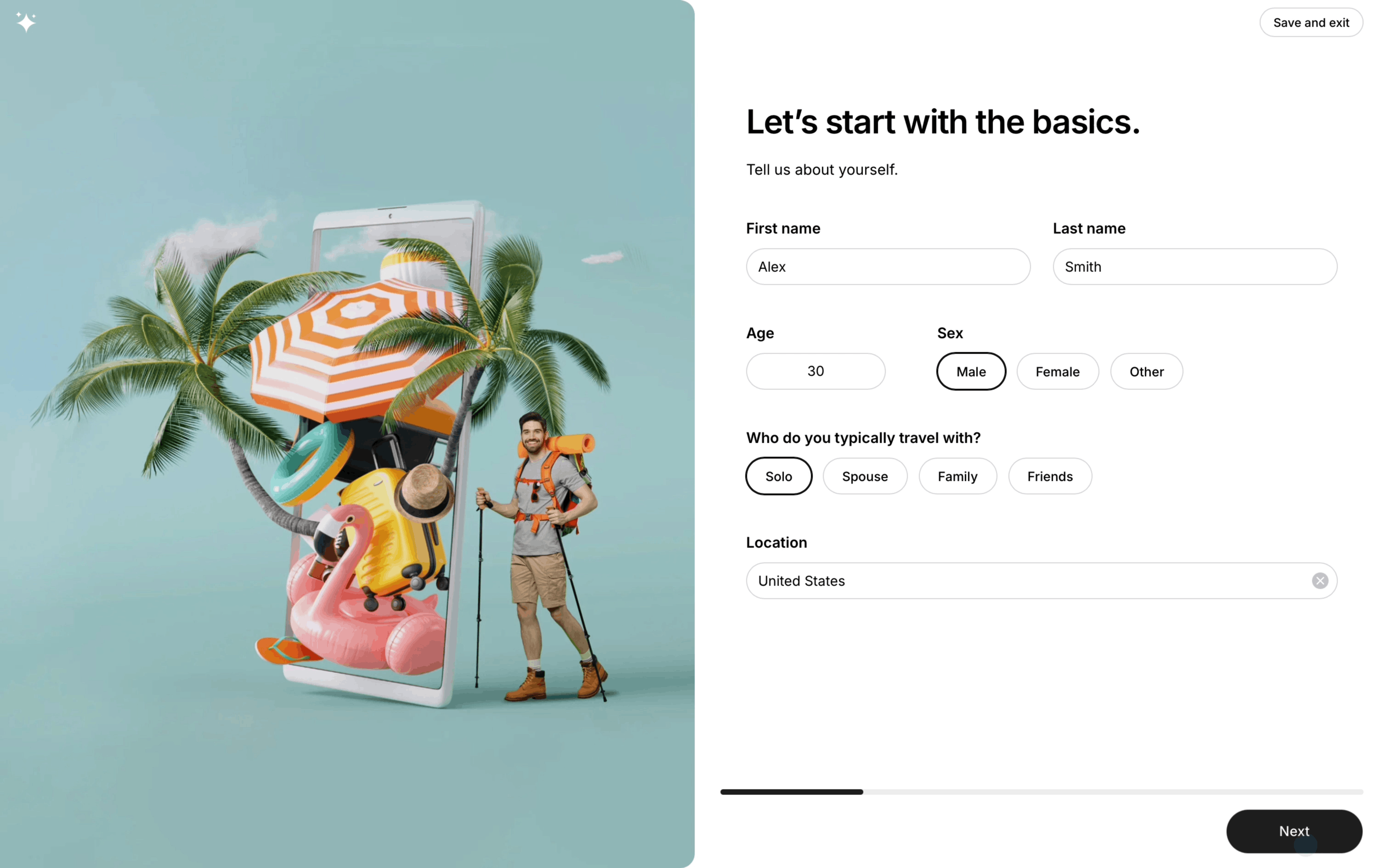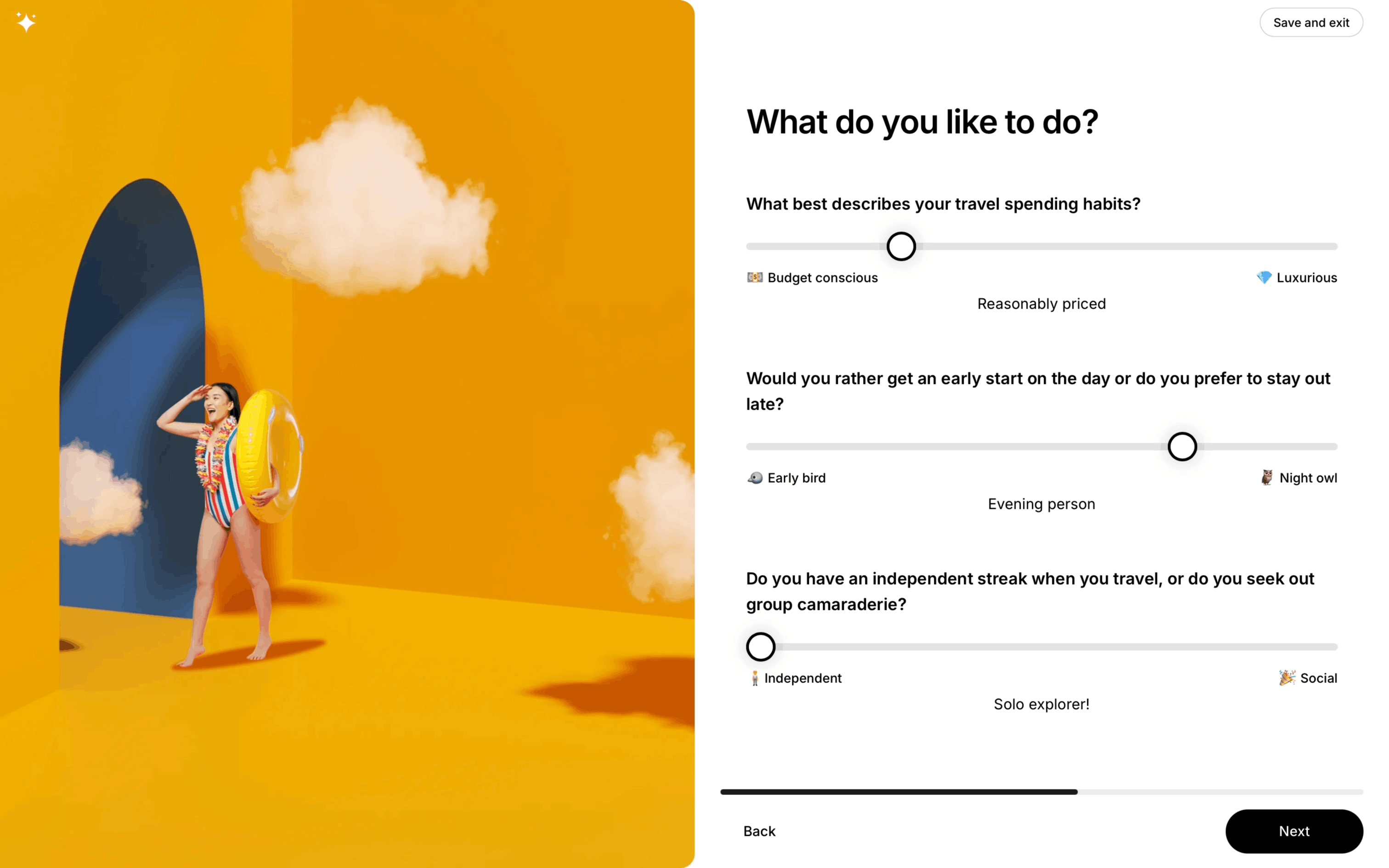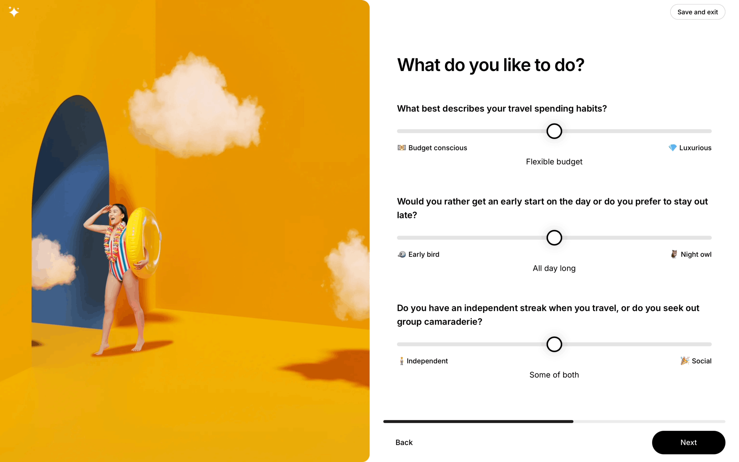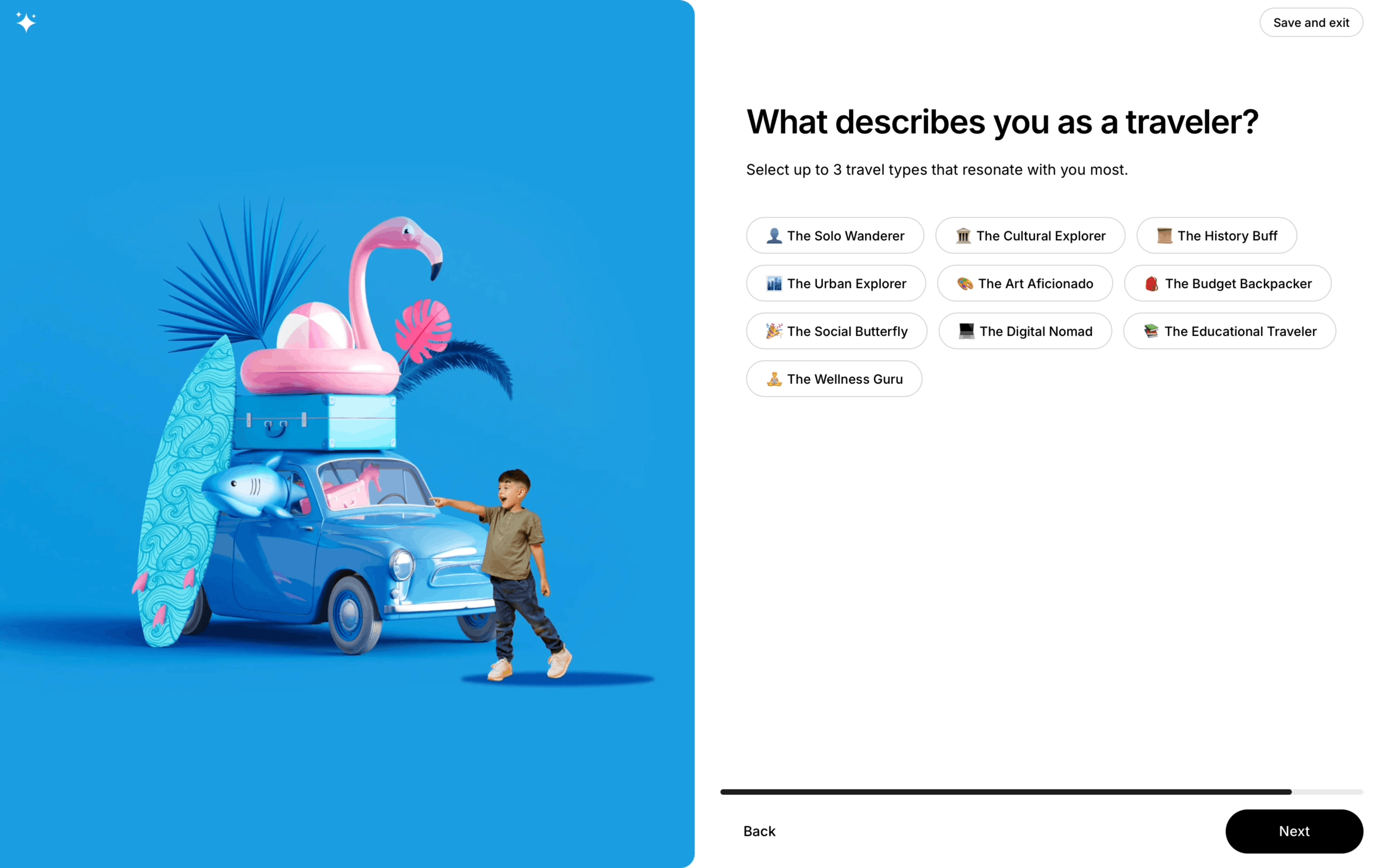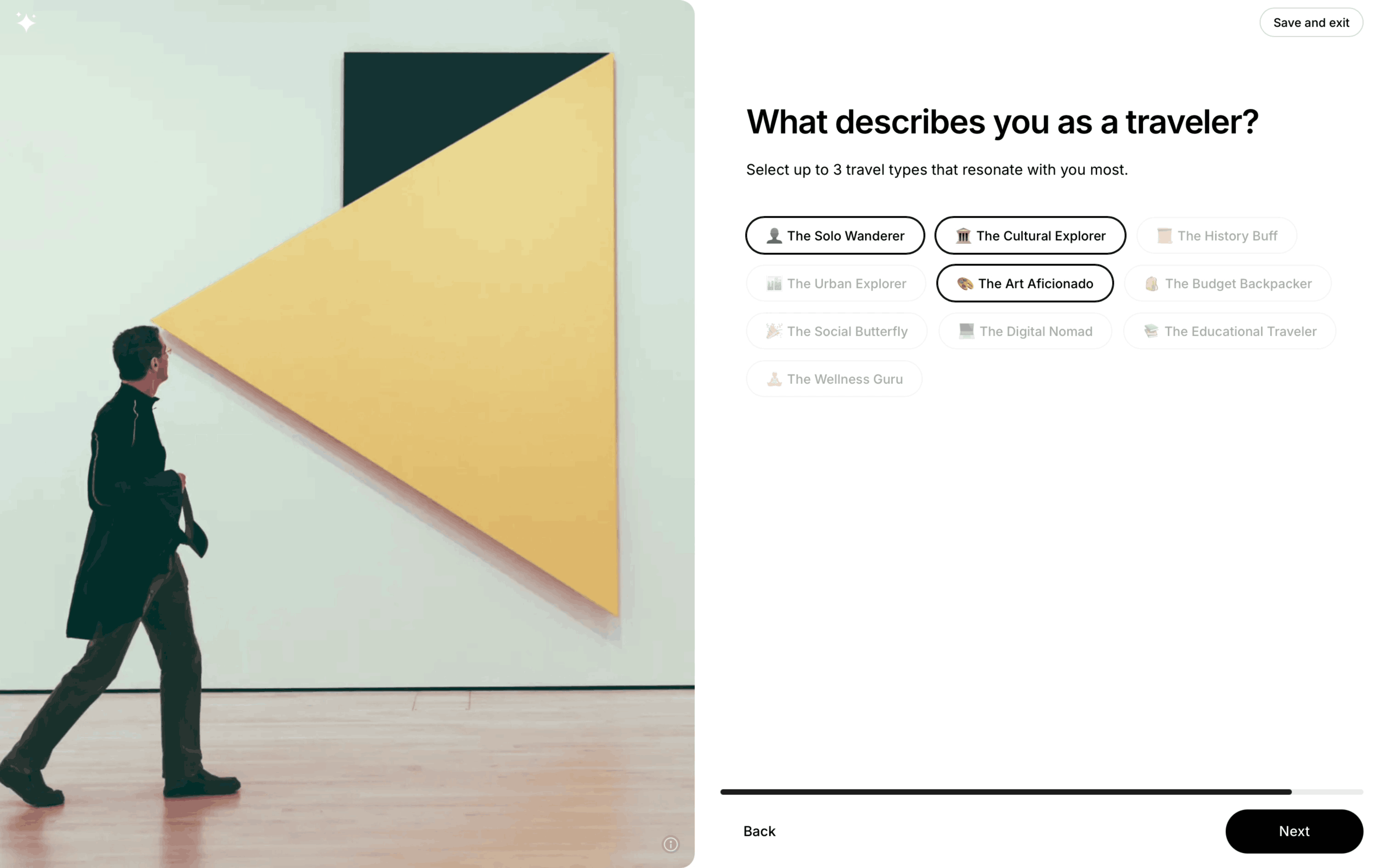 The user takes a travel quiz to determine their travel persona. A profile is generated, and the user returns to the homepage.