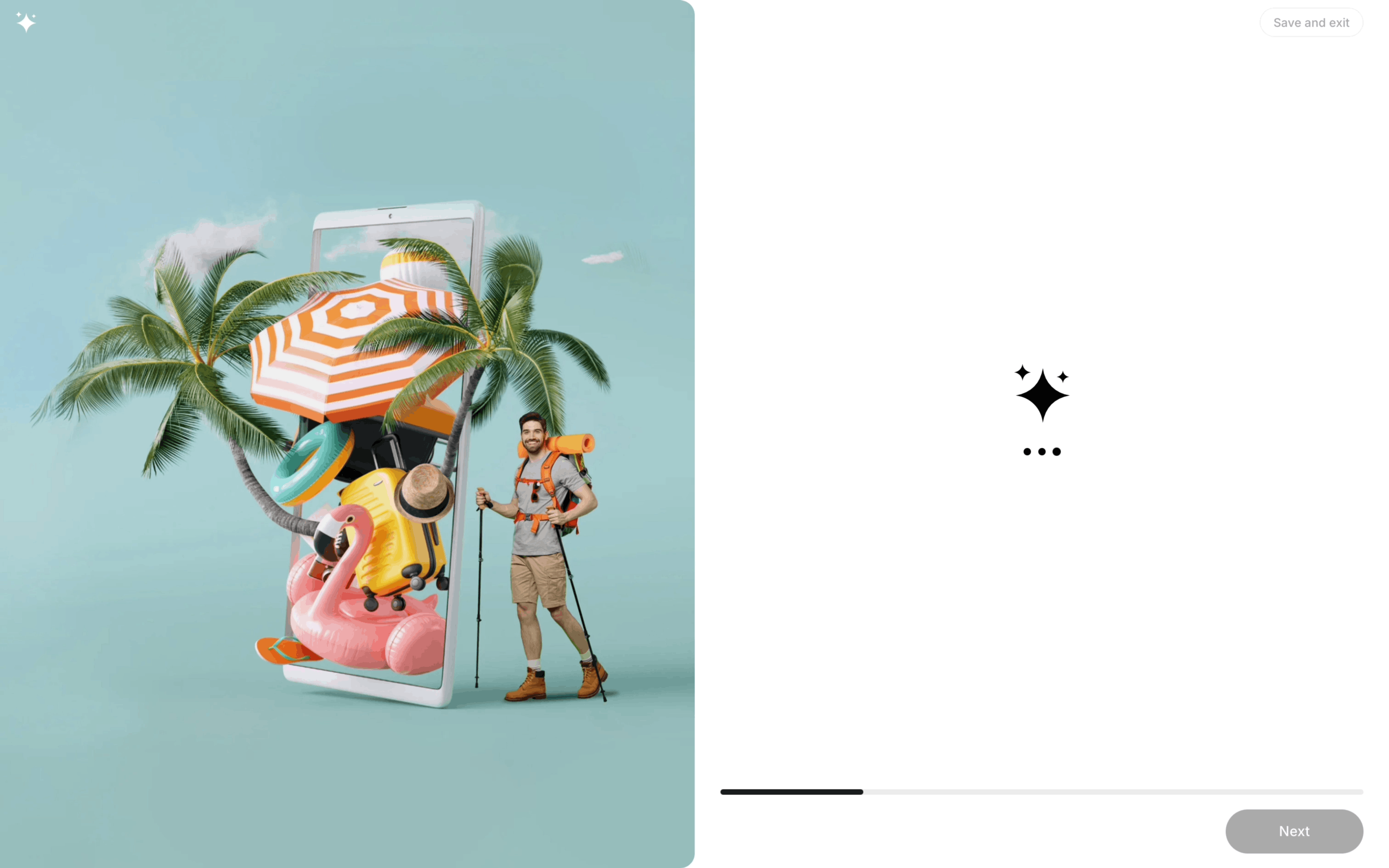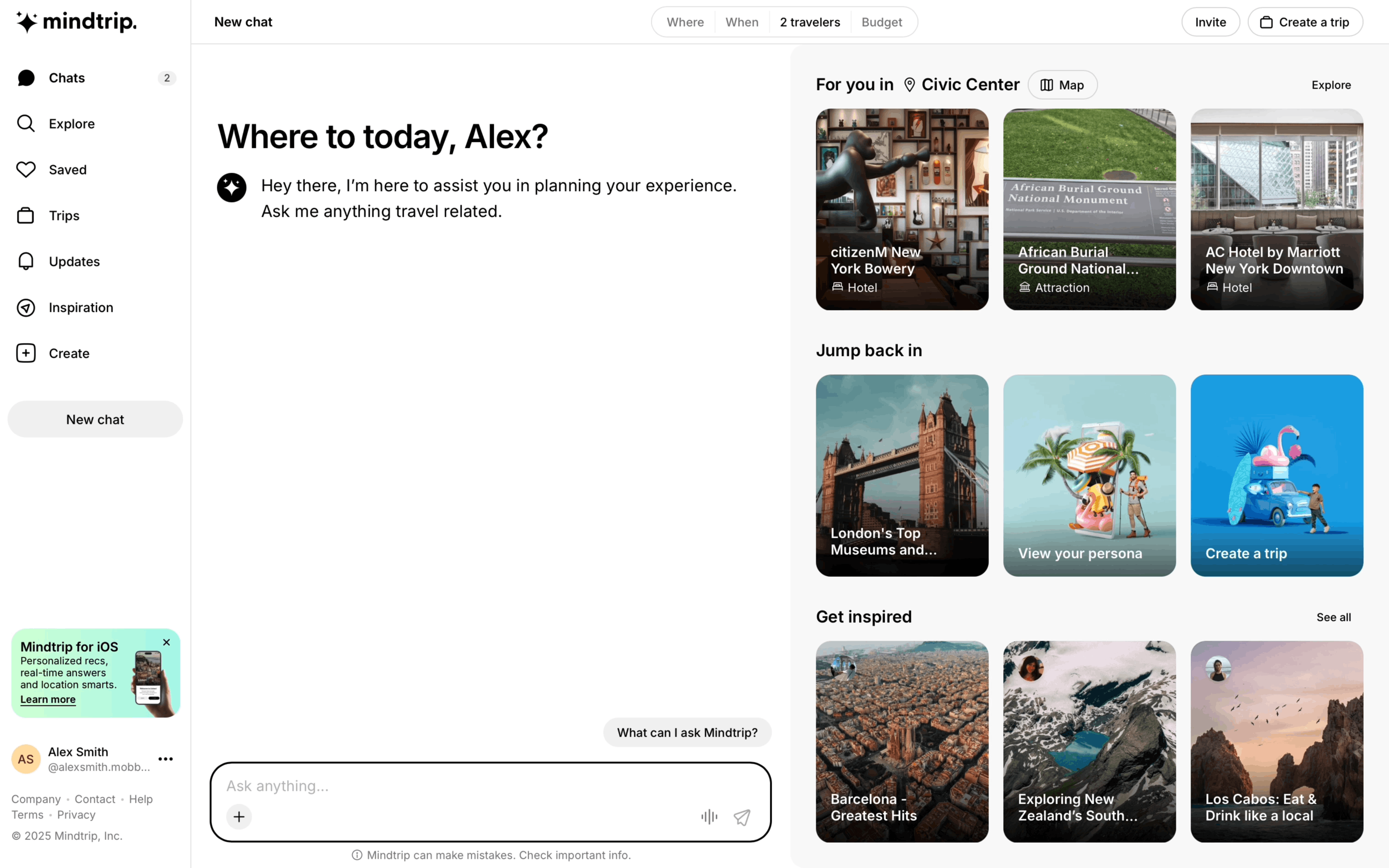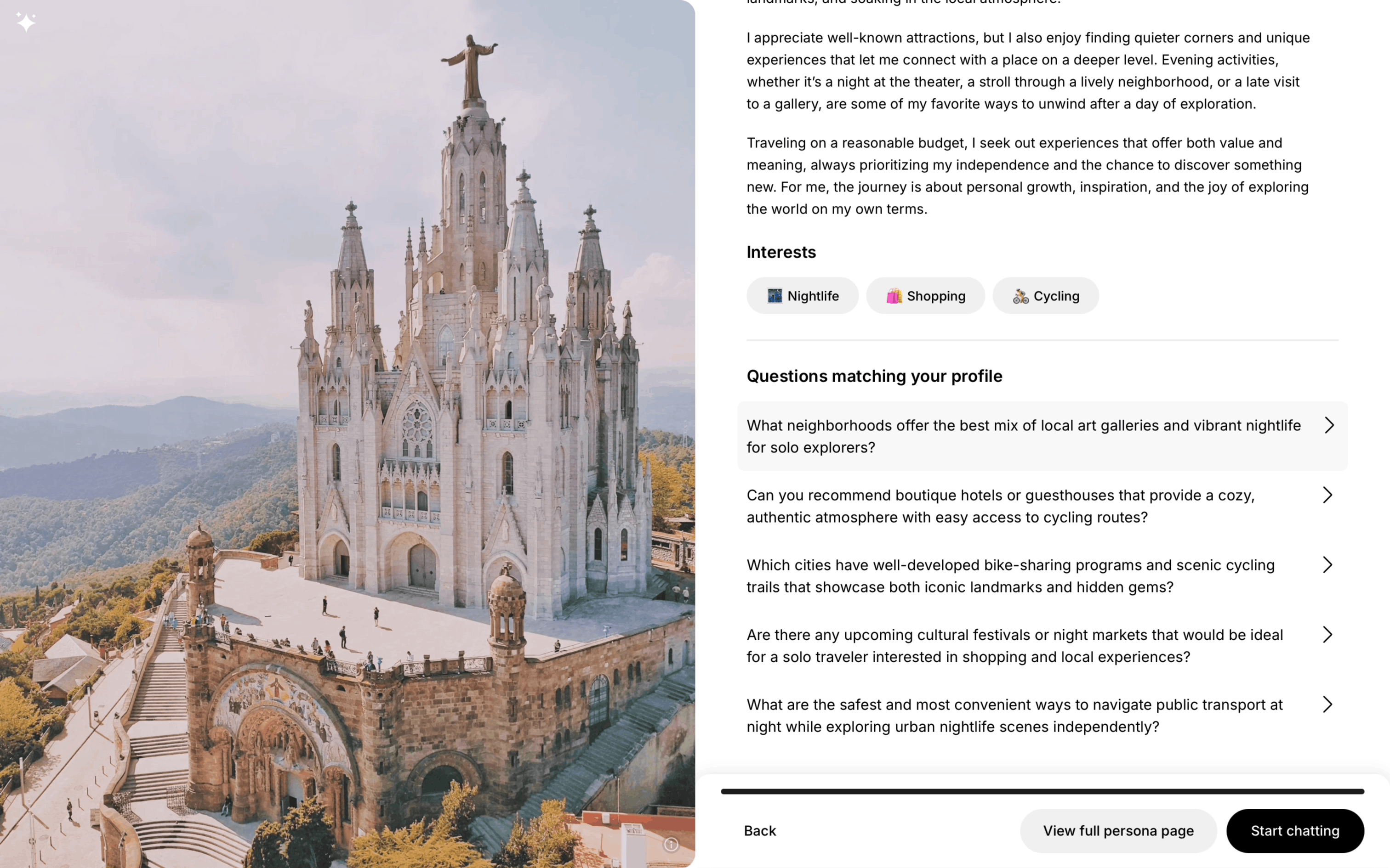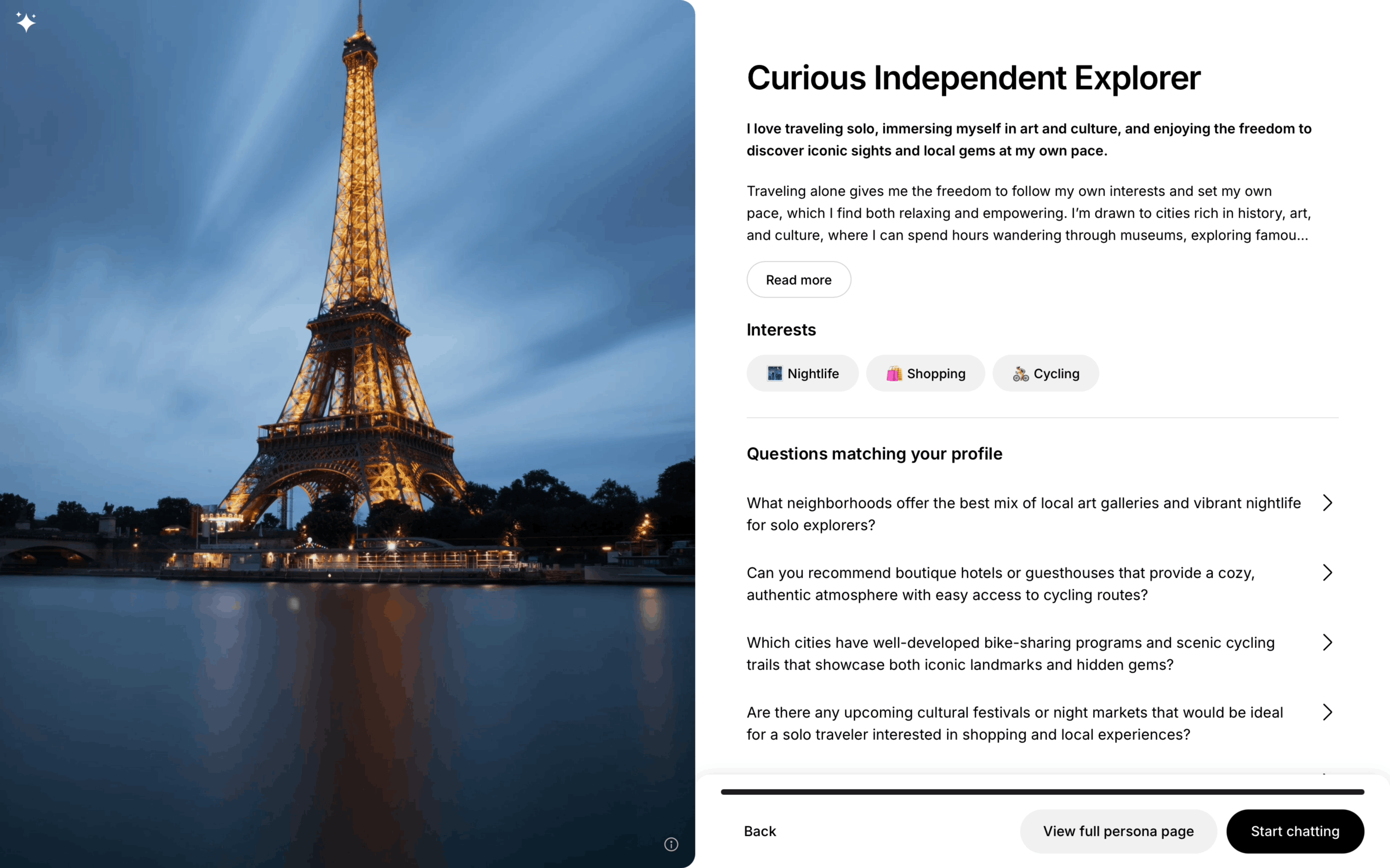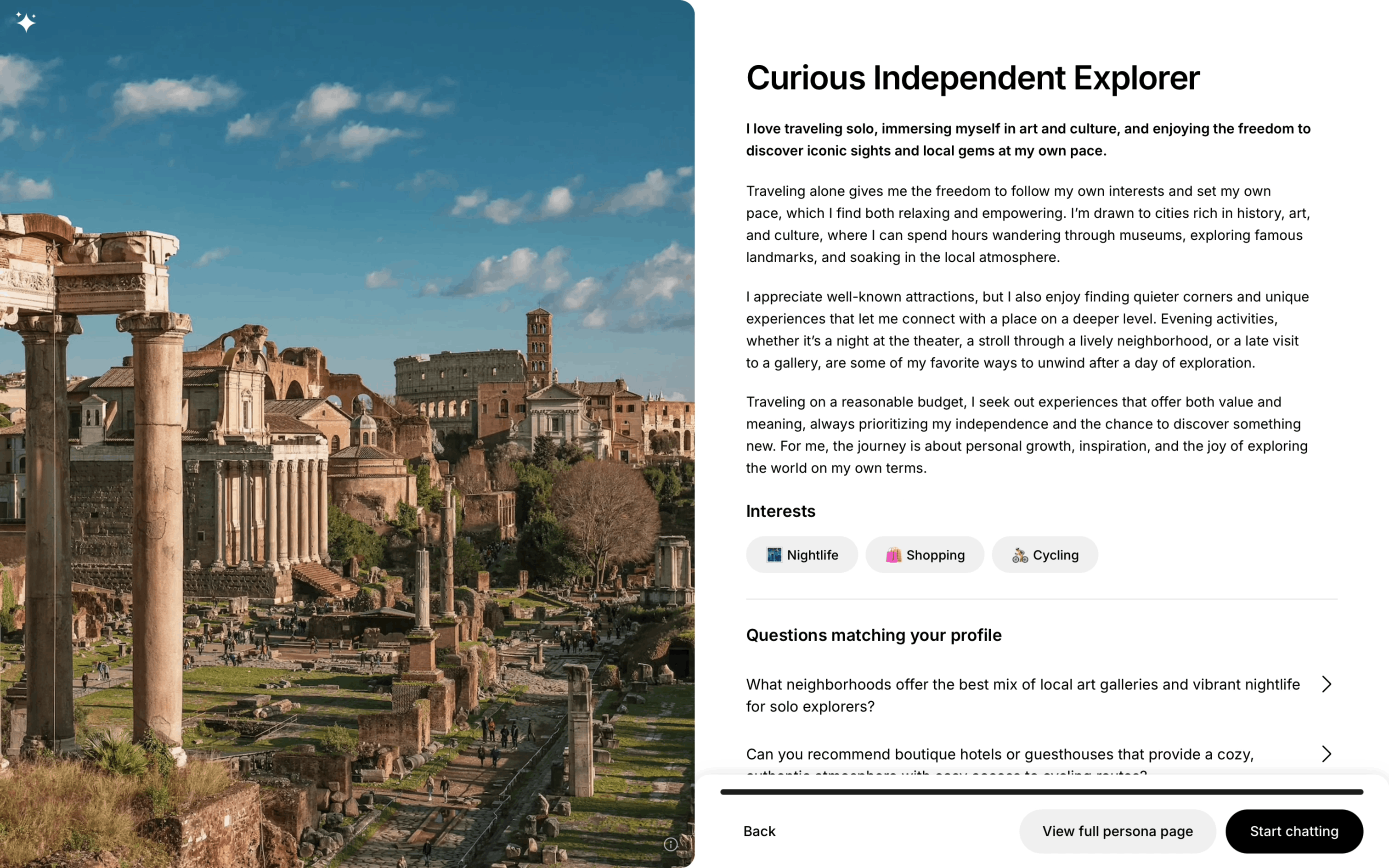 The user takes a travel quiz to determine their travel persona. A profile is generated, and the user returns to the homepage.