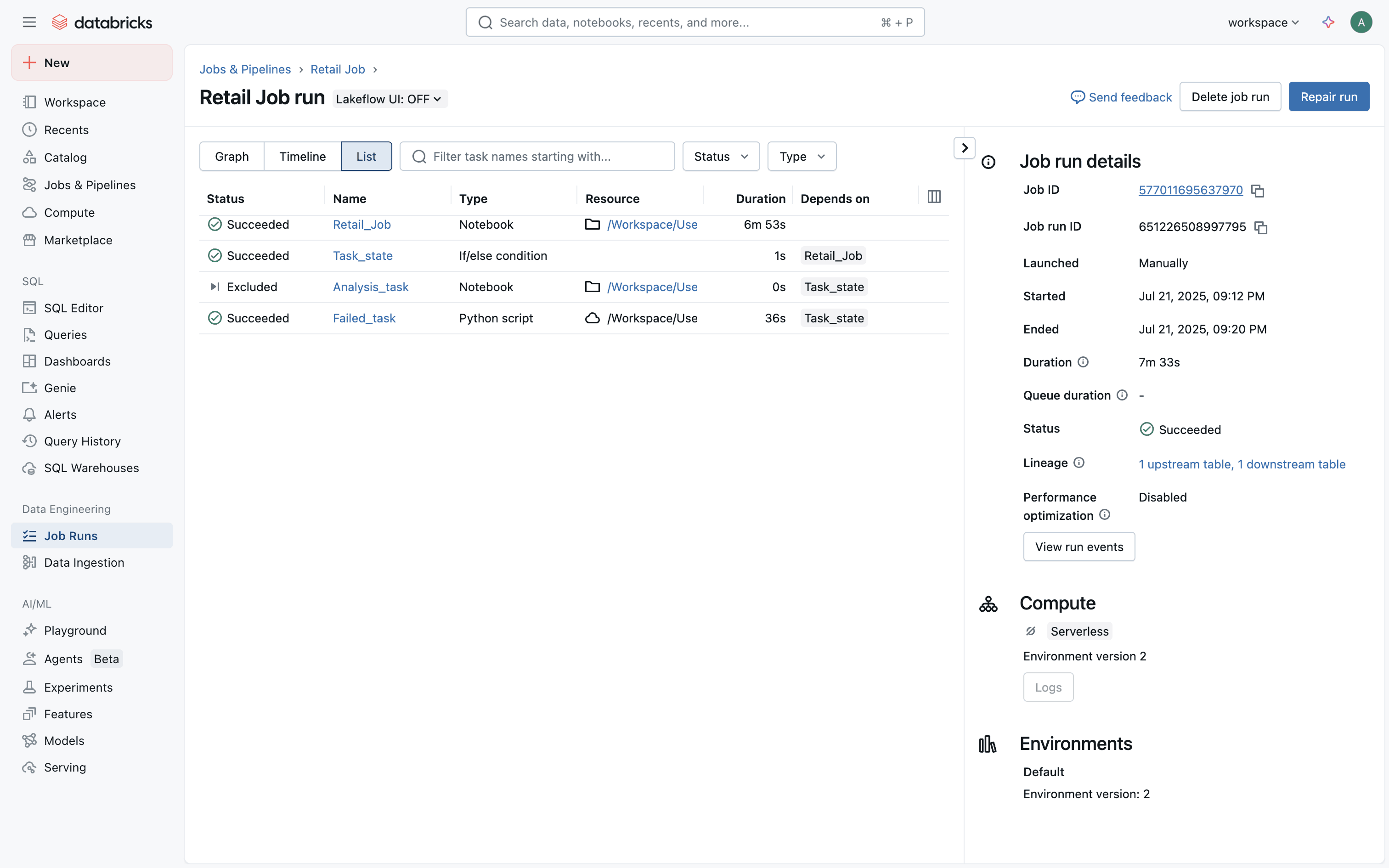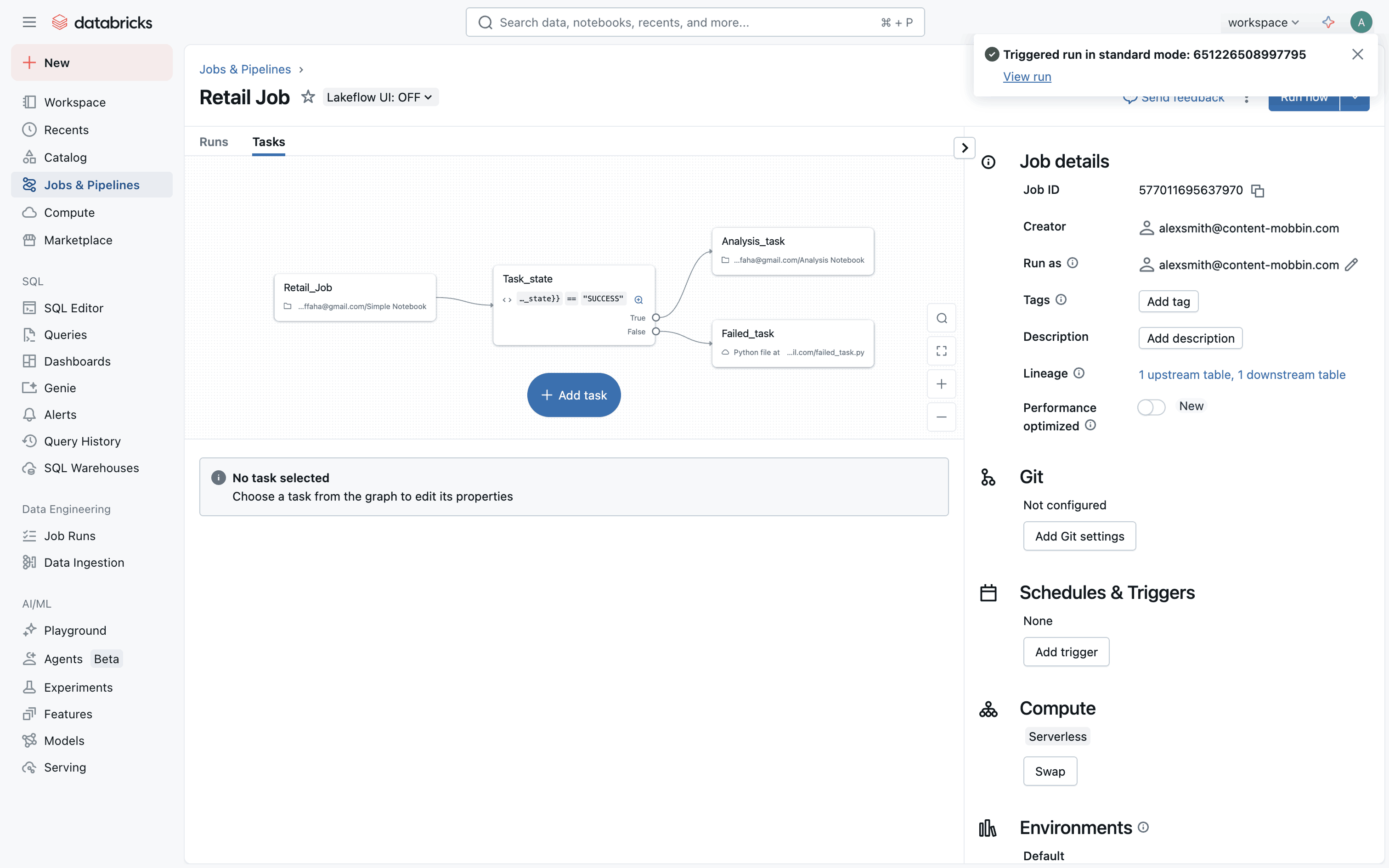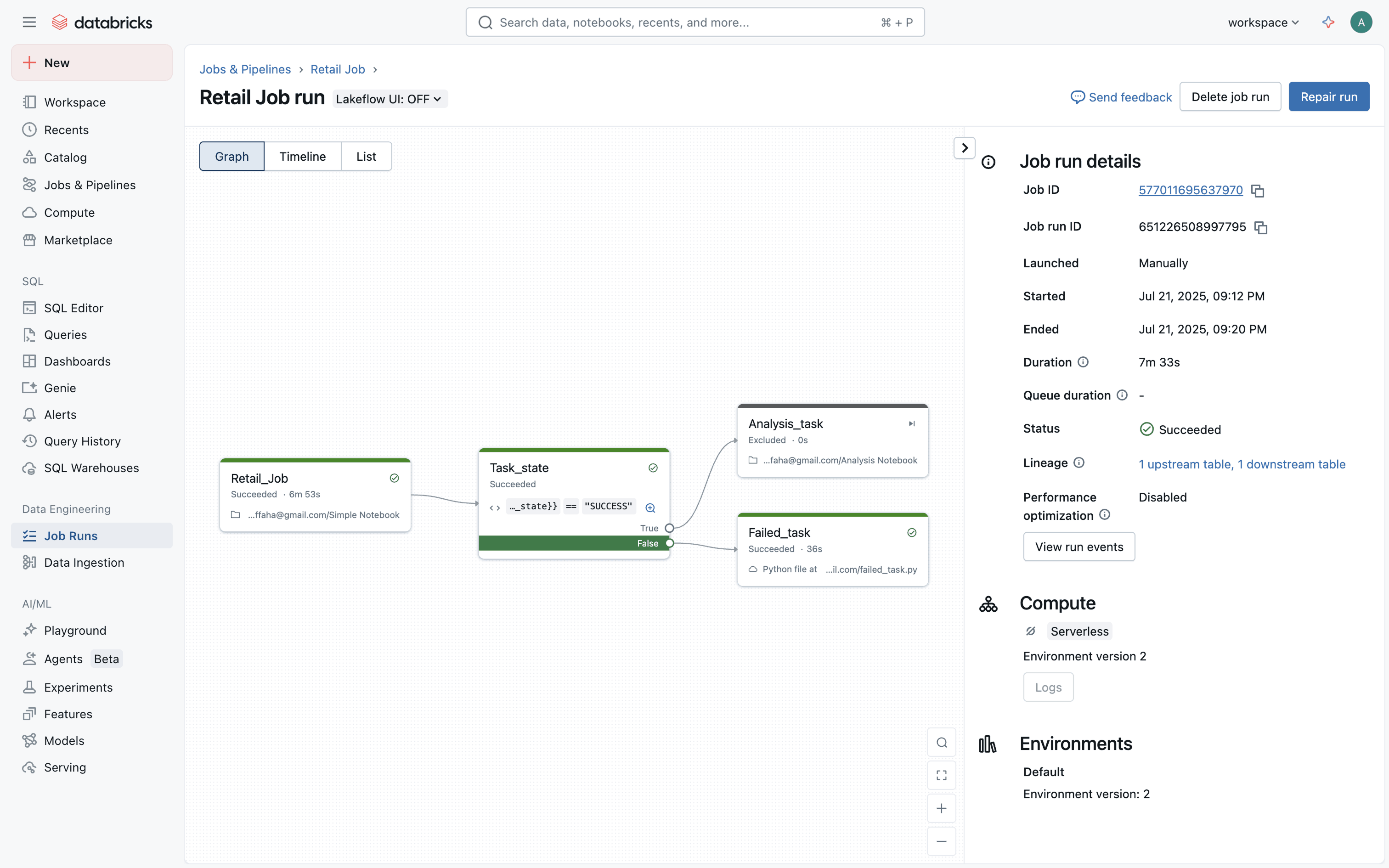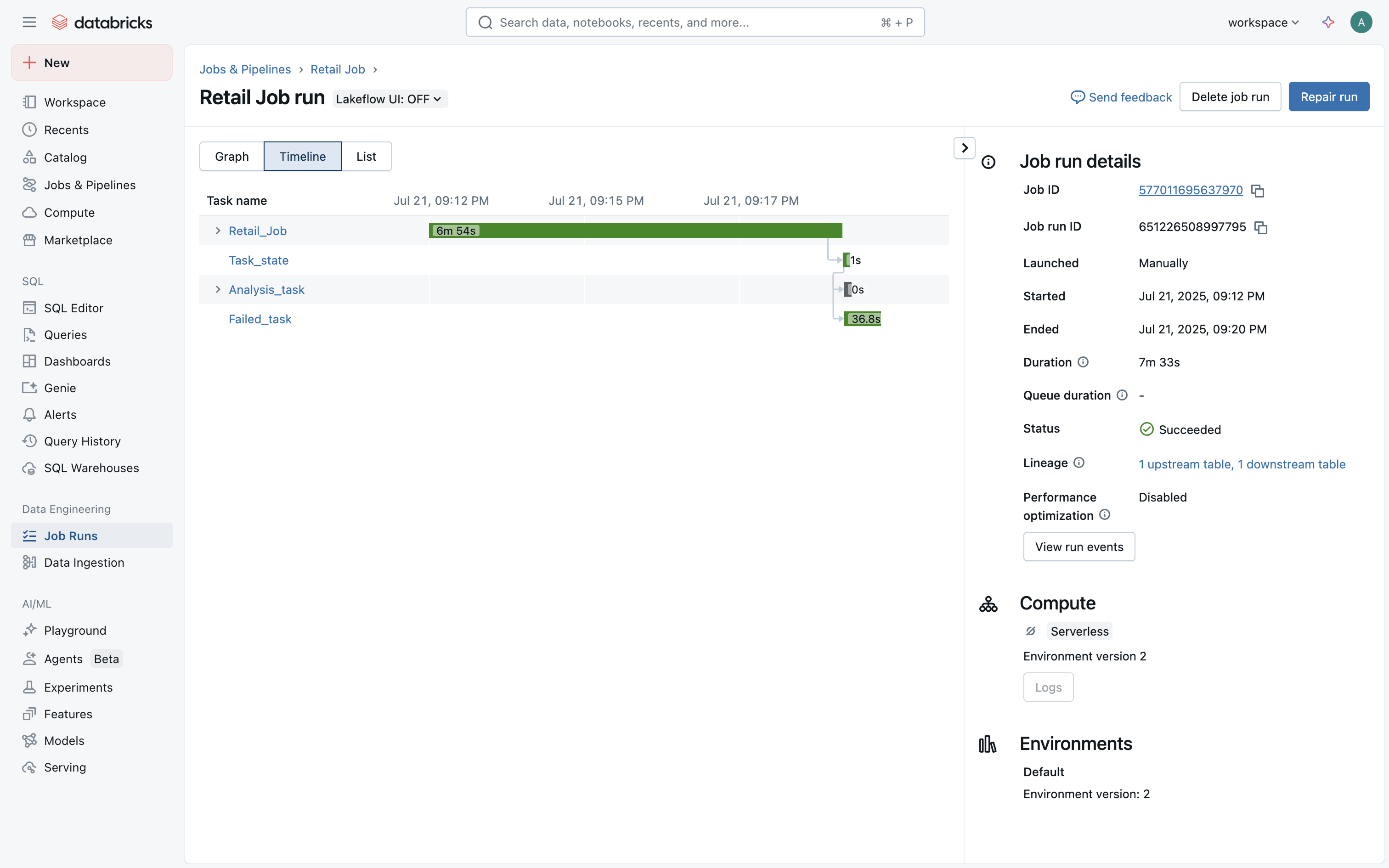 The user starts a job, triggers a run, and monitors the run's progress through graph, timeline, and list views. The job run completes successfully.