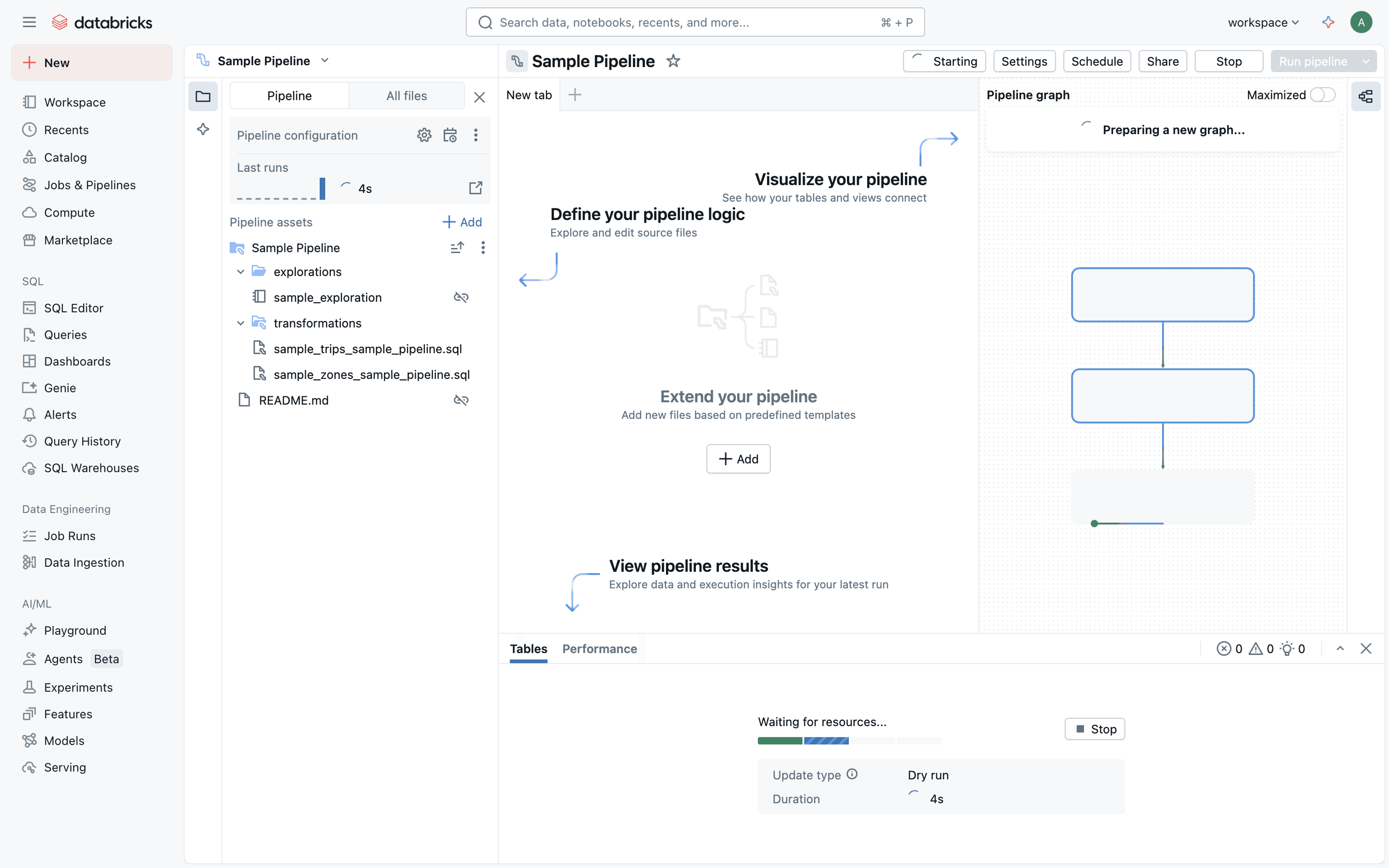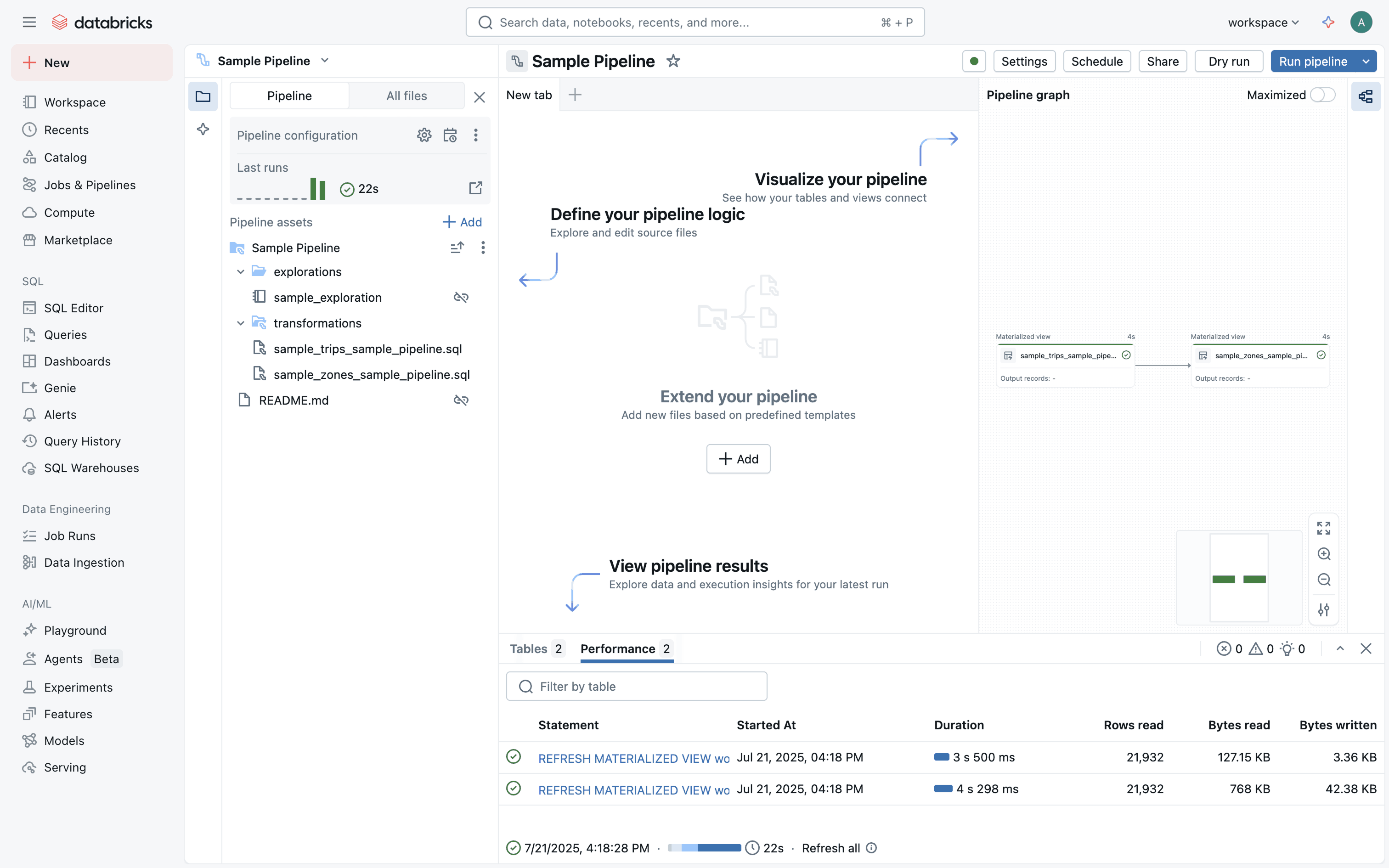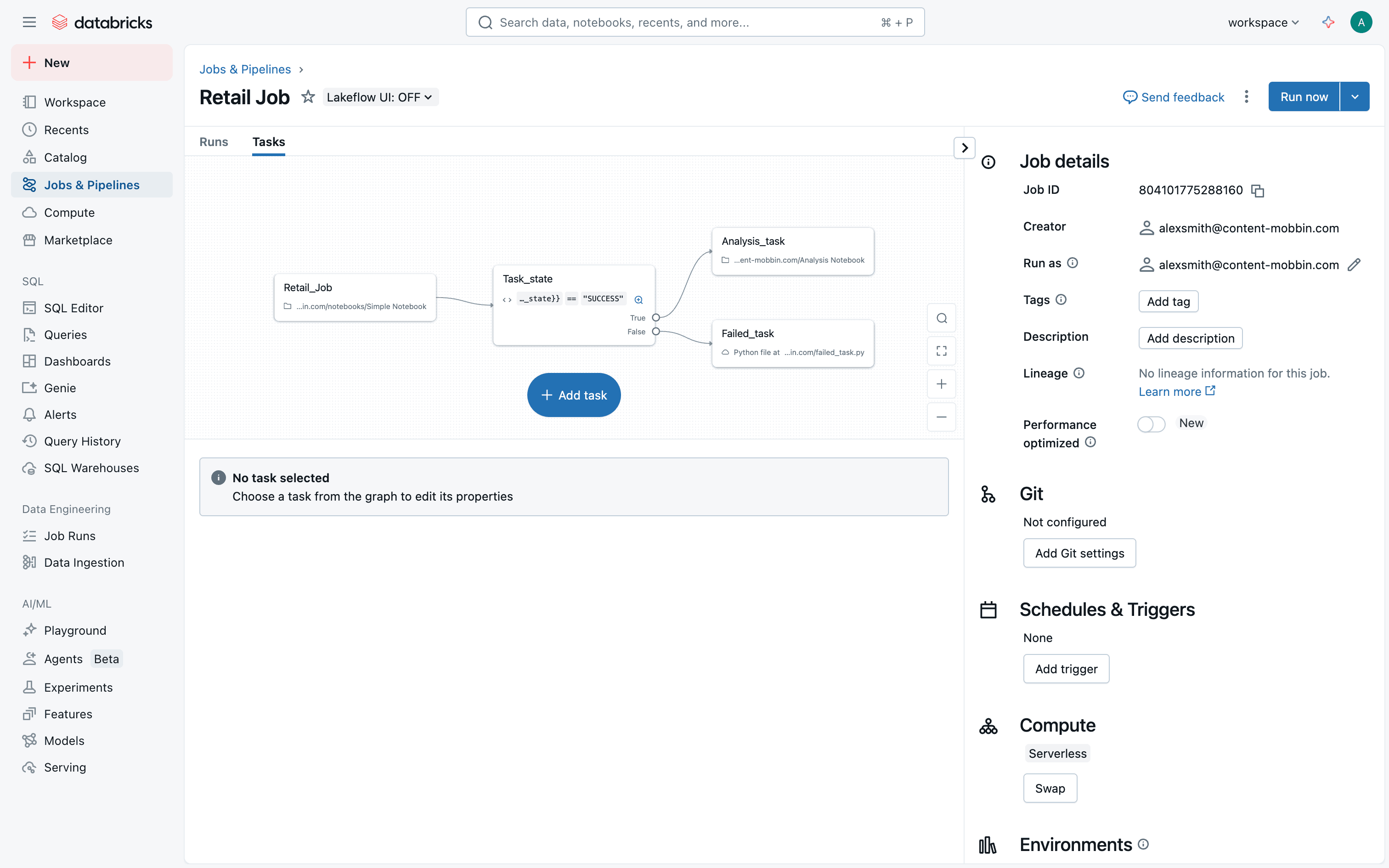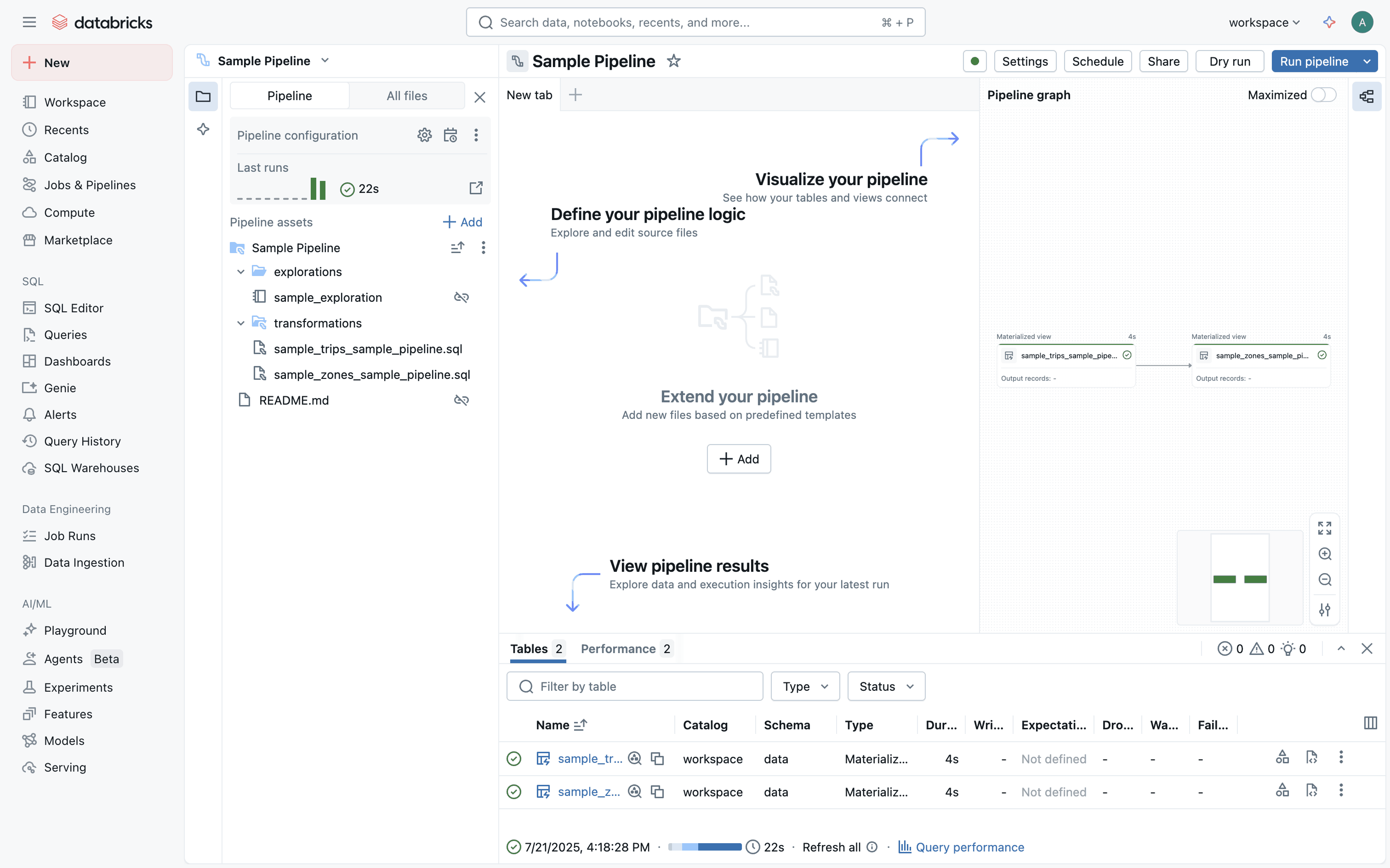 The user starts a job, triggers a run, and monitors the run's progress through graph, timeline, and list views. The job run completes successfully.