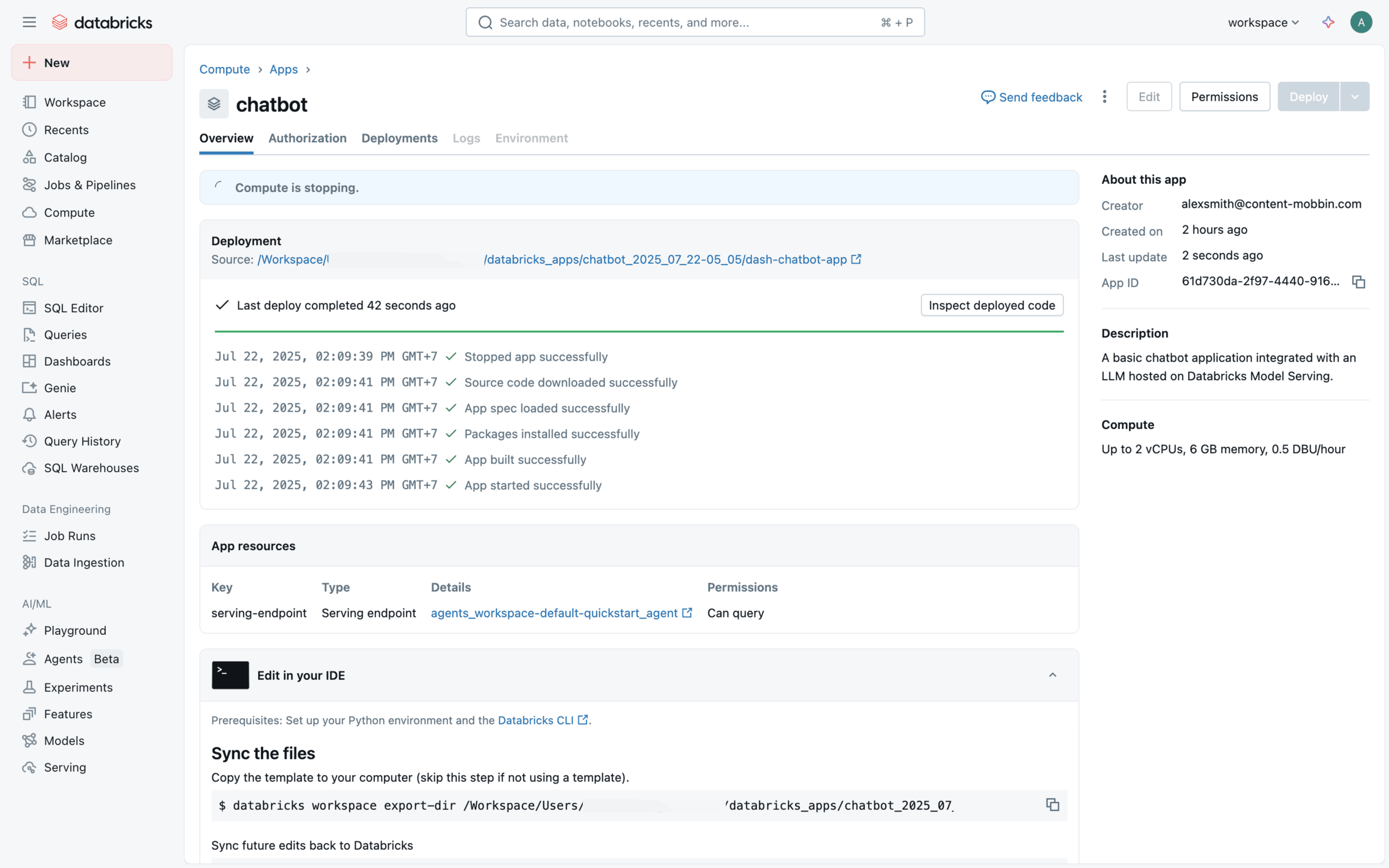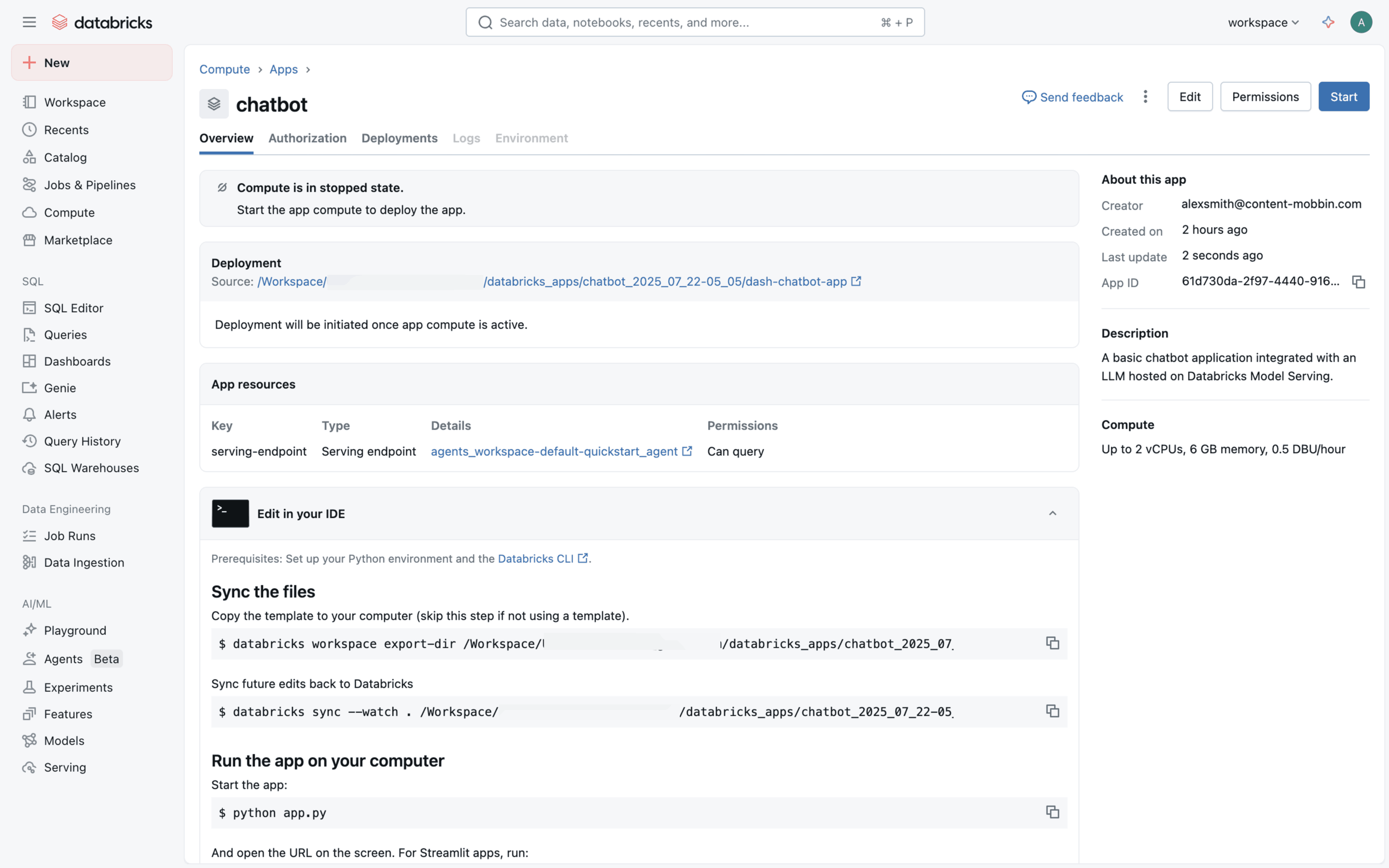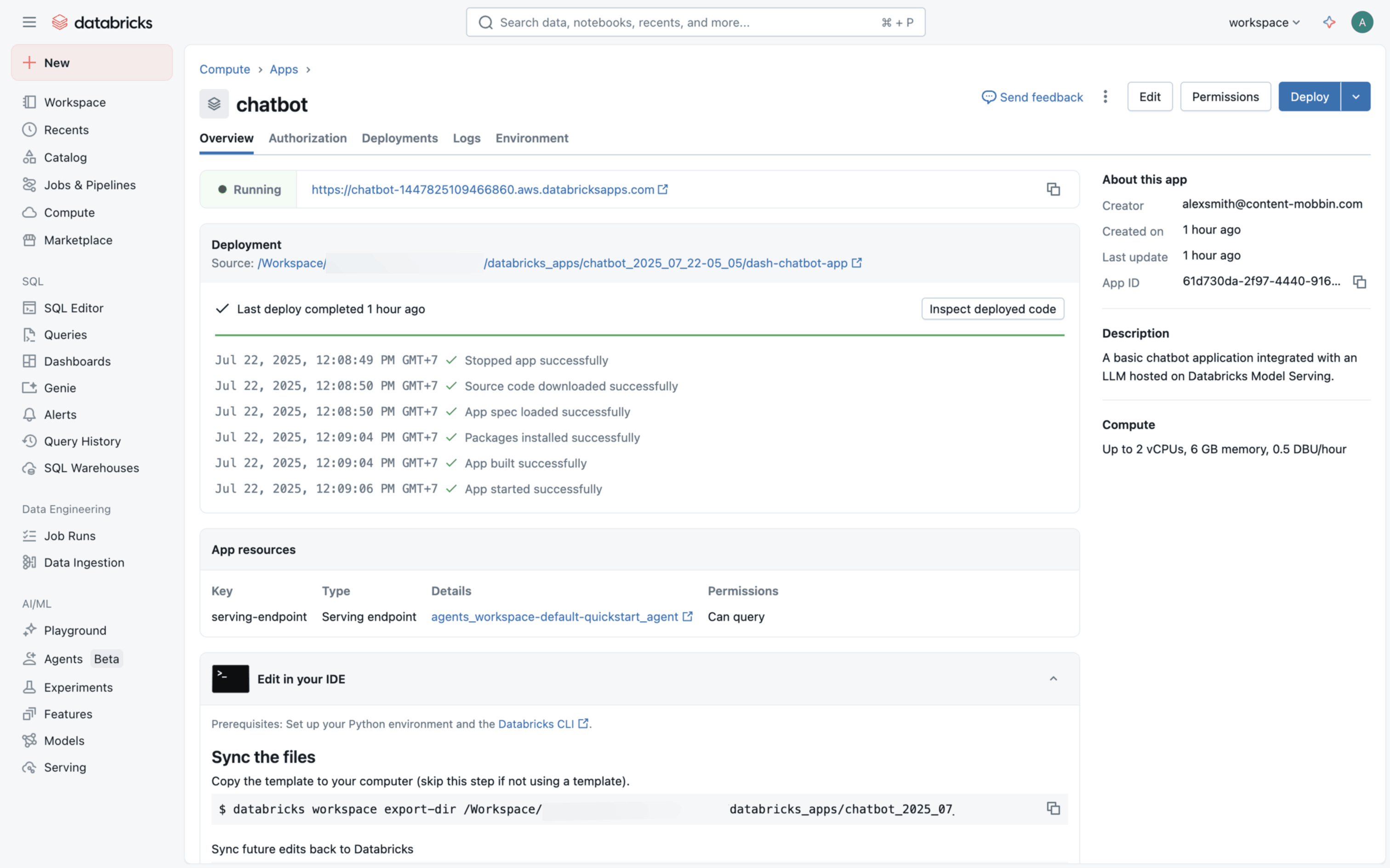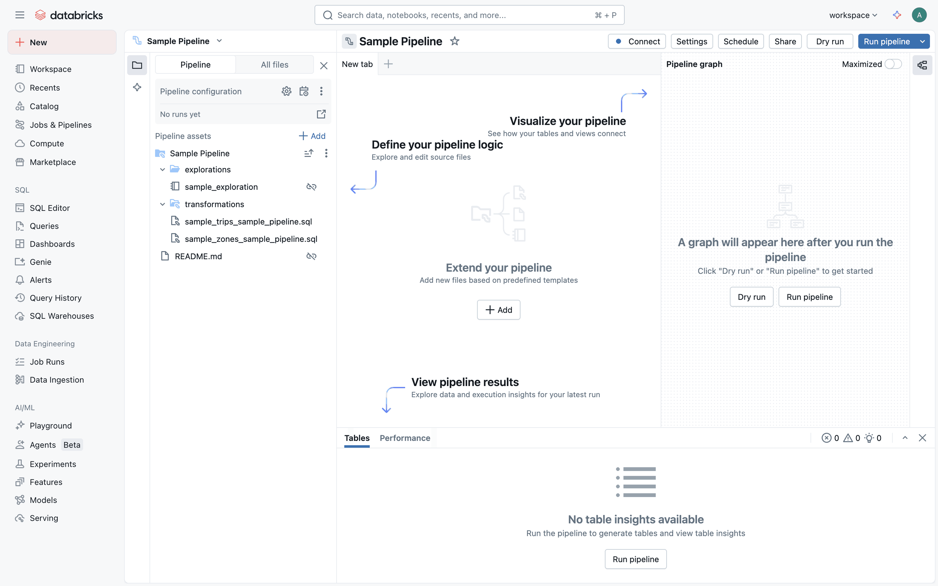 The user starts a job, triggers a run, and monitors the run's progress through graph, timeline, and list views. The job run completes successfully.
