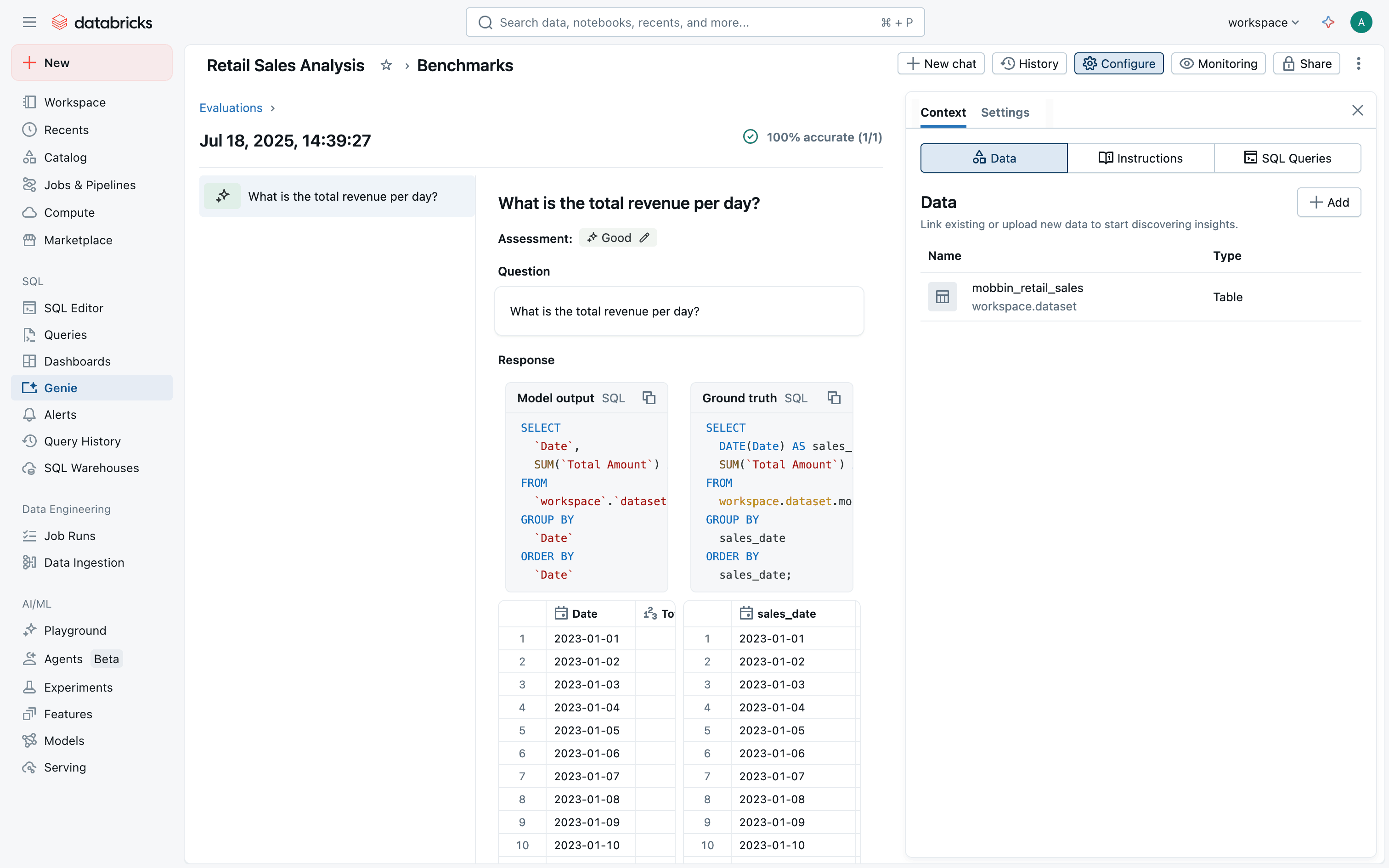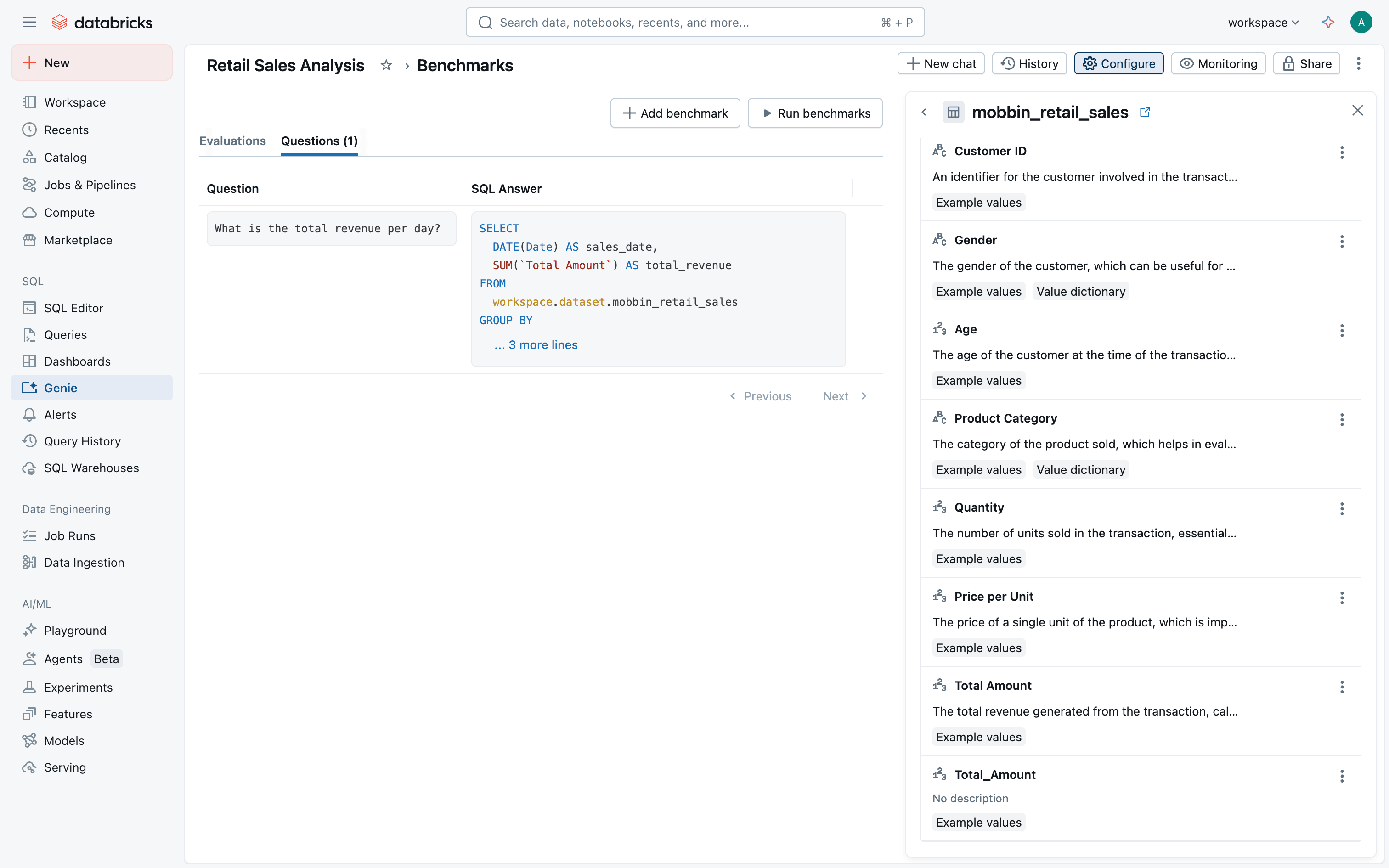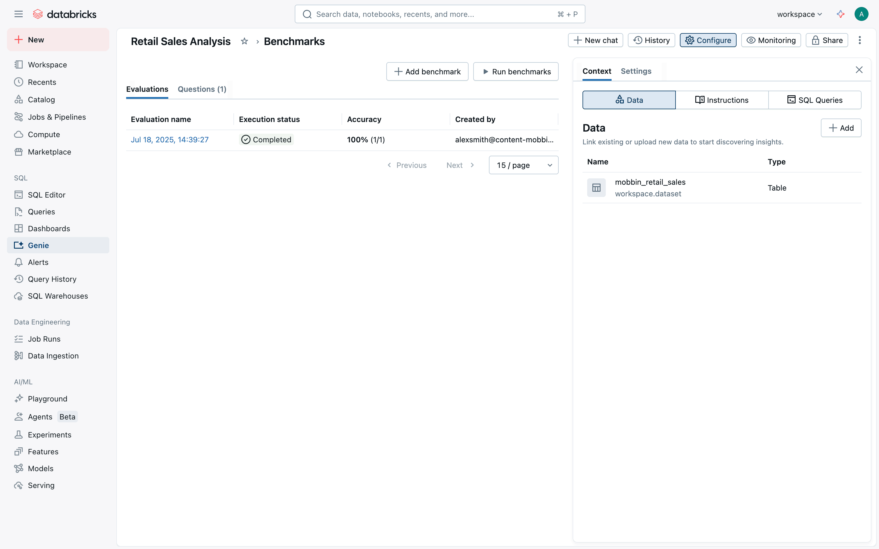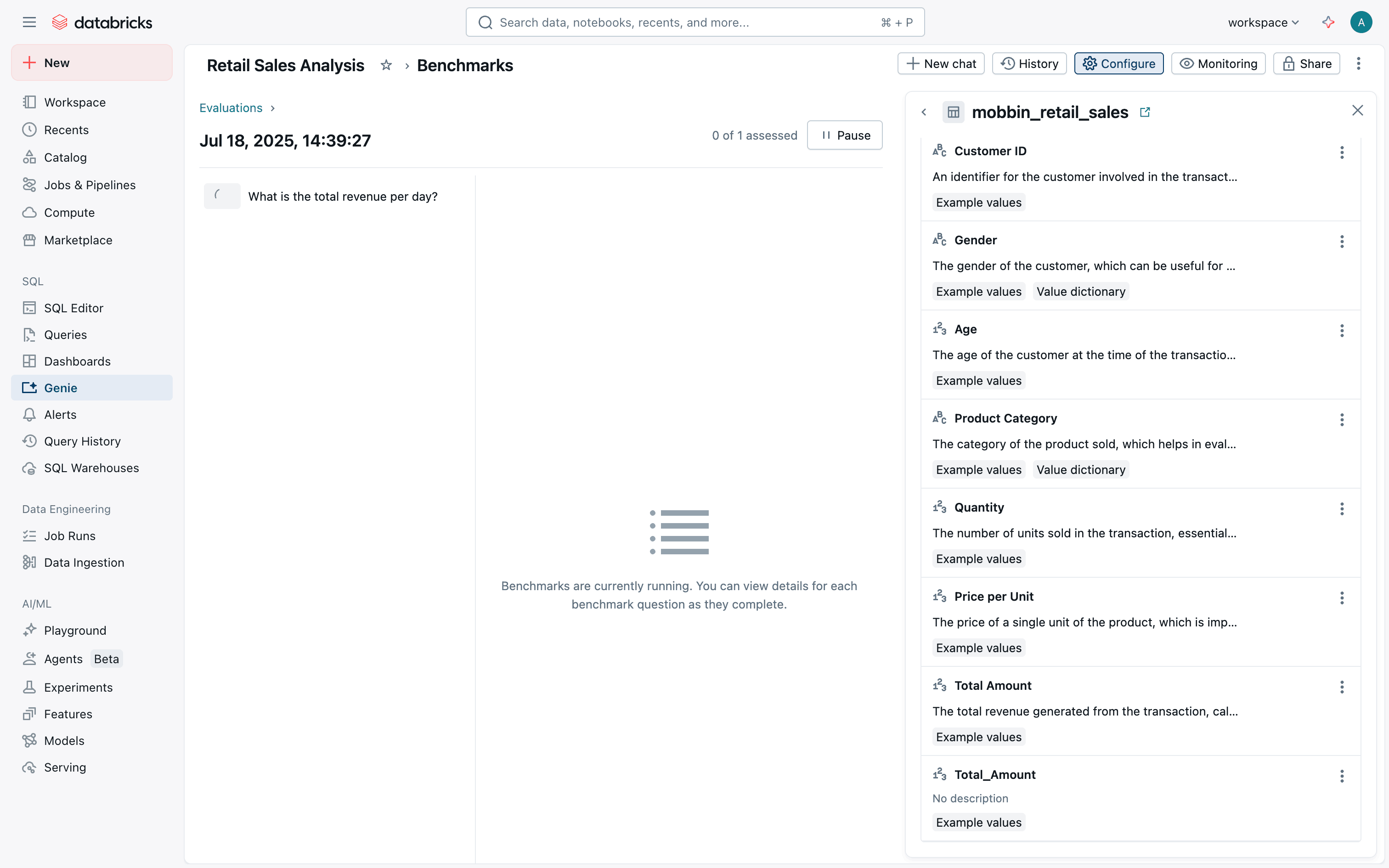 The user flow demonstrates running a benchmark on retail sales data. It includes setting up, running, viewing results, and displaying completed evaluations.
