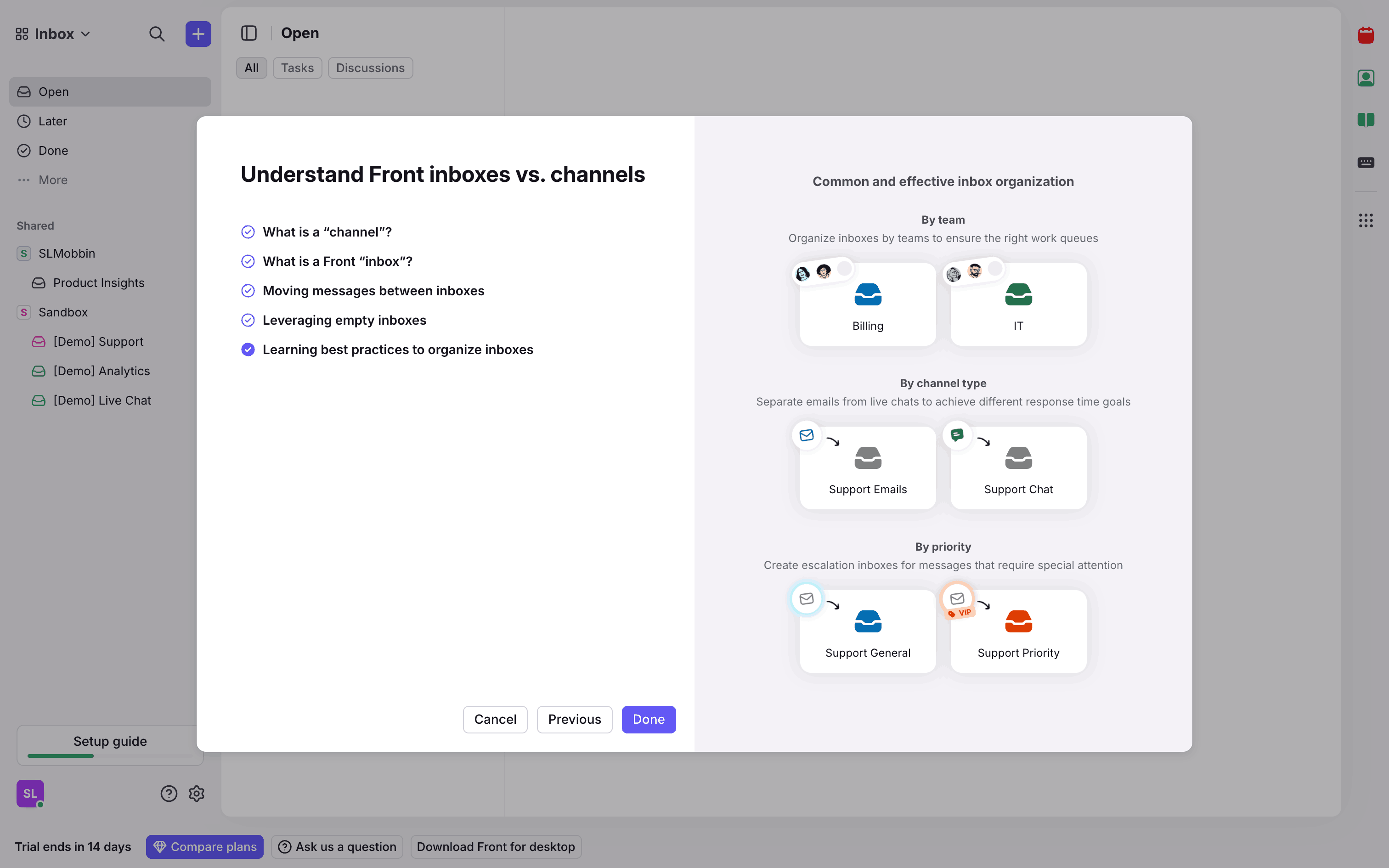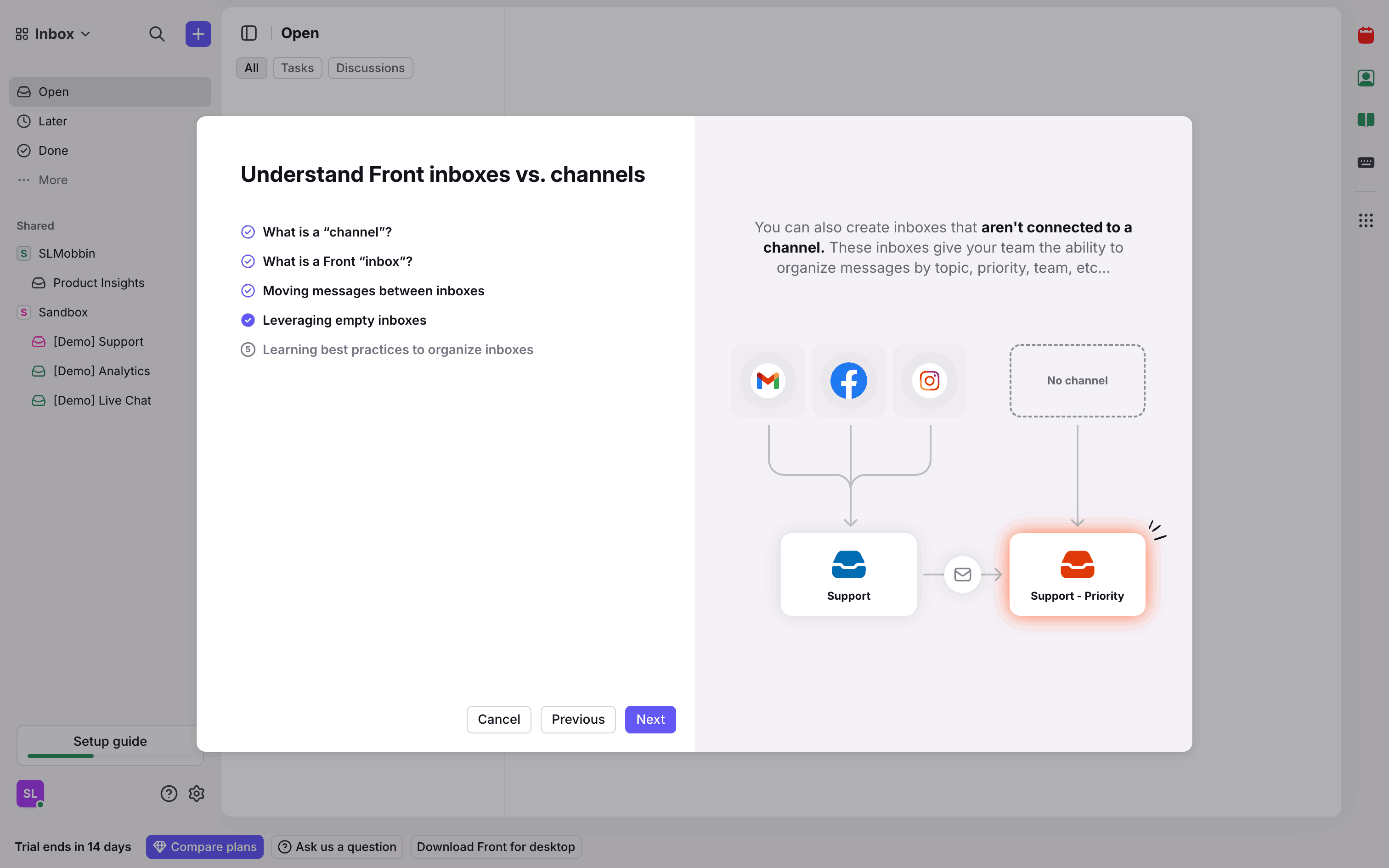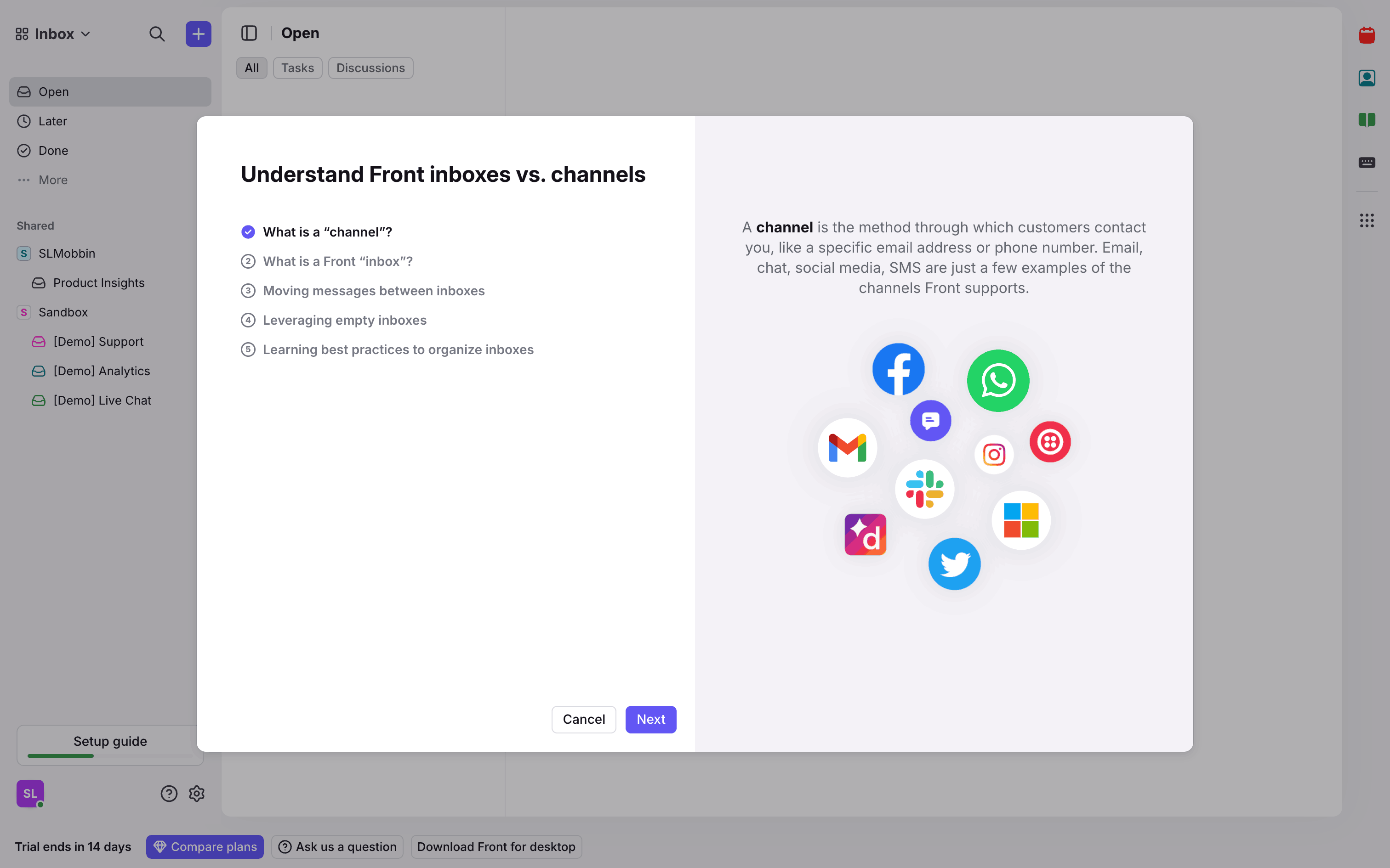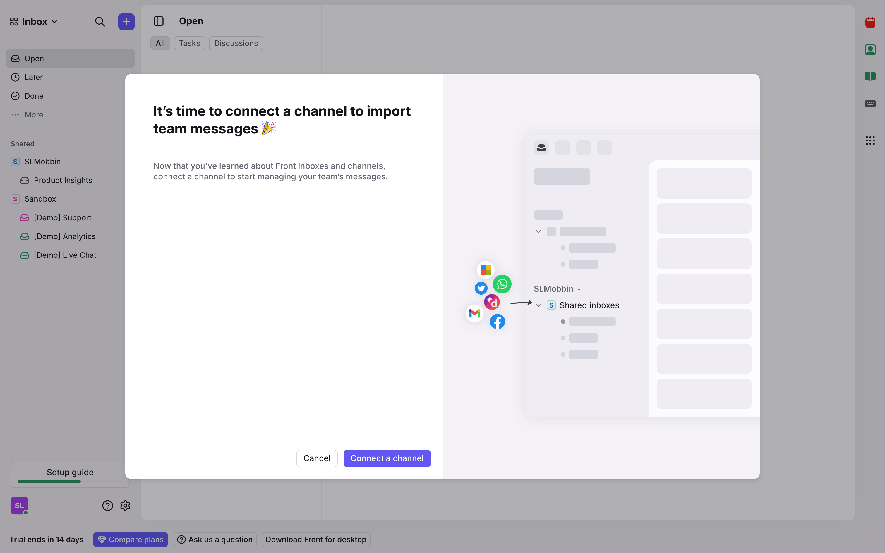 The user completes a guide by understanding inbox channels and is then prompted to connect a channel. This completes a step in the initial setup checklist.